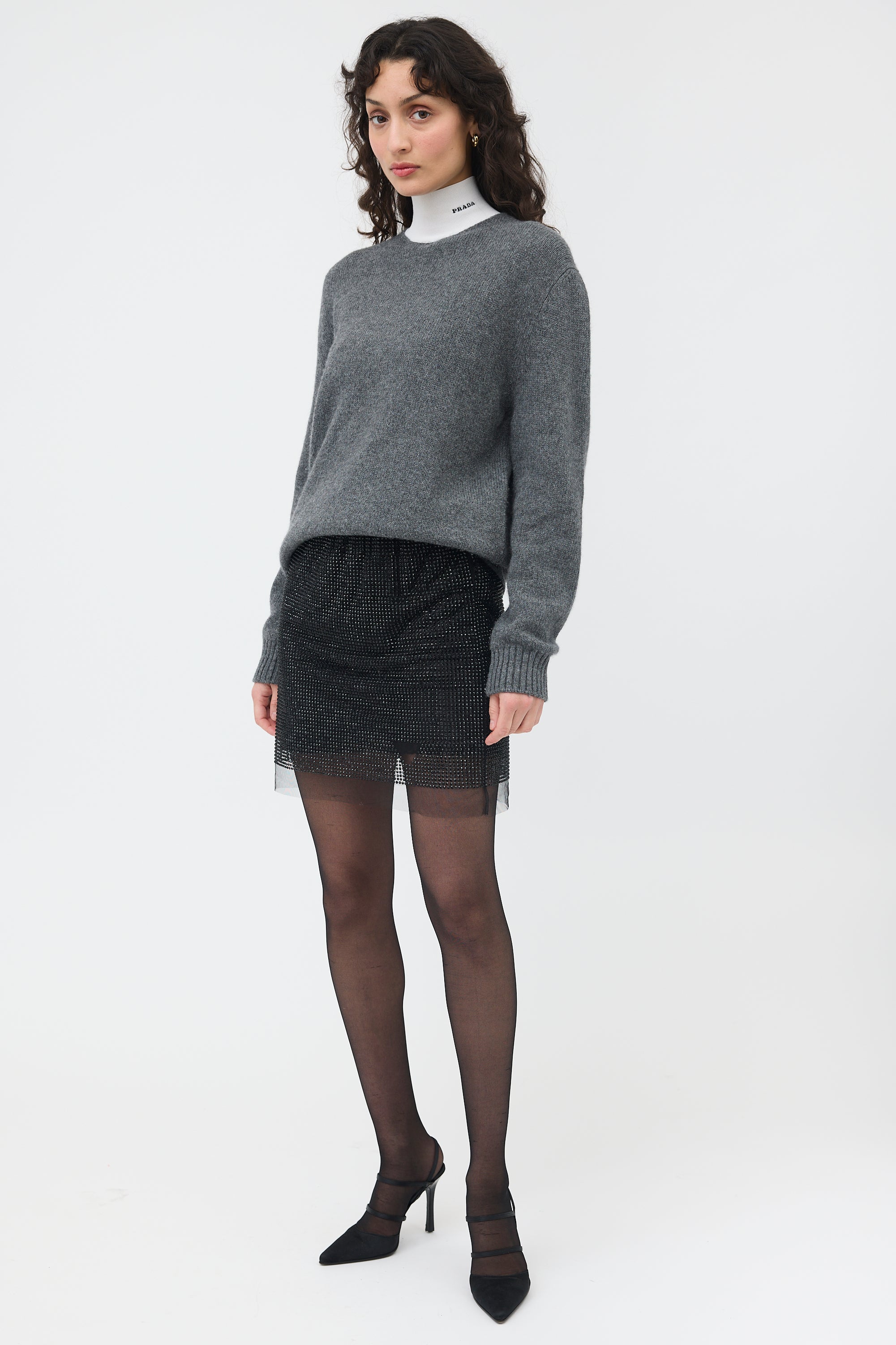 Pre-owned Prada black tulle mini skirt featuring tonal sparkle embellishments throughout, side button closure, and tonal slip.