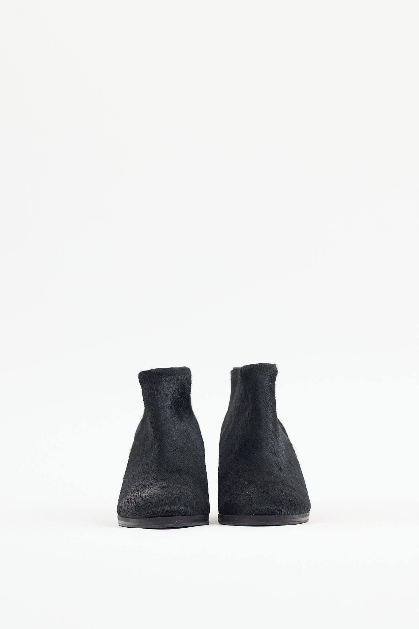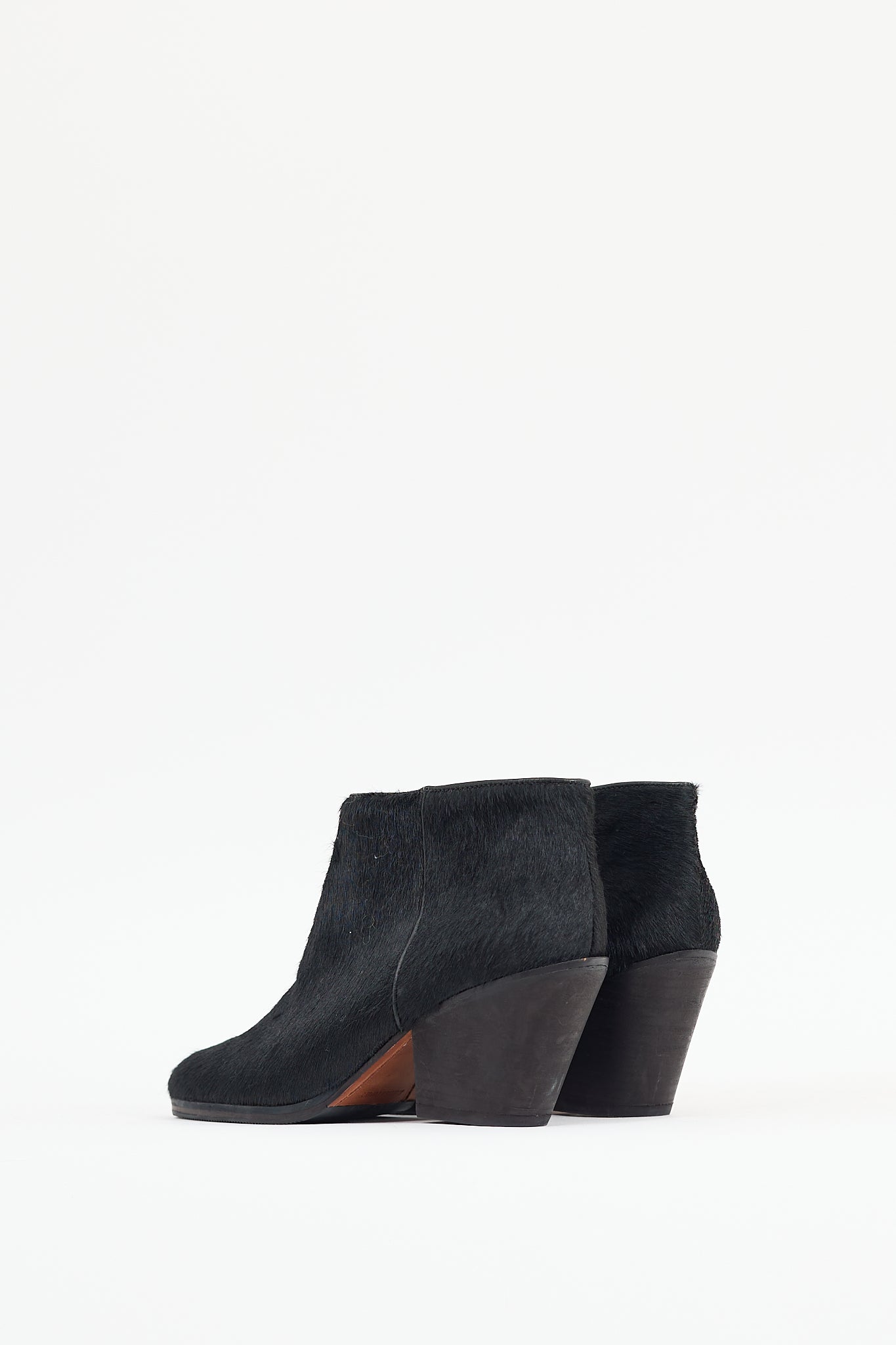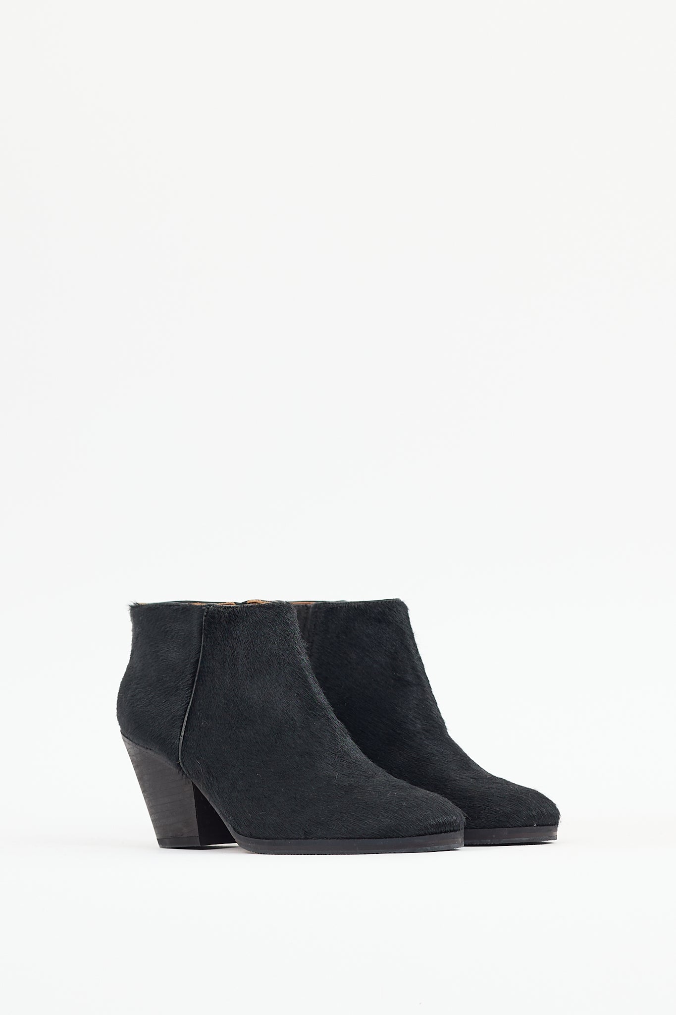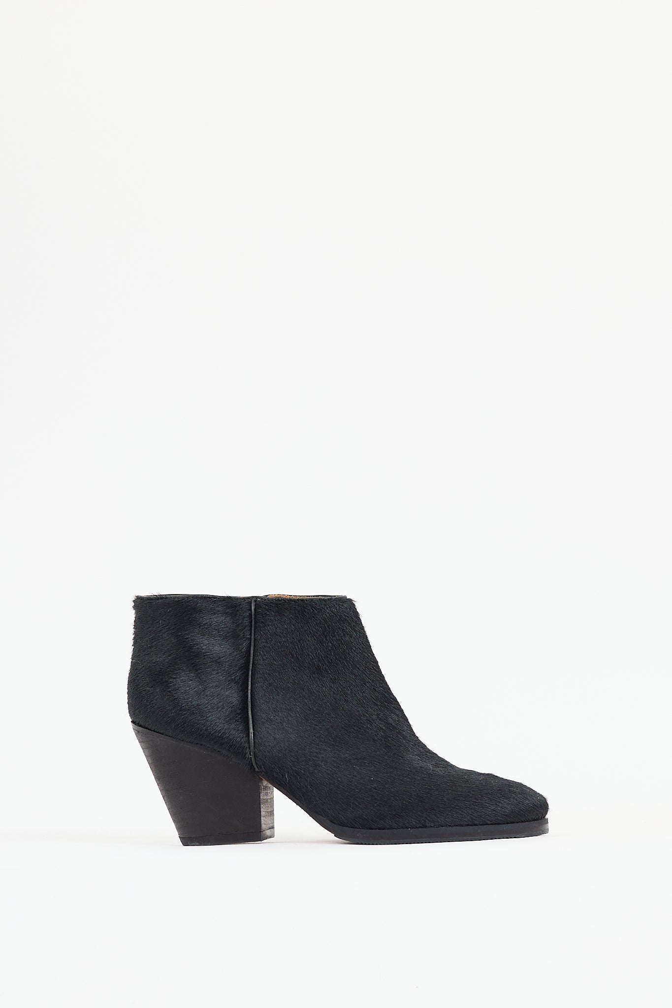 Pre-owned Rachel Comey black Mars leather boot featuring a textured ponyhair upper, round toe, stacked heel, and zip closure at side.