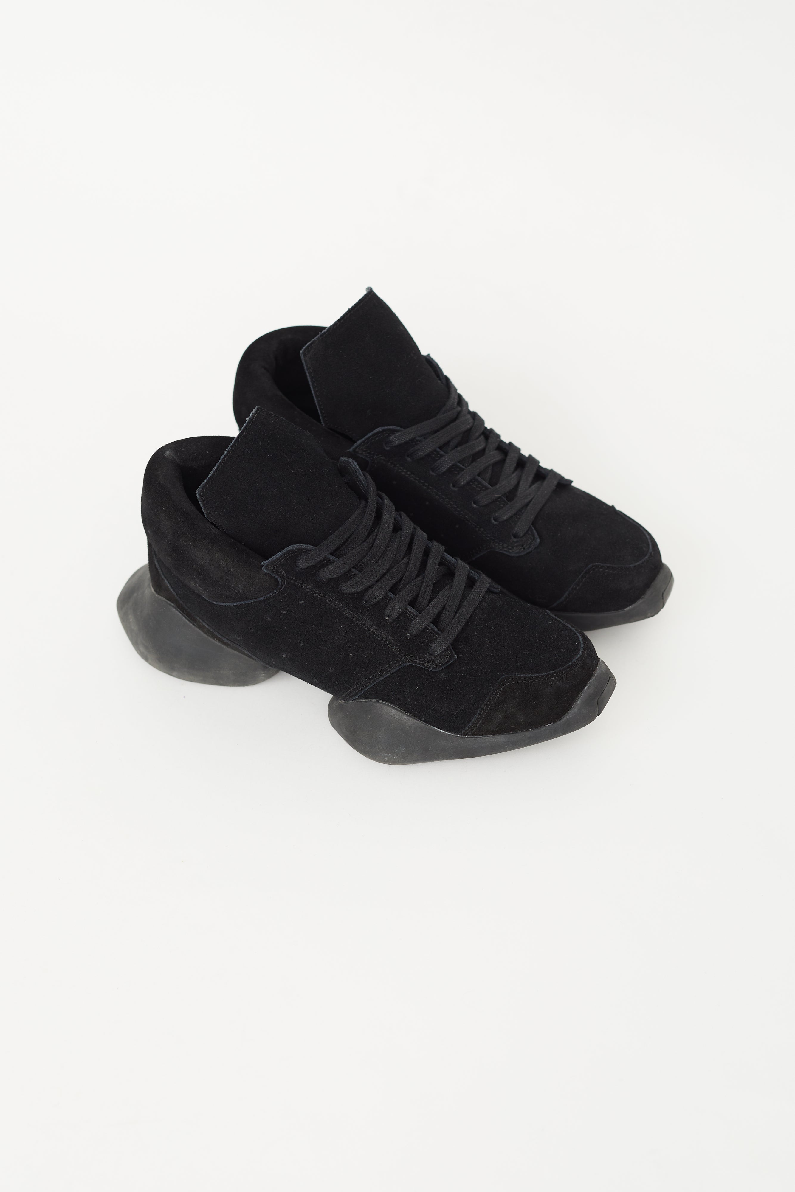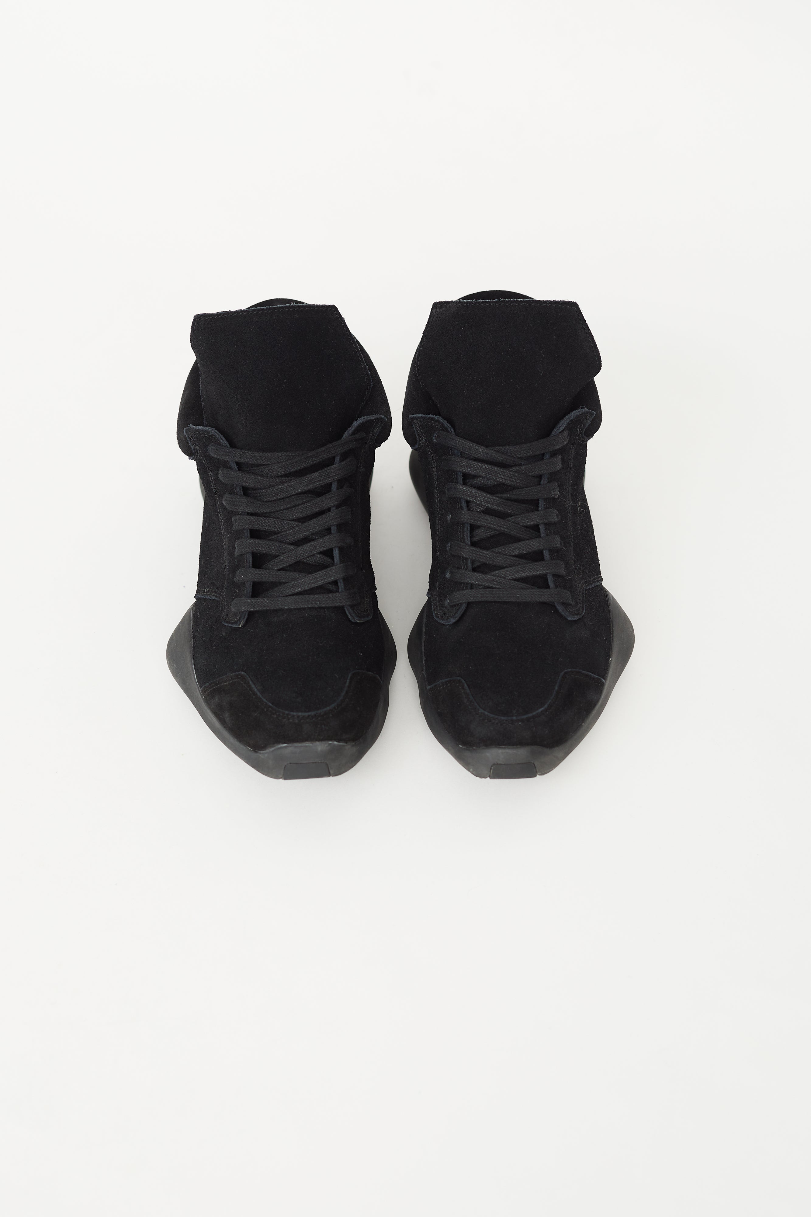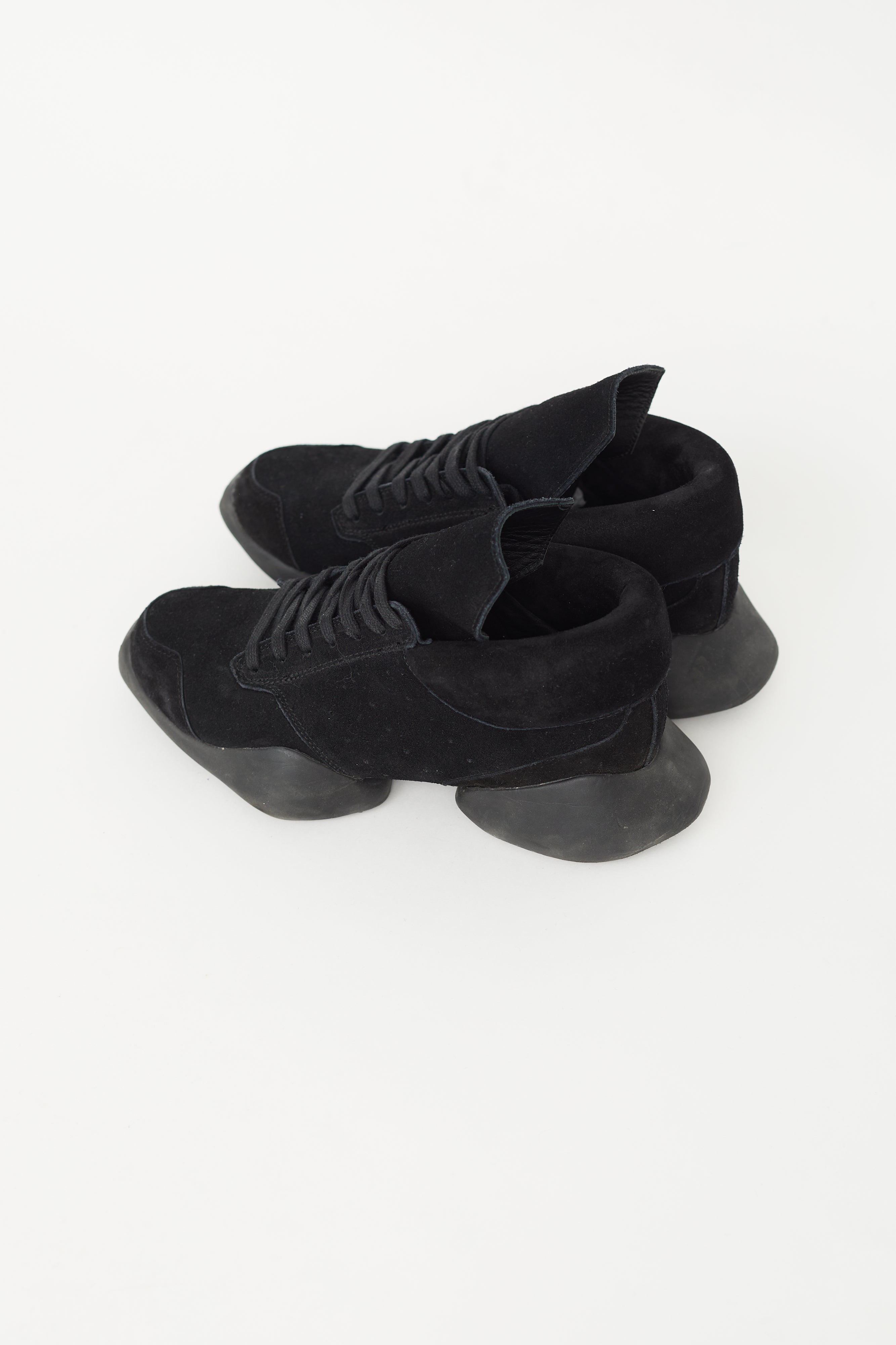 Pre-owned Rick Owens x Adidas black suede Tech Runner sneaker featuring oversized midsole, round toe, tonal lace up vamp and oversized tongue.