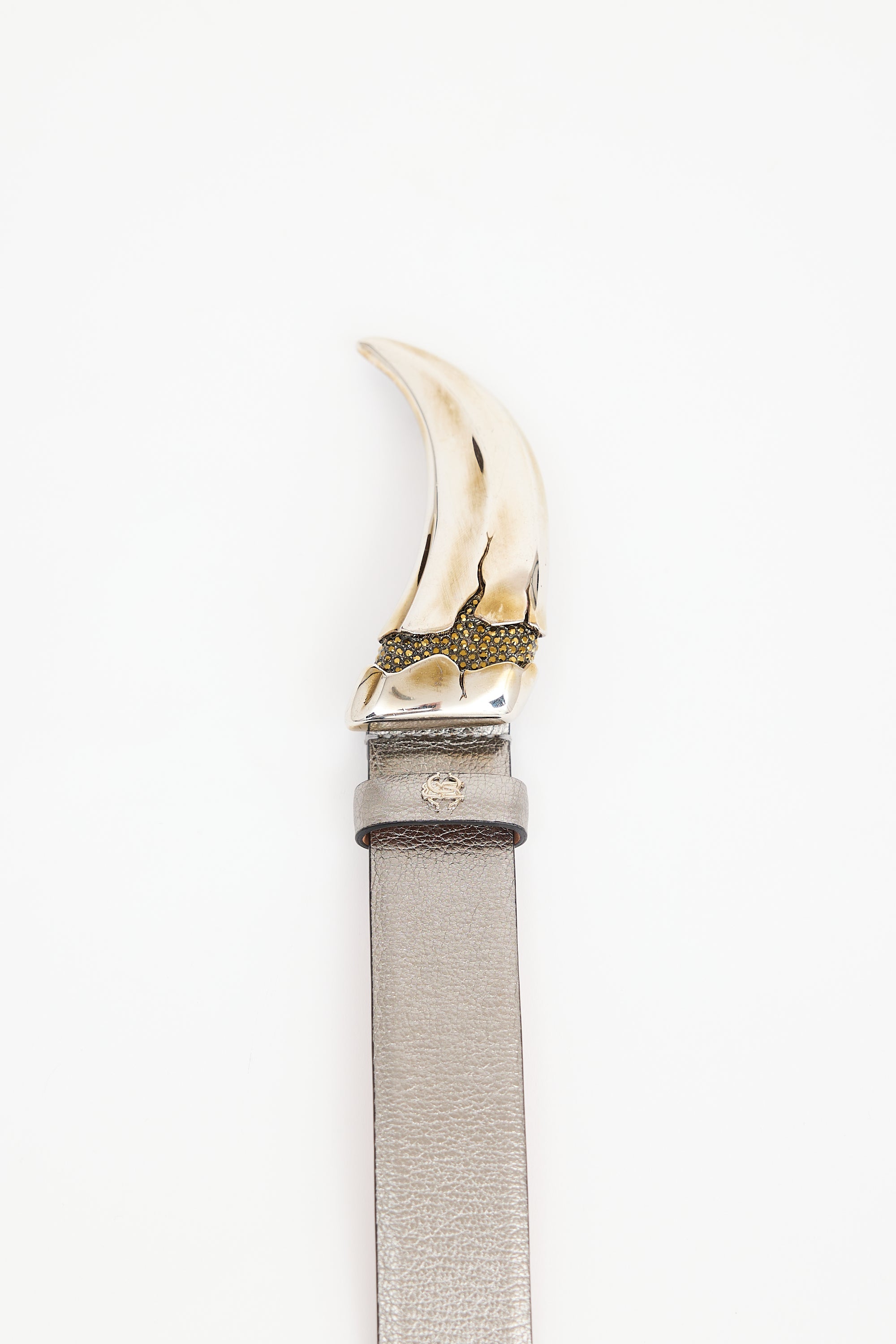 Pre-owned Roberto Cavalli silver tone metallic leather belt featuring silver tone tooth motif buckle, push pin closure, and stamped logo at reverse.
