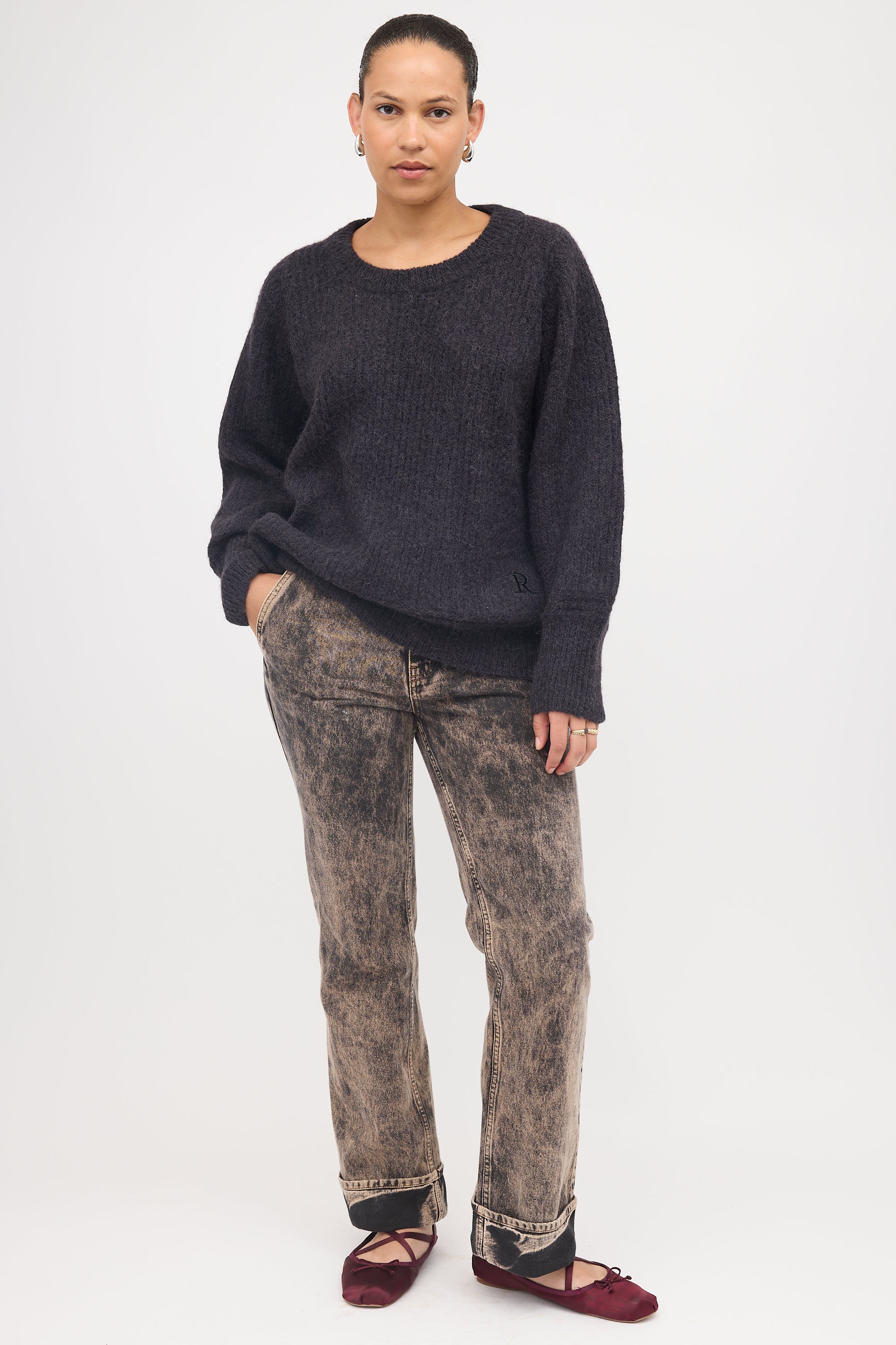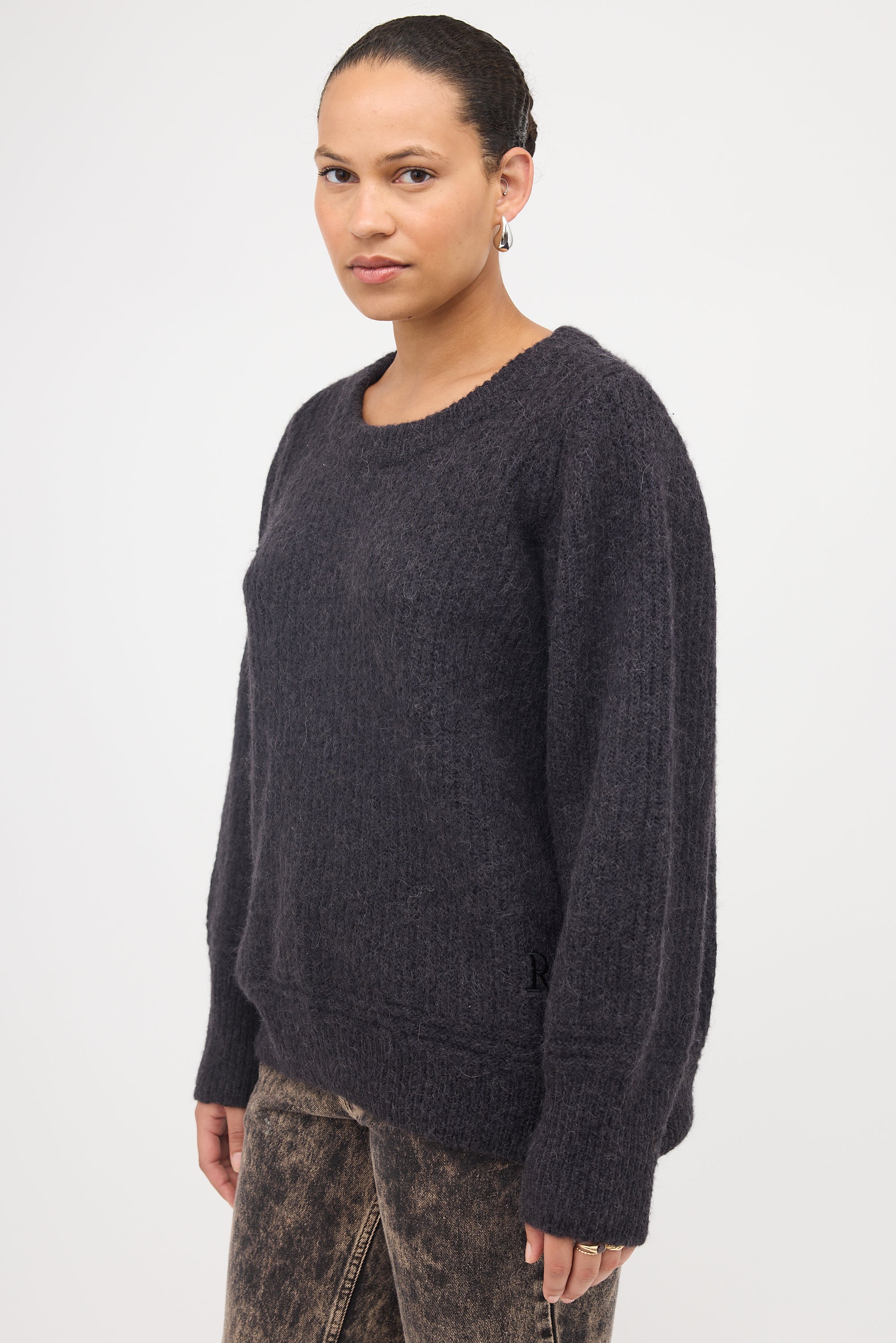Pre-owned Rodebjer dark grey alpaca Nyako sweater featuring a crew neckline, logo embroidery above ribbed hem, and ribbed cuffs.