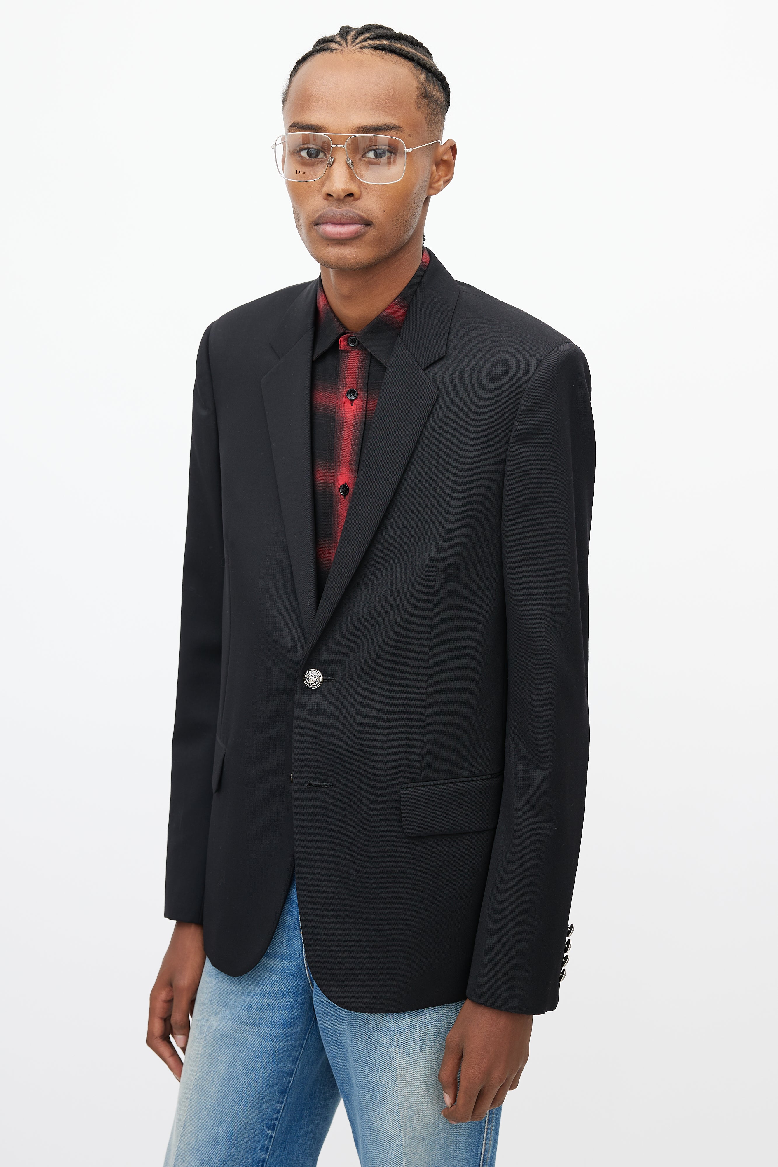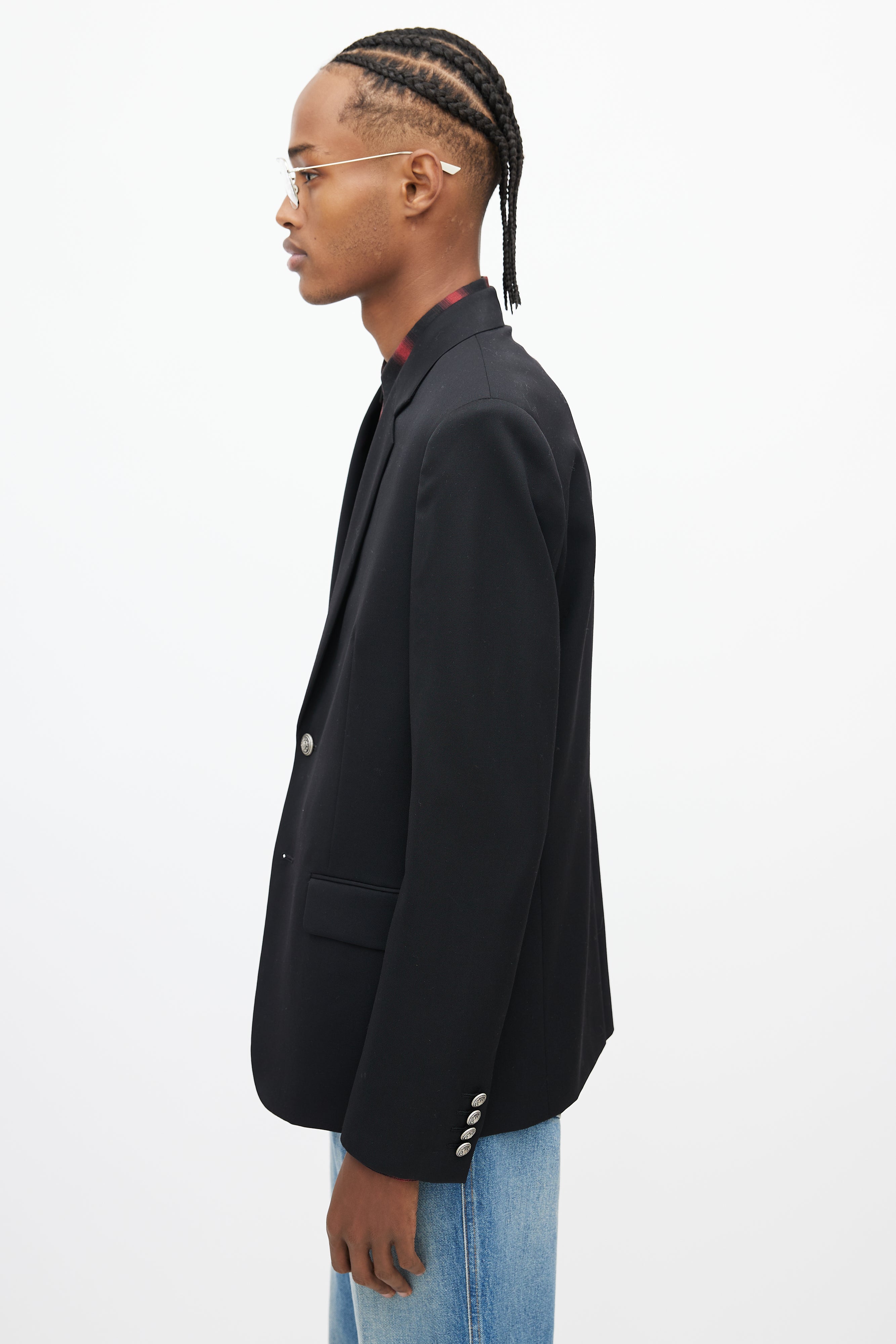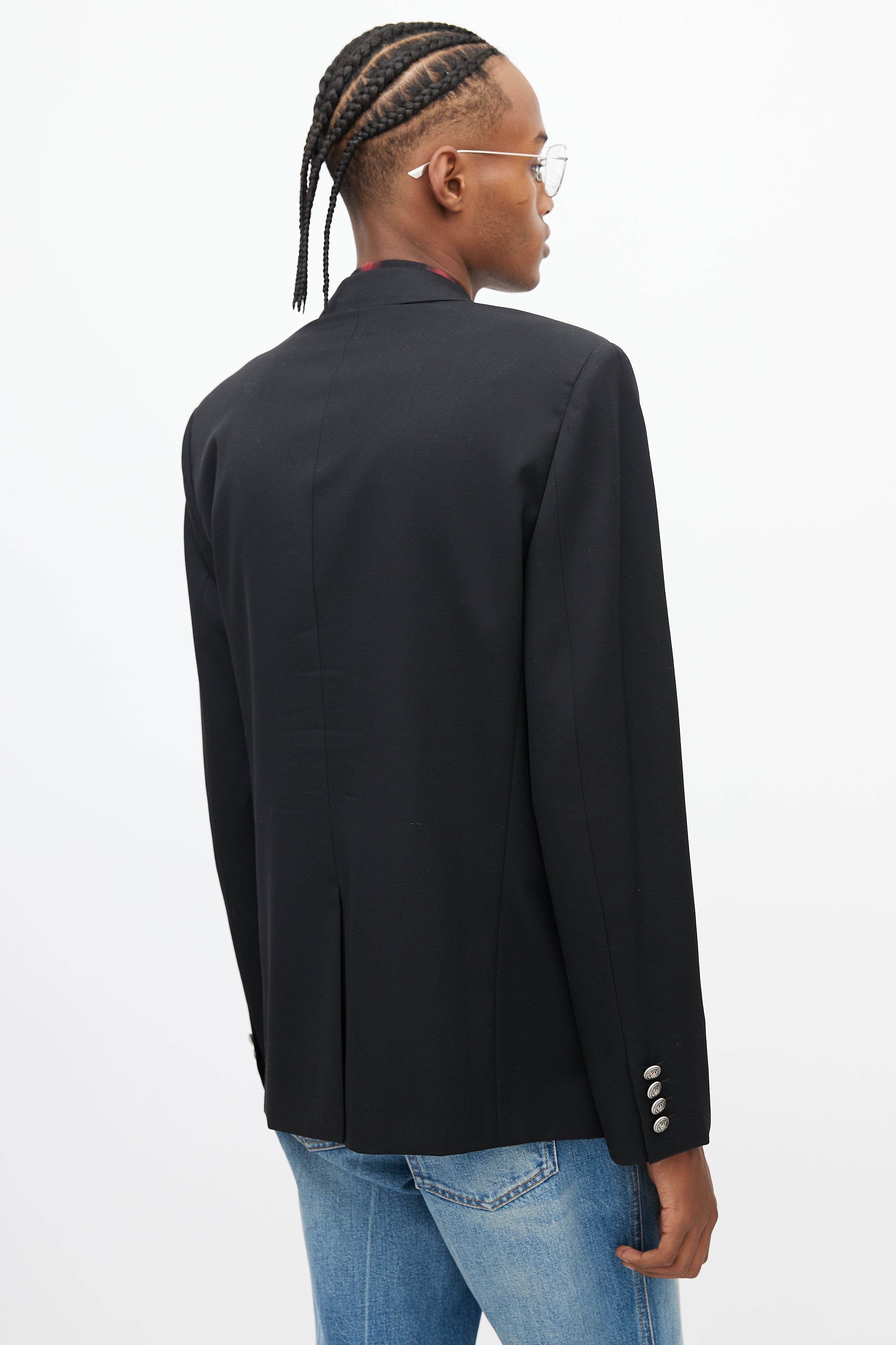 Pre-owned Saint Laurent black blazer featuring notch lapel, padded shoulders, silver tone medallion buttons closure, two flap pockets at hips, back vent, and buttoned cuffs. Lined.