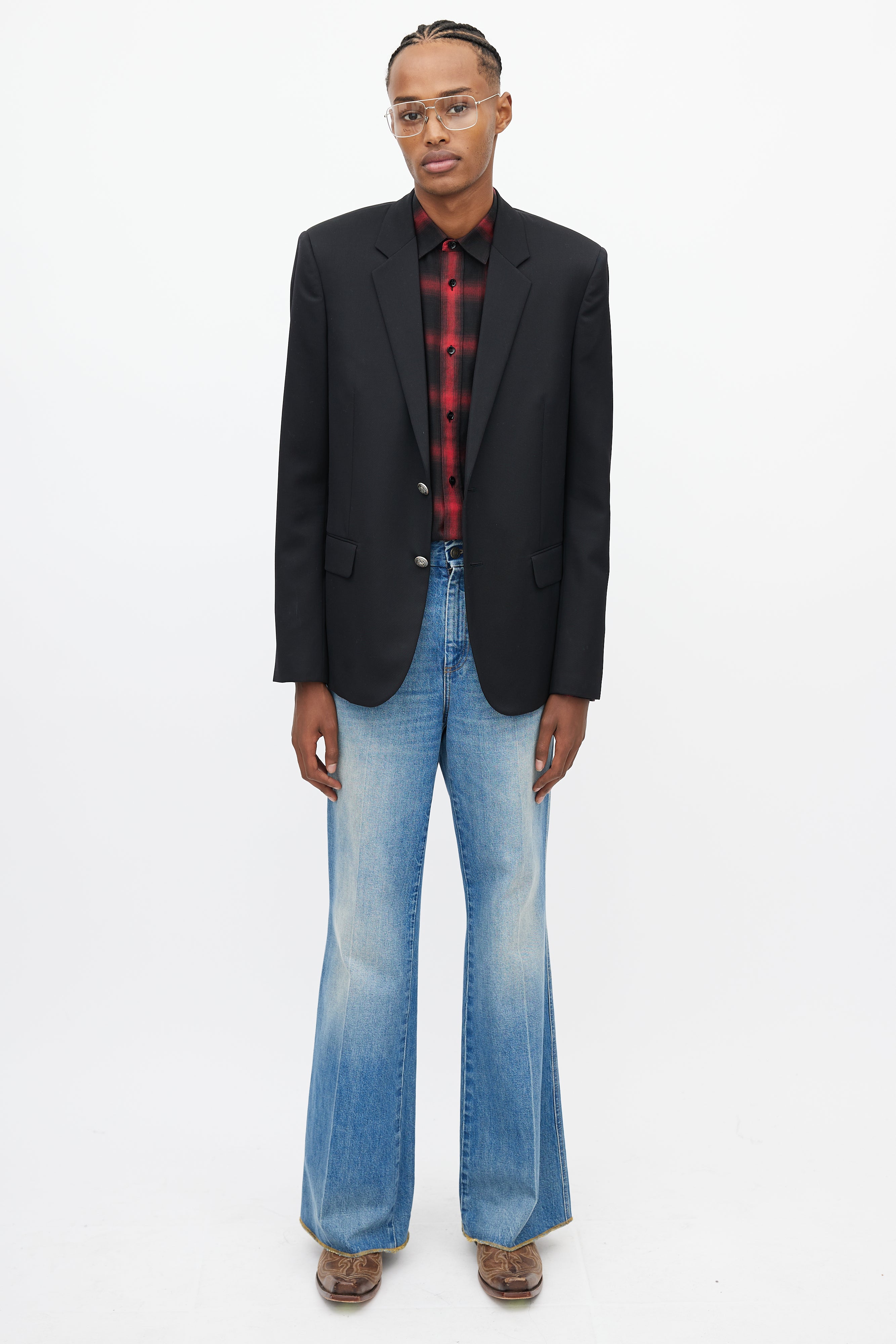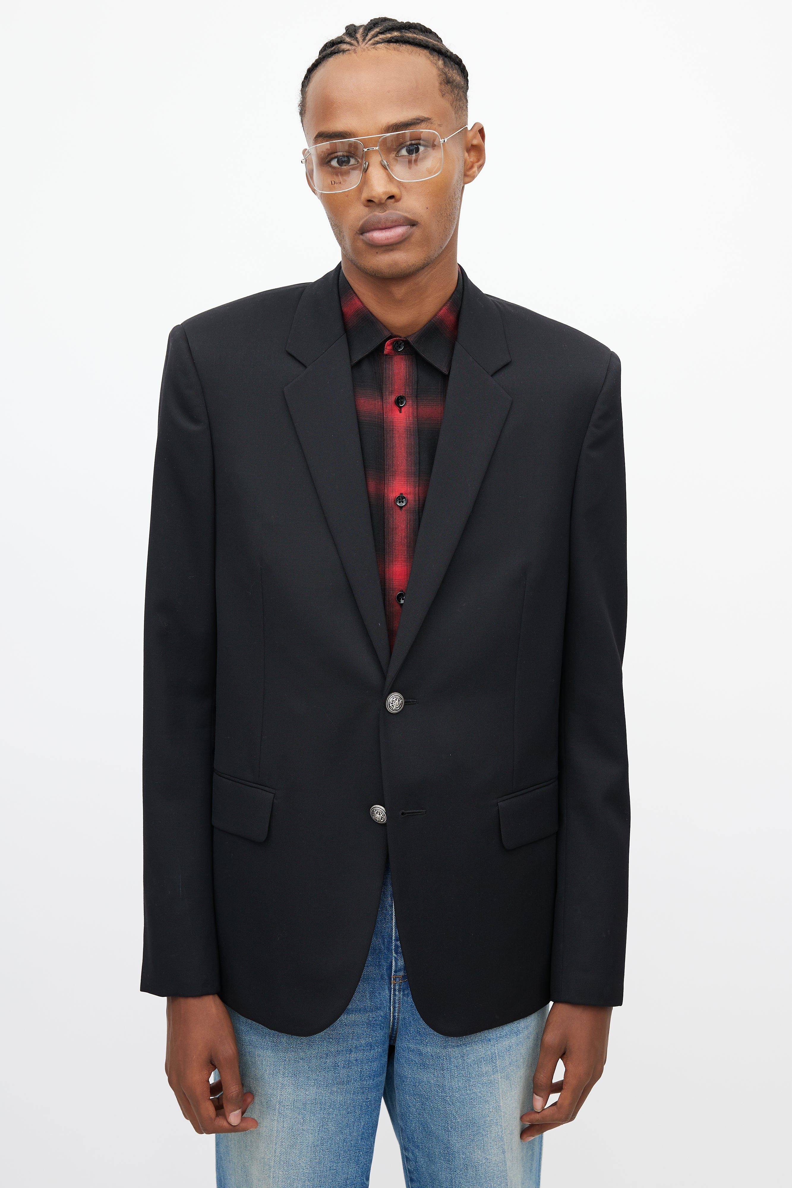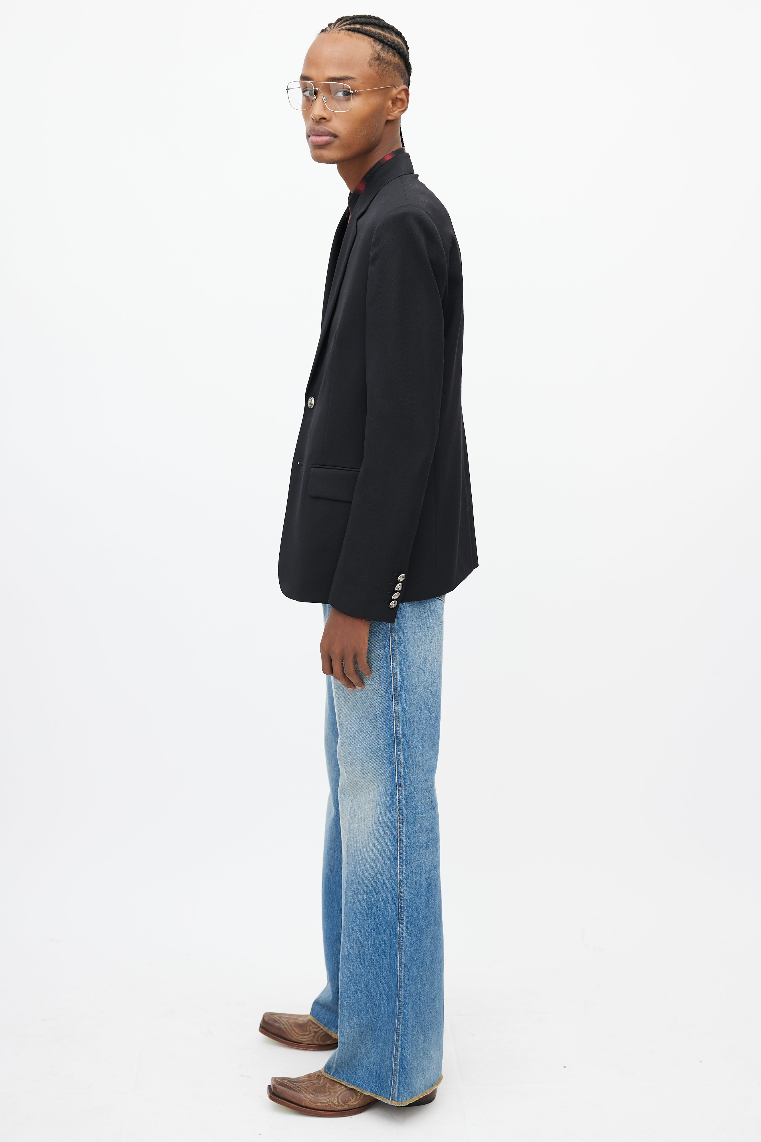 Pre-owned Saint Laurent black blazer featuring notch lapel, padded shoulders, silver tone medallion buttons closure, two flap pockets at hips, back vent, and buttoned cuffs. Lined.