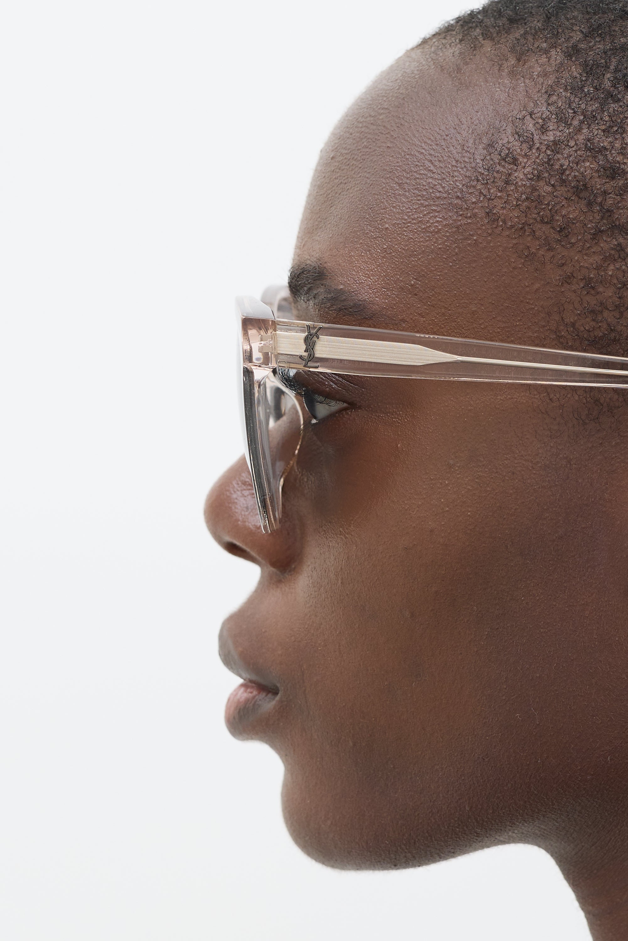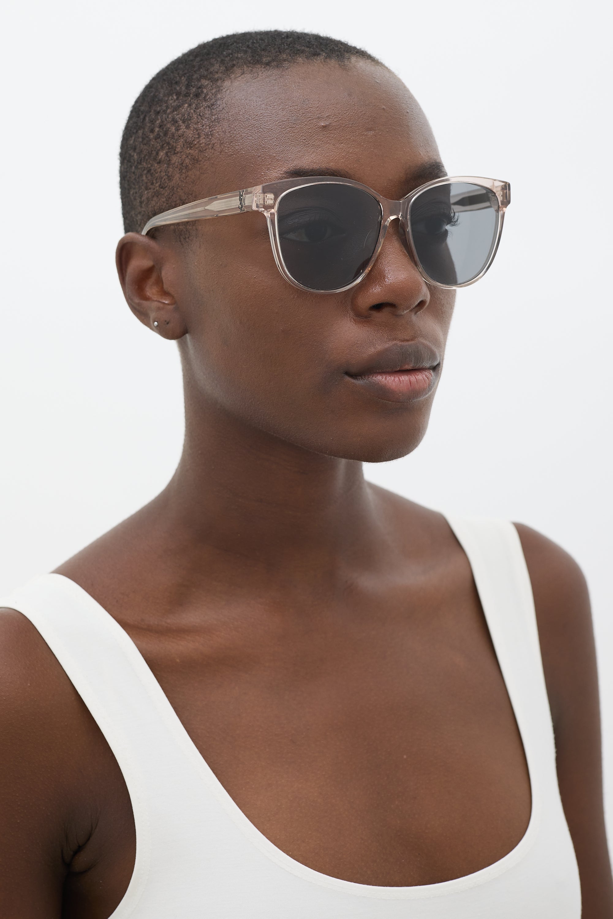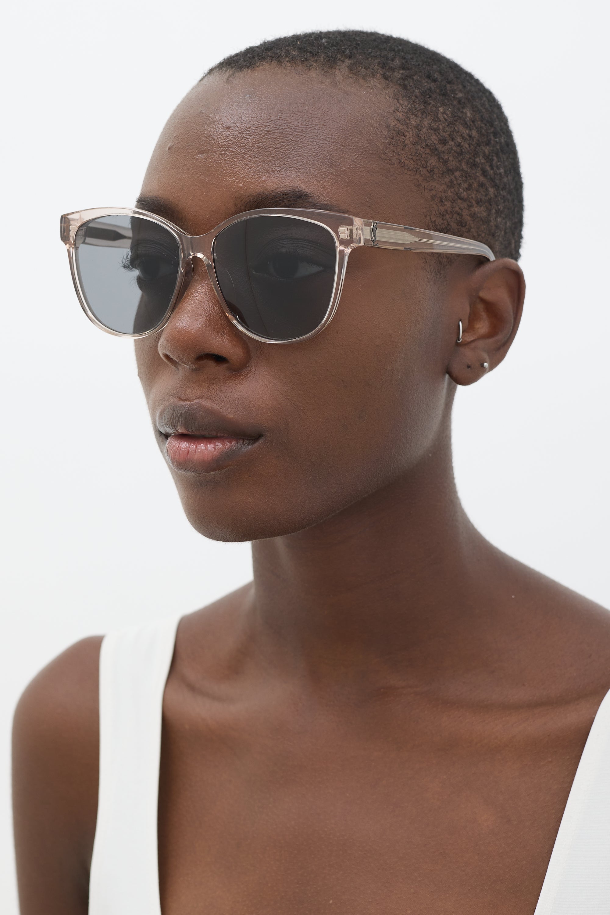 Pre-owned Saint Laurent SLM23/K featuring grey tinted lenses, lightly tinted grey transparent acetate round frame, and gunmetal tone logo hardware embellishment at temples. Comes with original case.