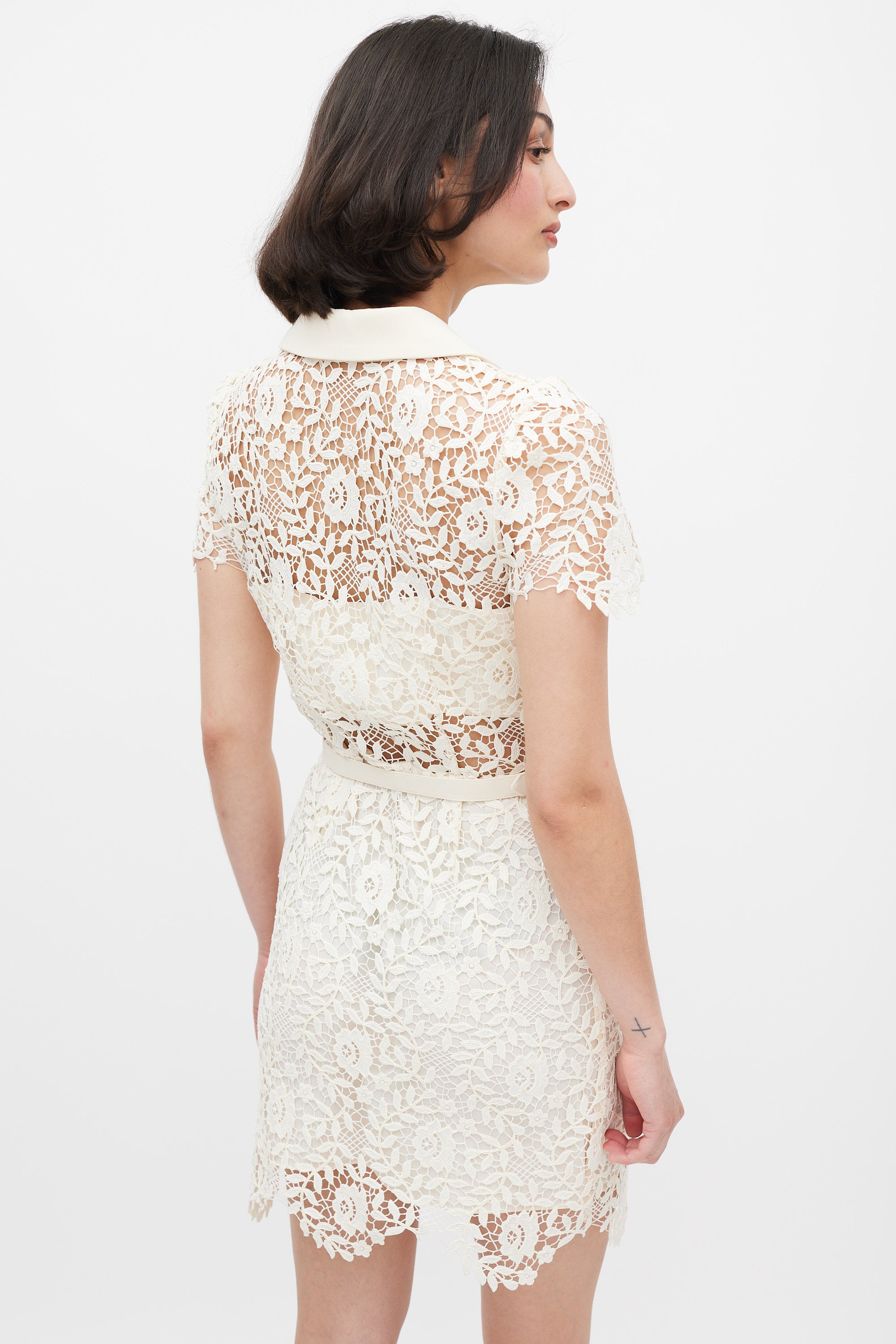 Pre-owned Self-Portrait cream rose Guipure lace mini dress featuring a peak collar, snap button up front, floral motif decorative buttons at front, belted waist, two front buttoned flap pockets, and short sleeves. Panelled lining.