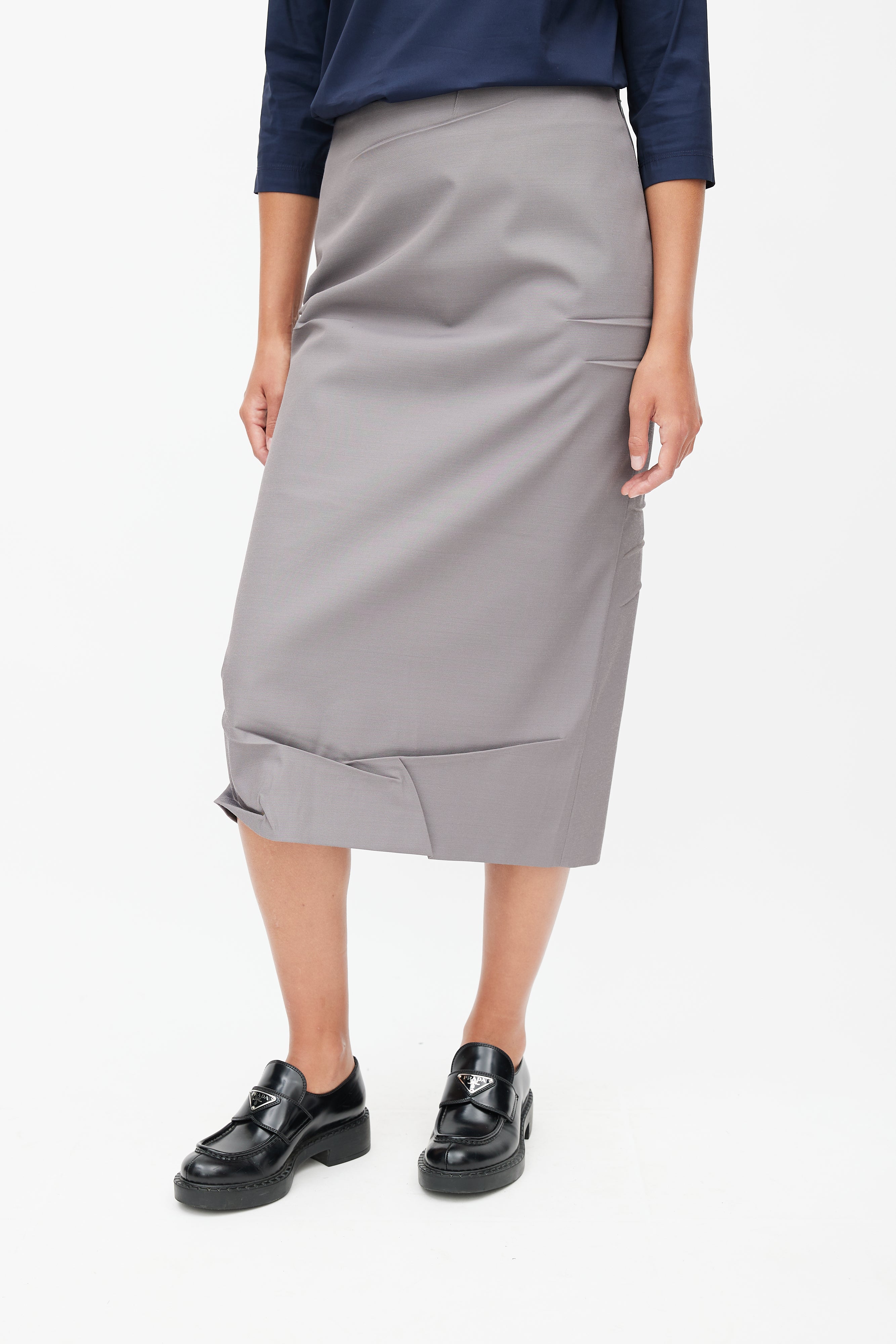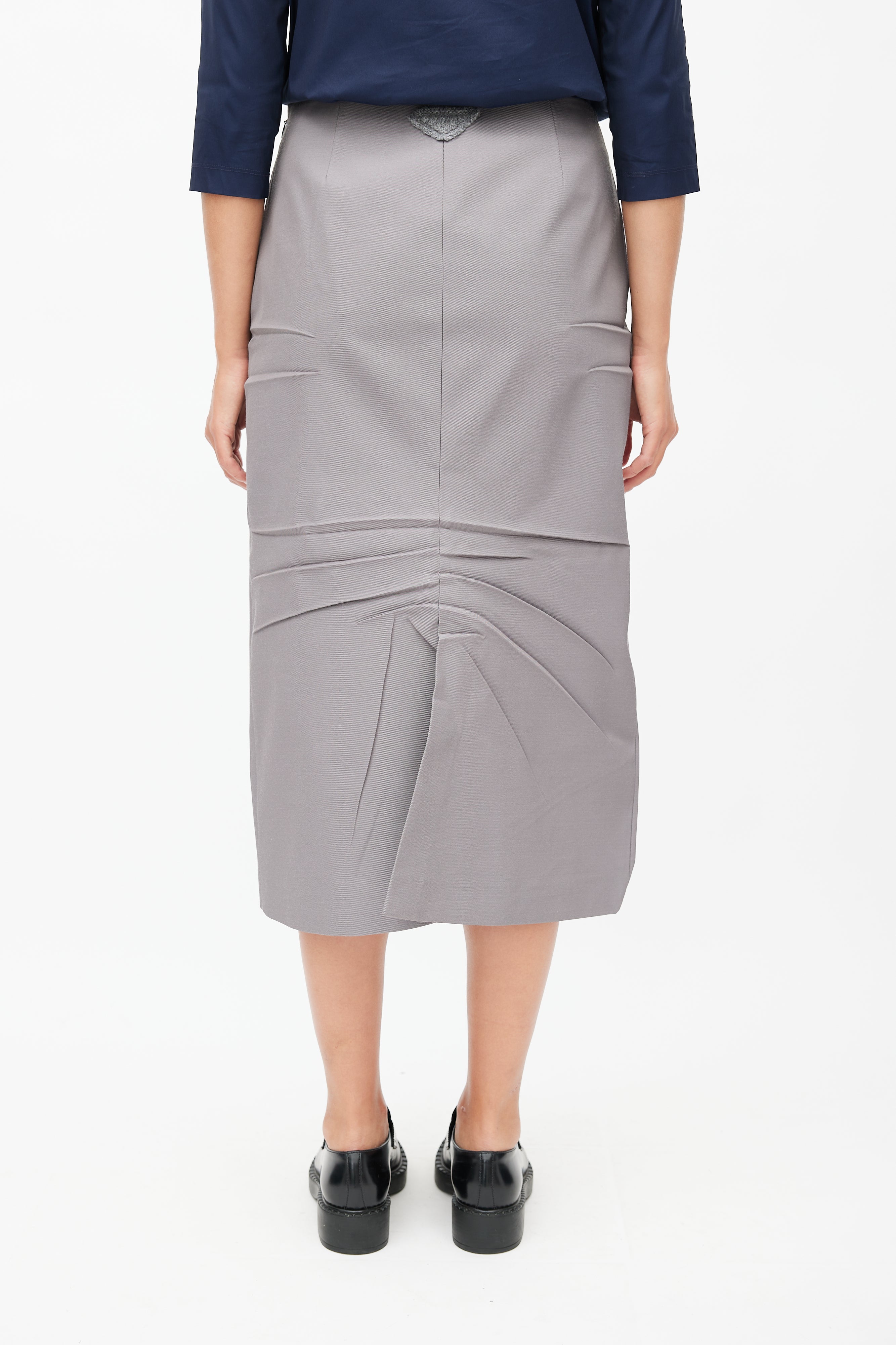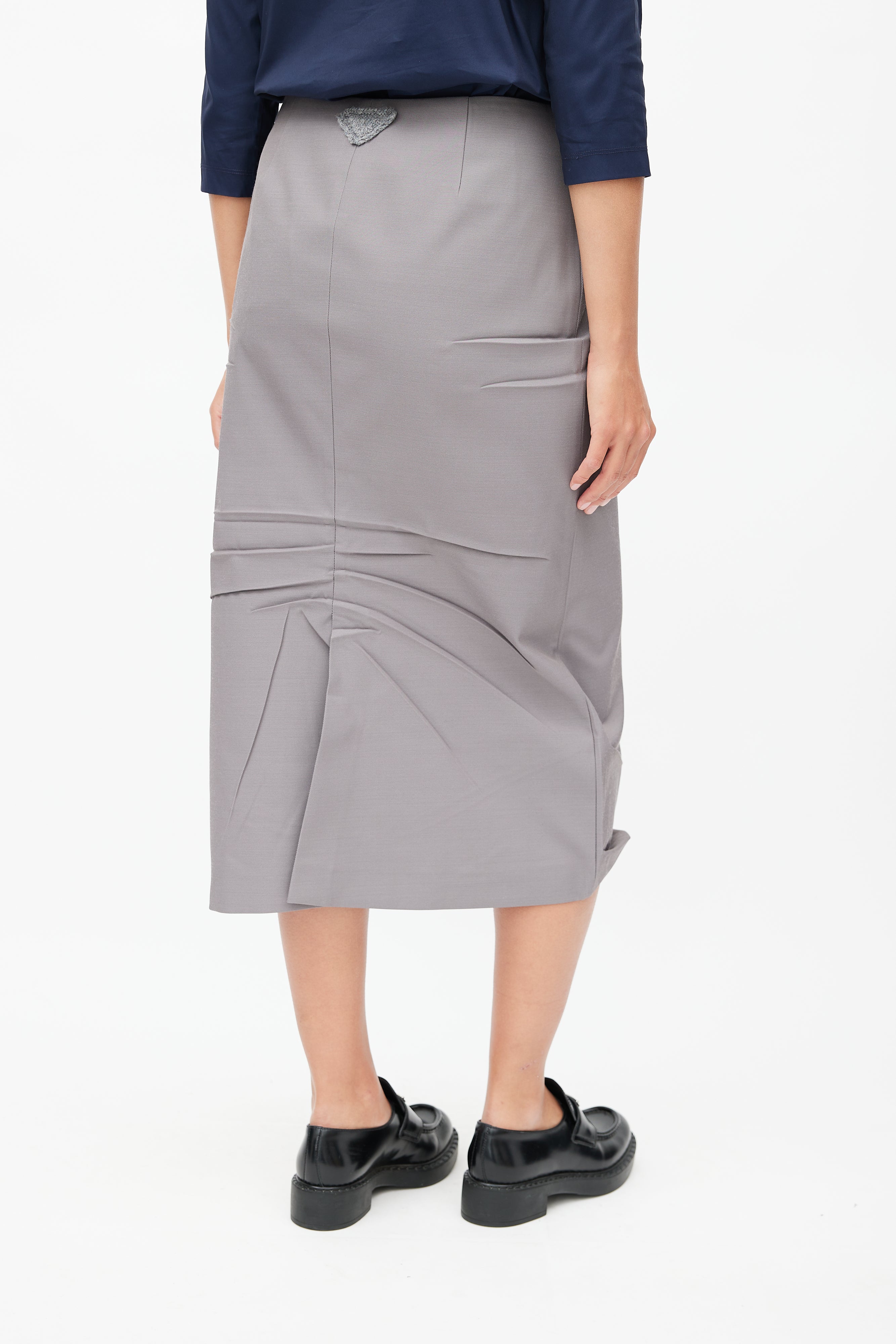 Pre-owned Spring/Summer 2023 Prada grey skirt featuring creased detailing throughout, knit logo patch at back, and zip at side with hook and eye closure.