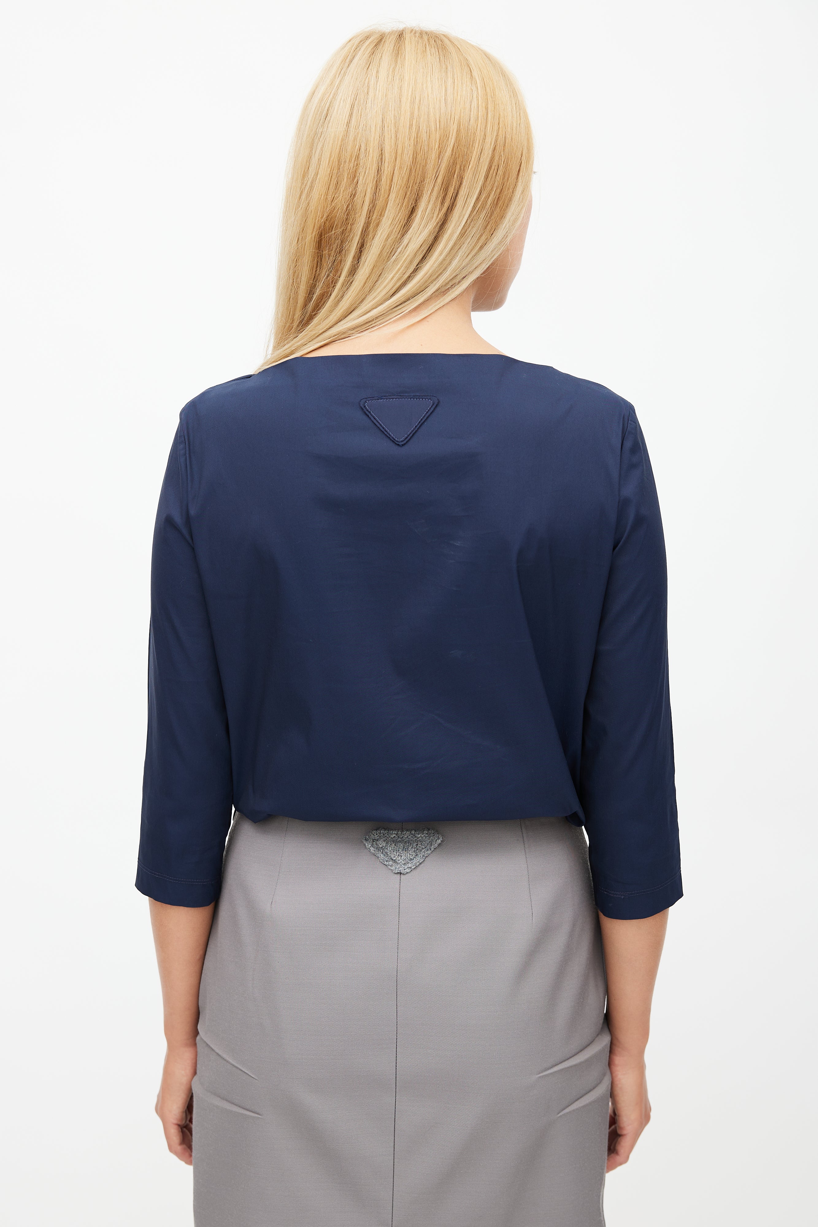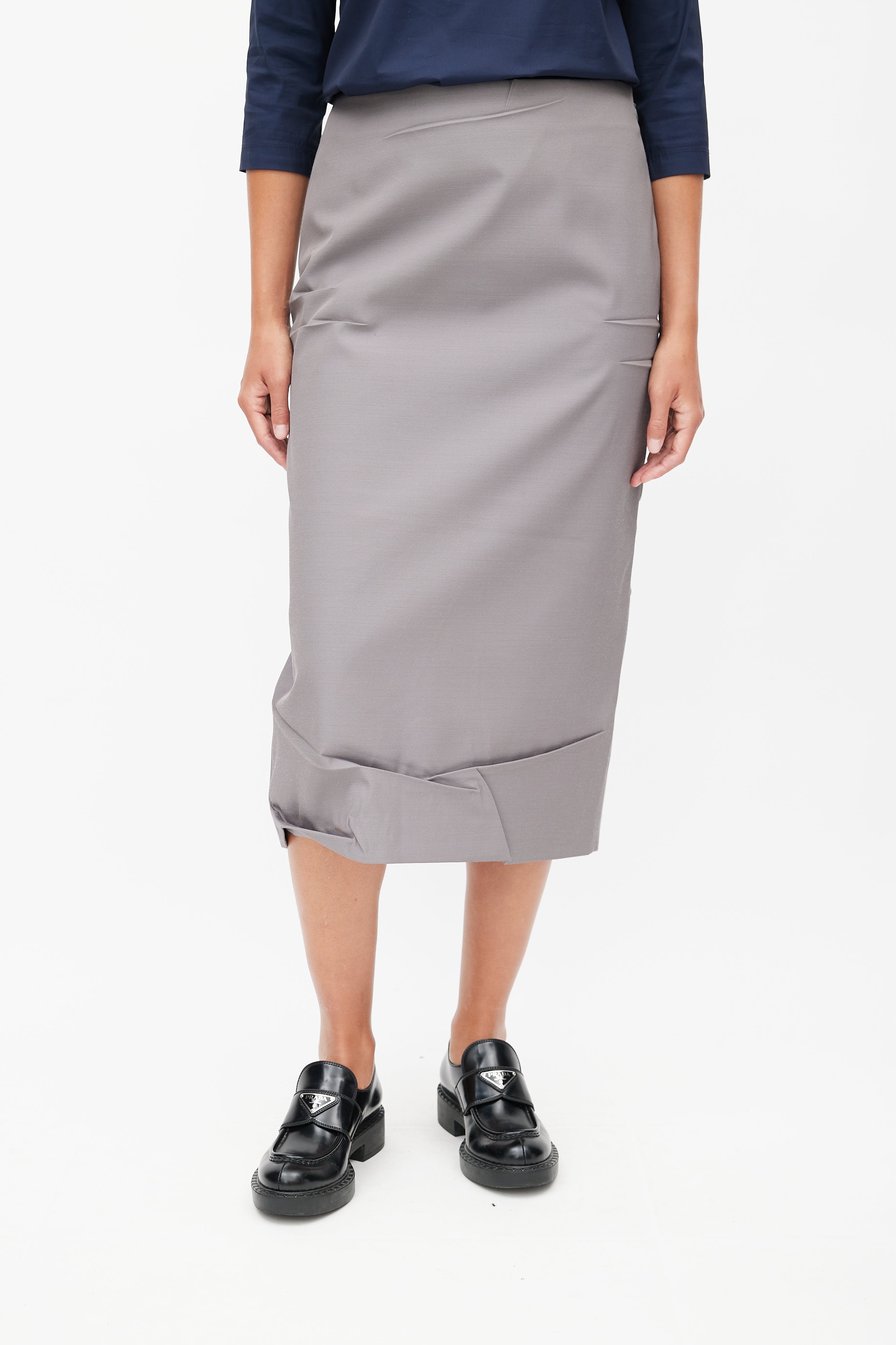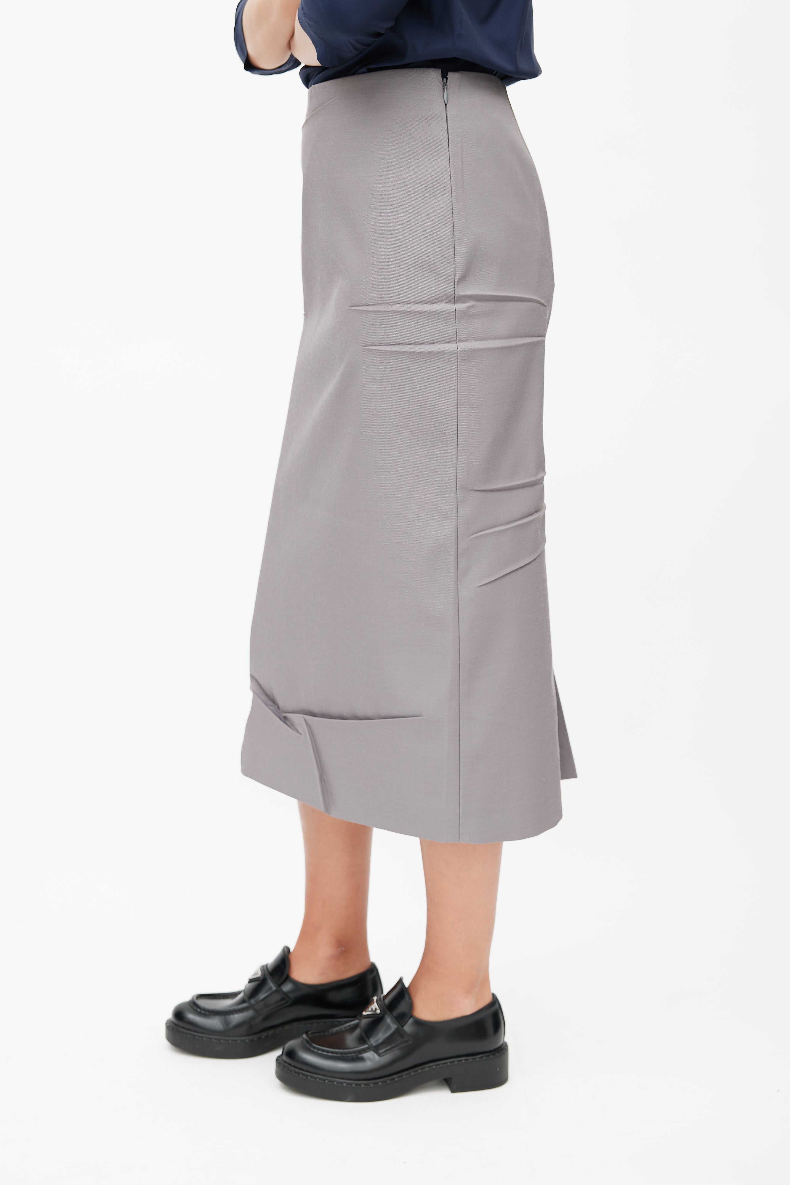 Pre-owned Spring/Summer 2023 Prada grey skirt featuring creased detailing throughout, knit logo patch at back, and zip at side with hook and eye closure.