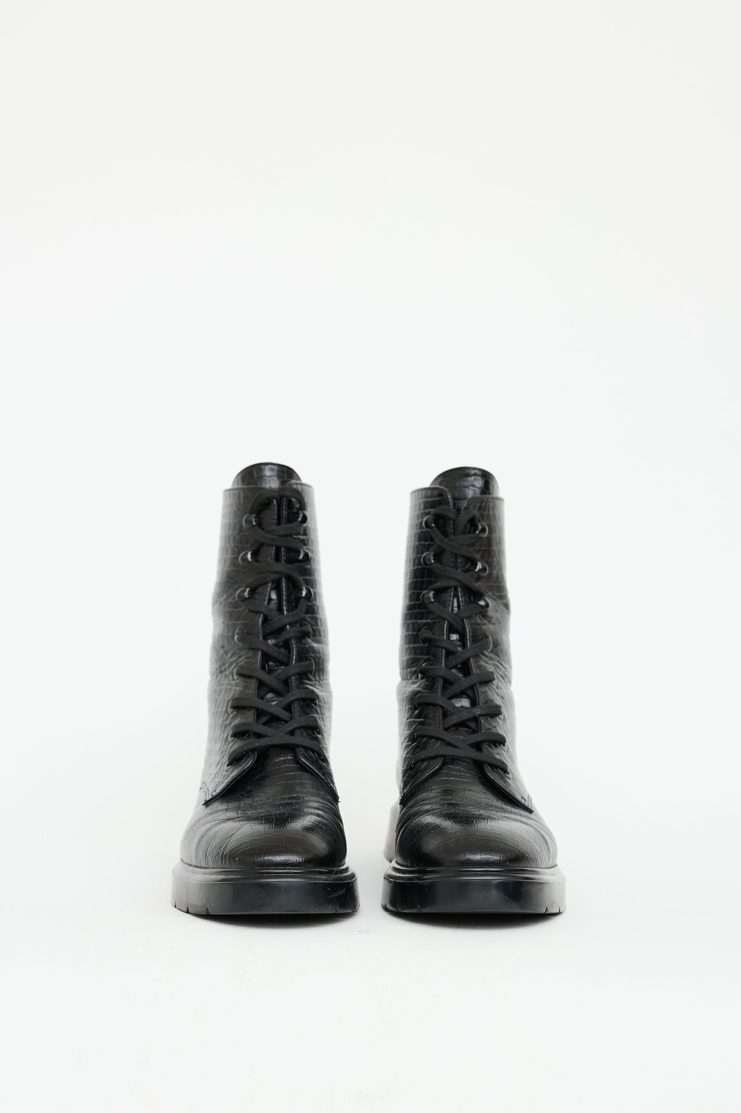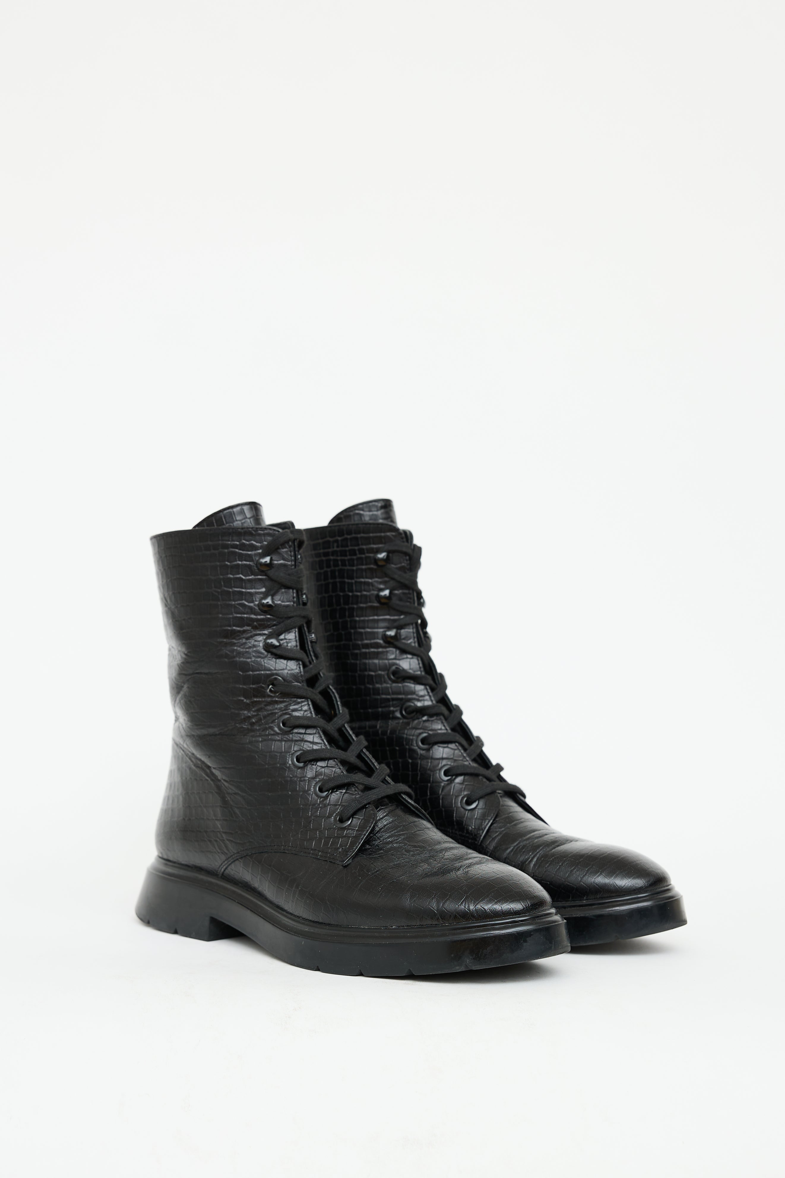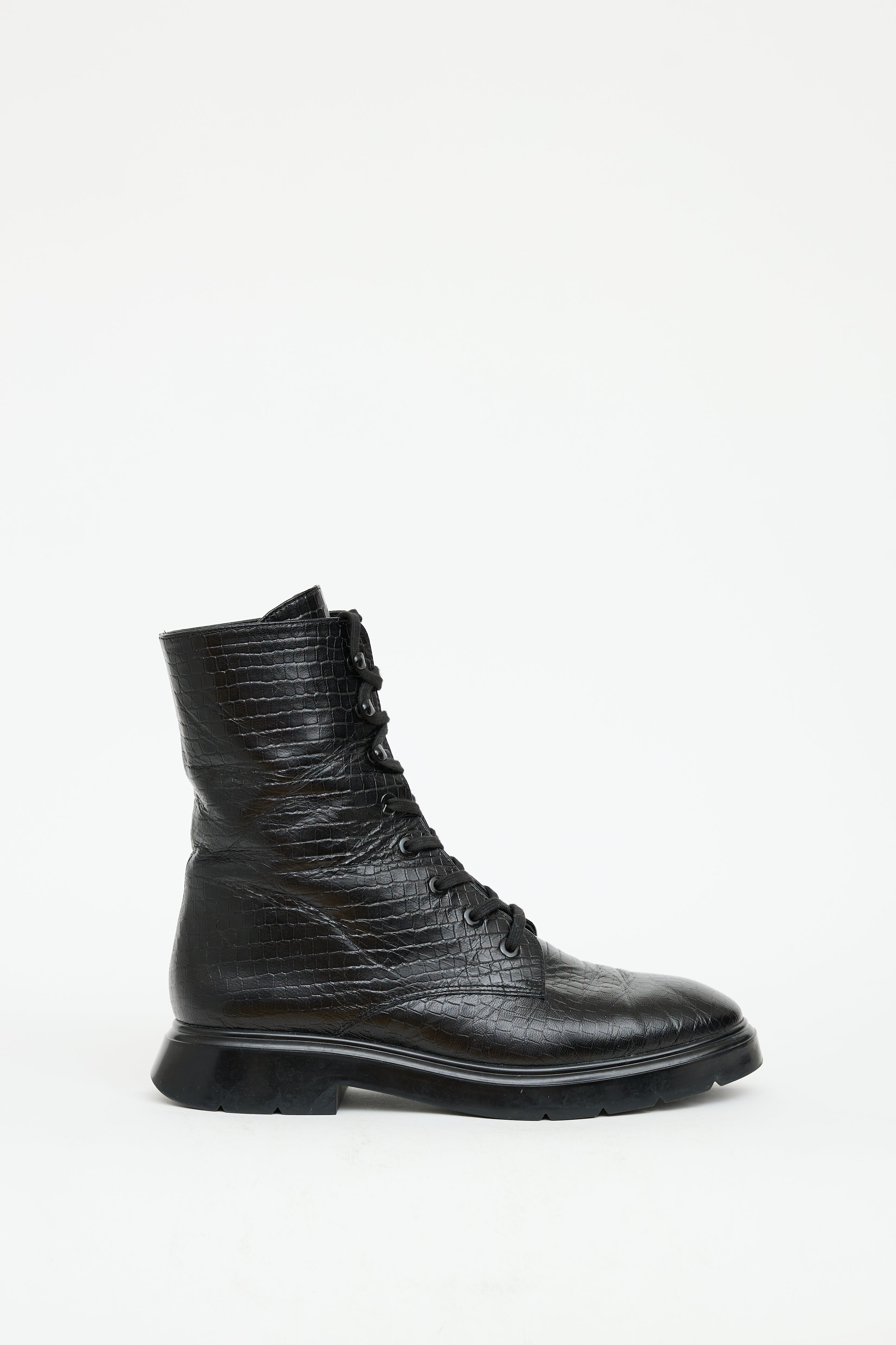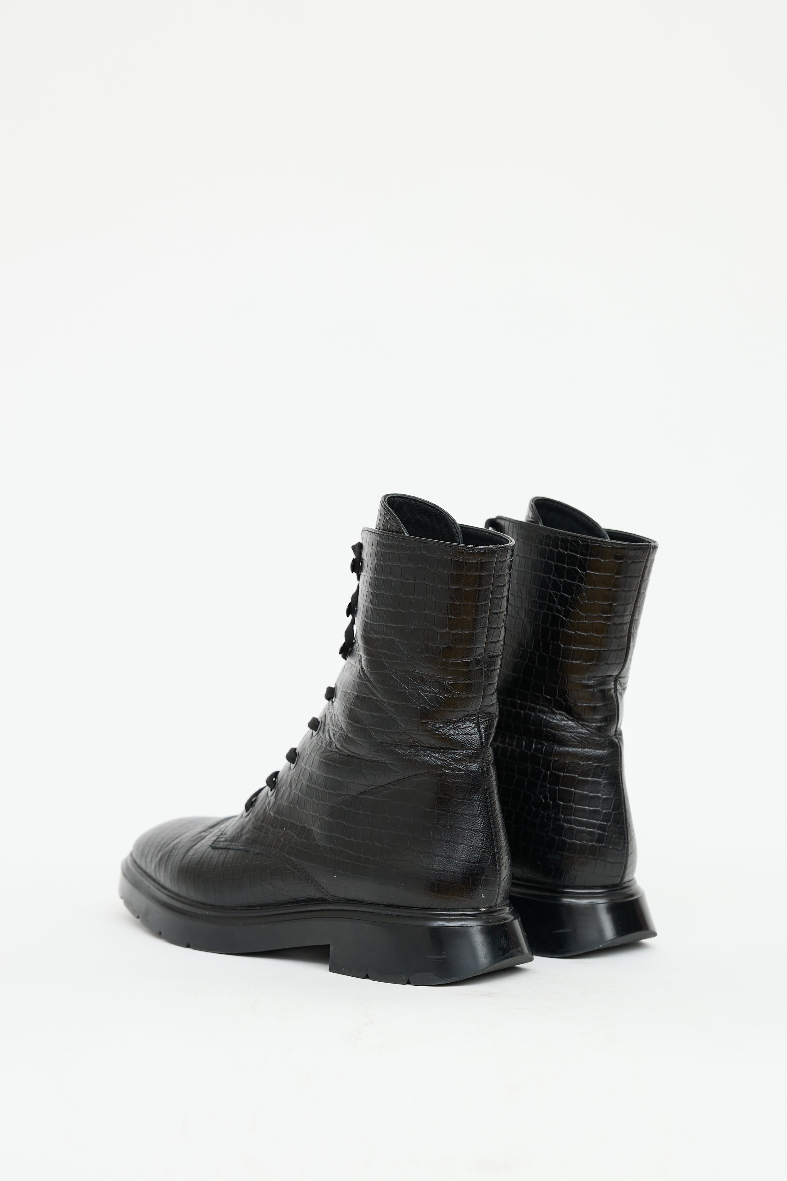Pre-owned Stuart Weitzman black leather ankle boots featuring a rounded toe, embossed croc effect throughout, ankle height shaft, treaded outsole, and lace up closure.