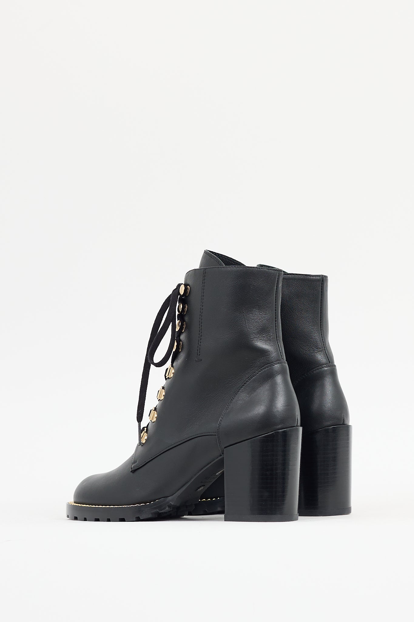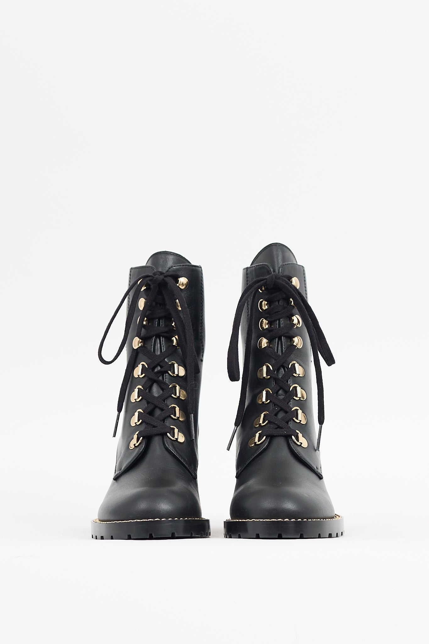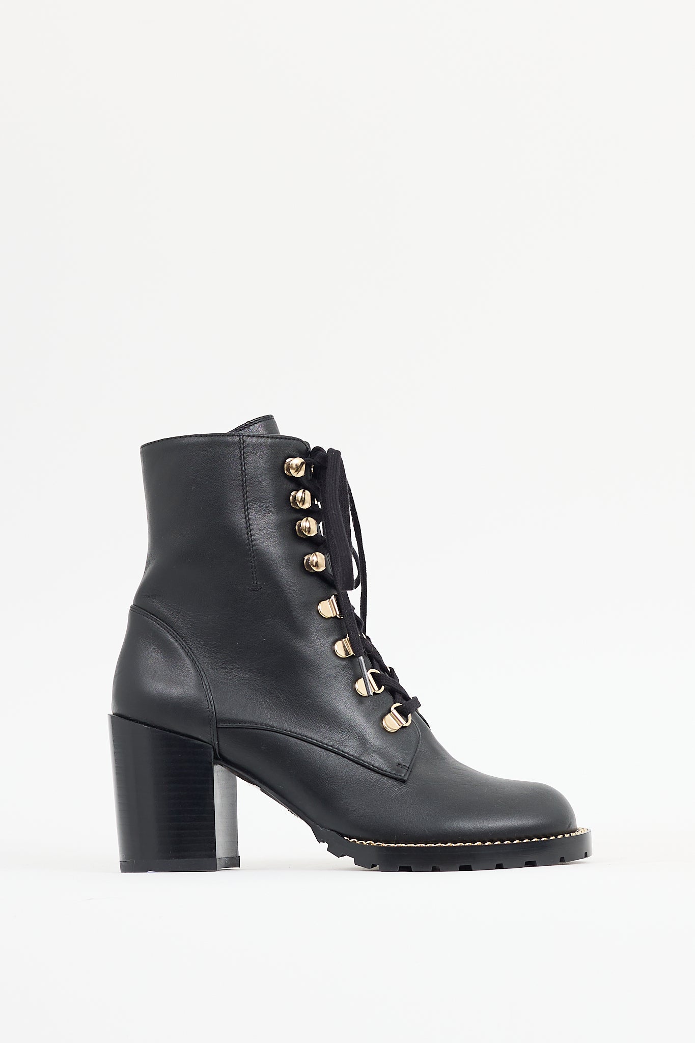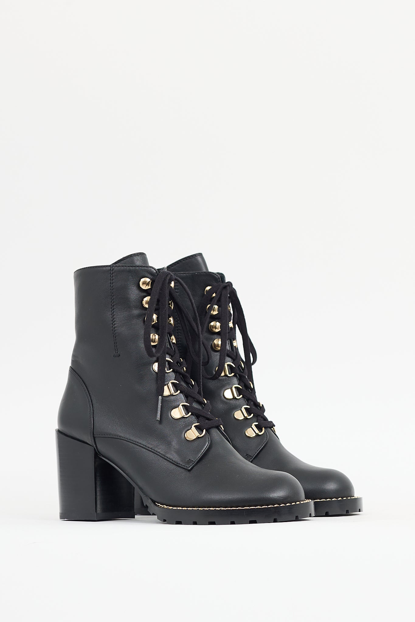 Pre-owned Stuart Weitzman black Kolbie leather boots featuring a round toe, gold tone chain link trim at midsole, stacked block heel, lug sole, and lace up closure. Comes with original dust bag.