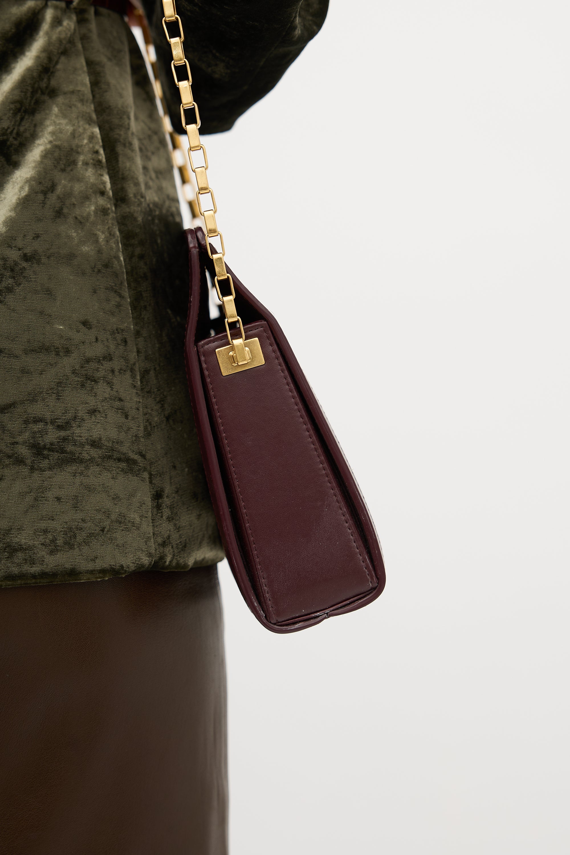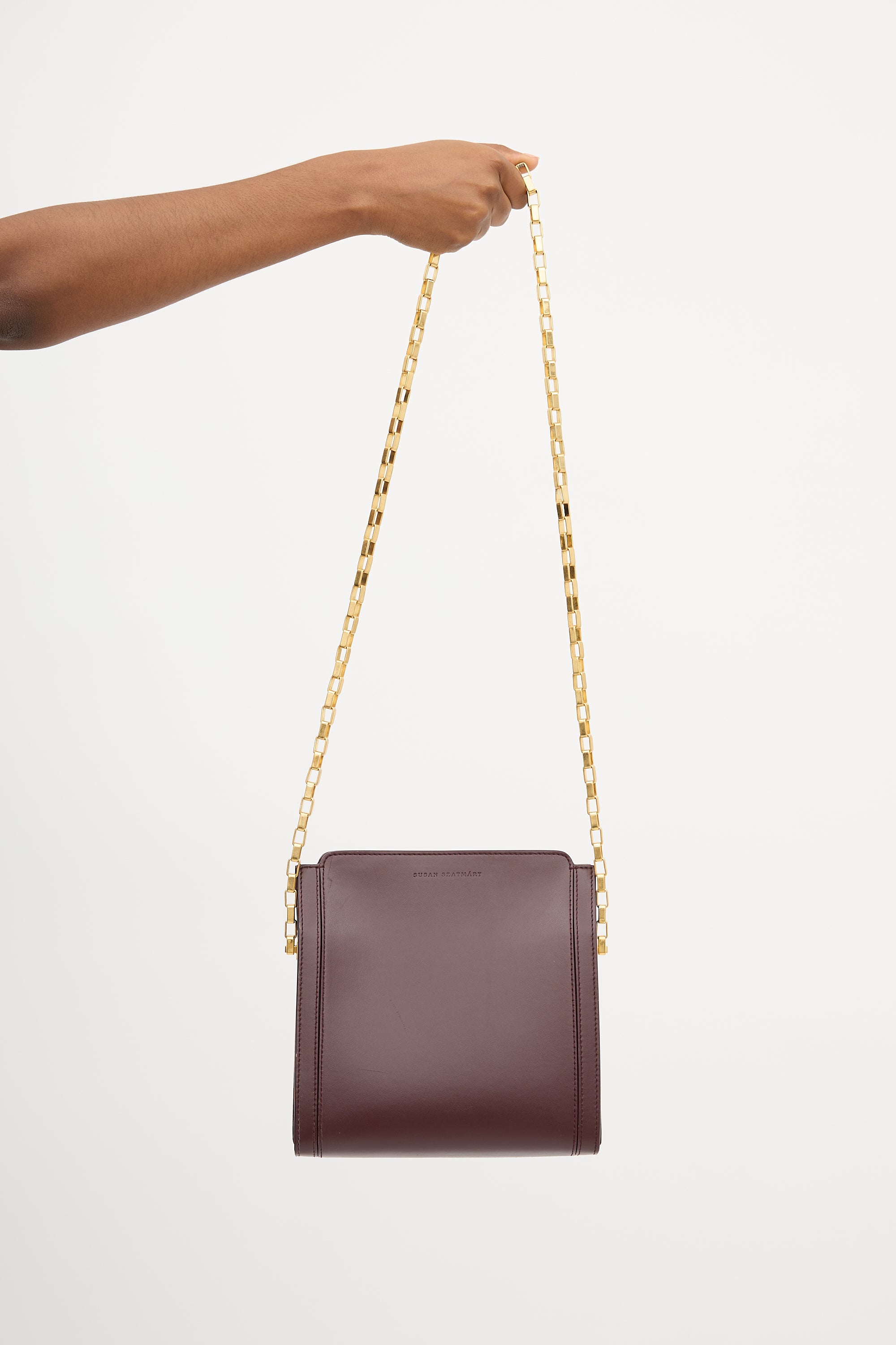 Pre-owned Susan Szatmáry burgundy leather Saint Germain crossbody bag featuring stamped logo at top centre front, gold tone box chain strap, magnetic top closure, and one lined main compartment with two exterior slip pockets. Comes with original dust bag.