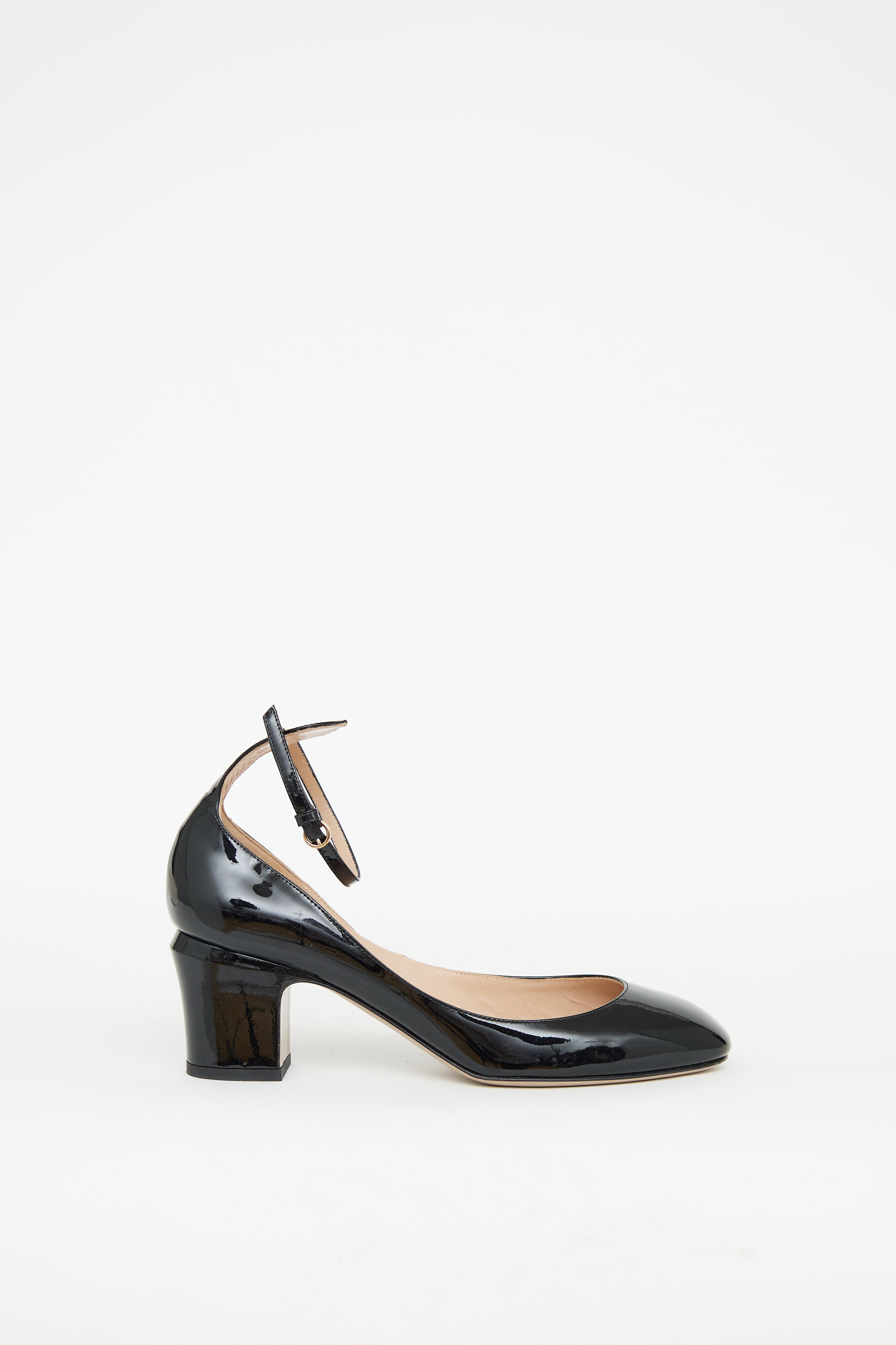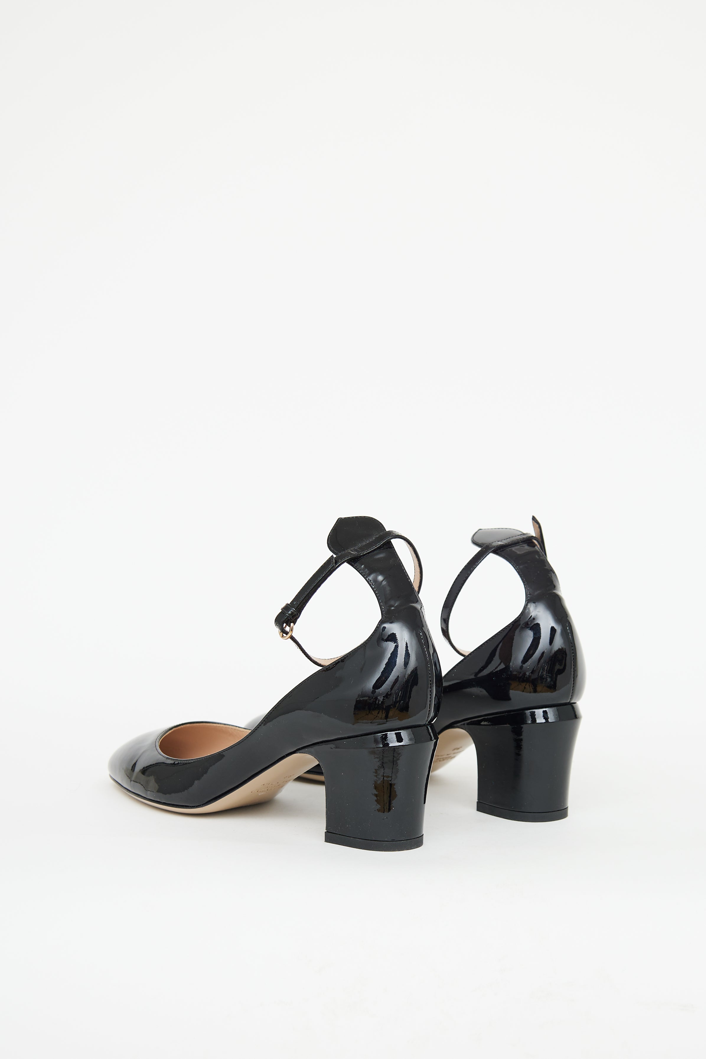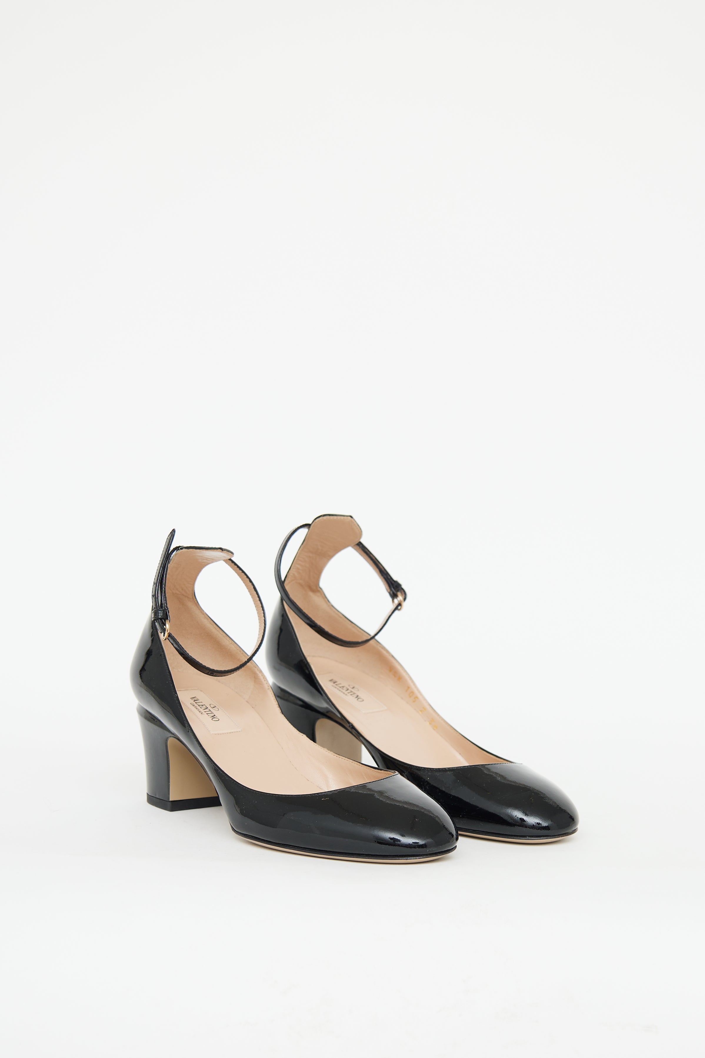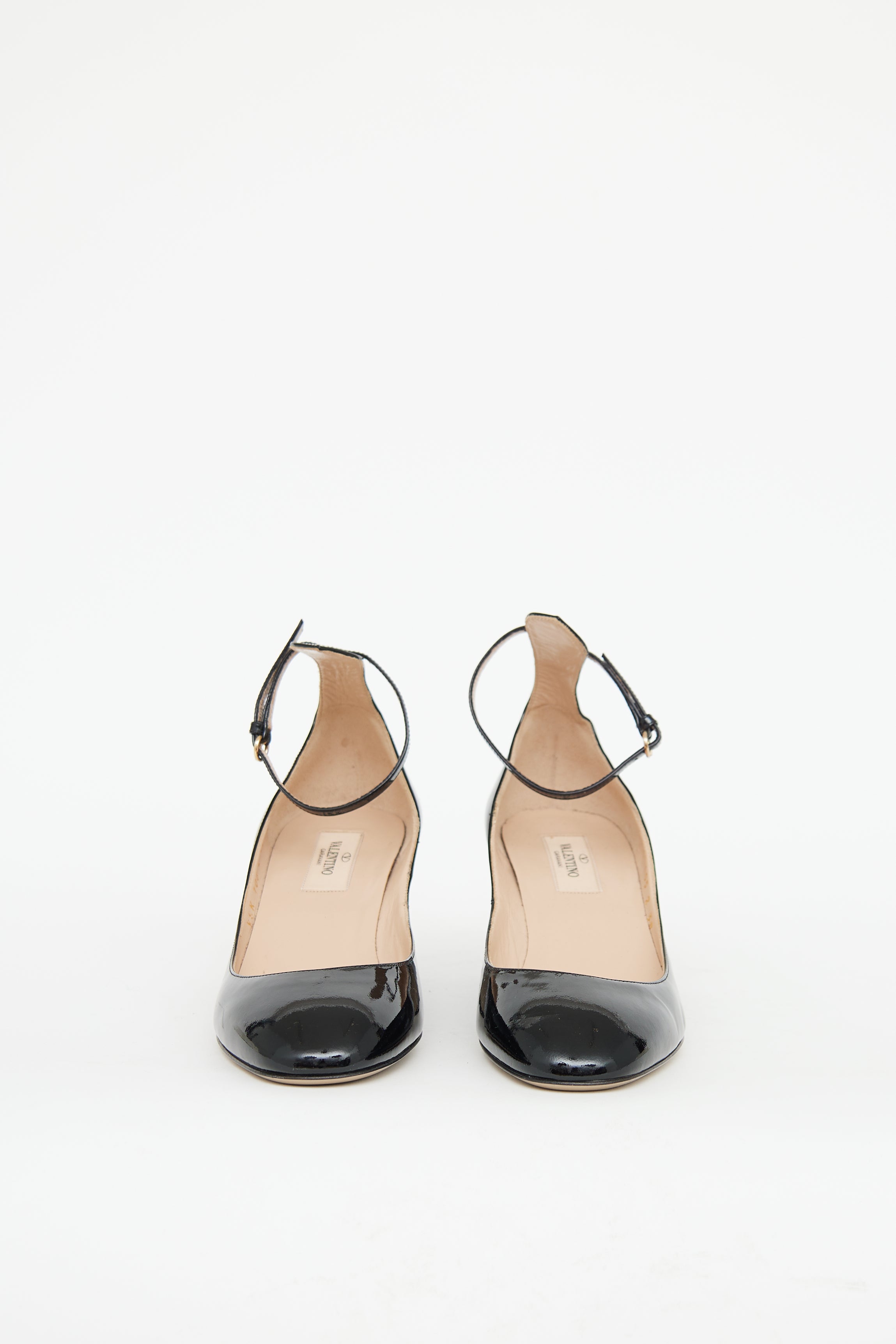 Pre-owned Valentino black patent leather pumps featuring round toe, adjustable ankle strap and covered block heel.