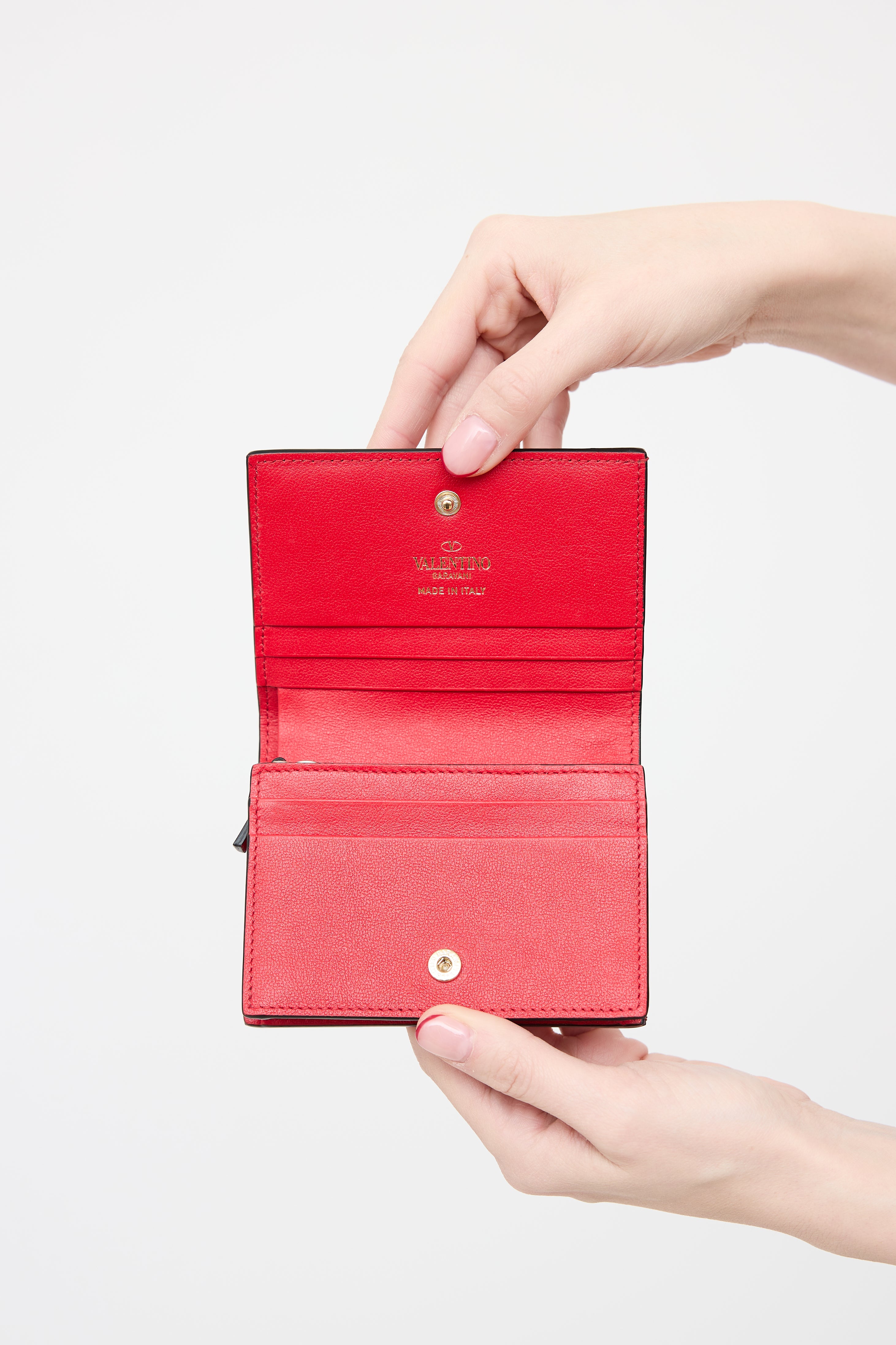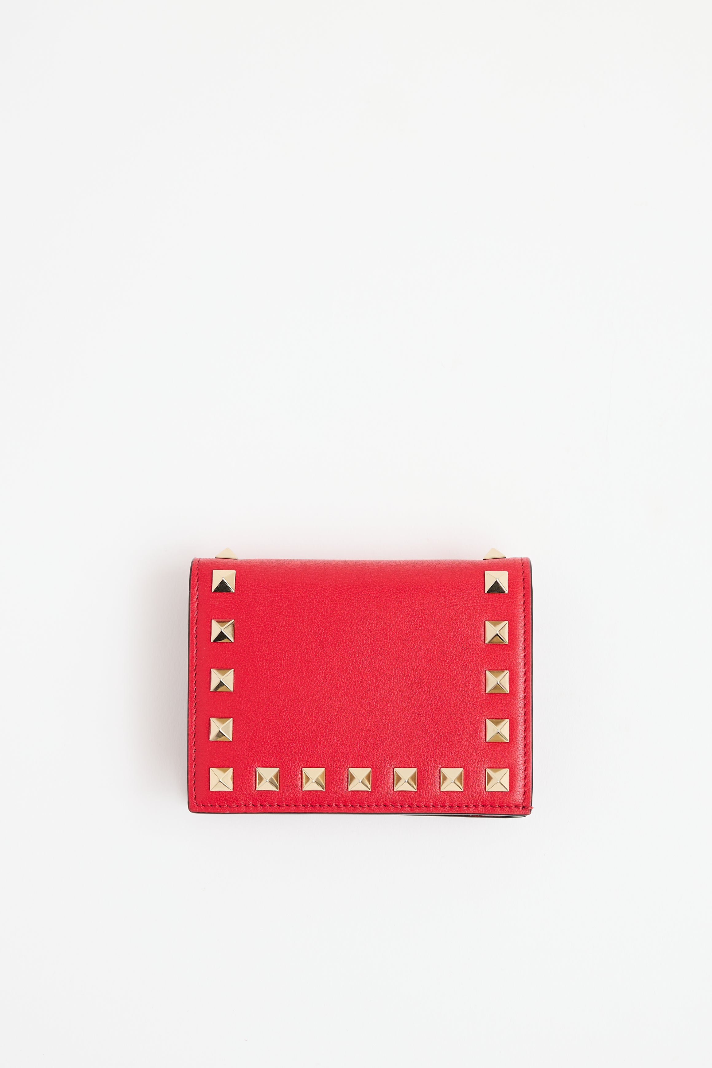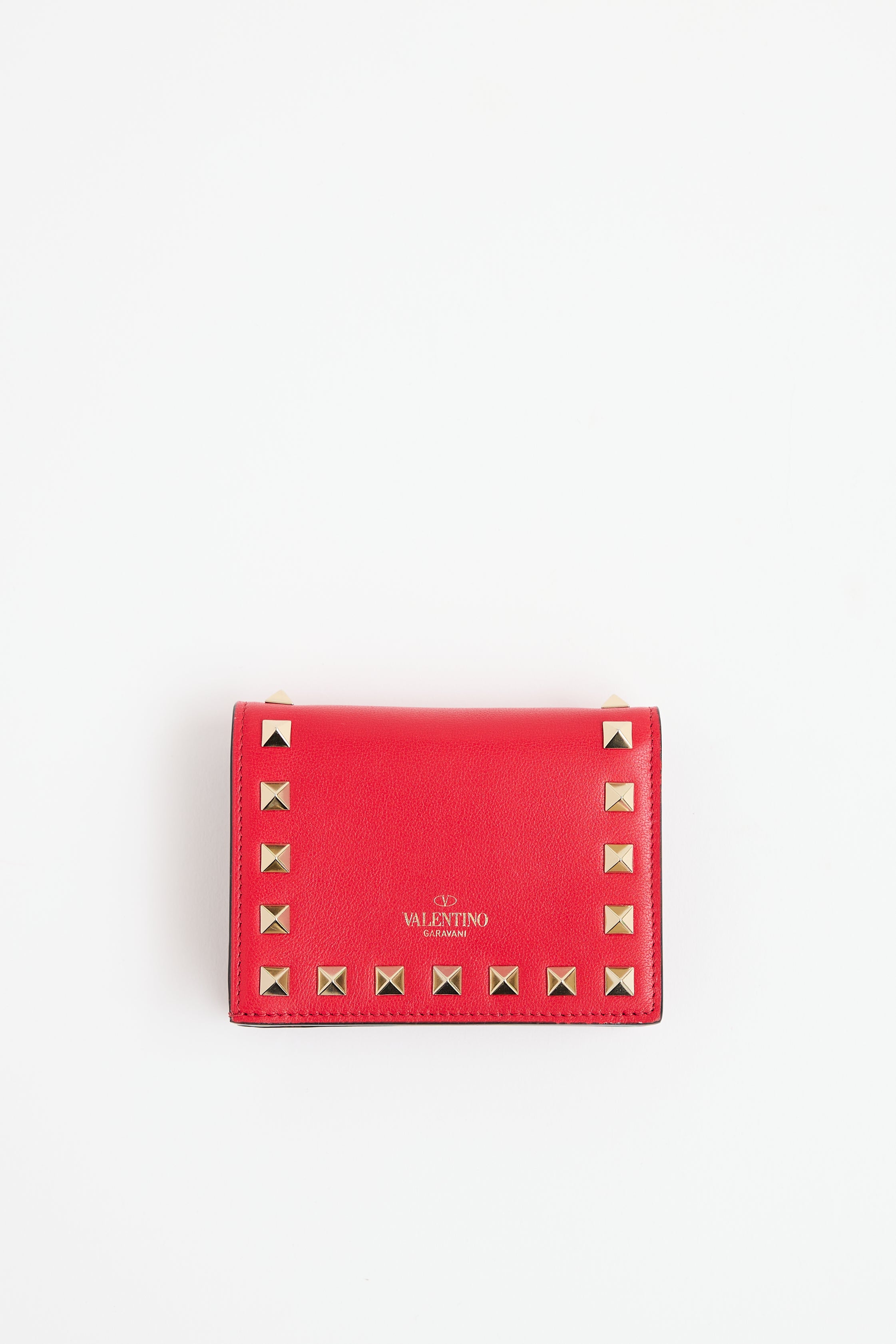 Pre-owned Valentino red leather wallet featuring a top flap, gold tone Rockstud hardware, five internal card slots with one slip pocket, internal zip pocket, slip pocket at side, and snap closure.