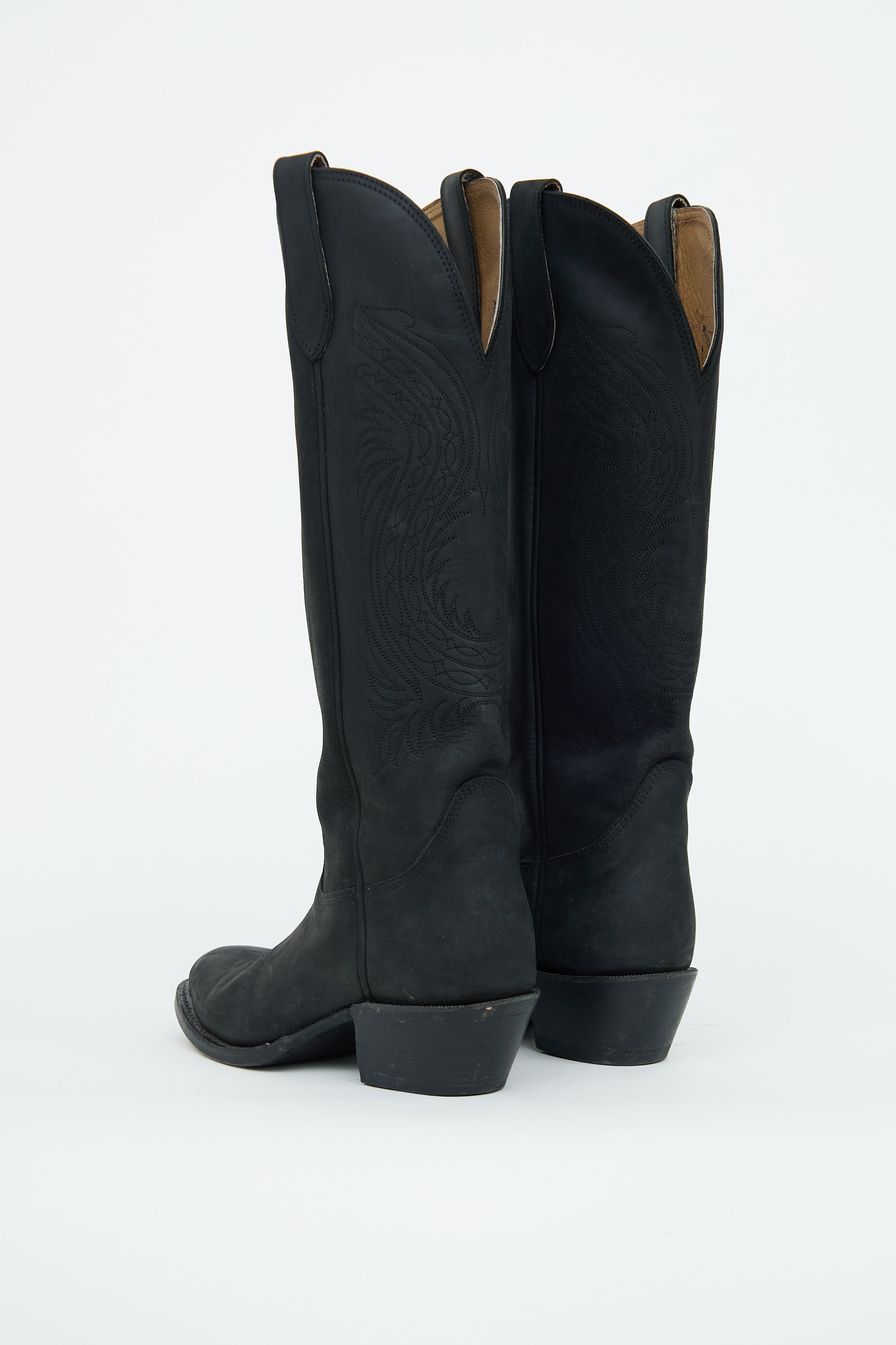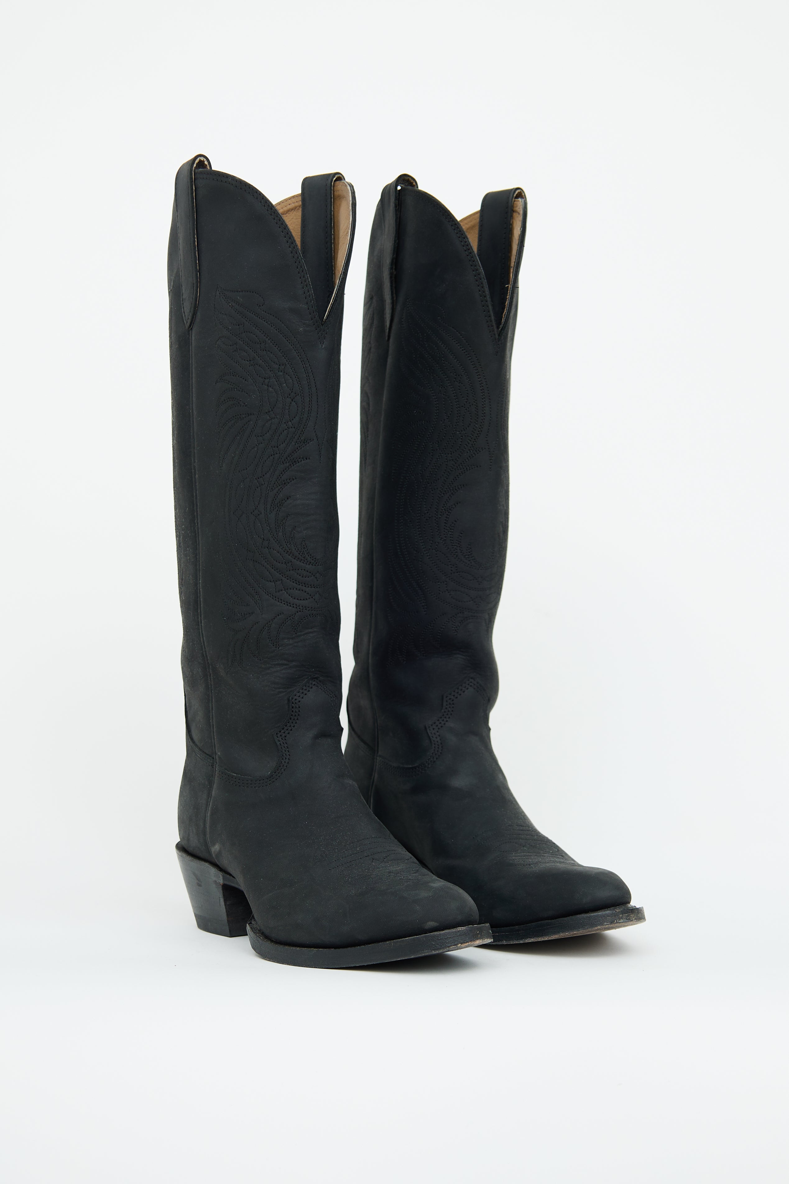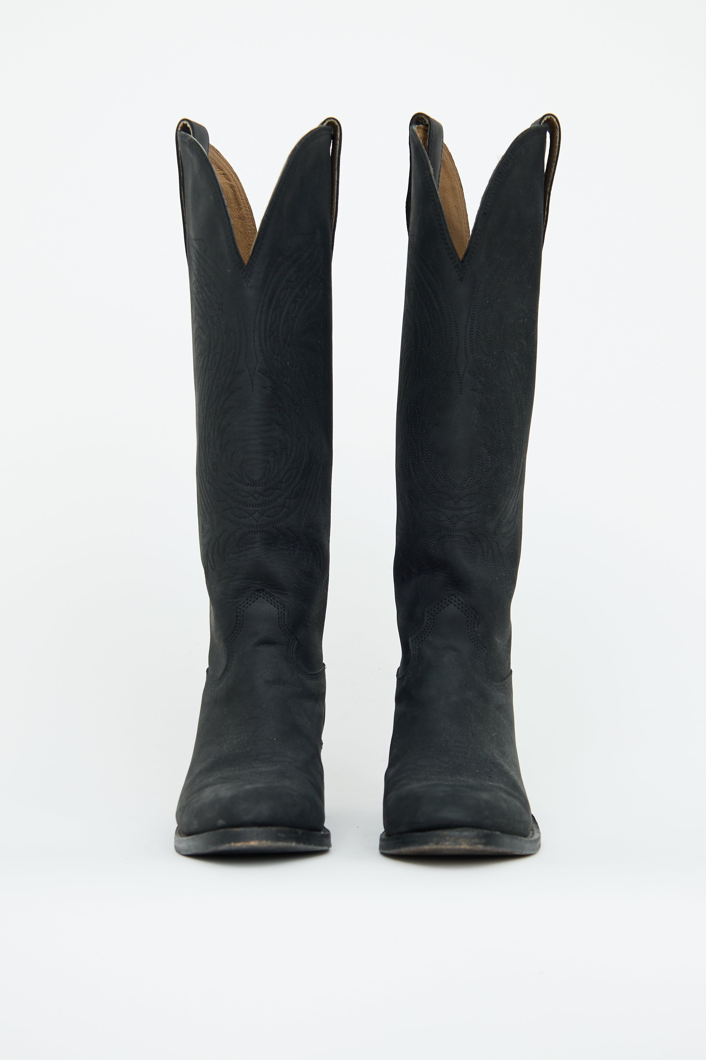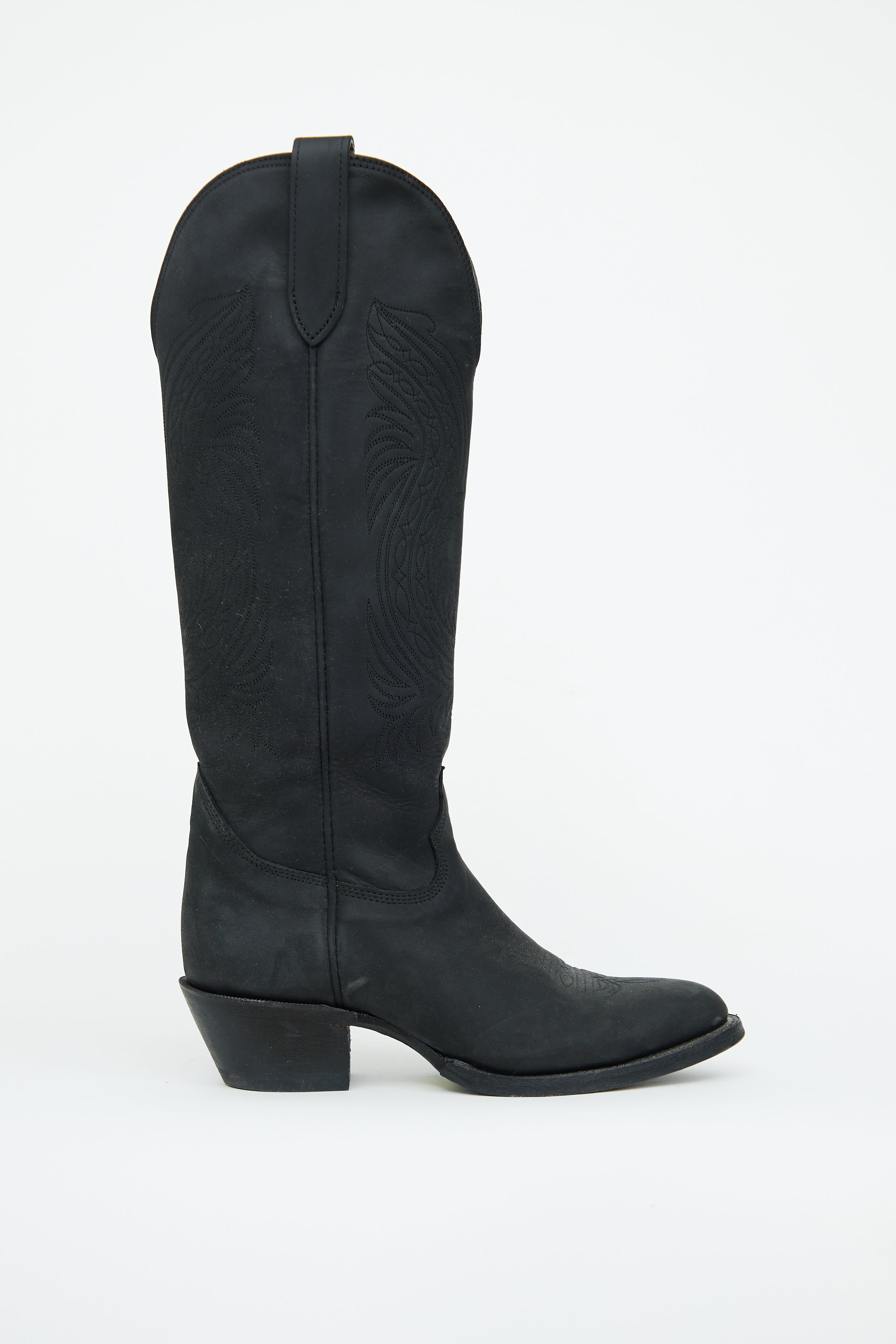 Pre-owned Alberta Boot suede western boots featuring almond toe, western styling, block heel and dual pull tabs on entry.