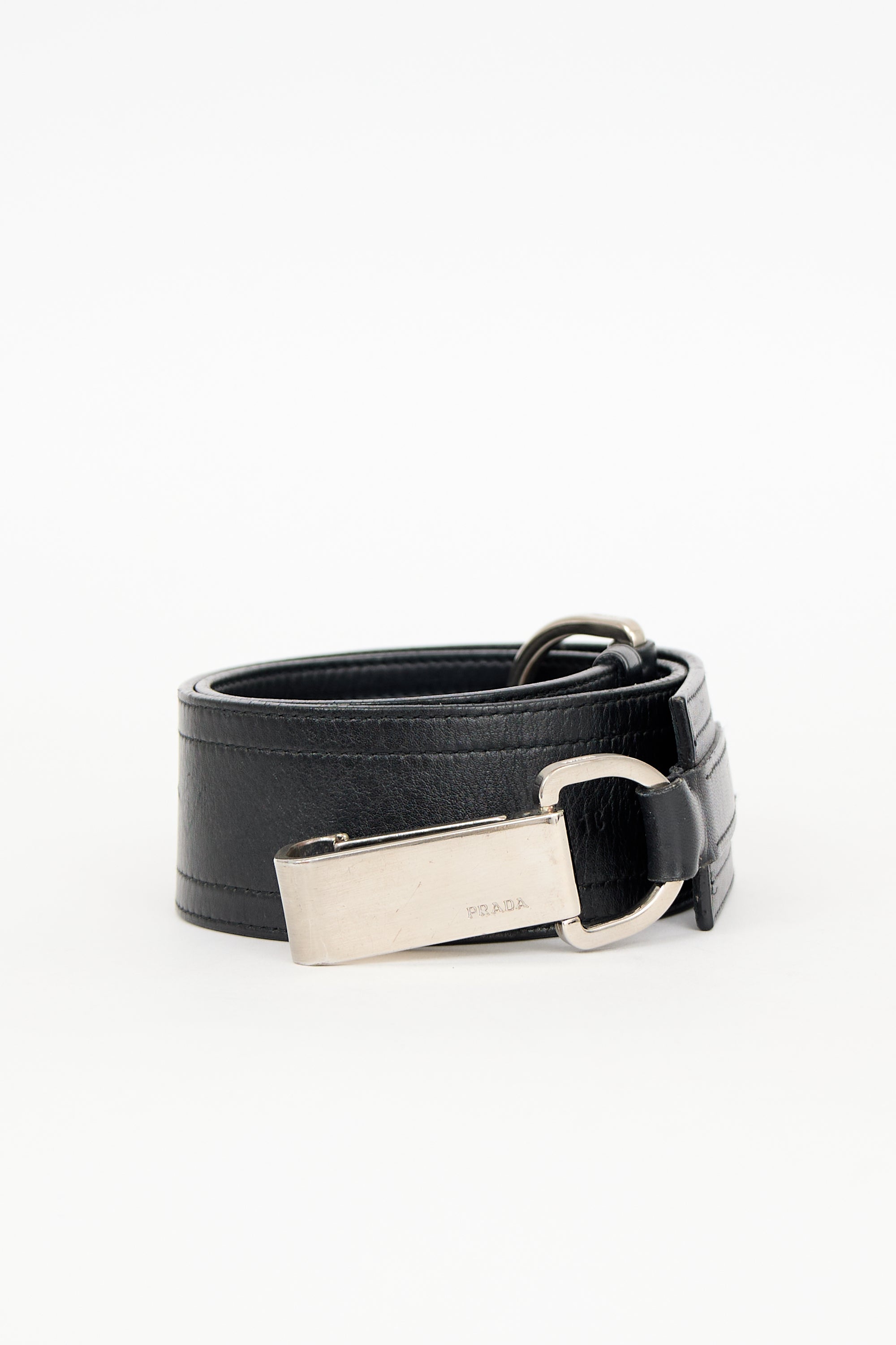 Pre-owned Prada black leather belt featuring silver tone hardware, large D-ring with push clash front closure, and debossed logos at hardware.