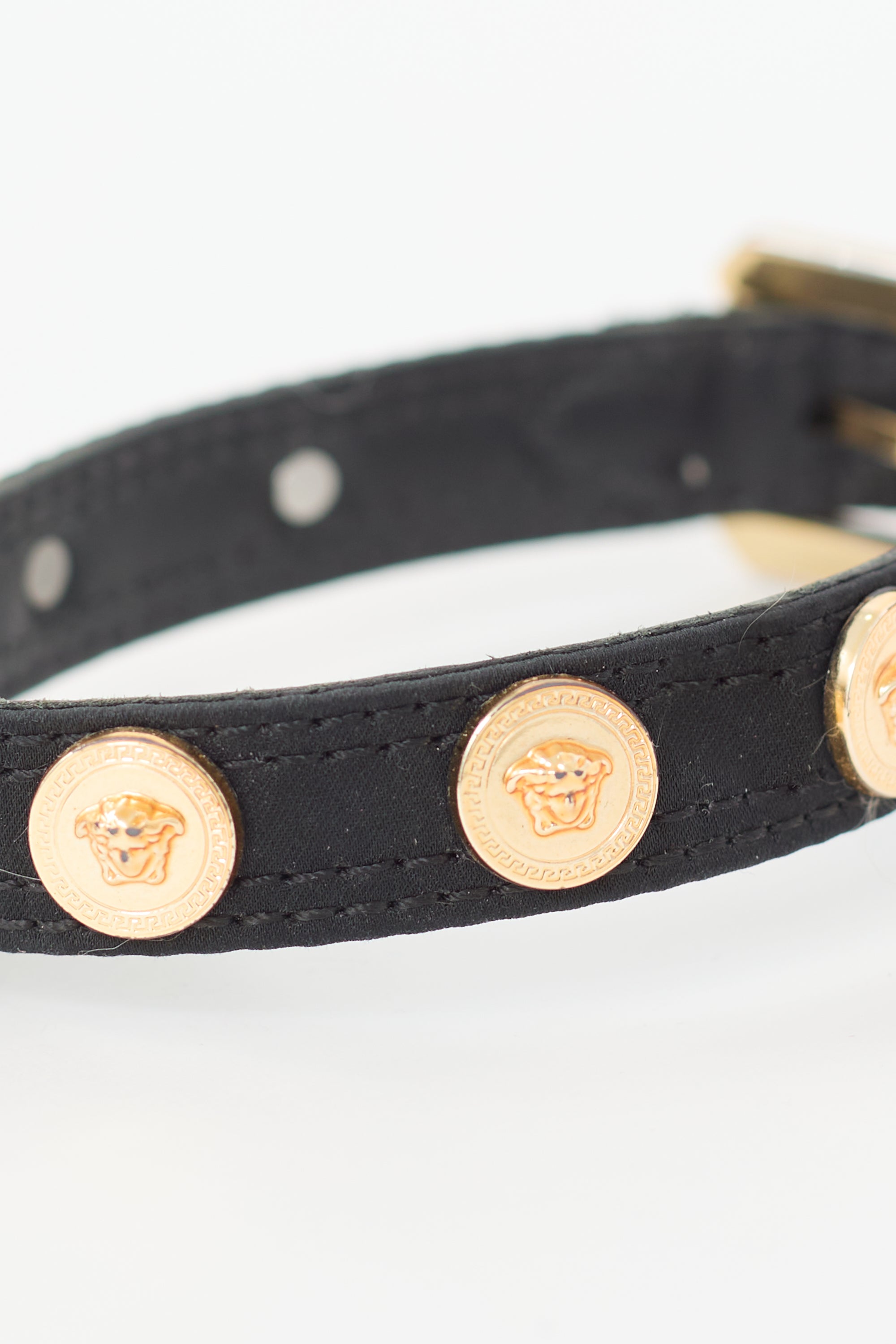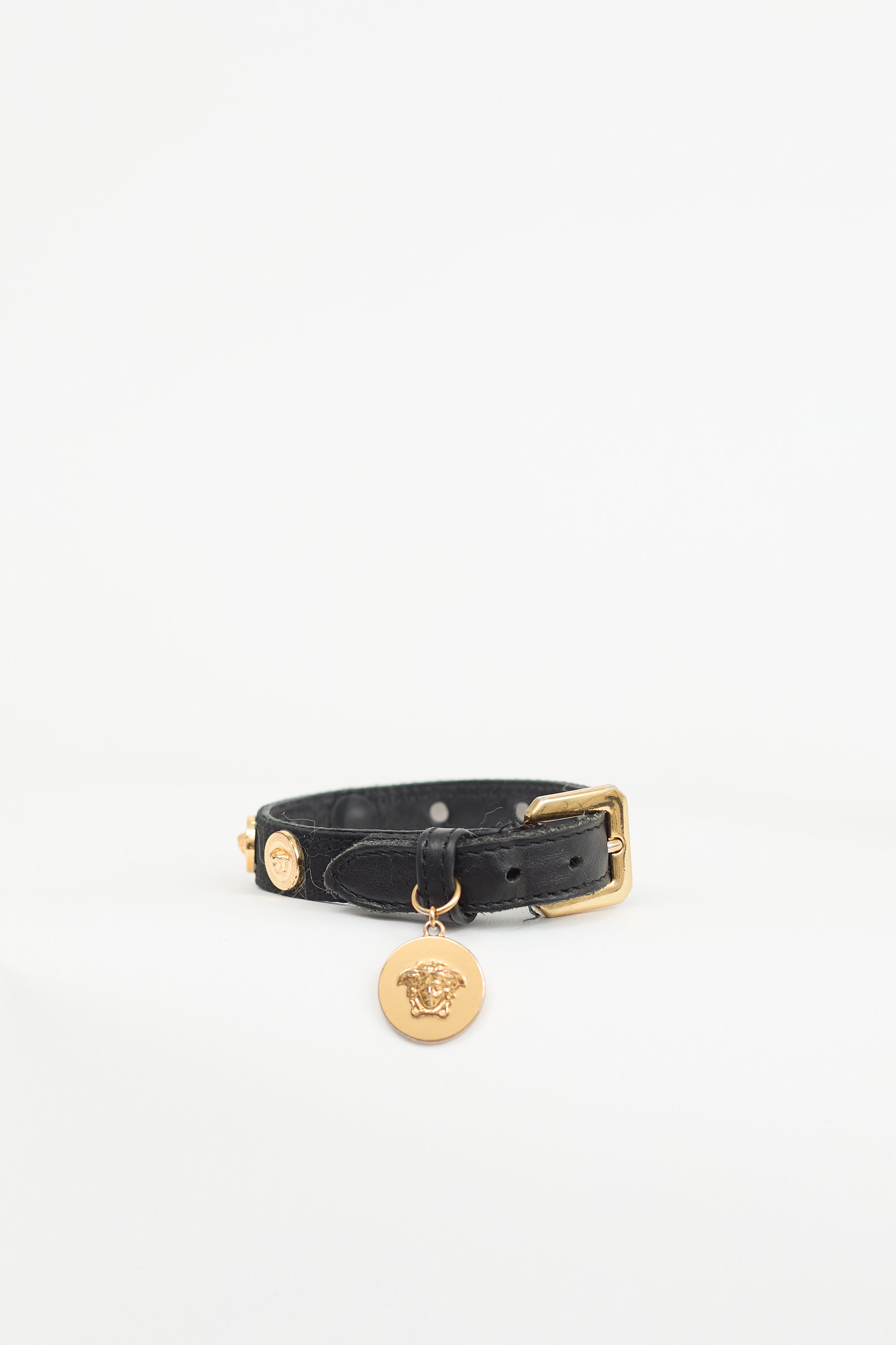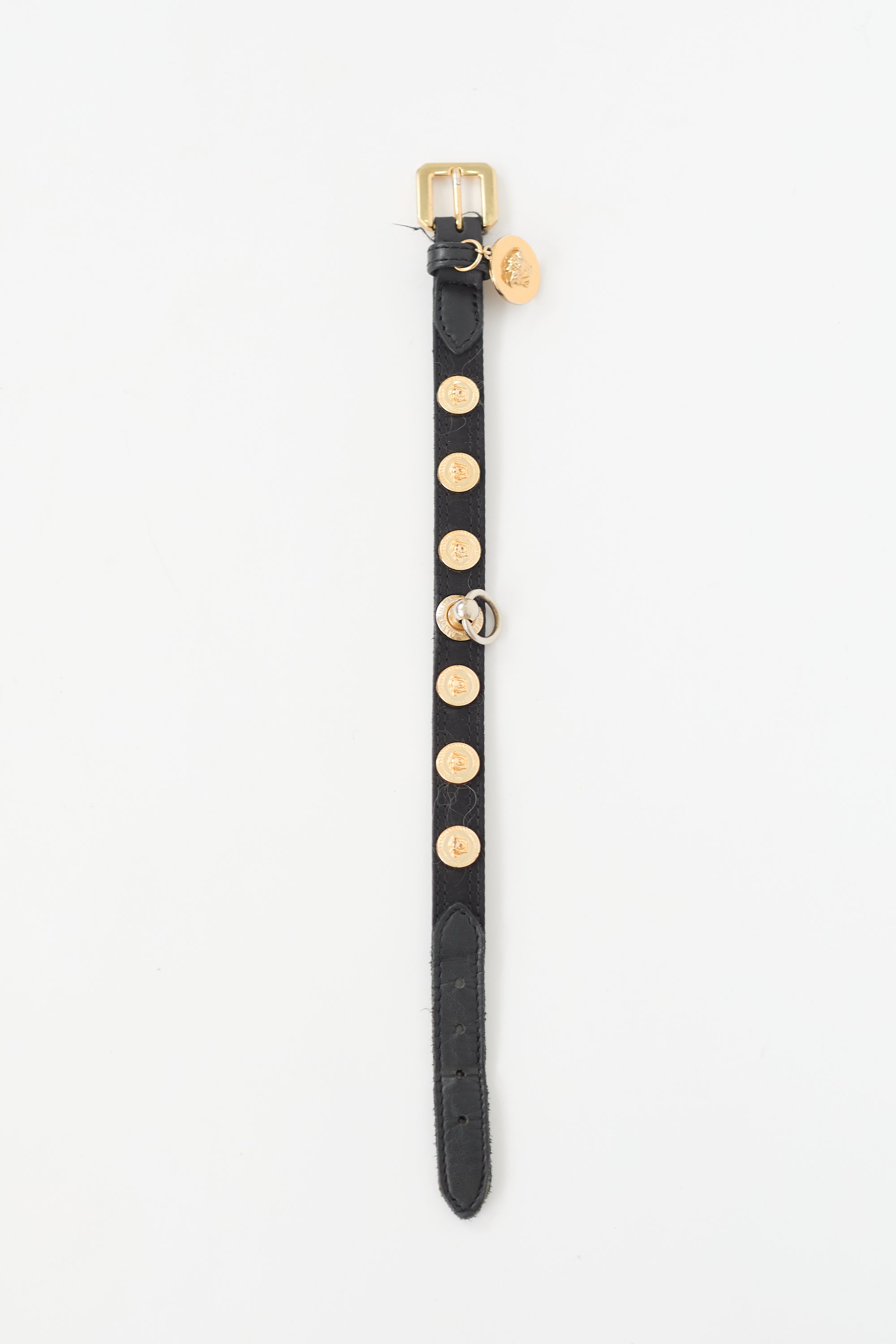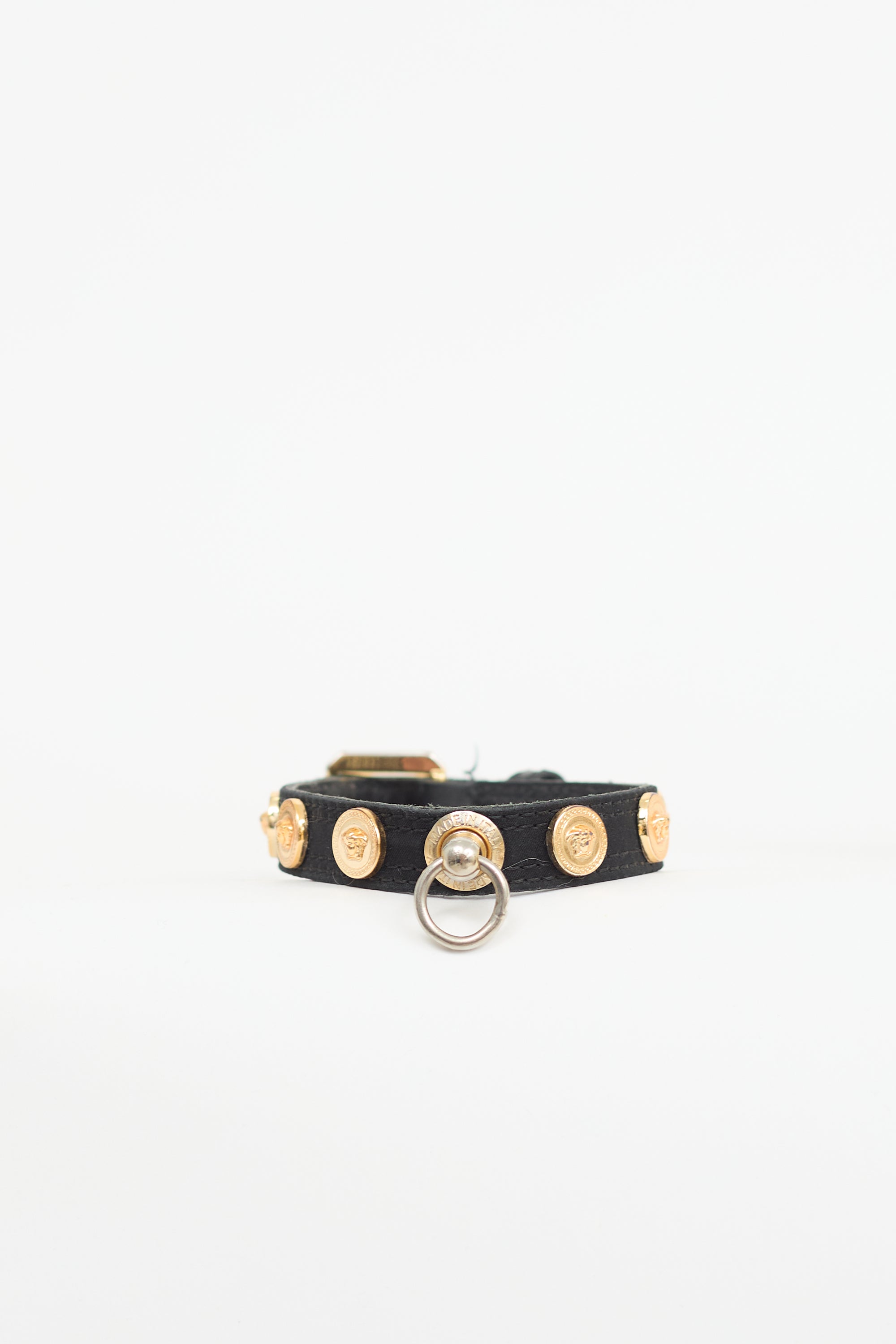 Pre-owned Versace black leather pet collar featuring gold tone hardware Medusa charm, silver tone ring at centre, and adjustable buckle.