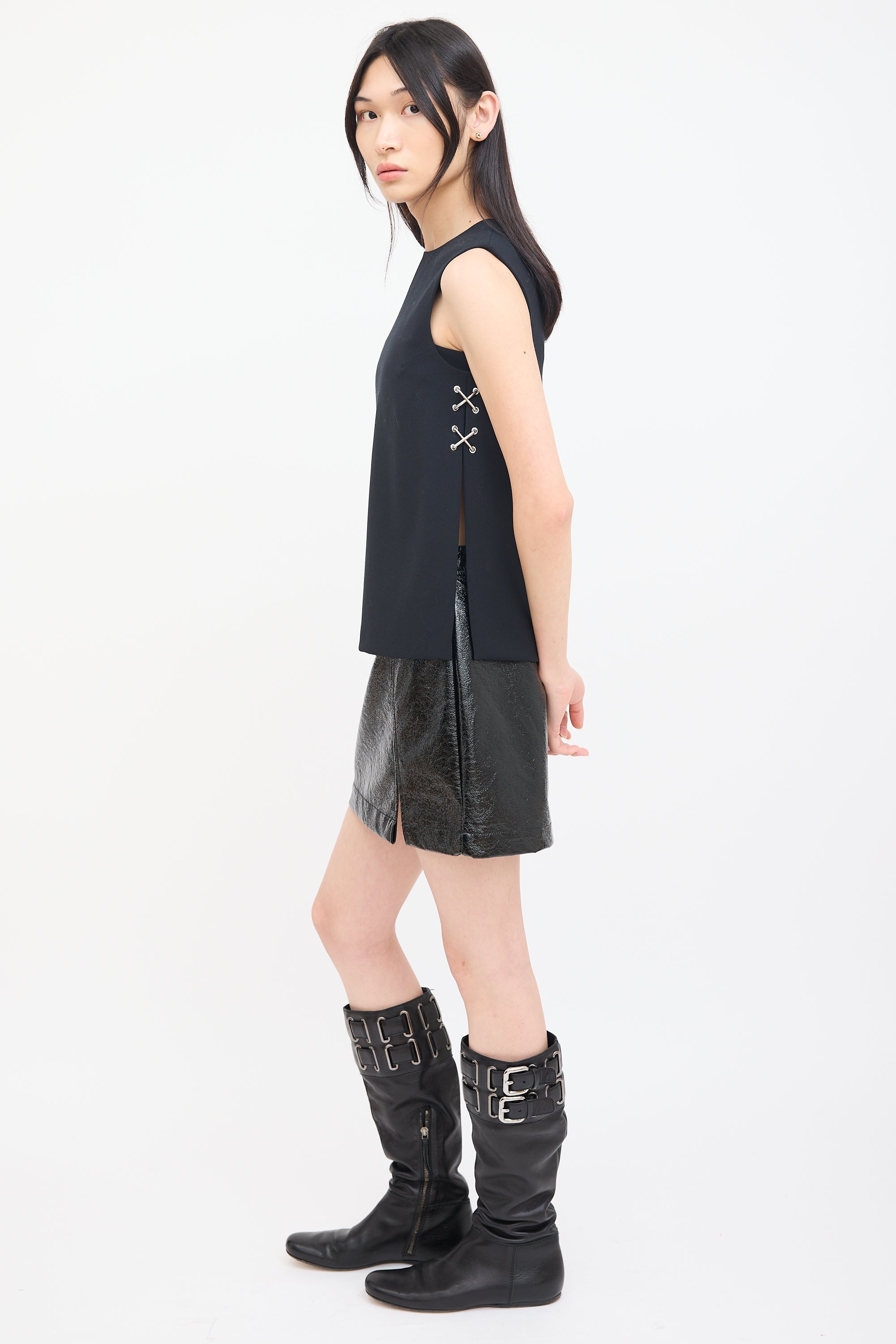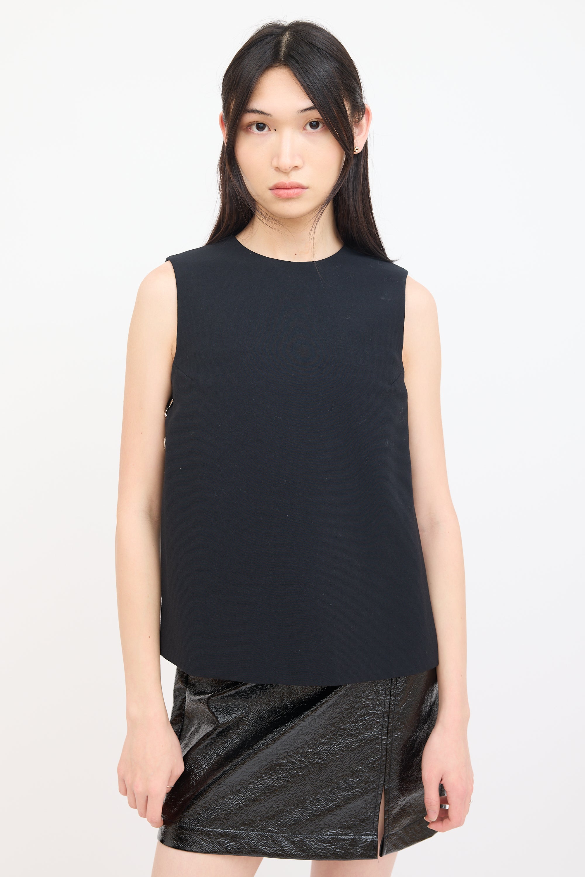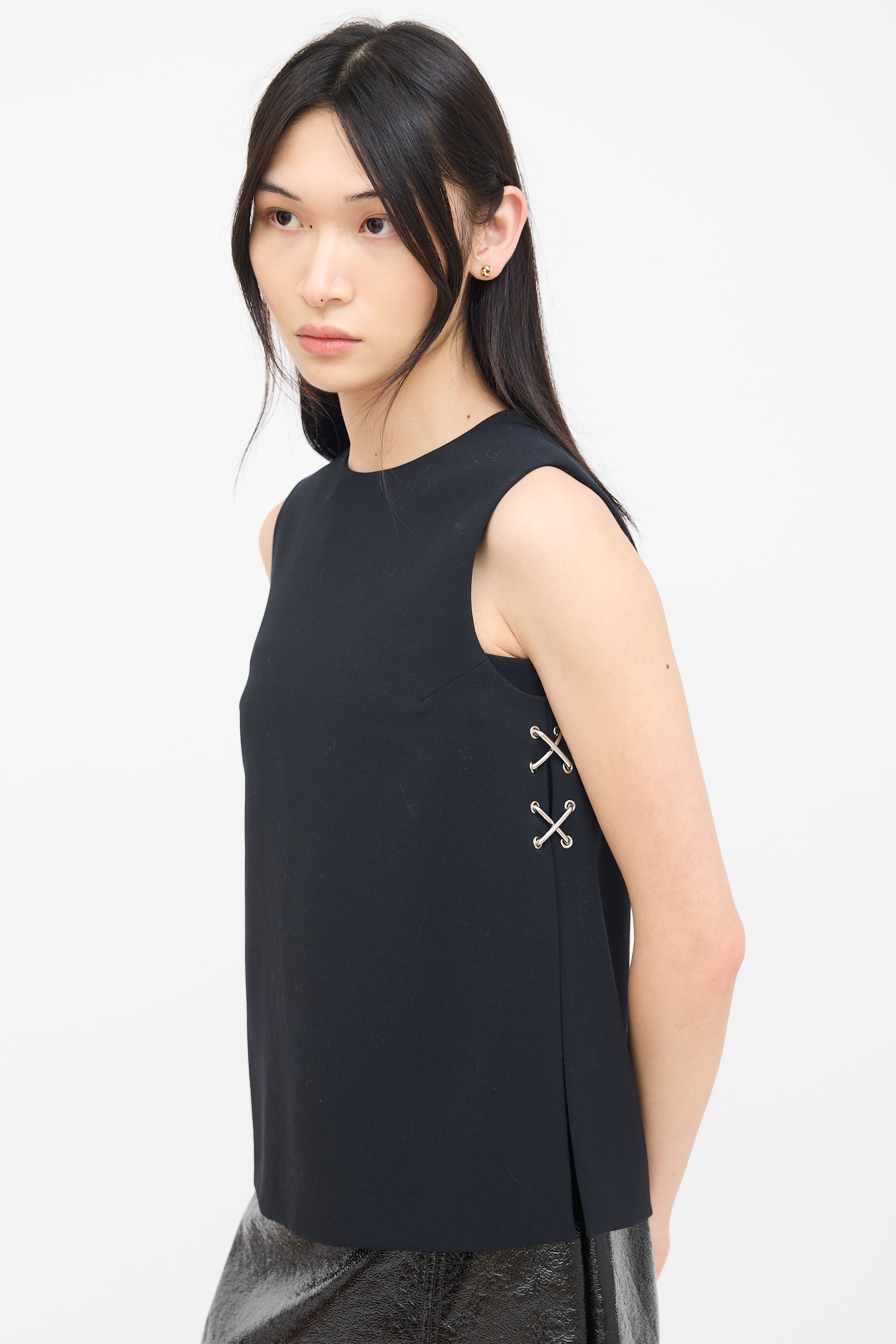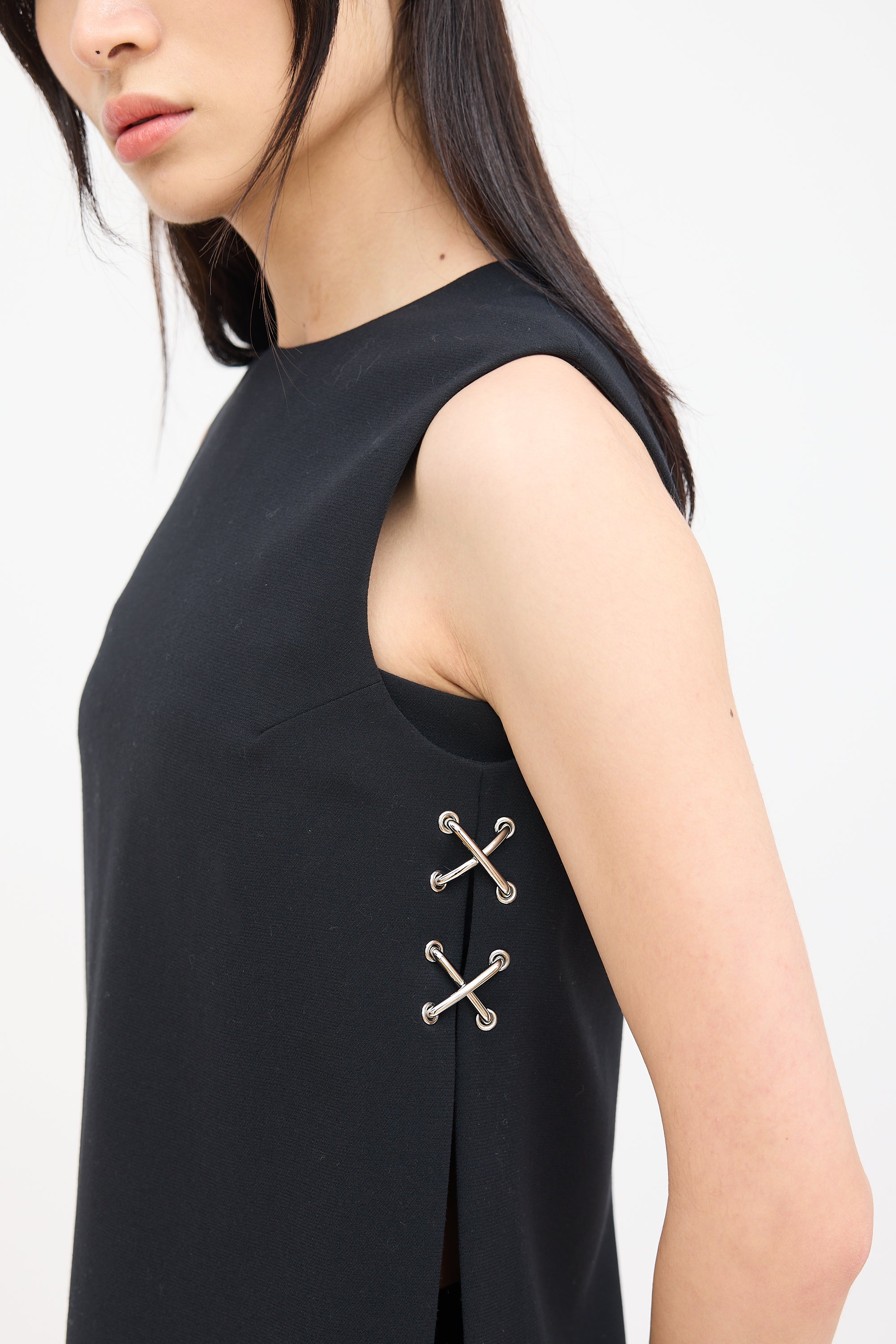Pre-owned Alexander Wang black sleeveless top featuring round neckline, side slits, silver tone criss cross grommet hardware at sides, and concealed back zip closure. Lined