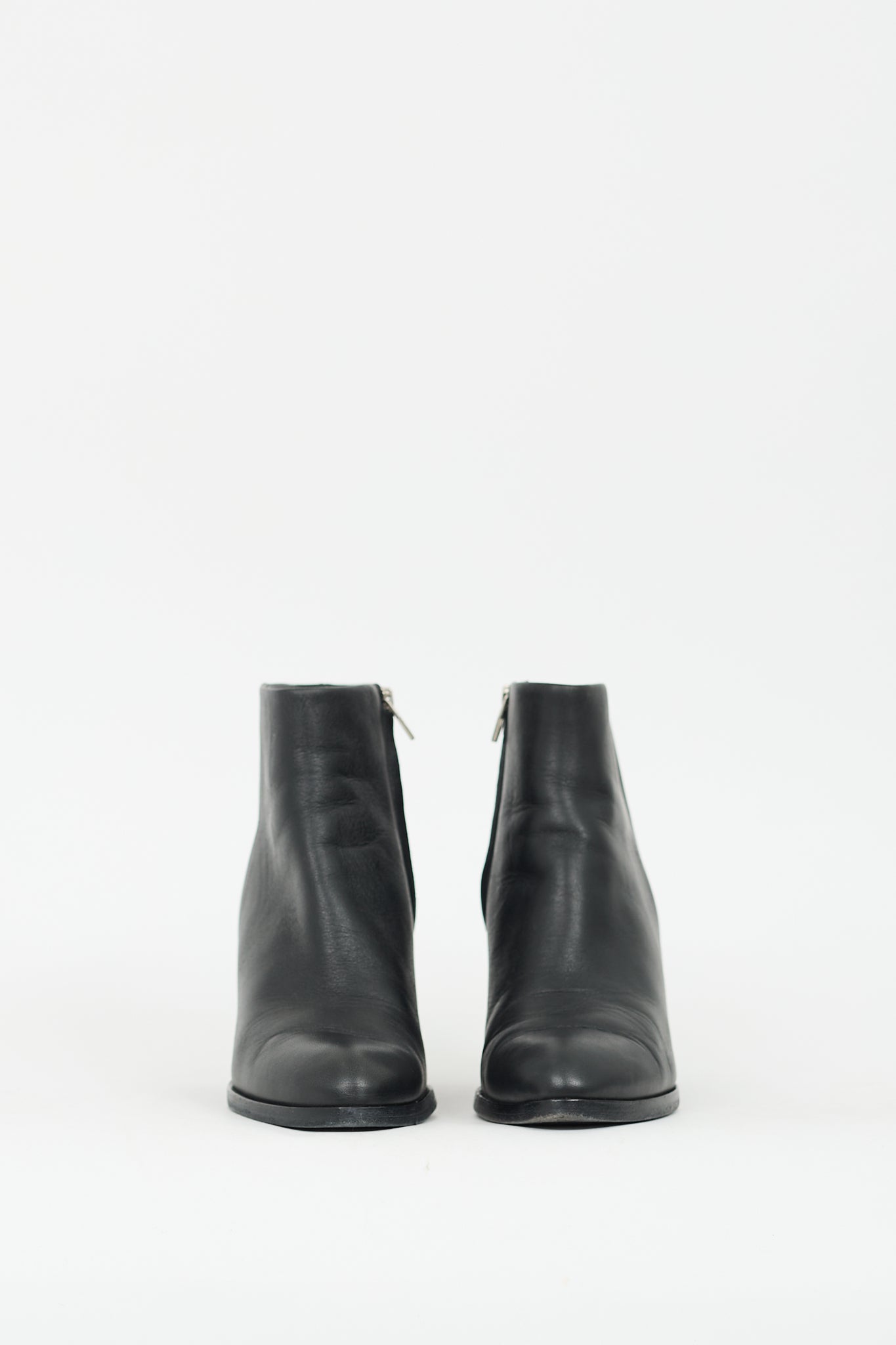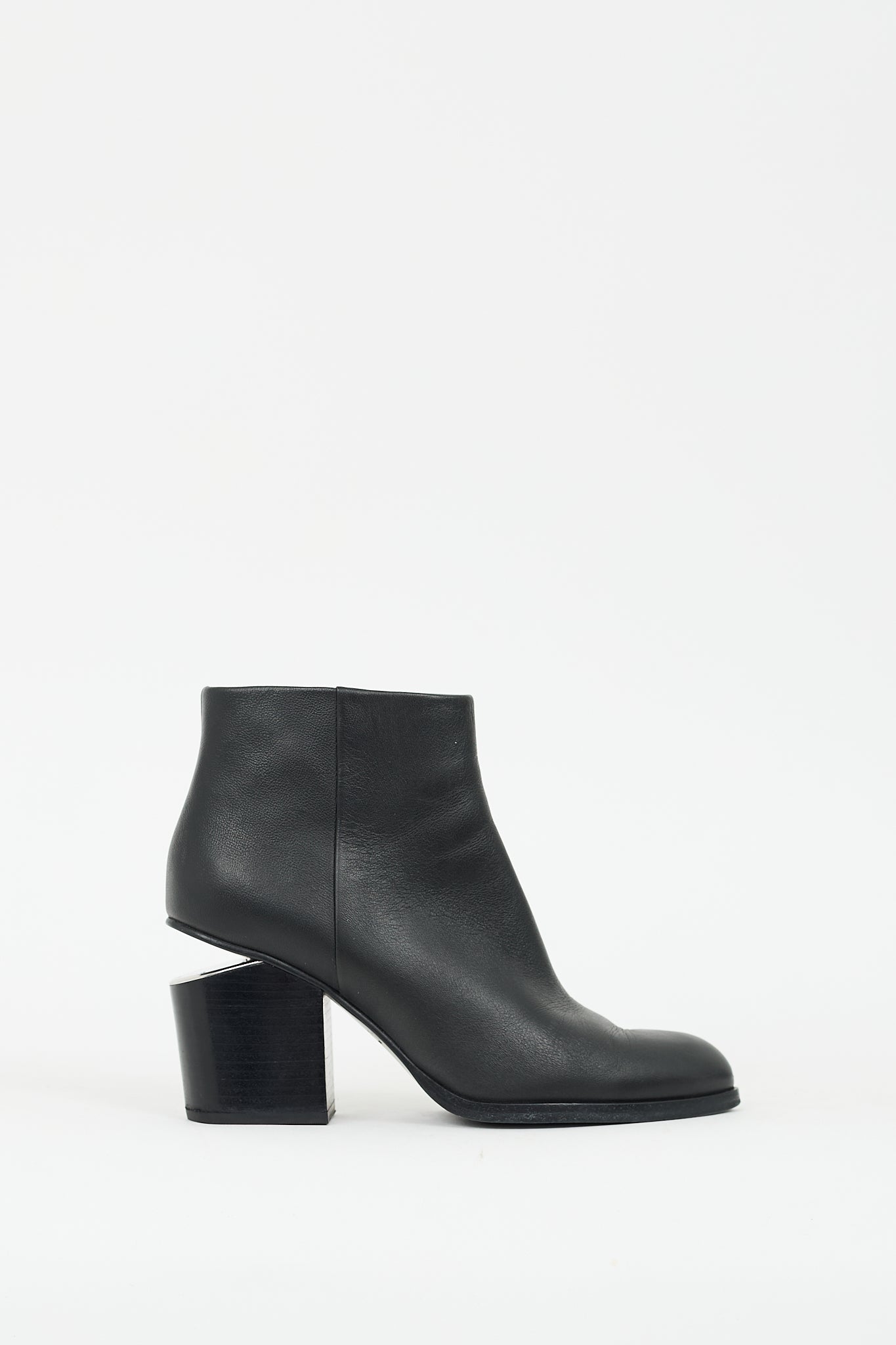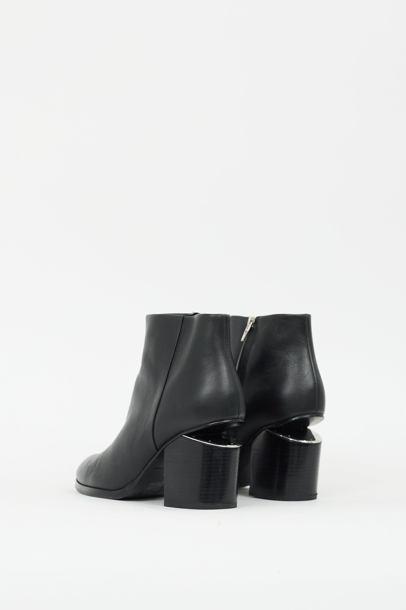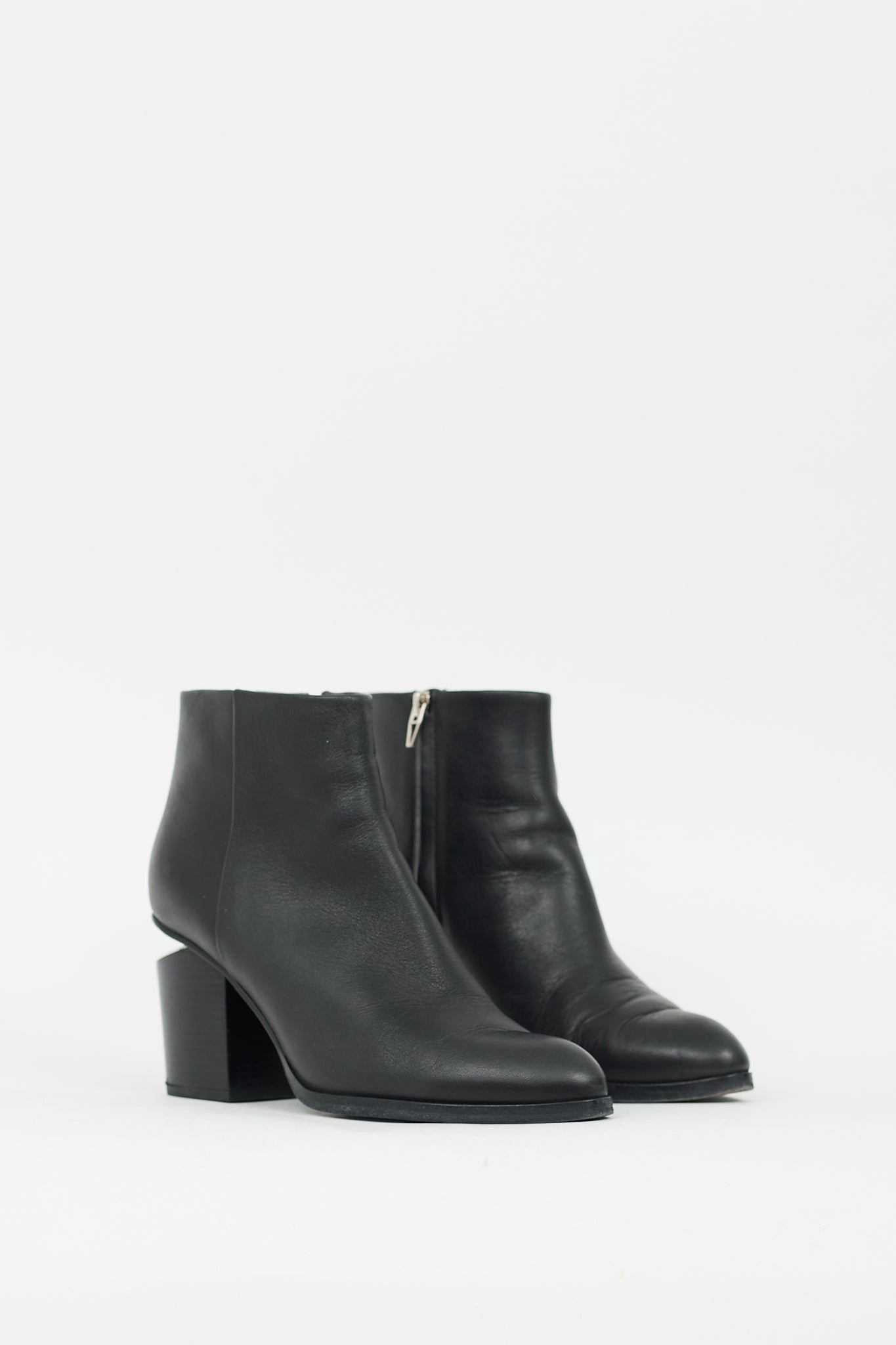 Pre-owned Alexander Wang black leather Gabi boots featuring almond toe, silver tone hardware, cut out detail at heel, inner side zip closure, stacked block heel. Comes with original box.