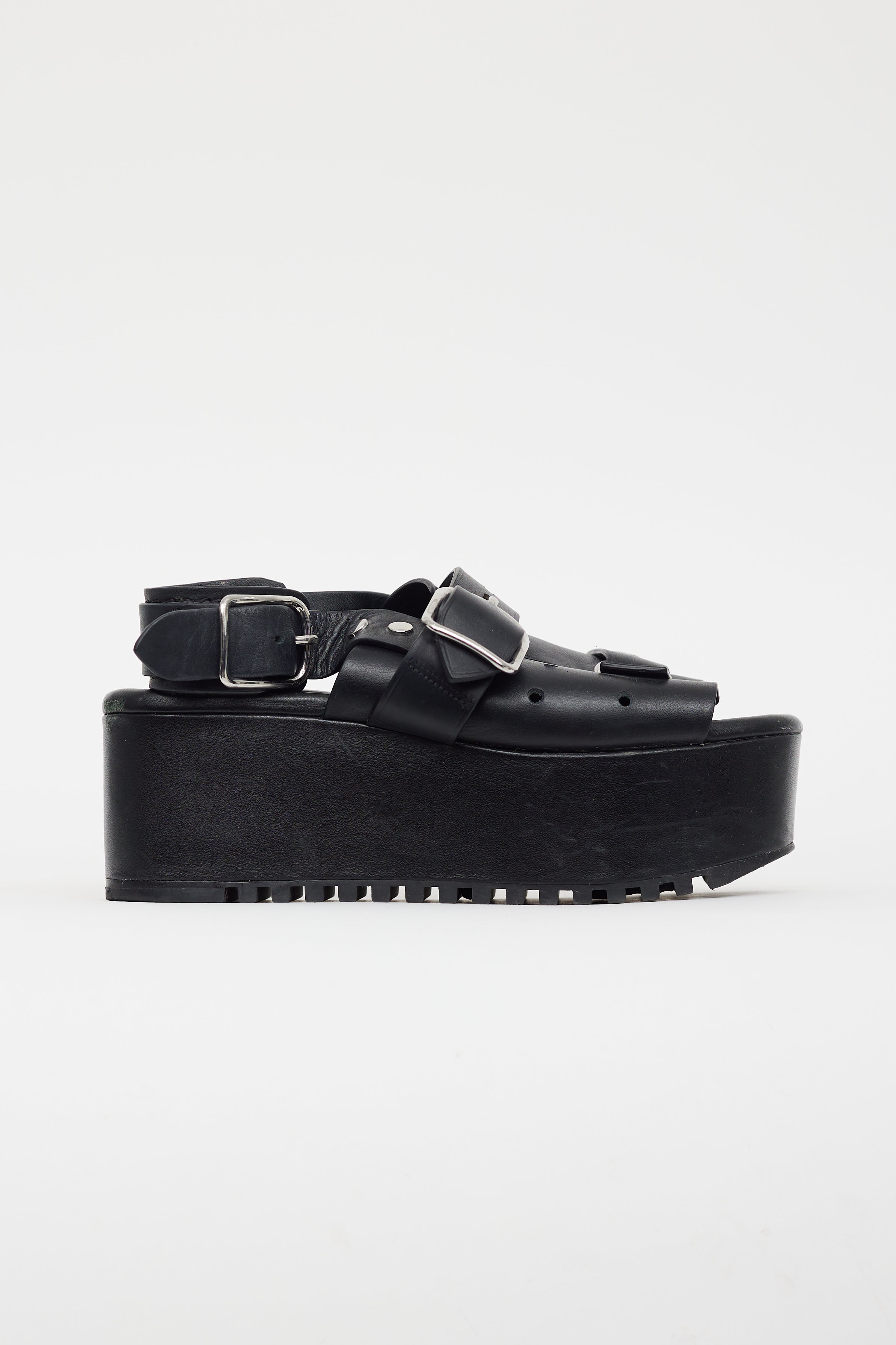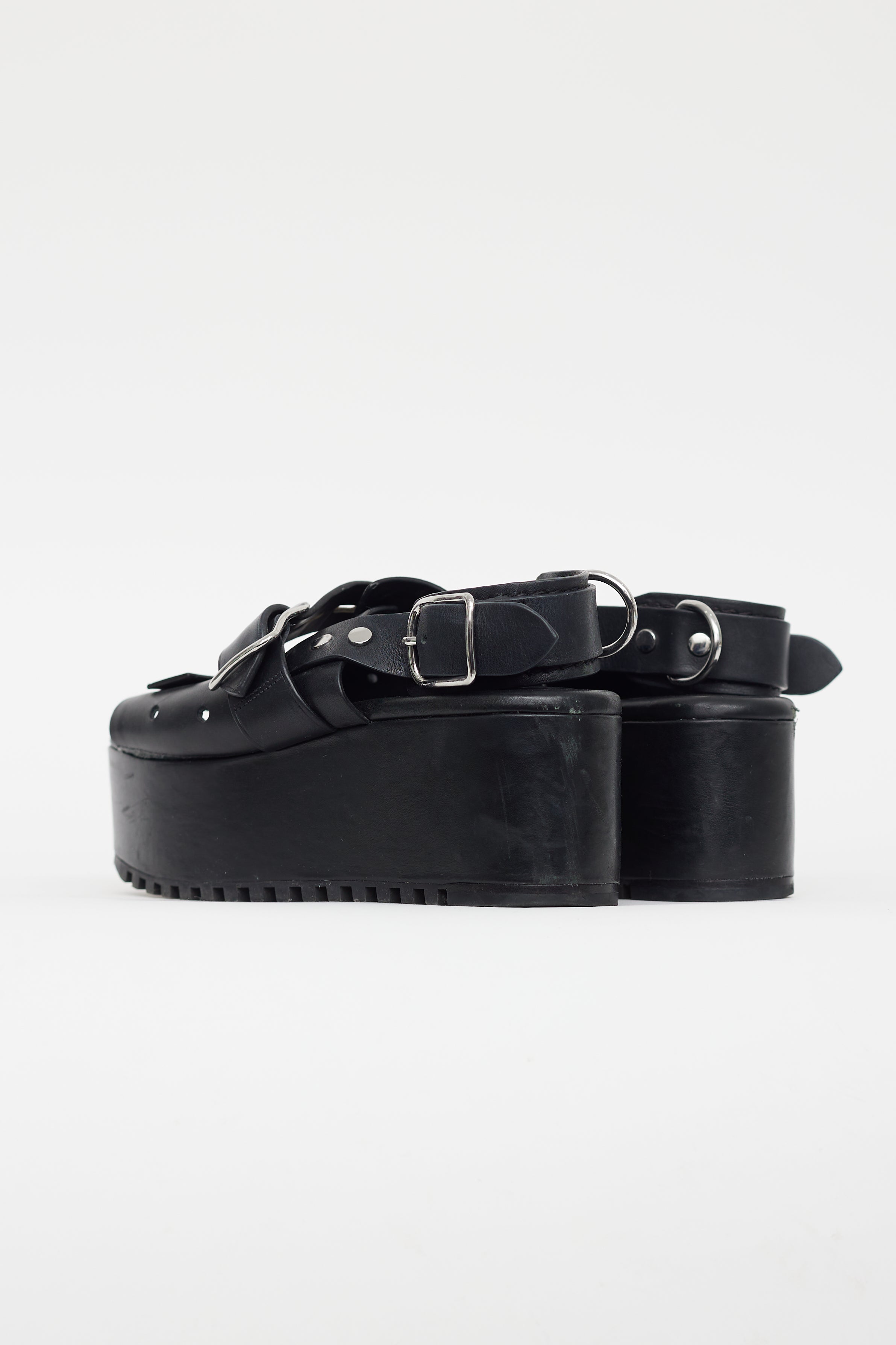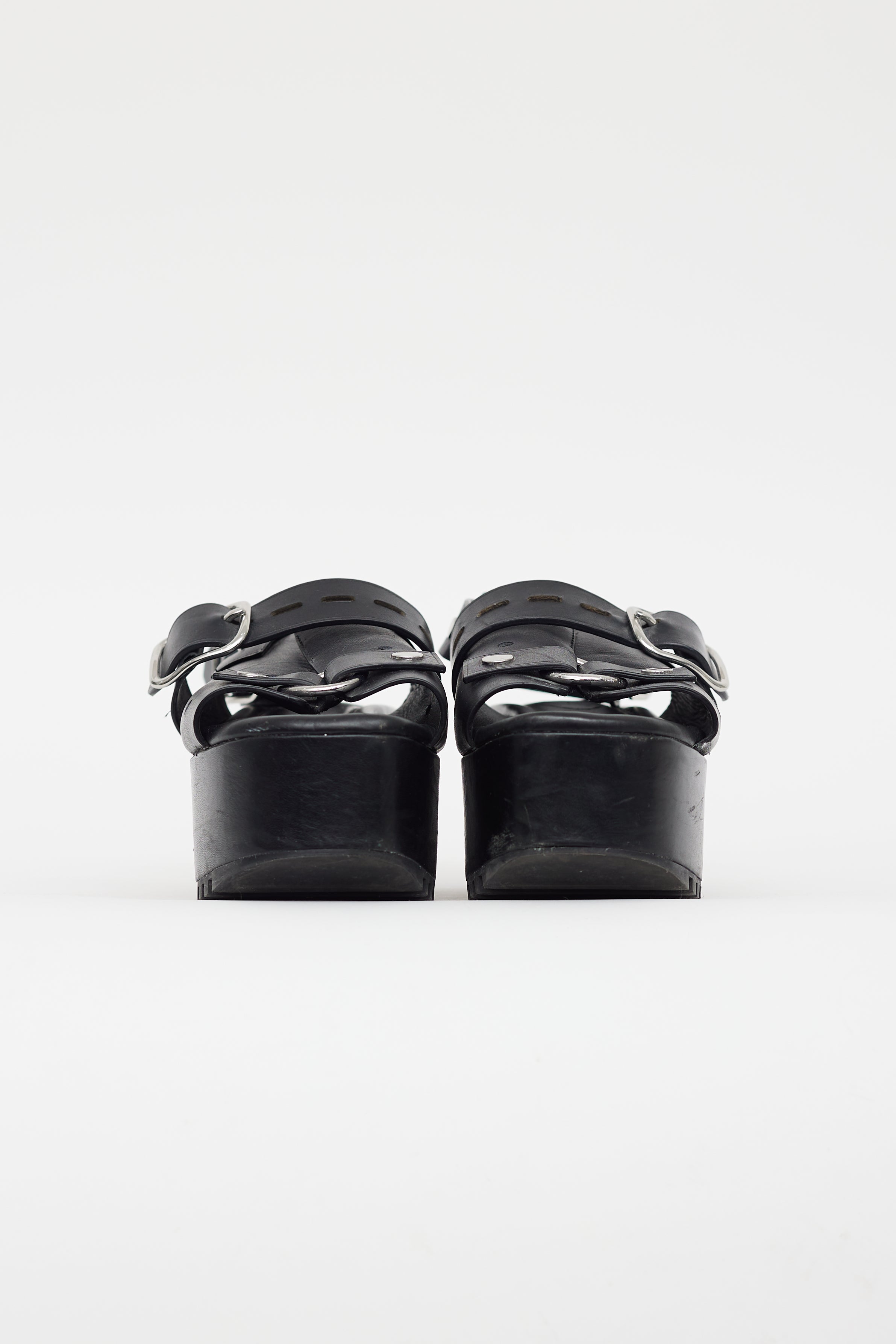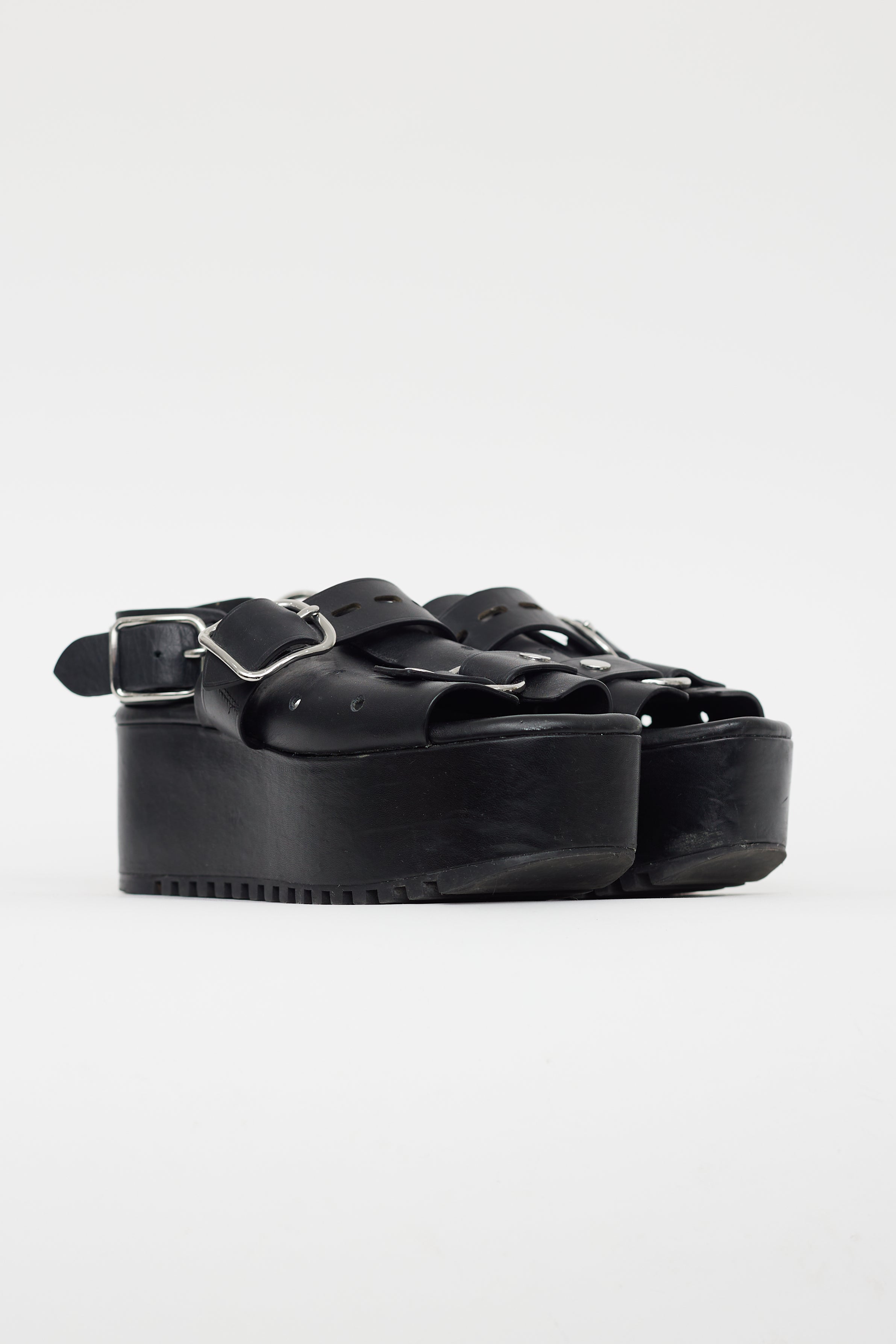 Pre-owned Alexander Wang black leather high platform sandals featuring silver tone hardware, buckle and pins at upper, adjustable buckle ankle strap, open round toe, and leather insoles.