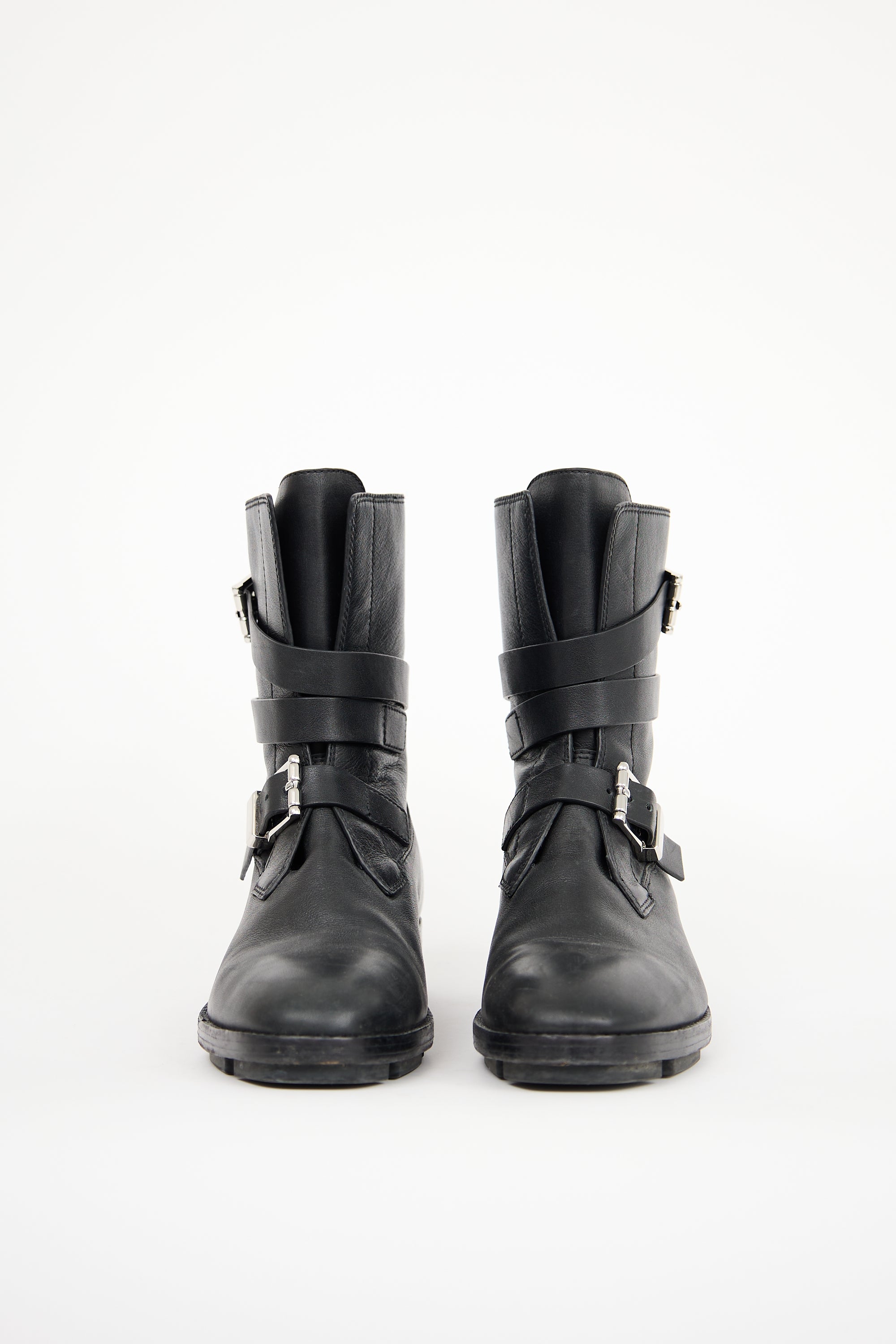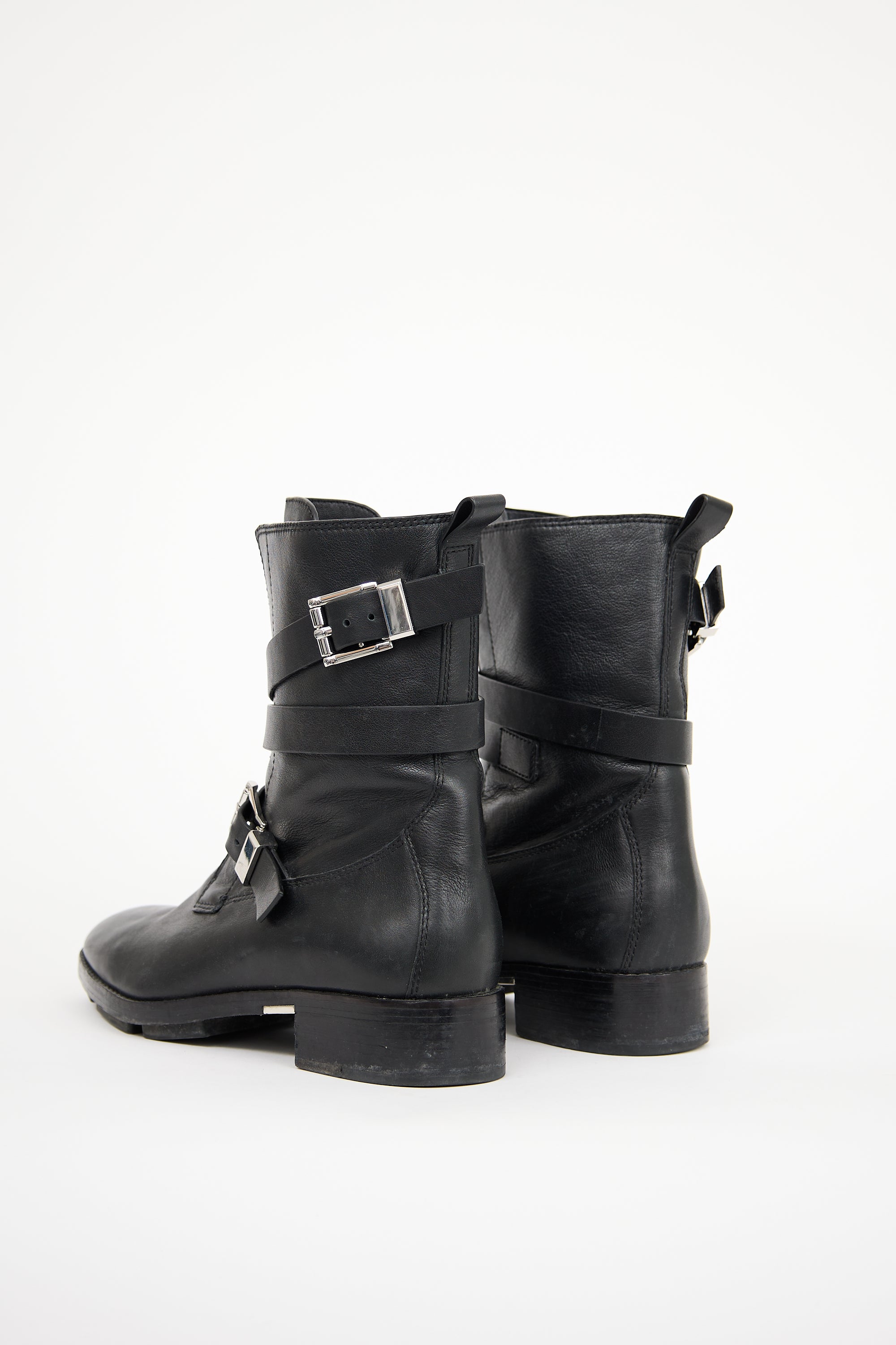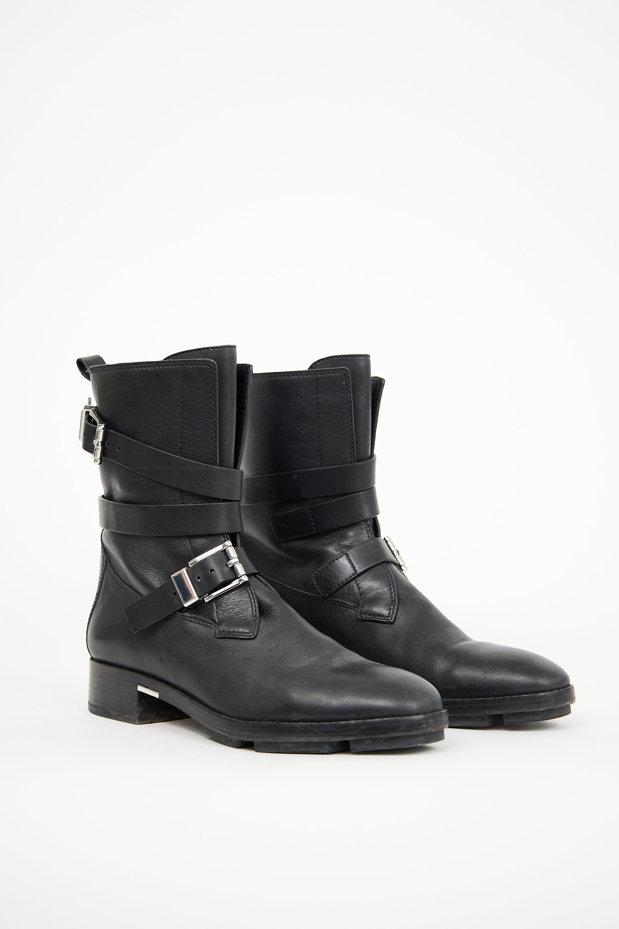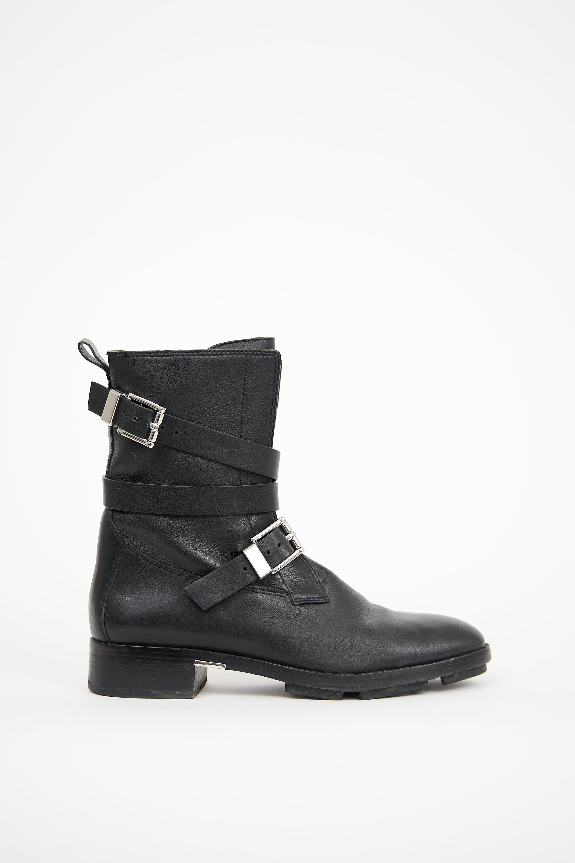 Pre-owned Alexander Wang black leather Louise combat boots featuring a rounded toe, adjustable straps with silver toned buckles throughout upper, and silver tone embossed logo plate at heel pitch.