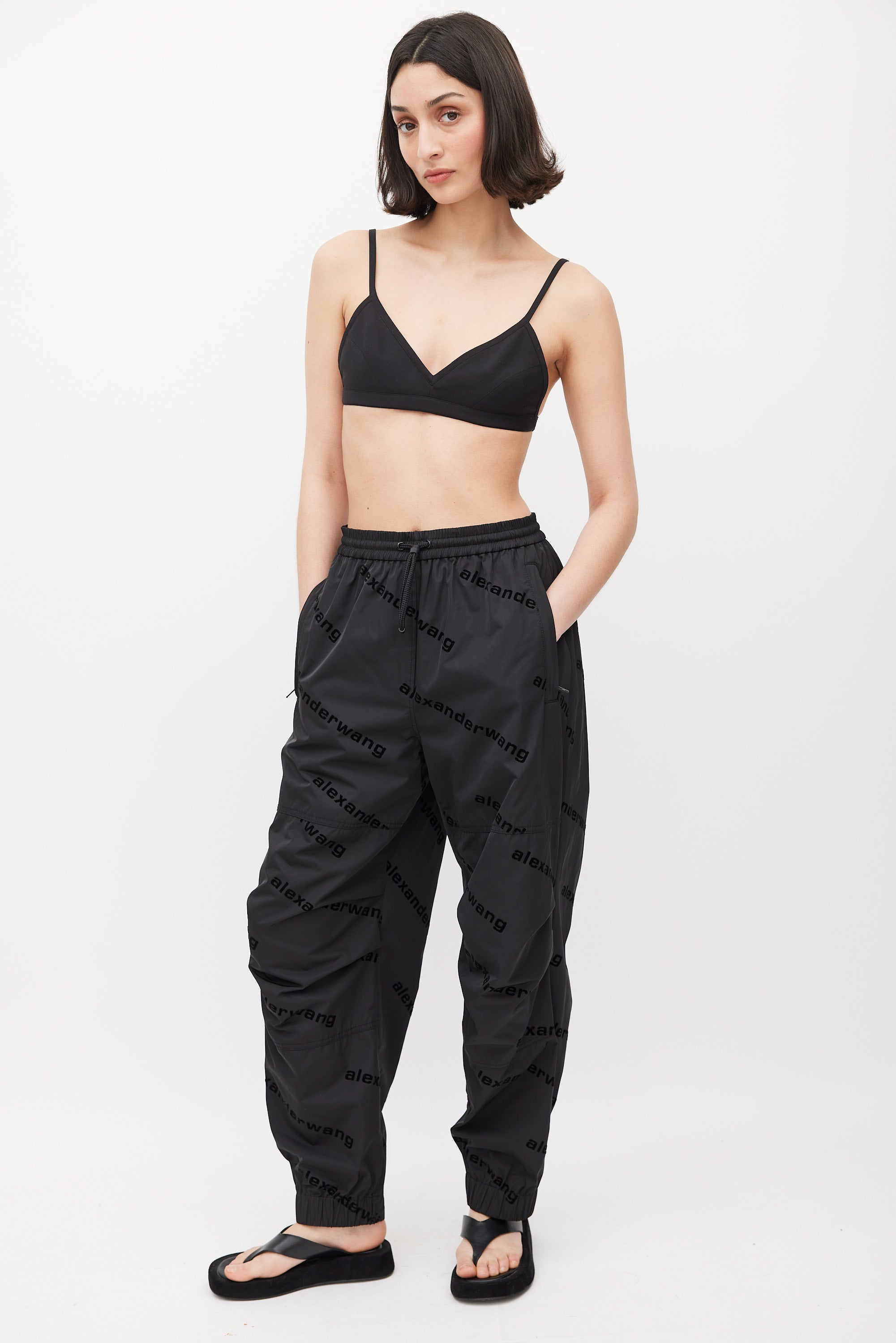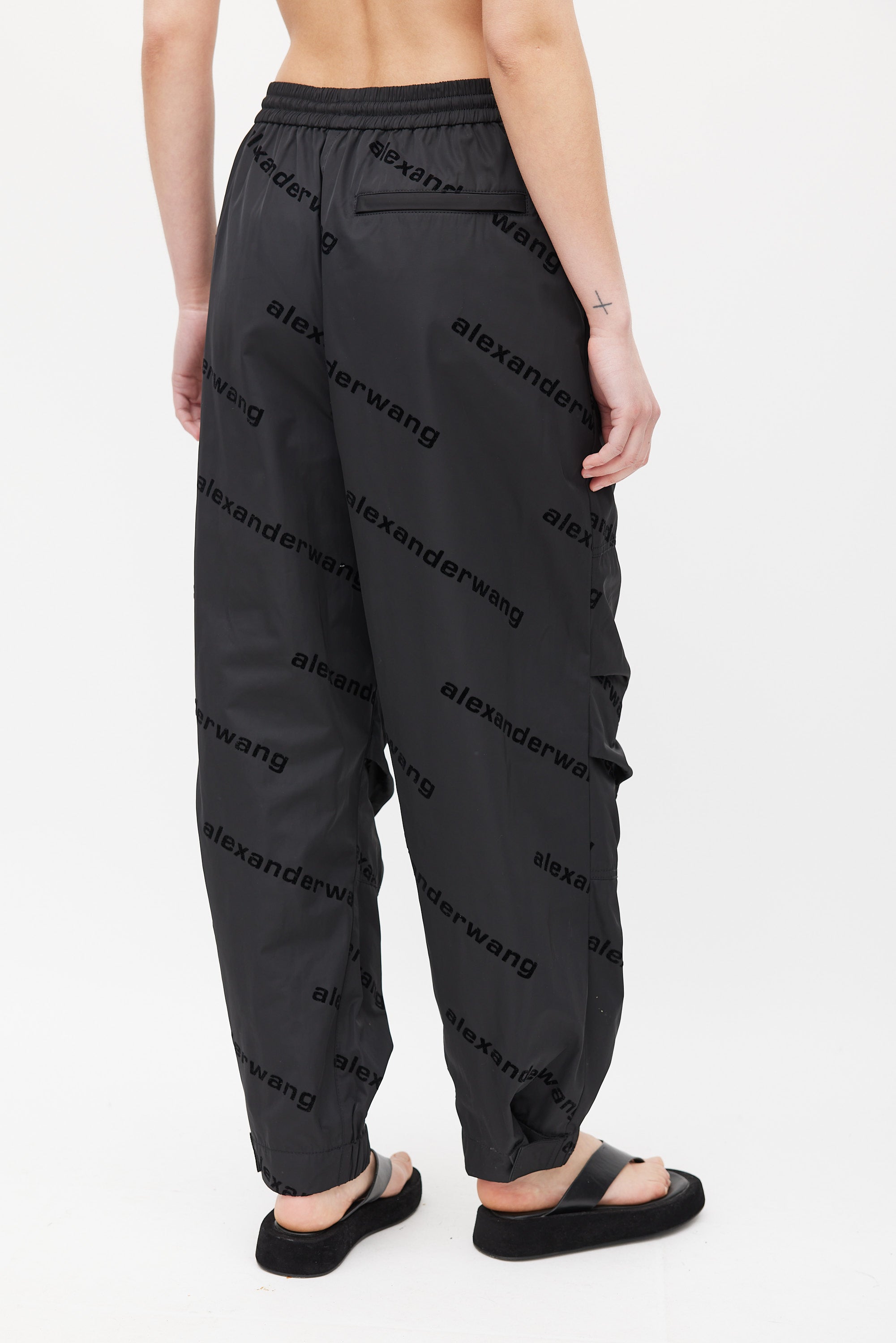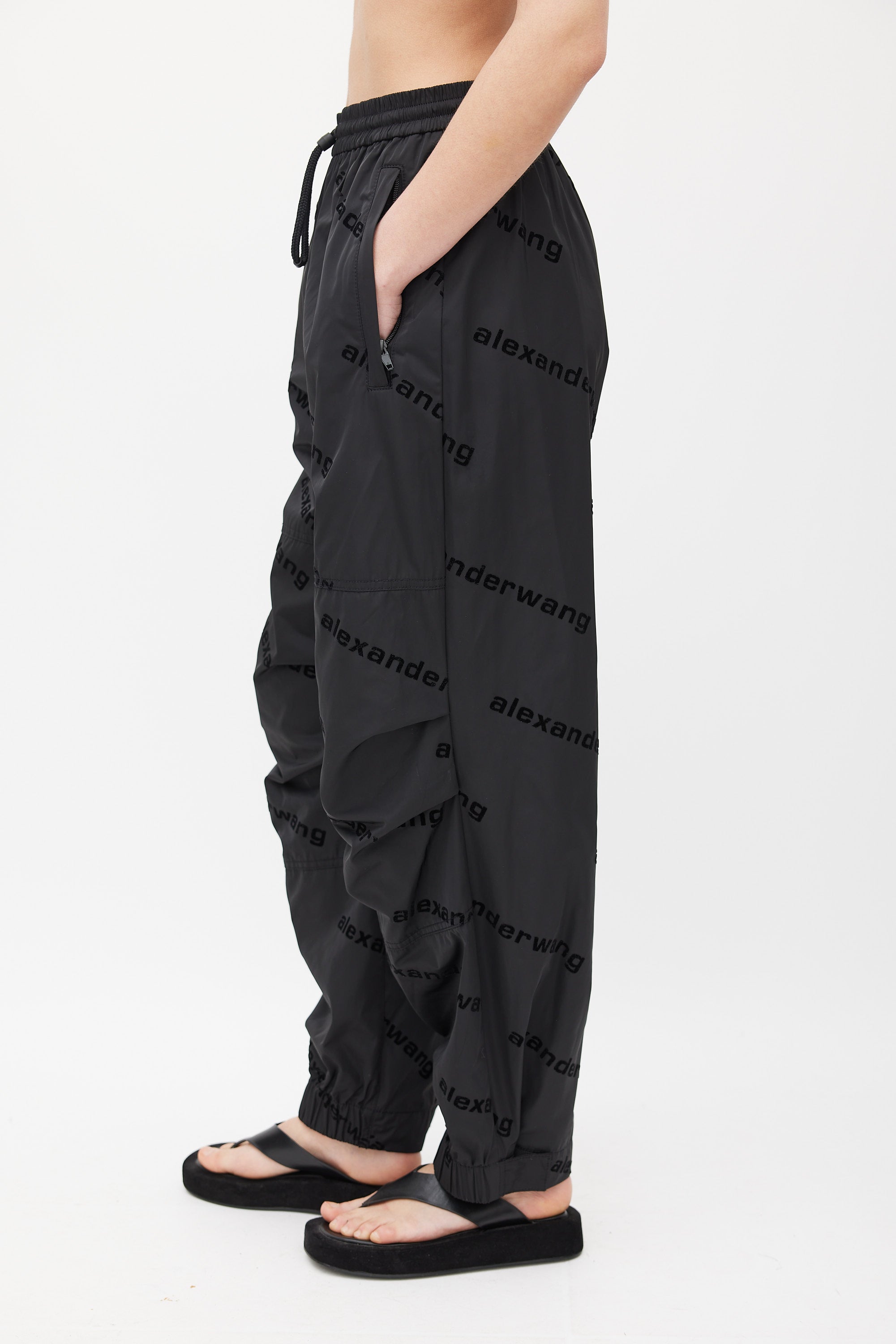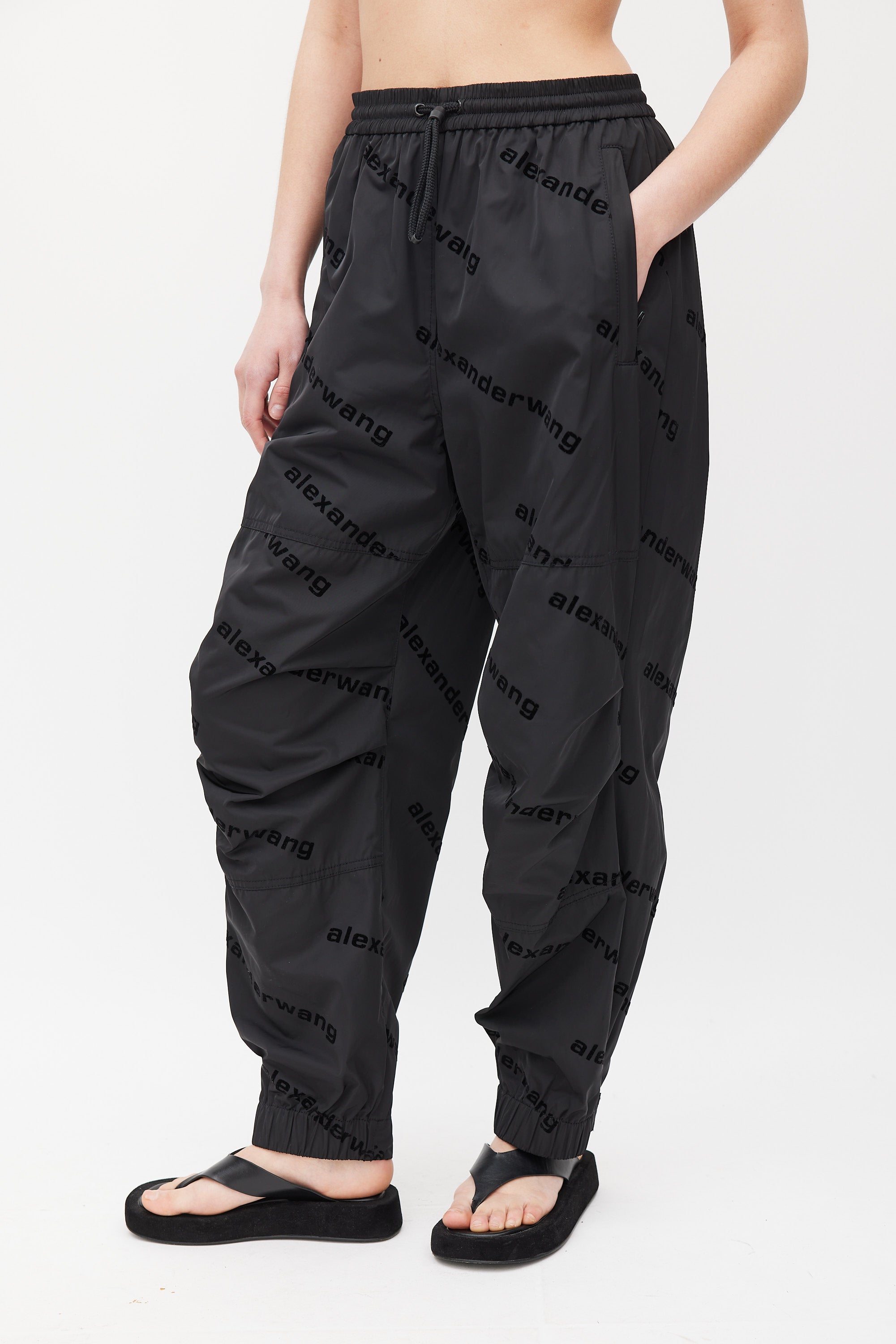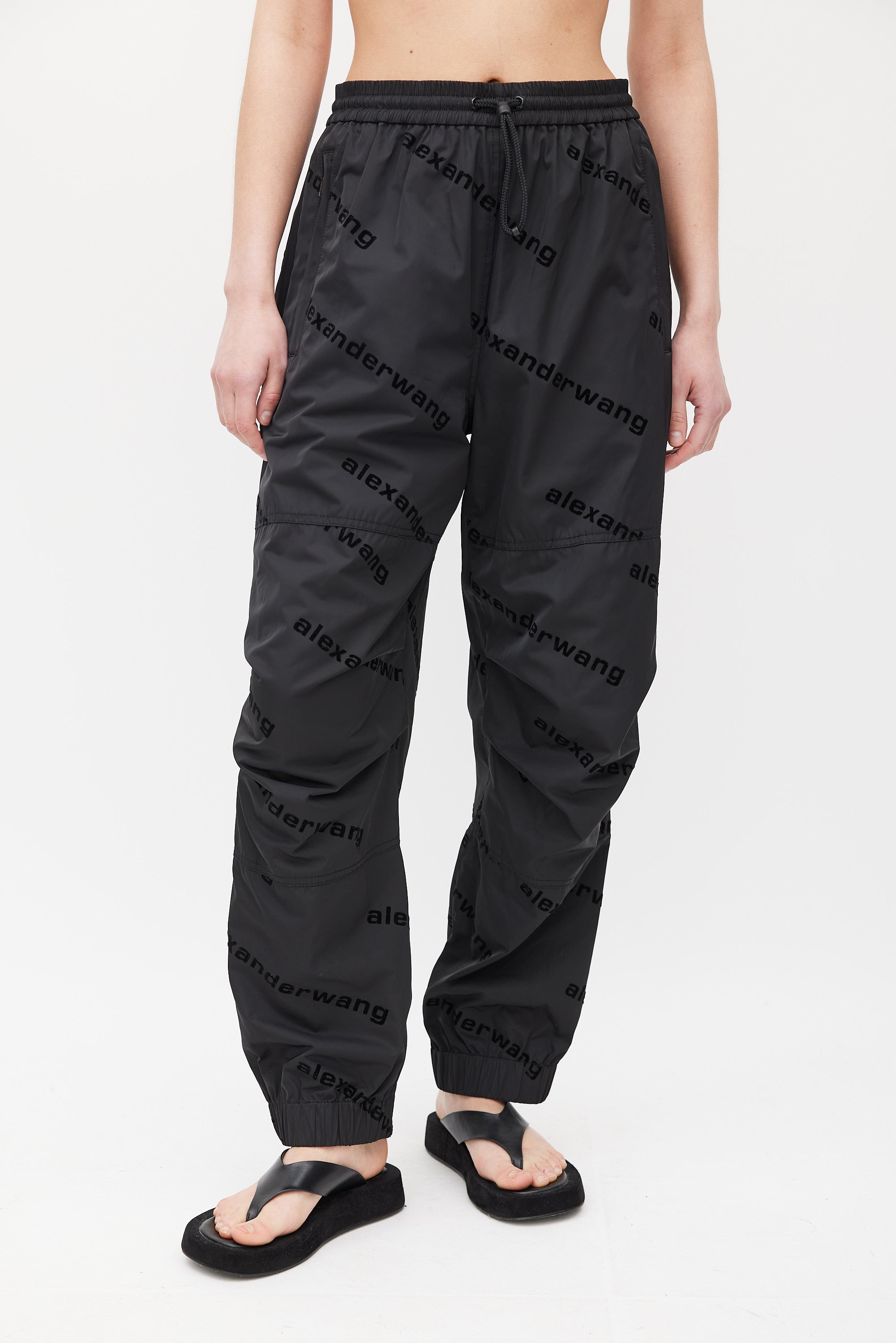Pre-owned Alexander Wang black track pants featuring all over velvet logo, elasticized waistband with drawstring, panelled construction, zip pockets at front hip, single zip pocket at back right hip, and elasticized Velcro cuffs. Lined.