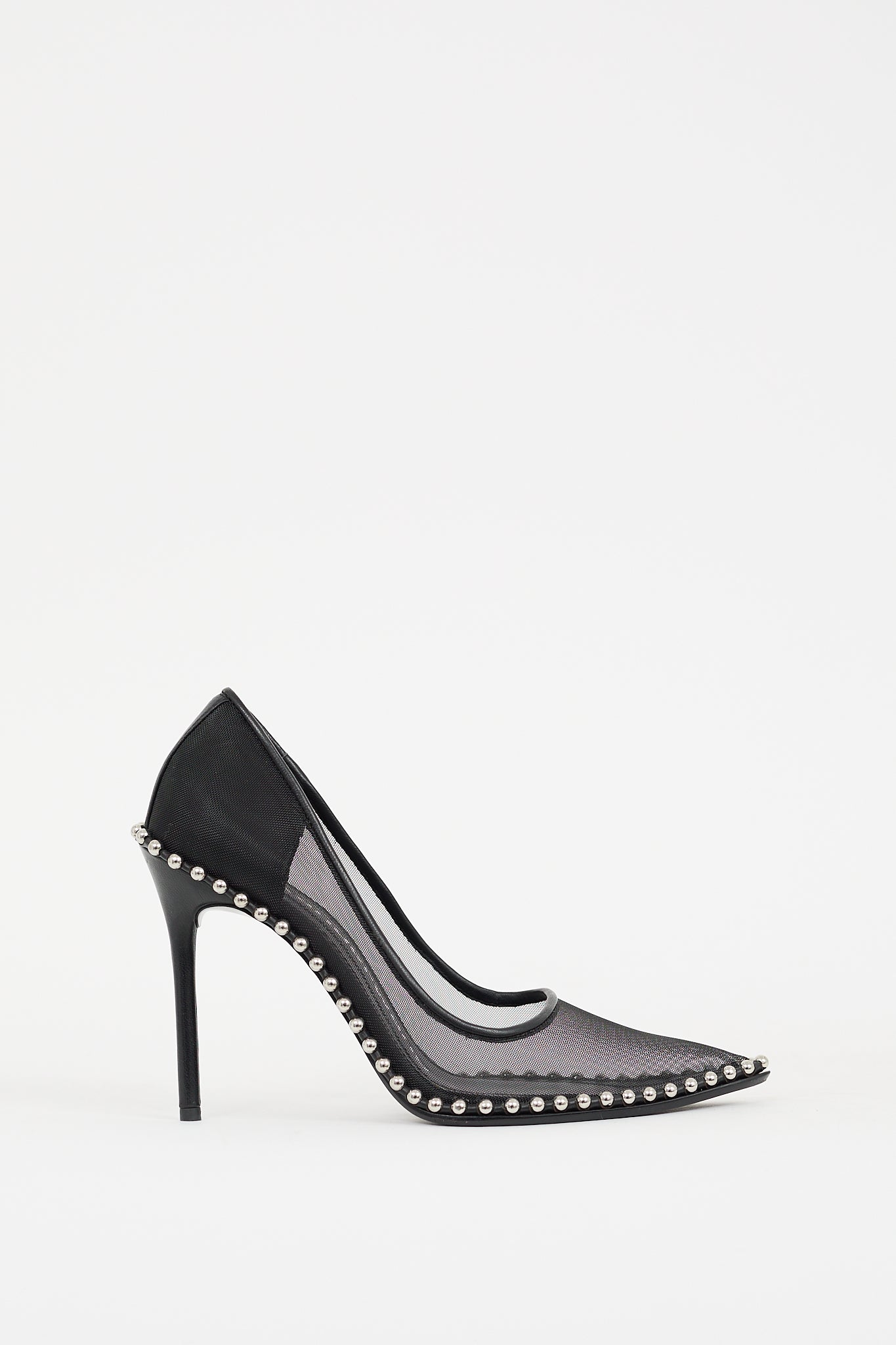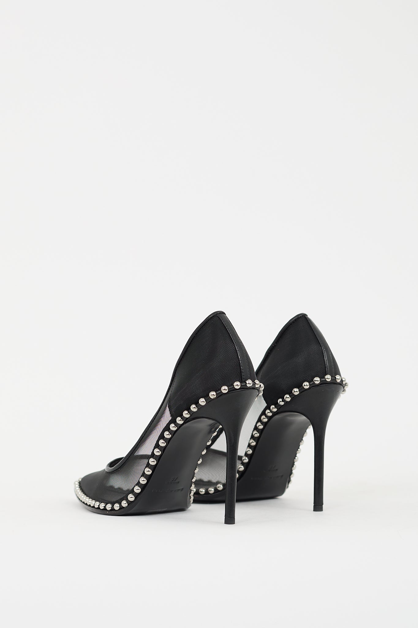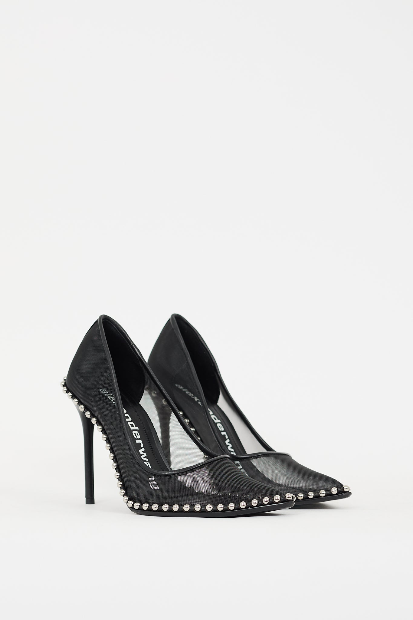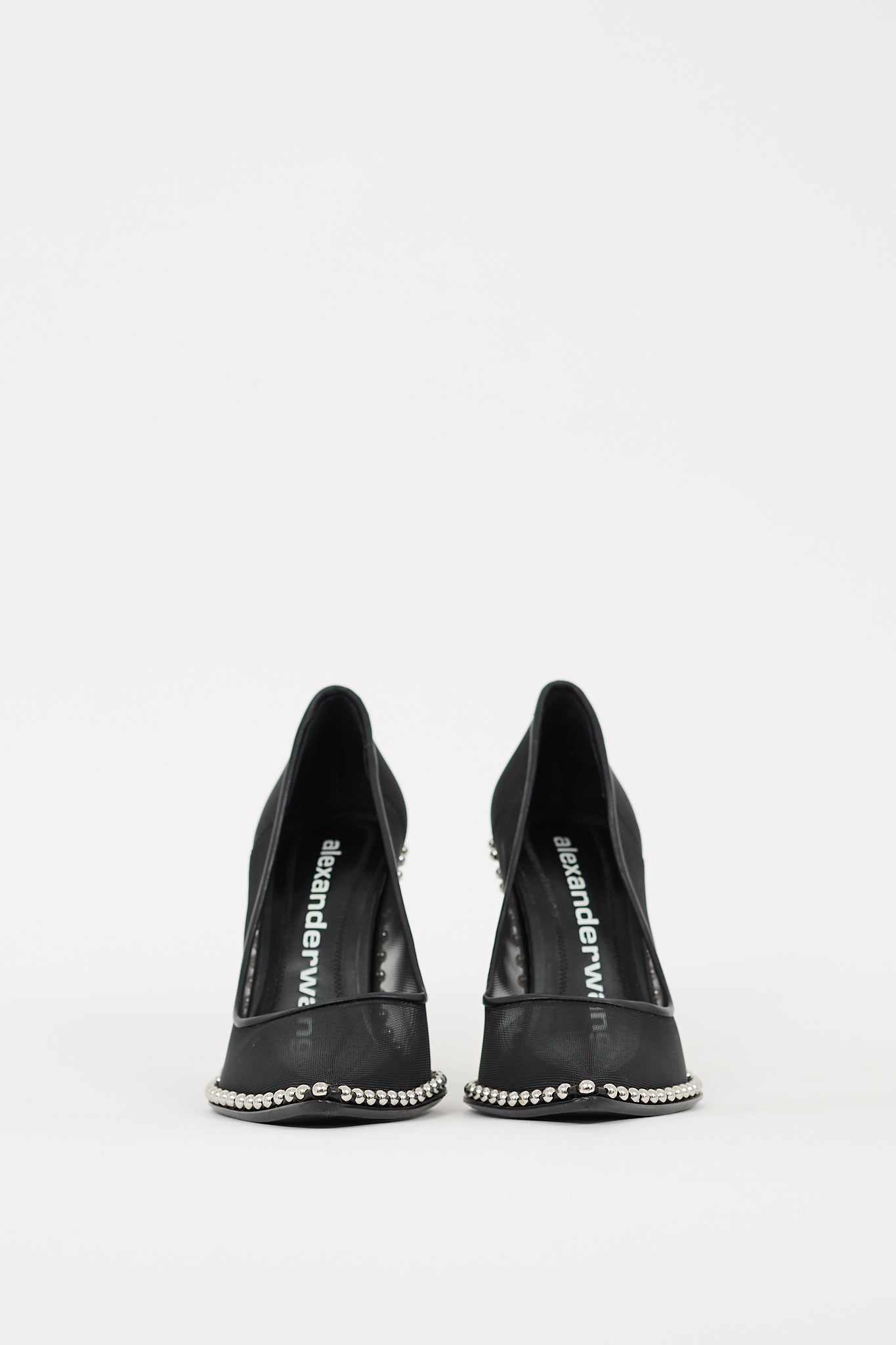 Pre-owned Alexander Wang black Rie pumps featuring a pointed toe, mesh upper, leather topline, silver tone studded trim throughout base, covered stiletto heel, and leather insole and outsole.