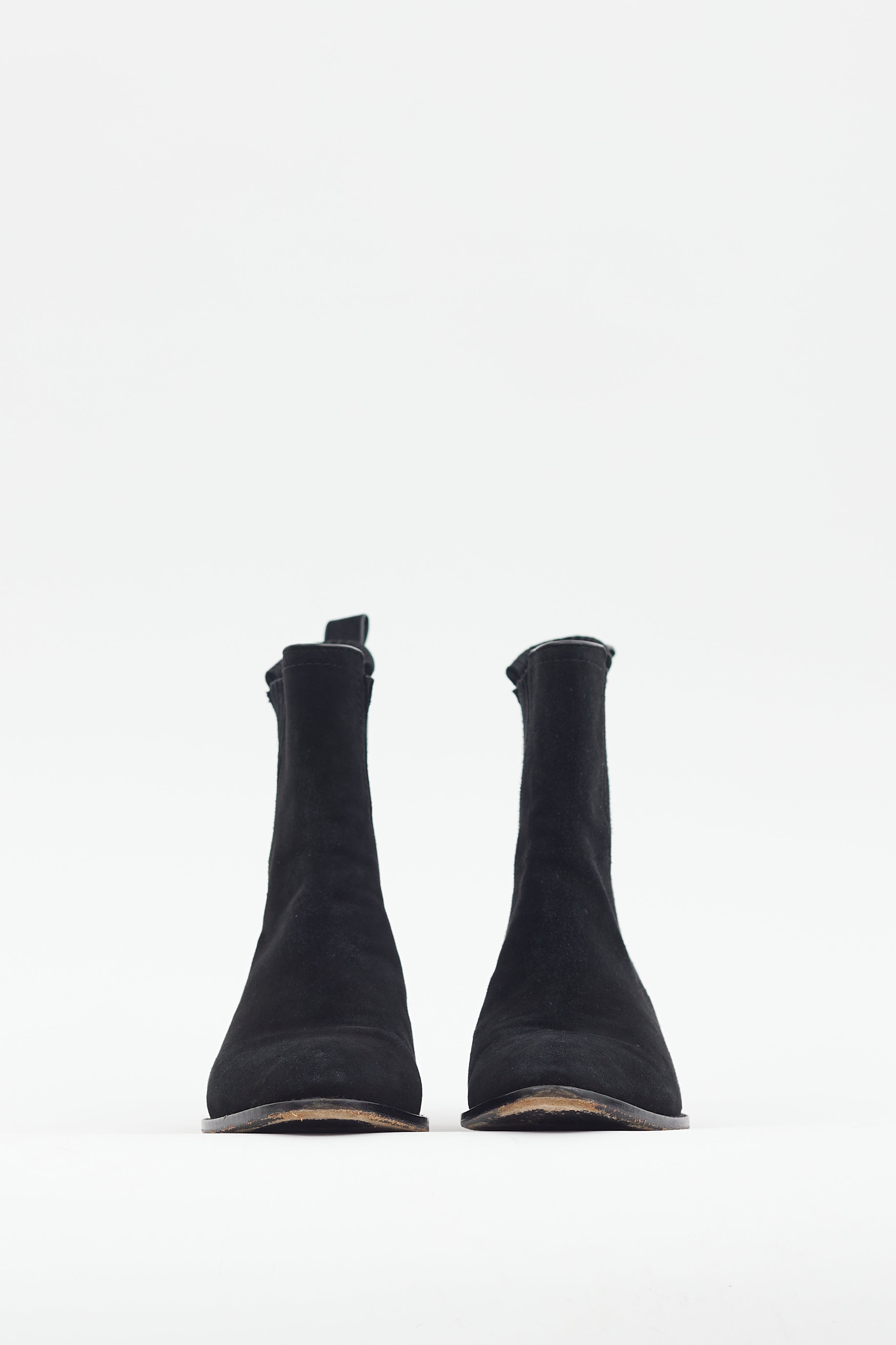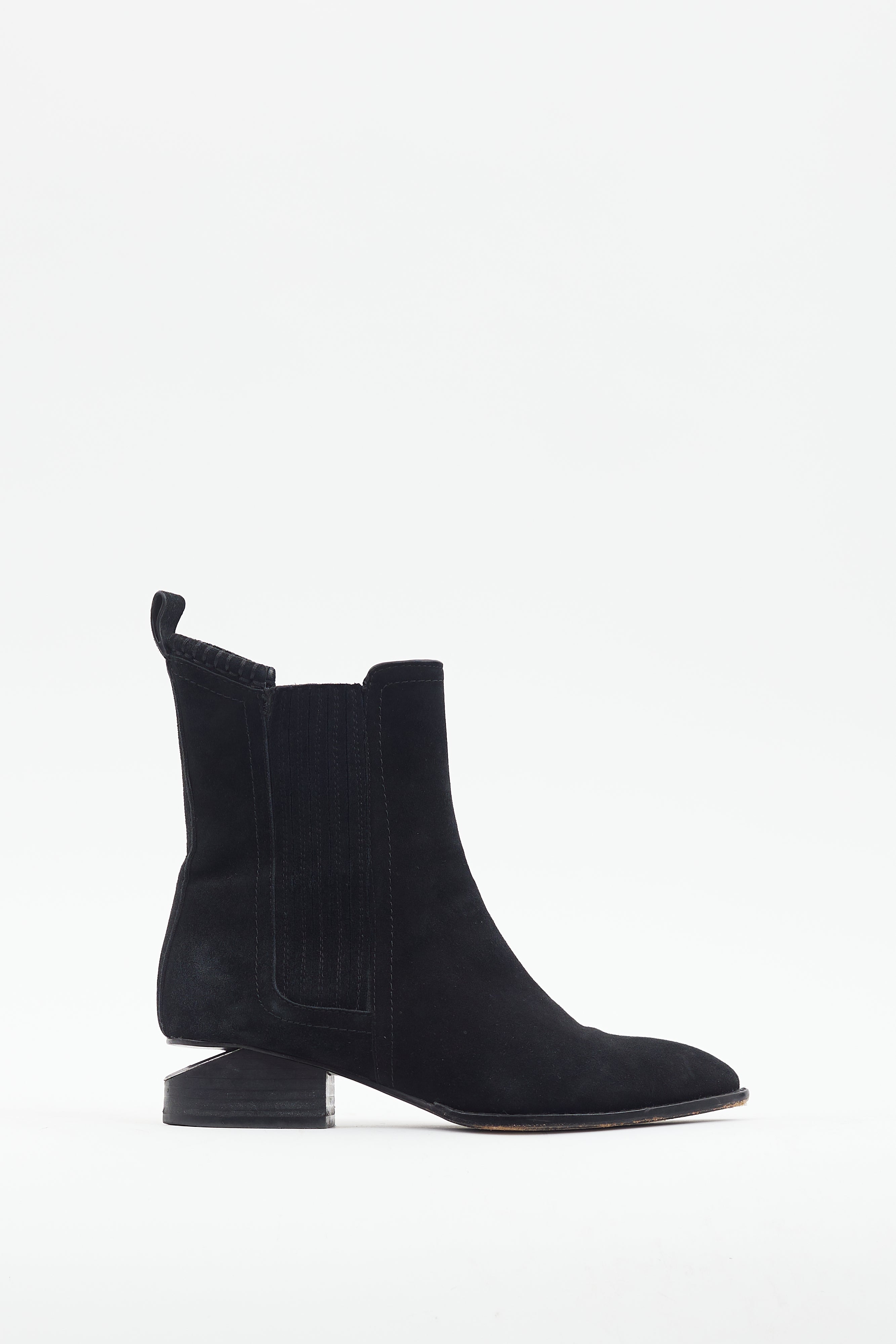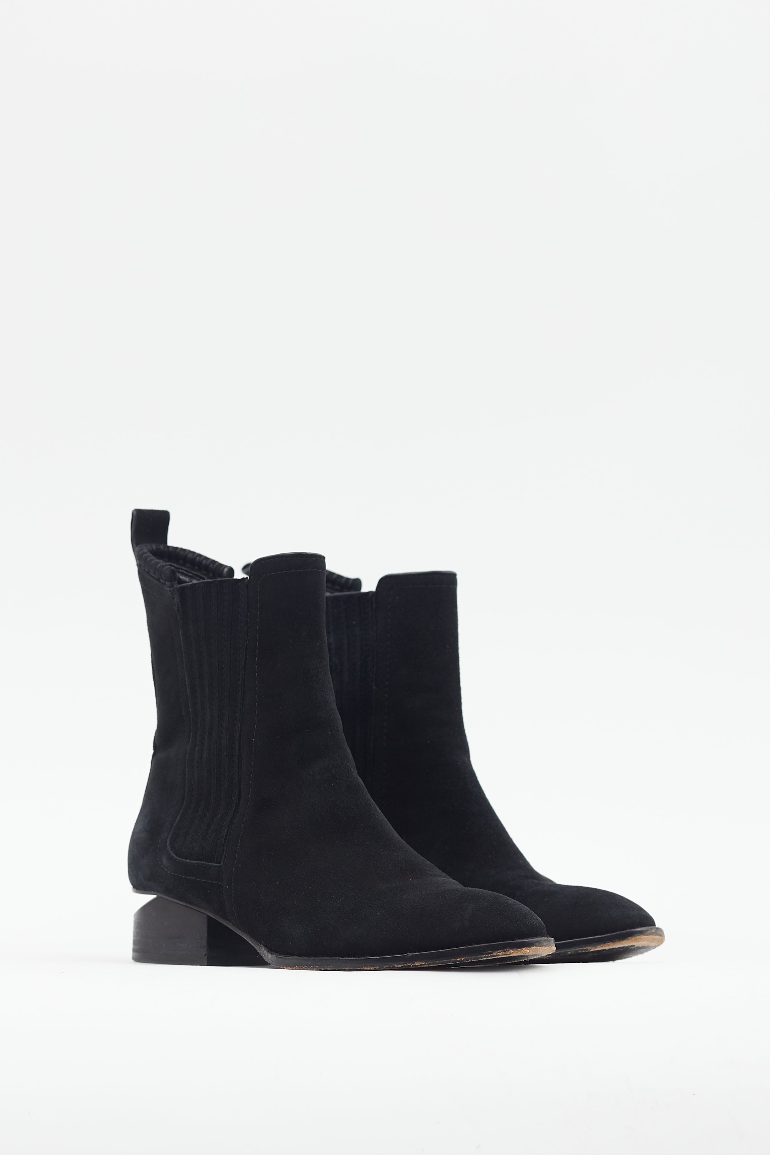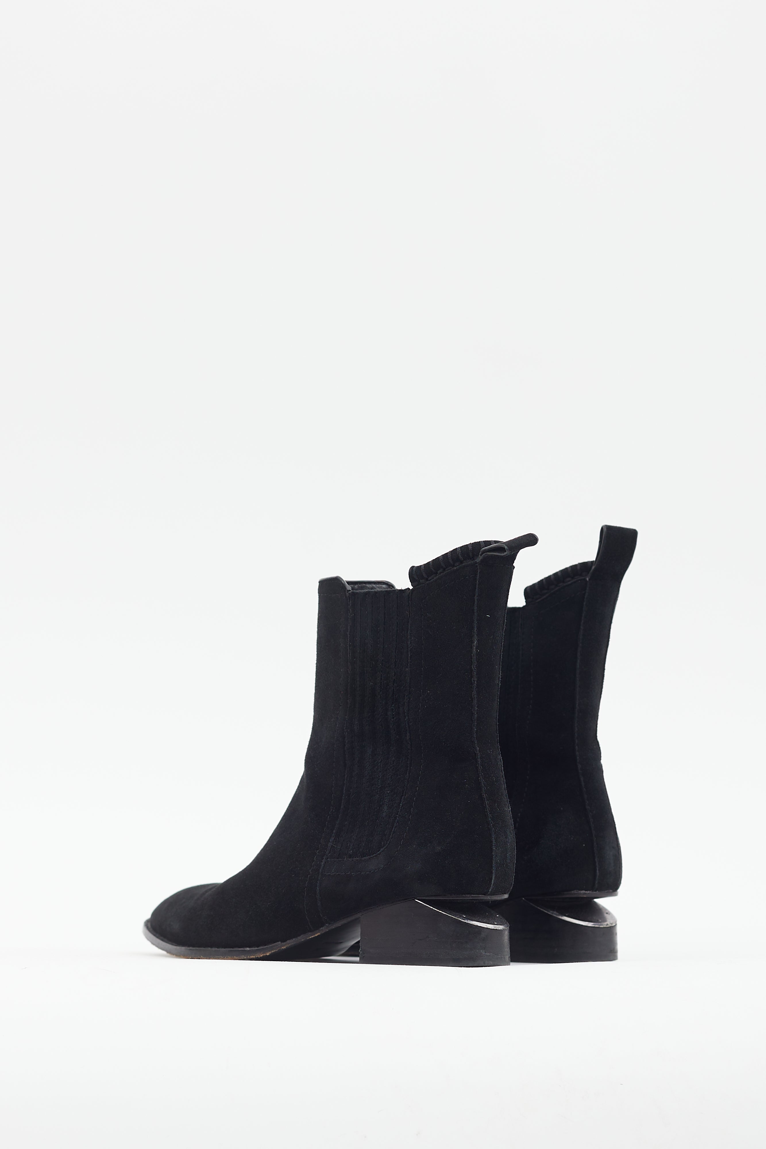 Pre-owned Alexander Wang black suede boots featuring an almond toe, elasticize sides, whip stich detailing with pull tab at collar, and stacked heel with silver tone plate at cutout.