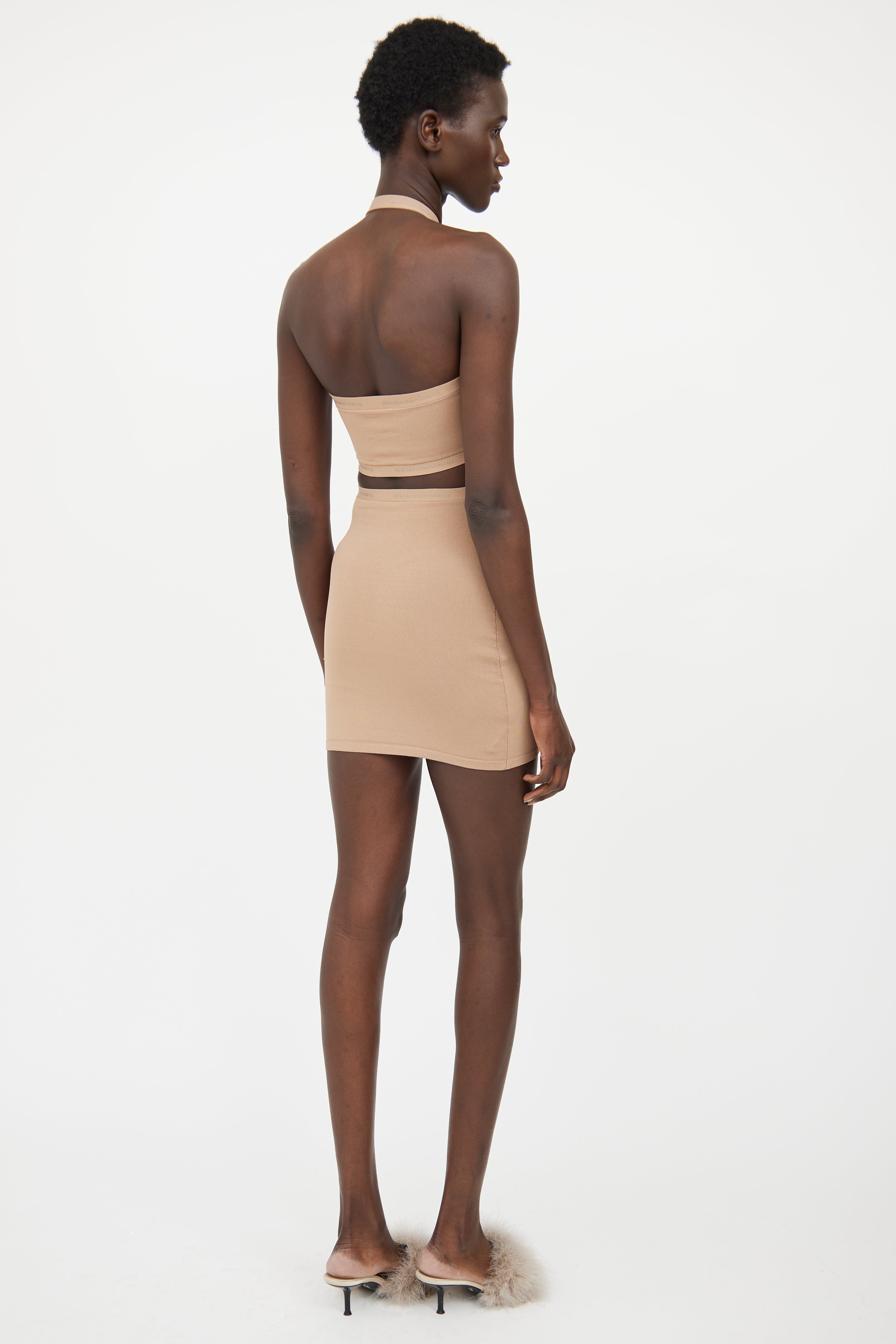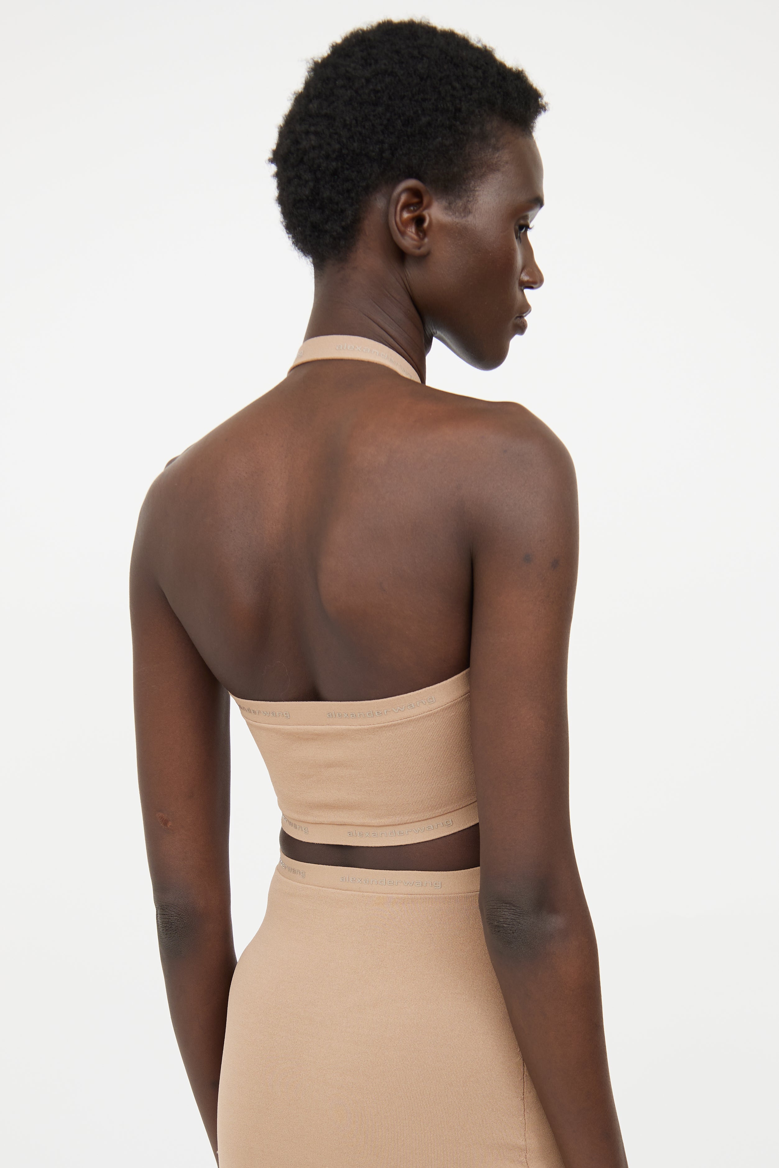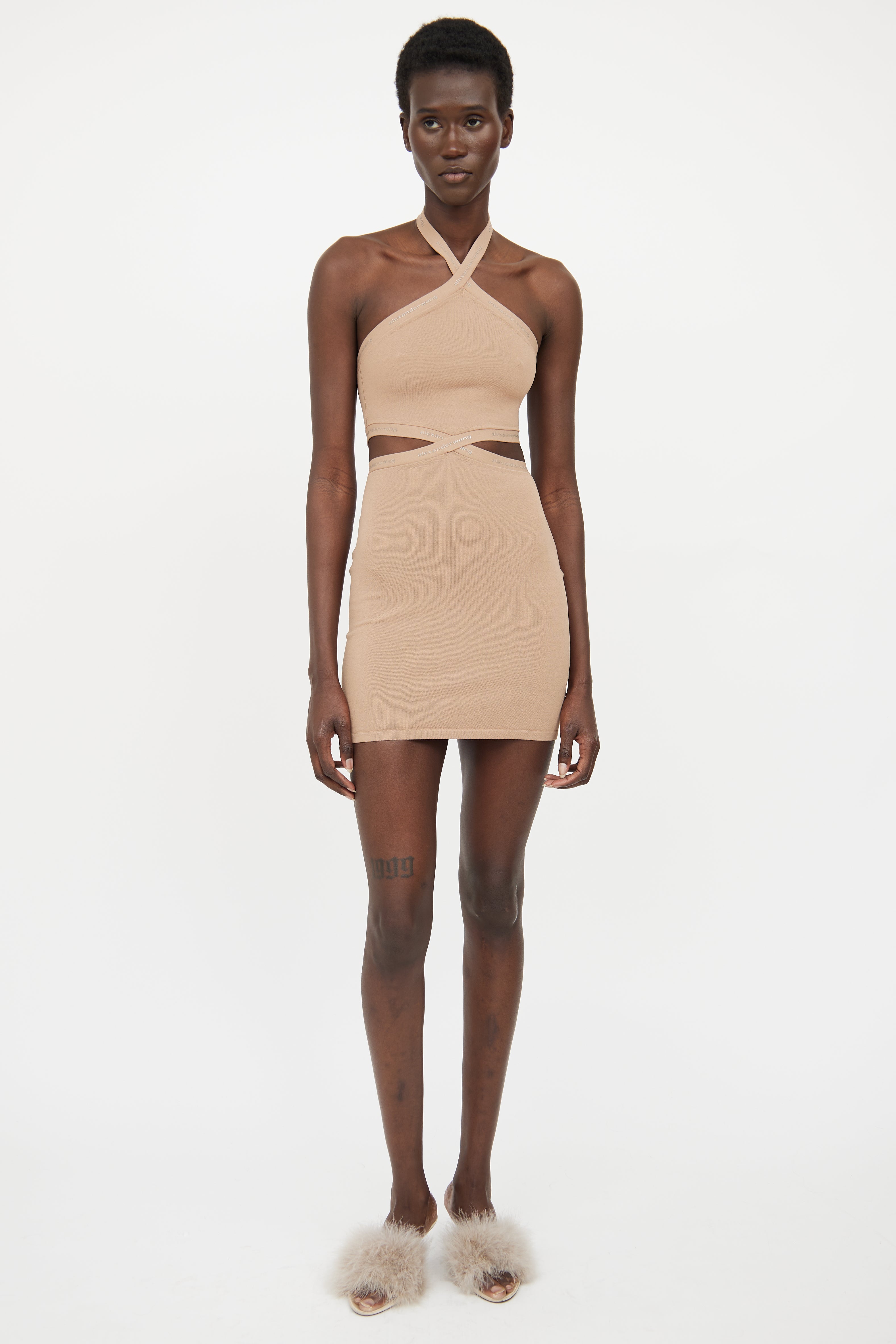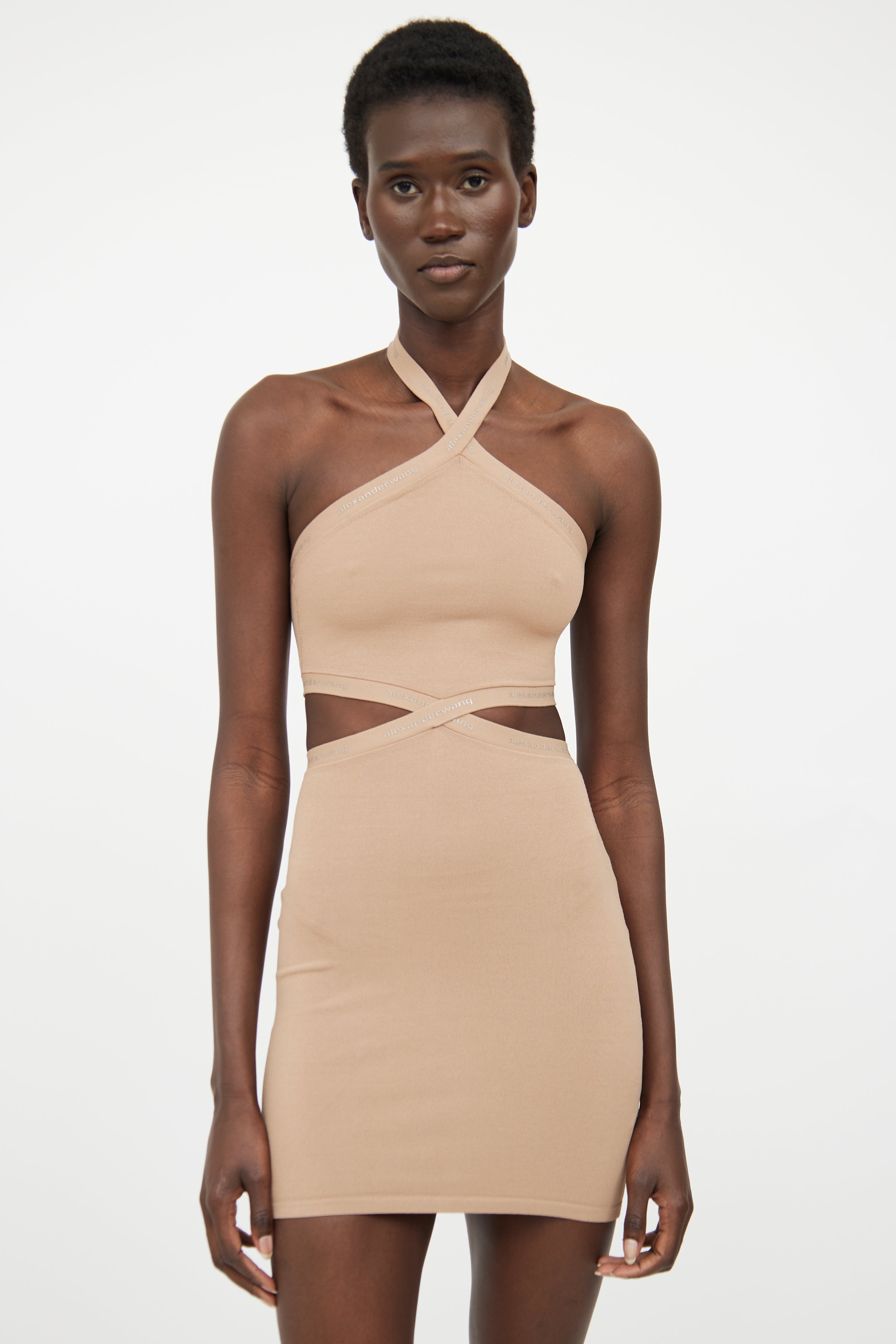 Pre-owned Alexander Wang brown sleeveless dress featuring halter neck, logo text trim, and crossover cutout detail on waist.
