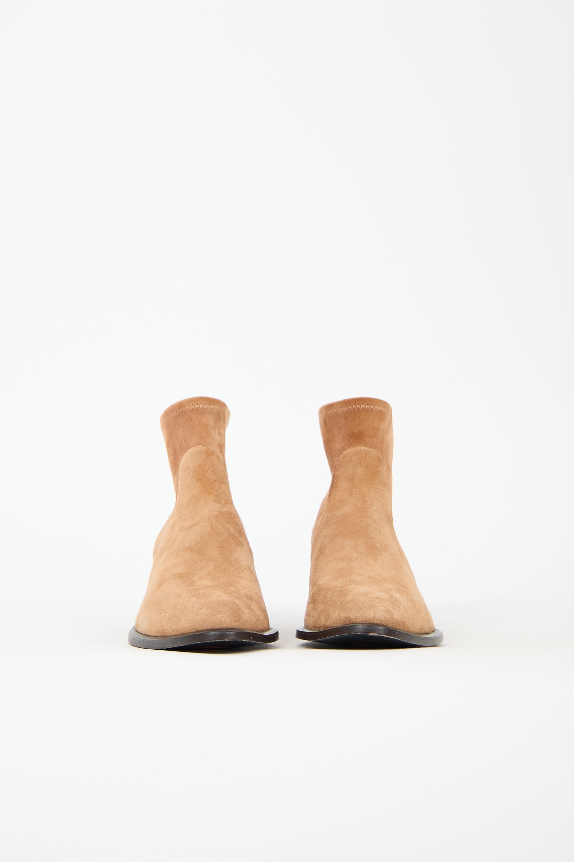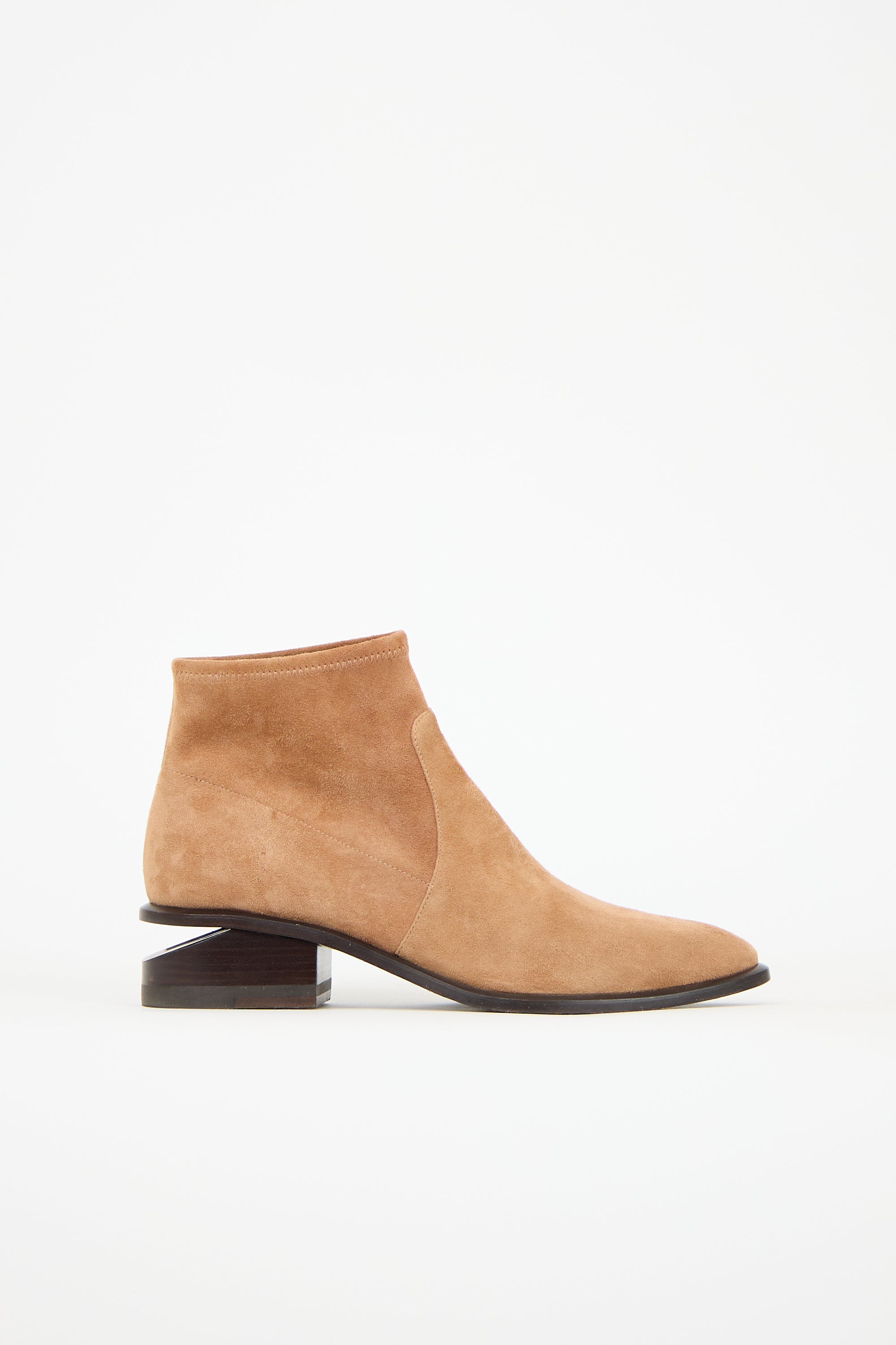 Pre-owned Alexander Wang brown suede Kori boots featuring almond toe, slip on entry, and cut out heel with silver tone hardware detail.