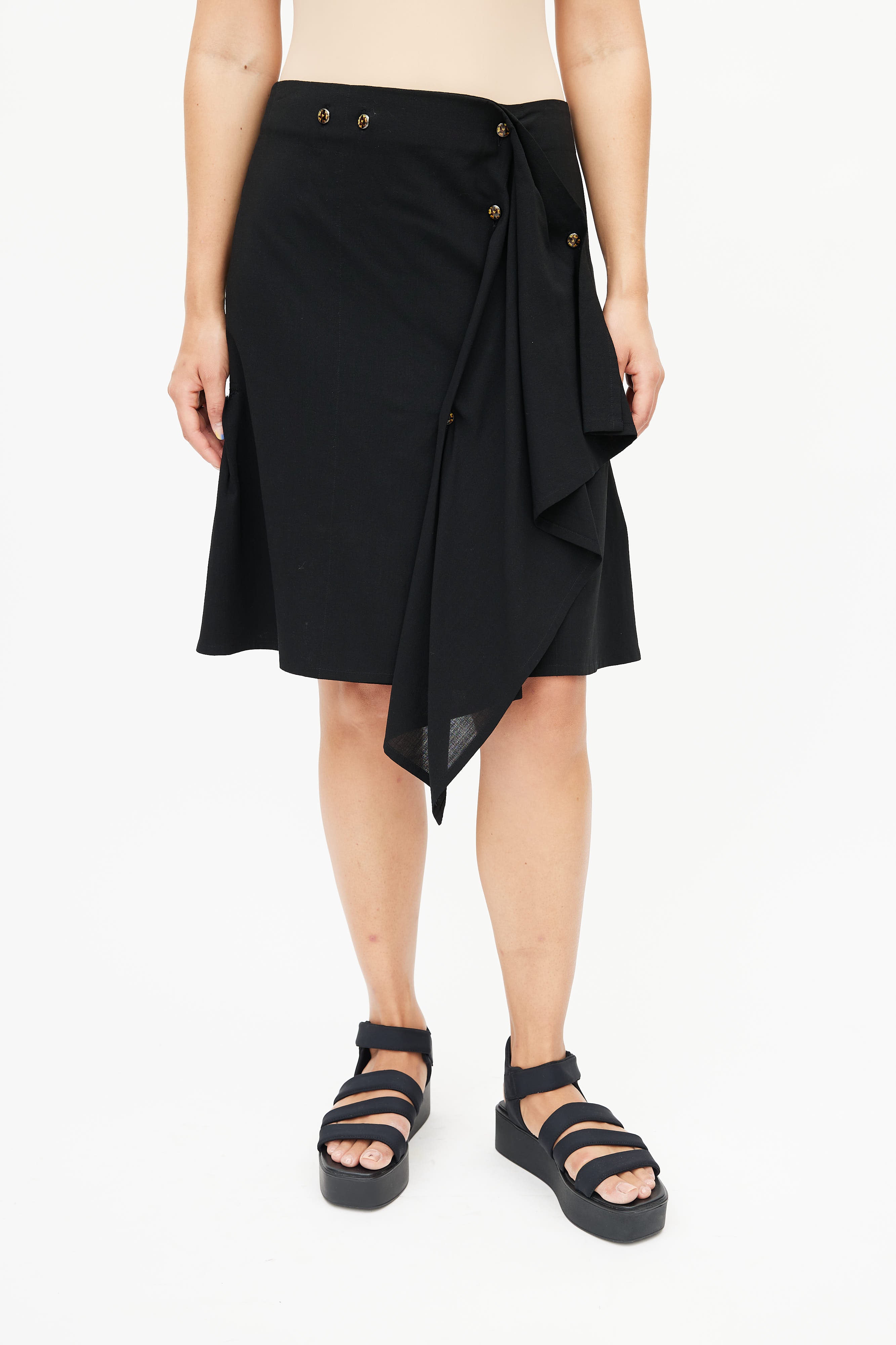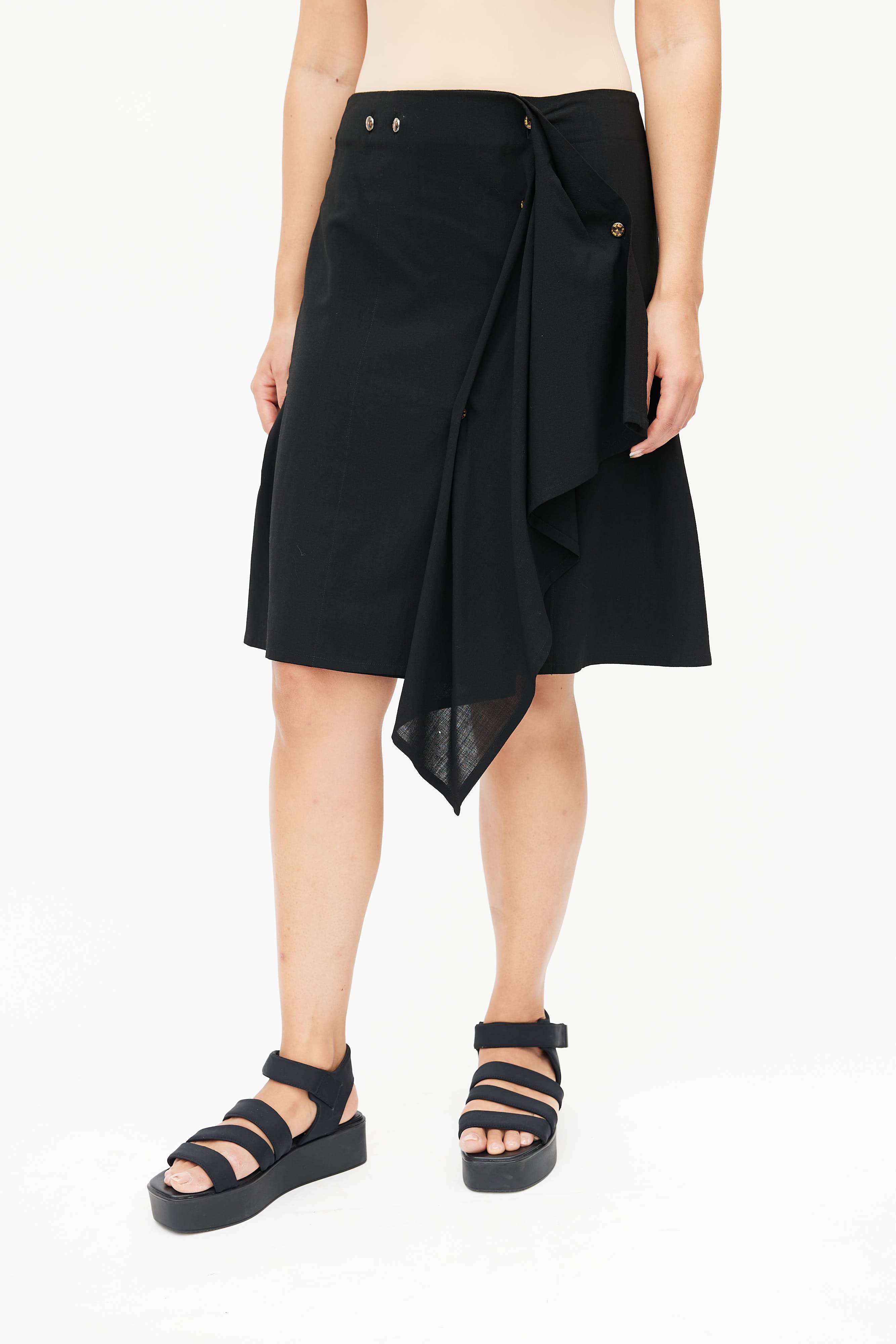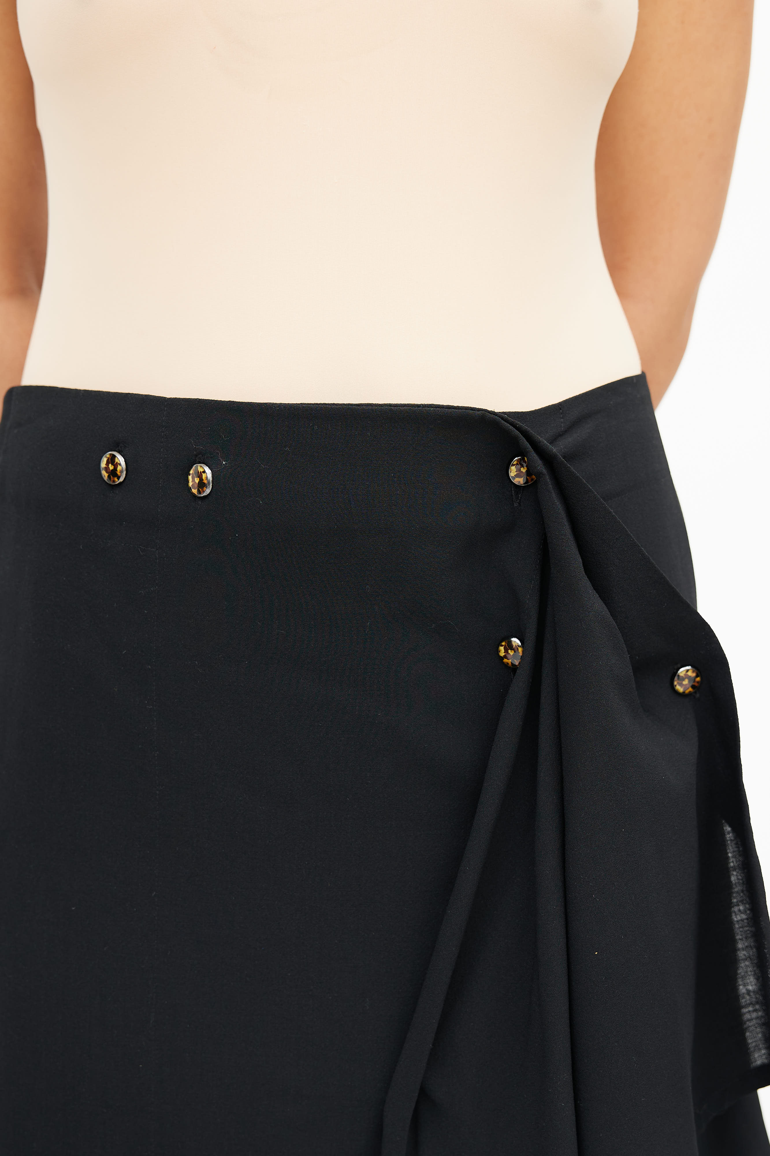 Pre-owned Issey Miyake black skirt featuring asymmetrical drape with buttons fastening, flower enamel button embellishment, and straight waistband with buttons closure.