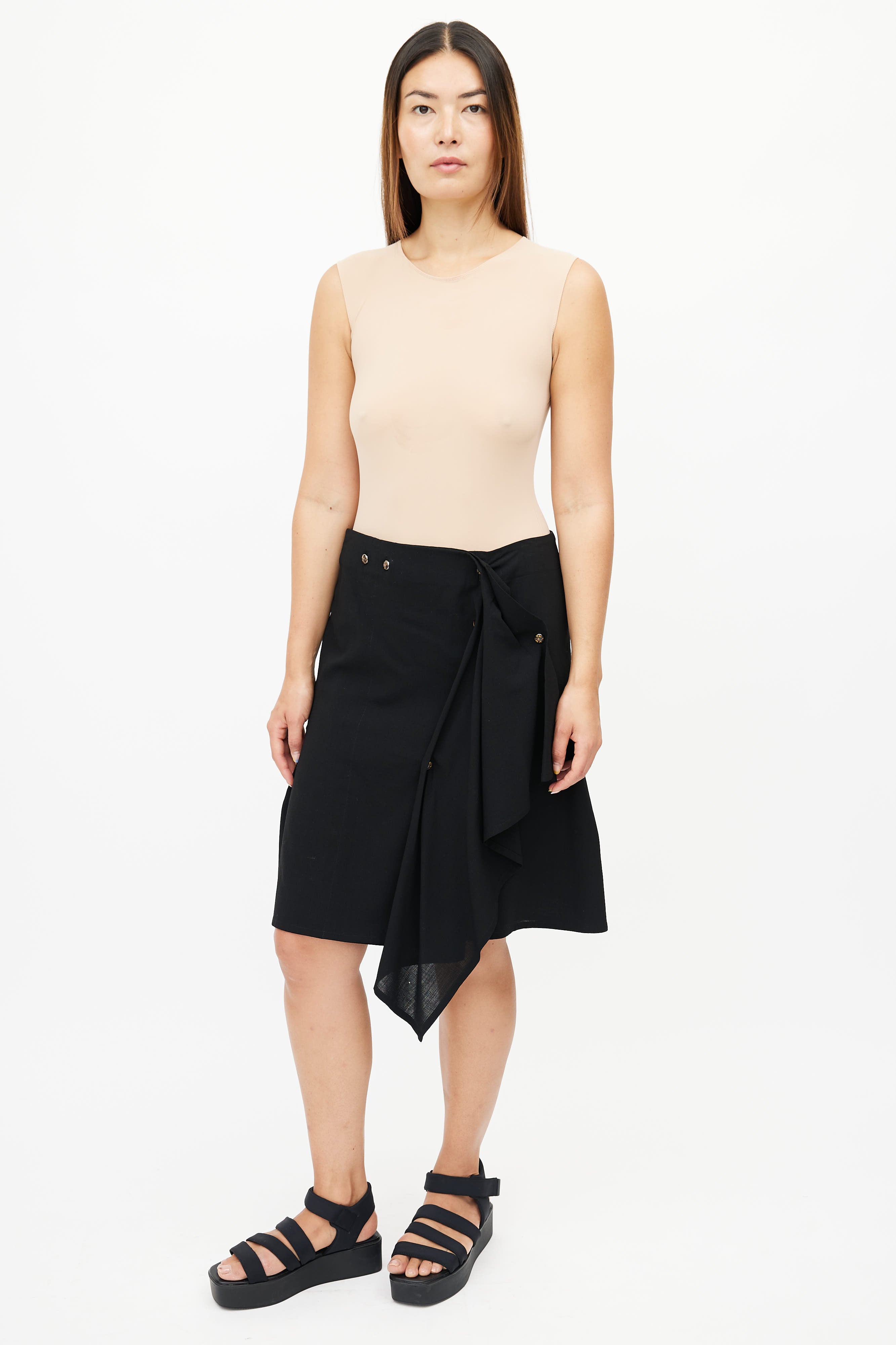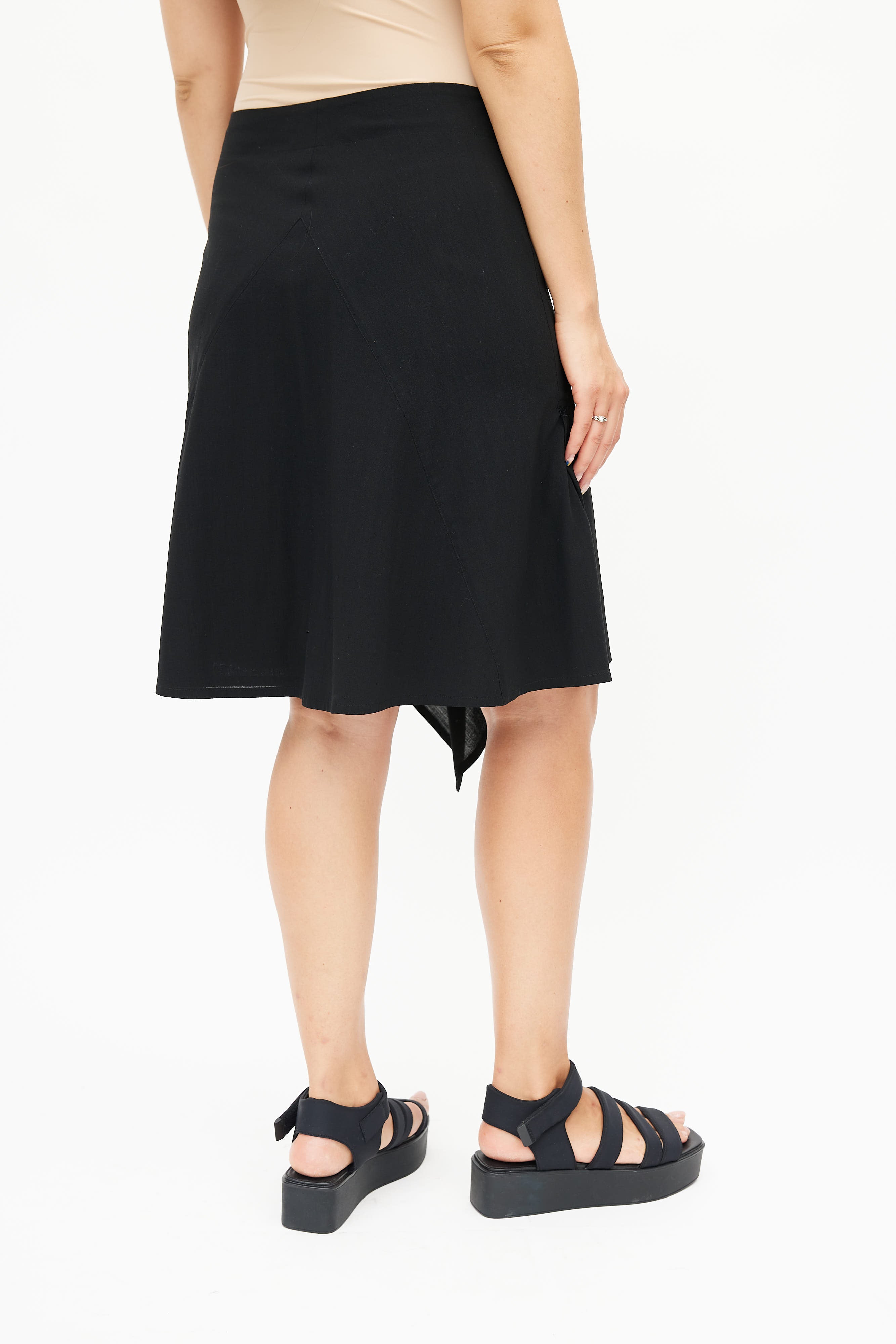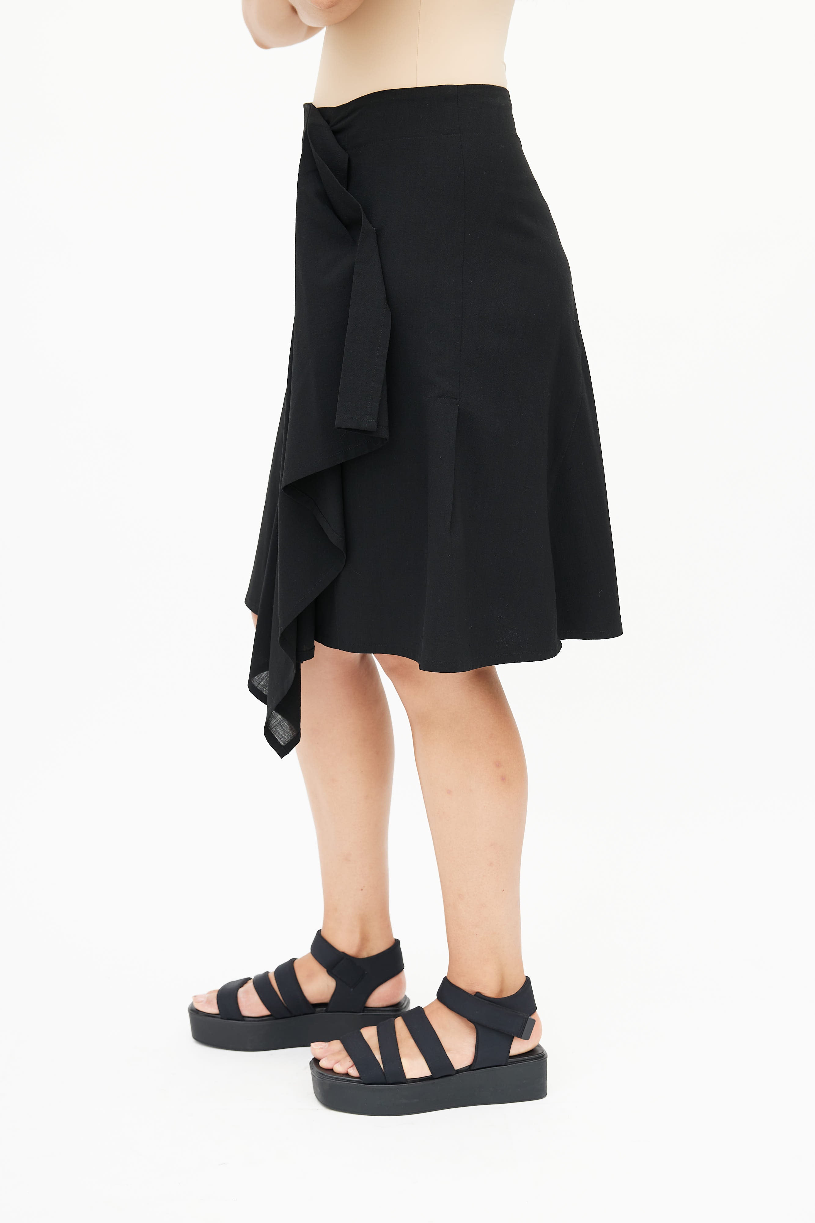 Pre-owned Issey Miyake black skirt featuring asymmetrical drape with buttons fastening, flower enamel button embellishment, and straight waistband with buttons closure.