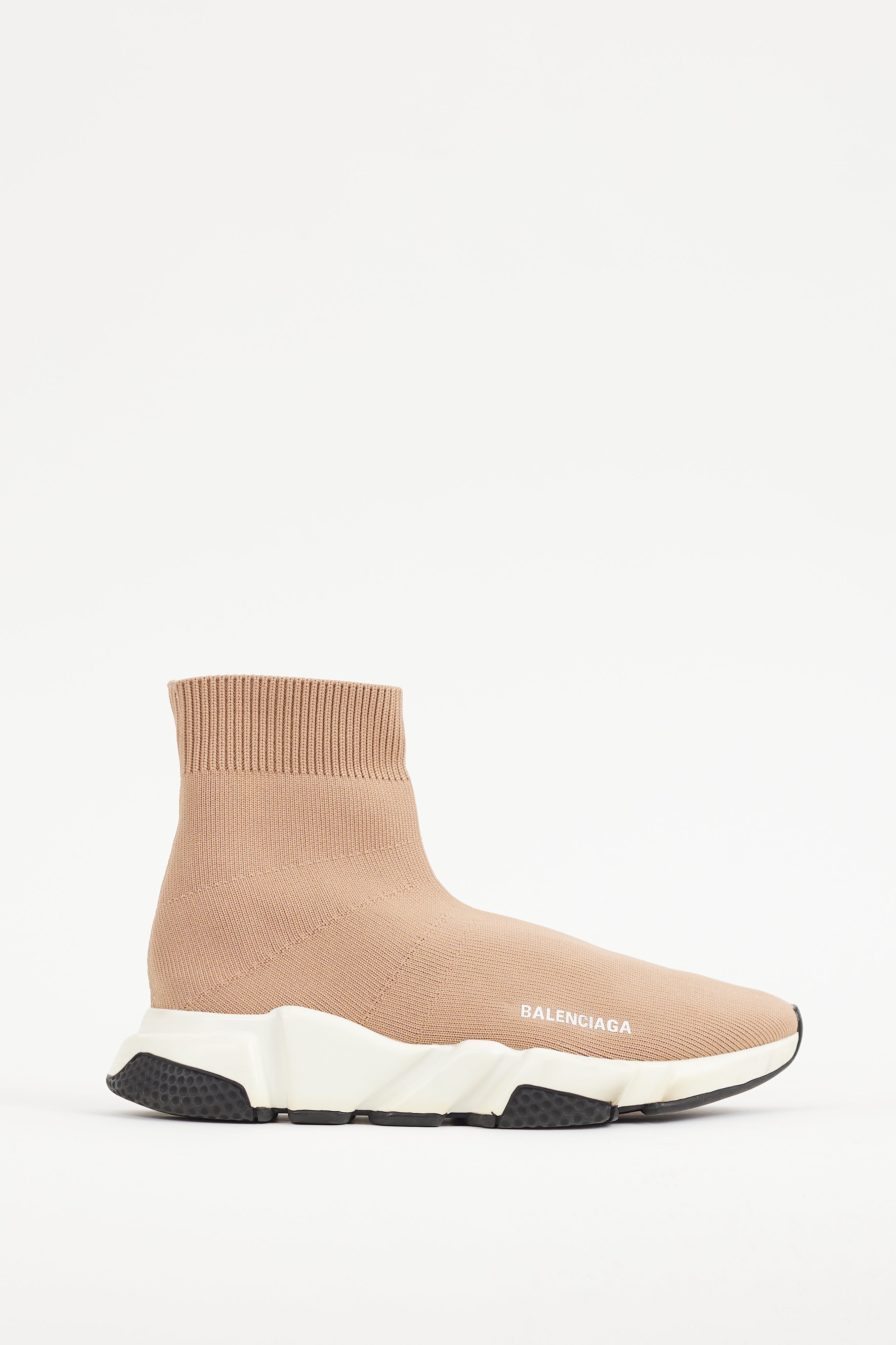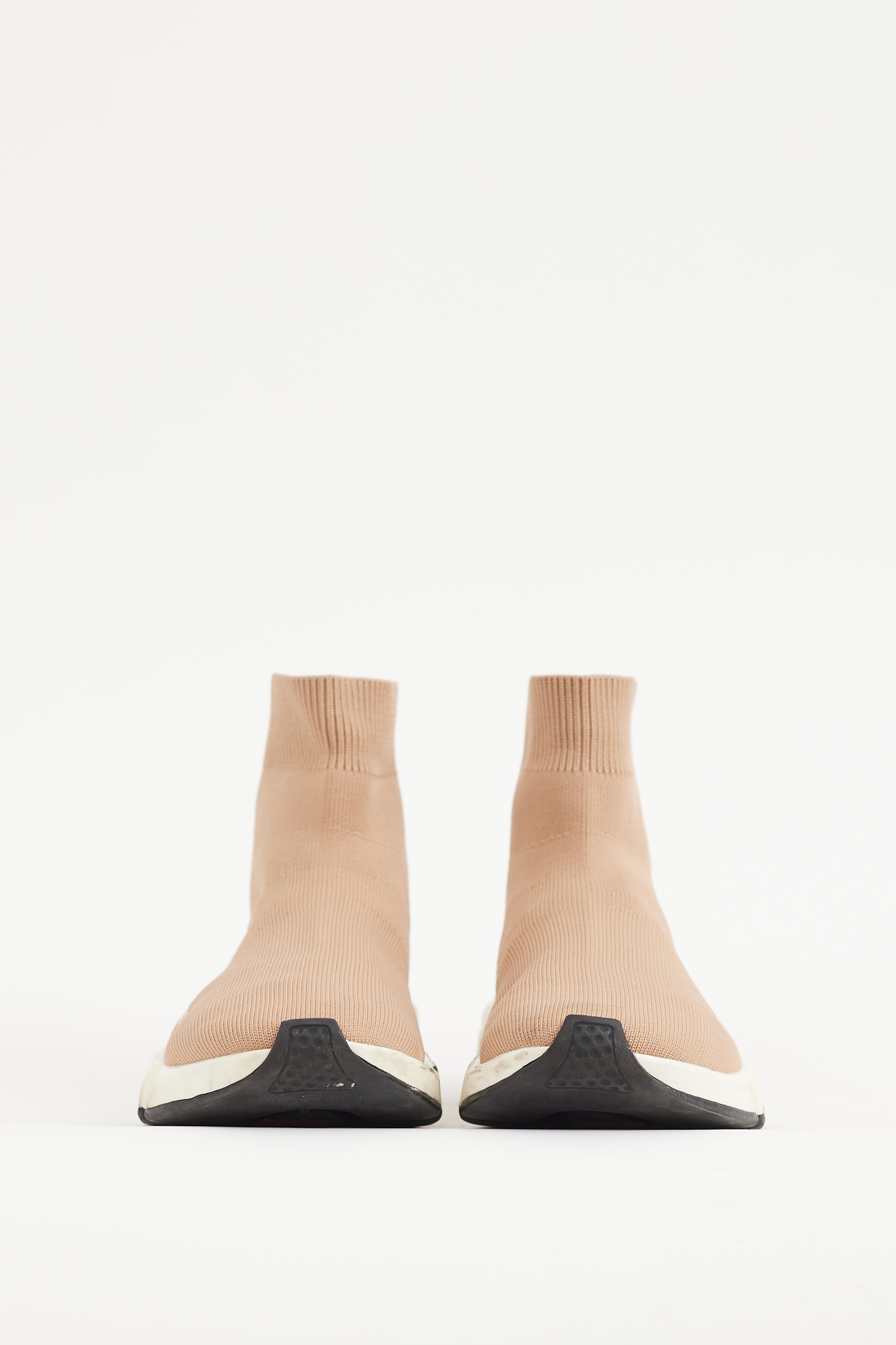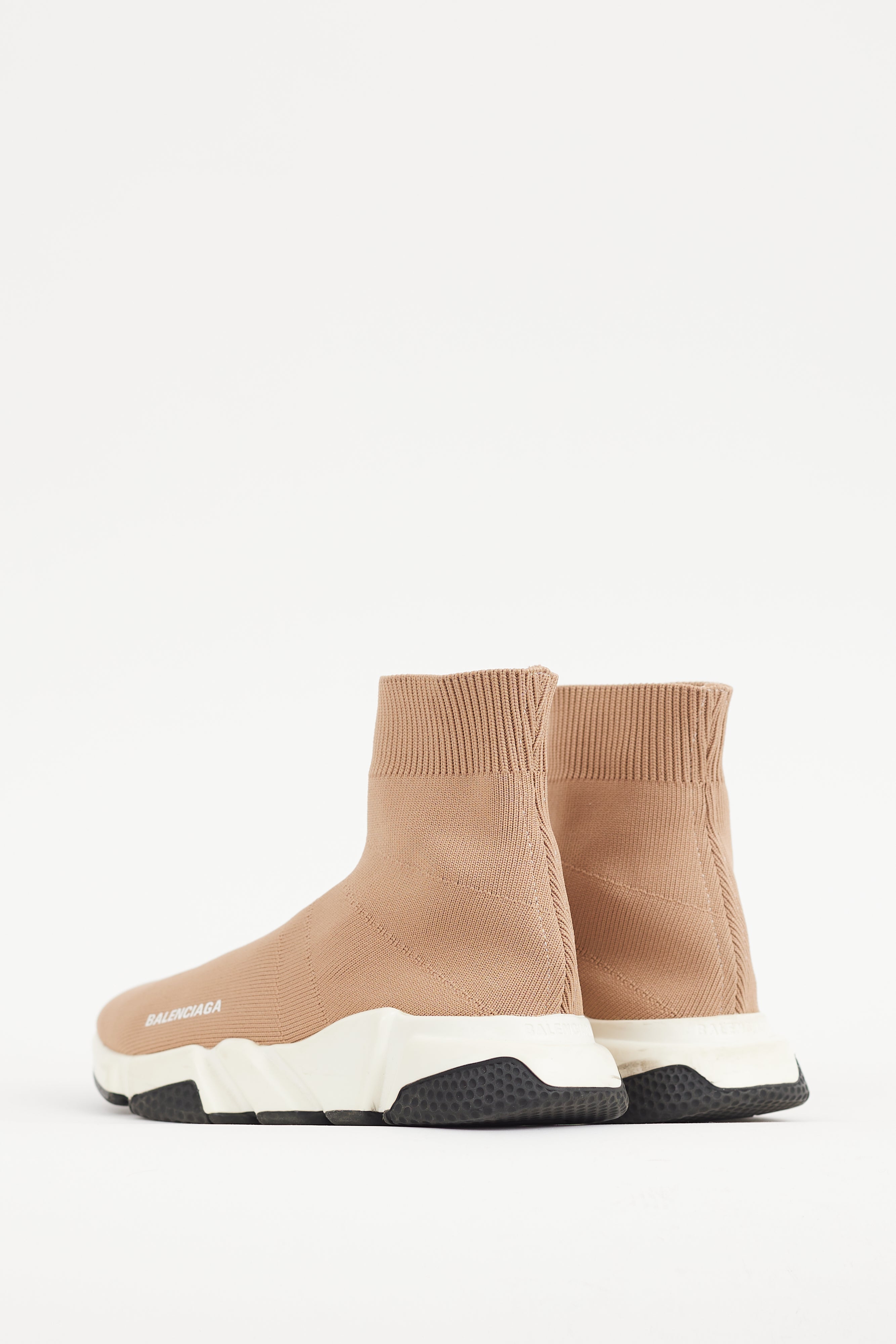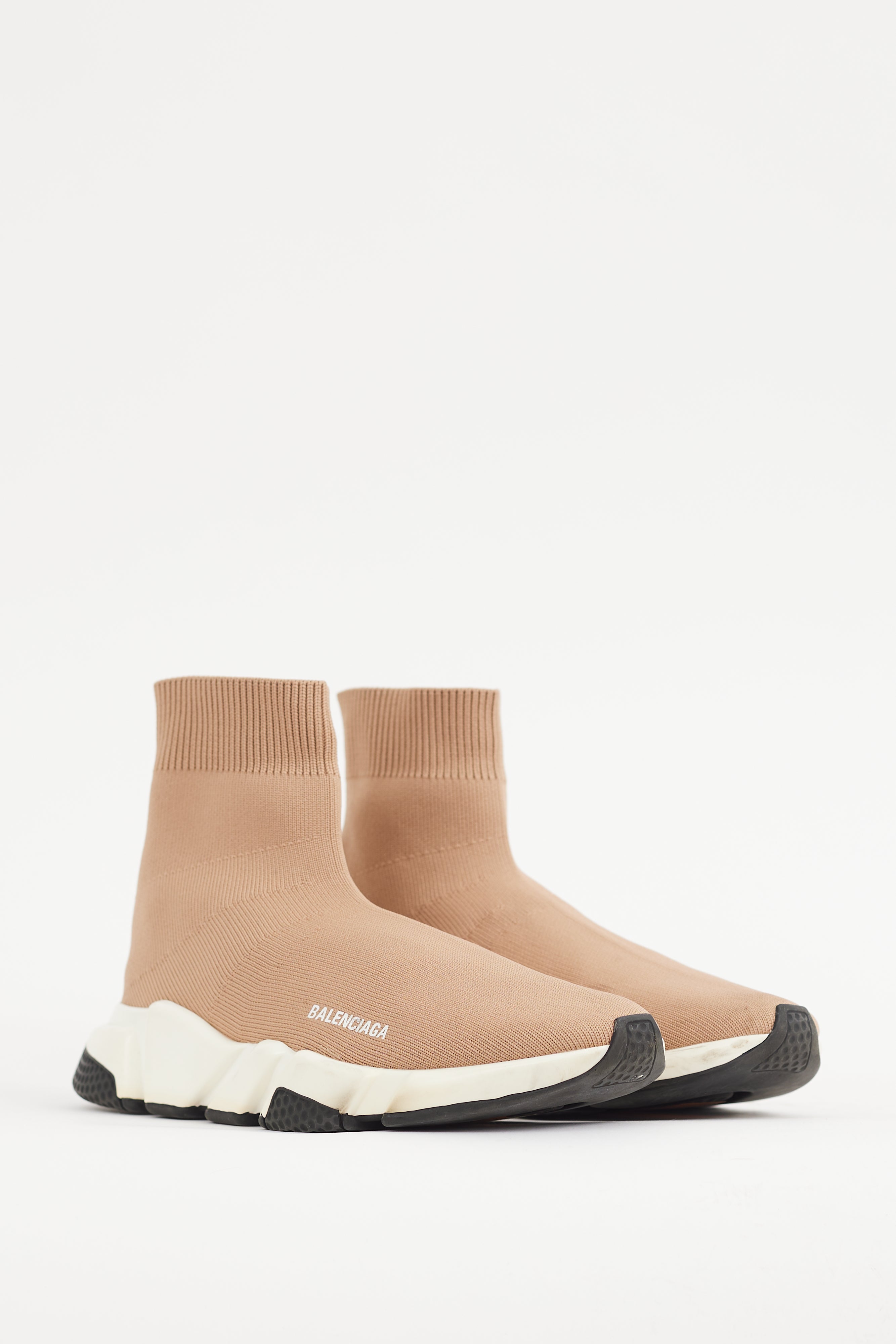 Pre-owned Balenciaga beige Speed sneakers featuring a round toe, knit upper, white printed logo at side, ribbed collar, and embossed logo at heel.