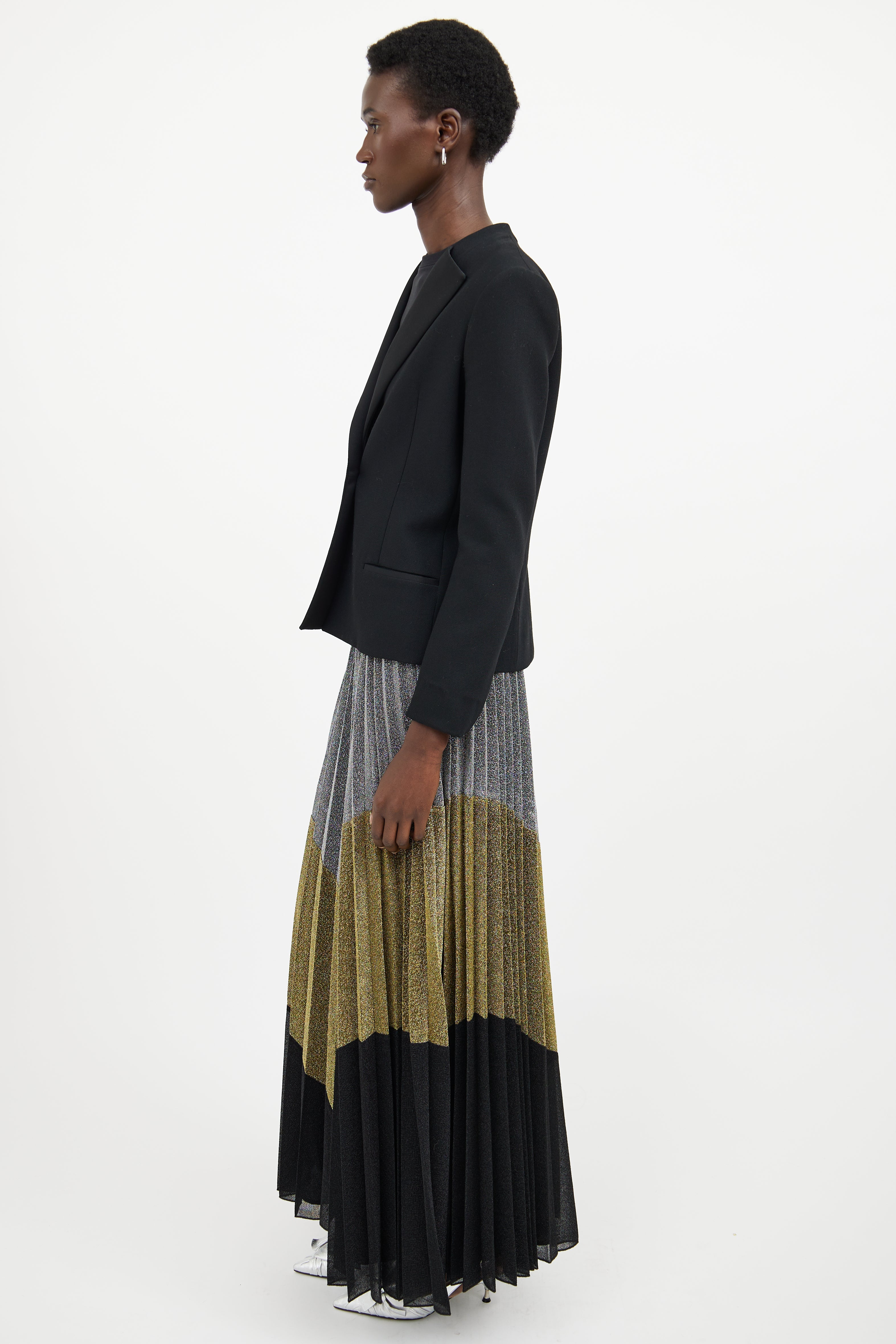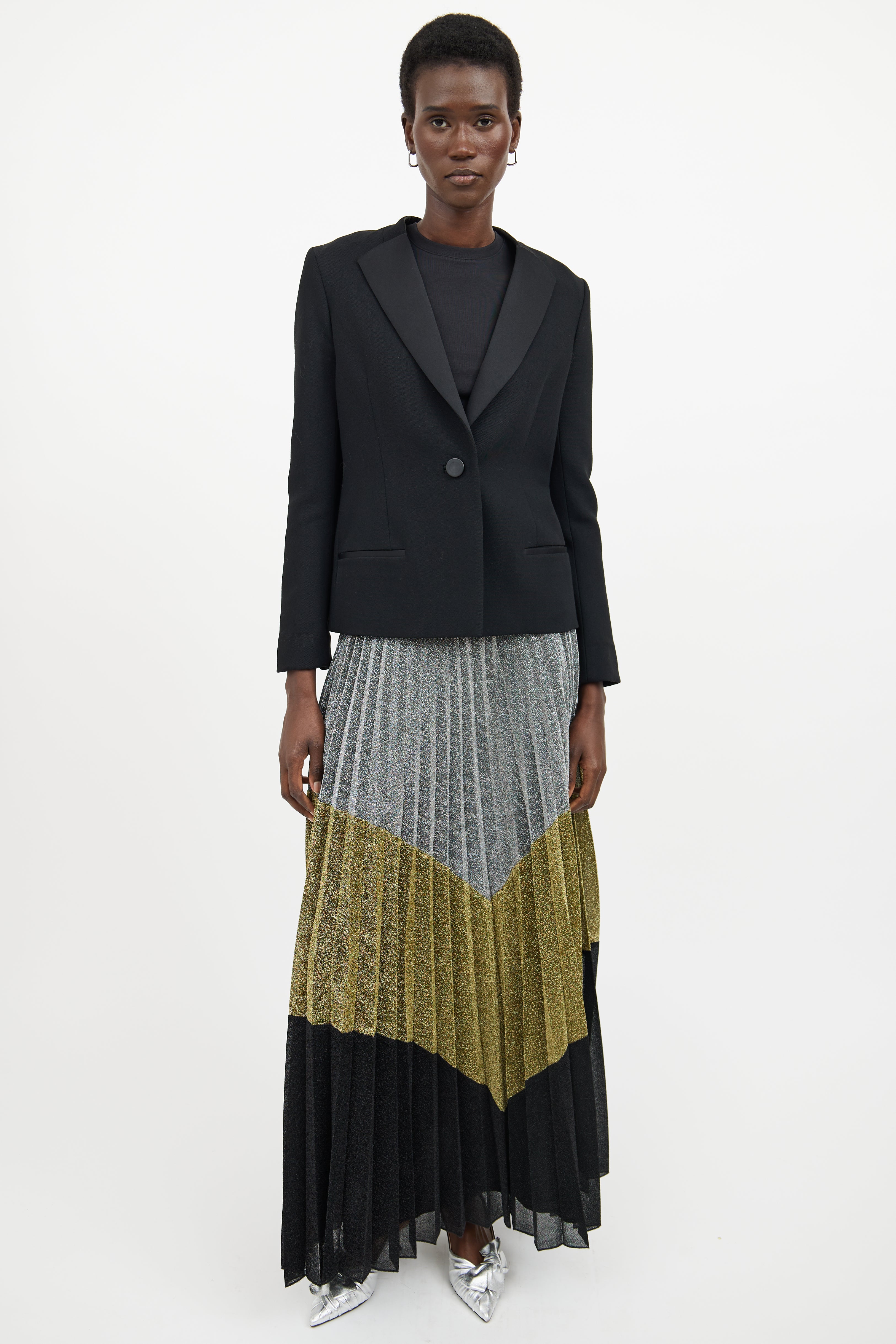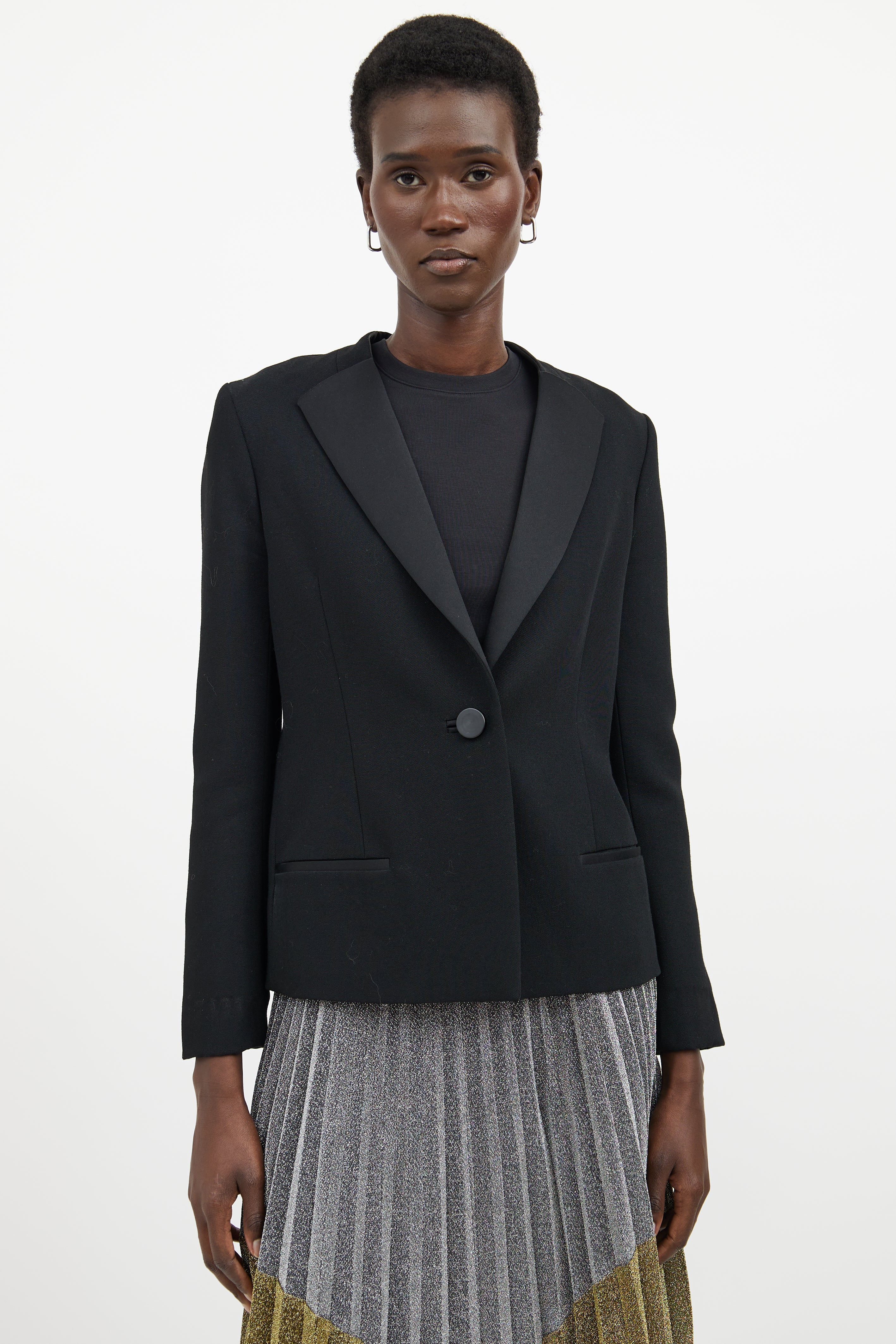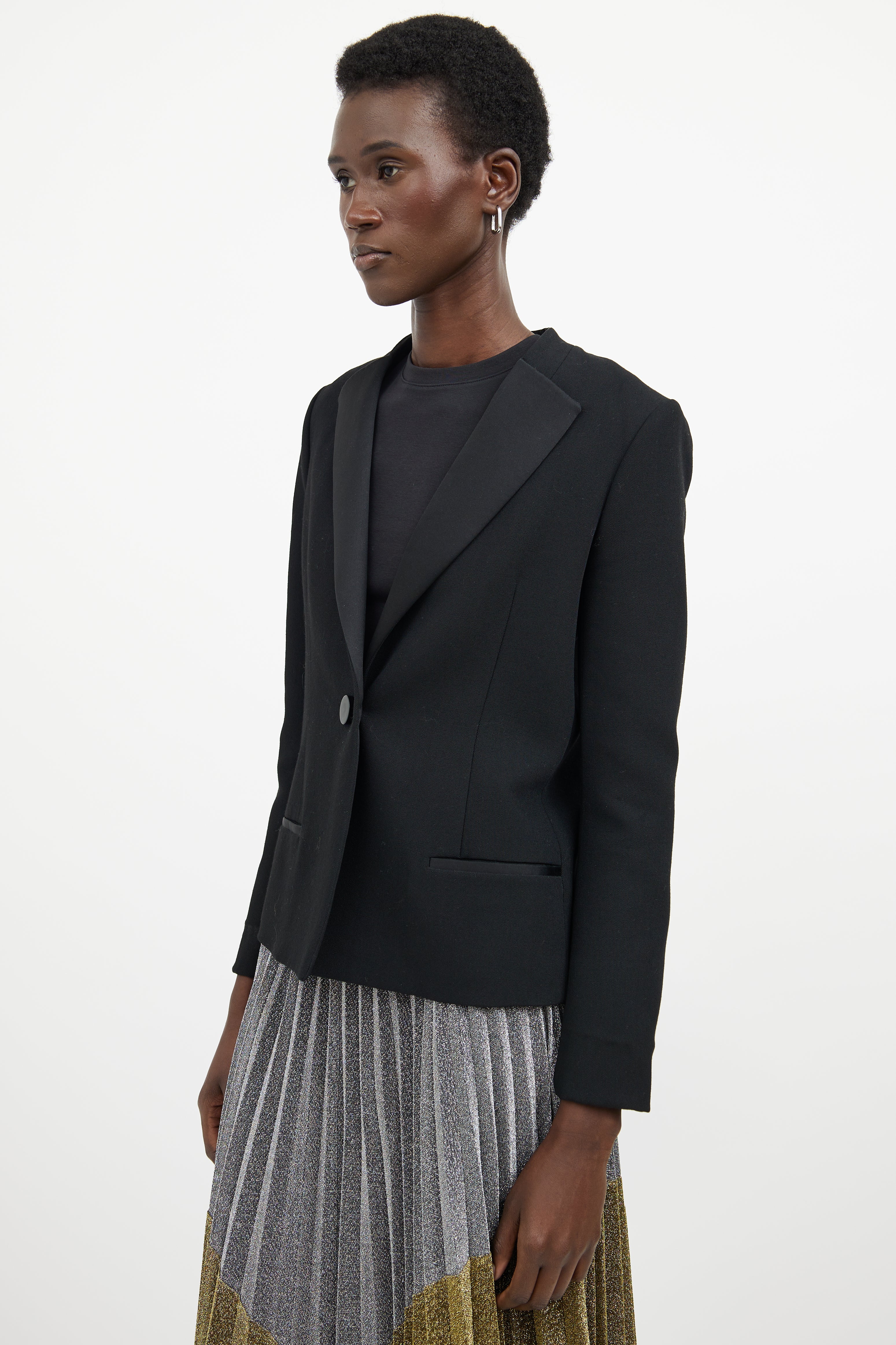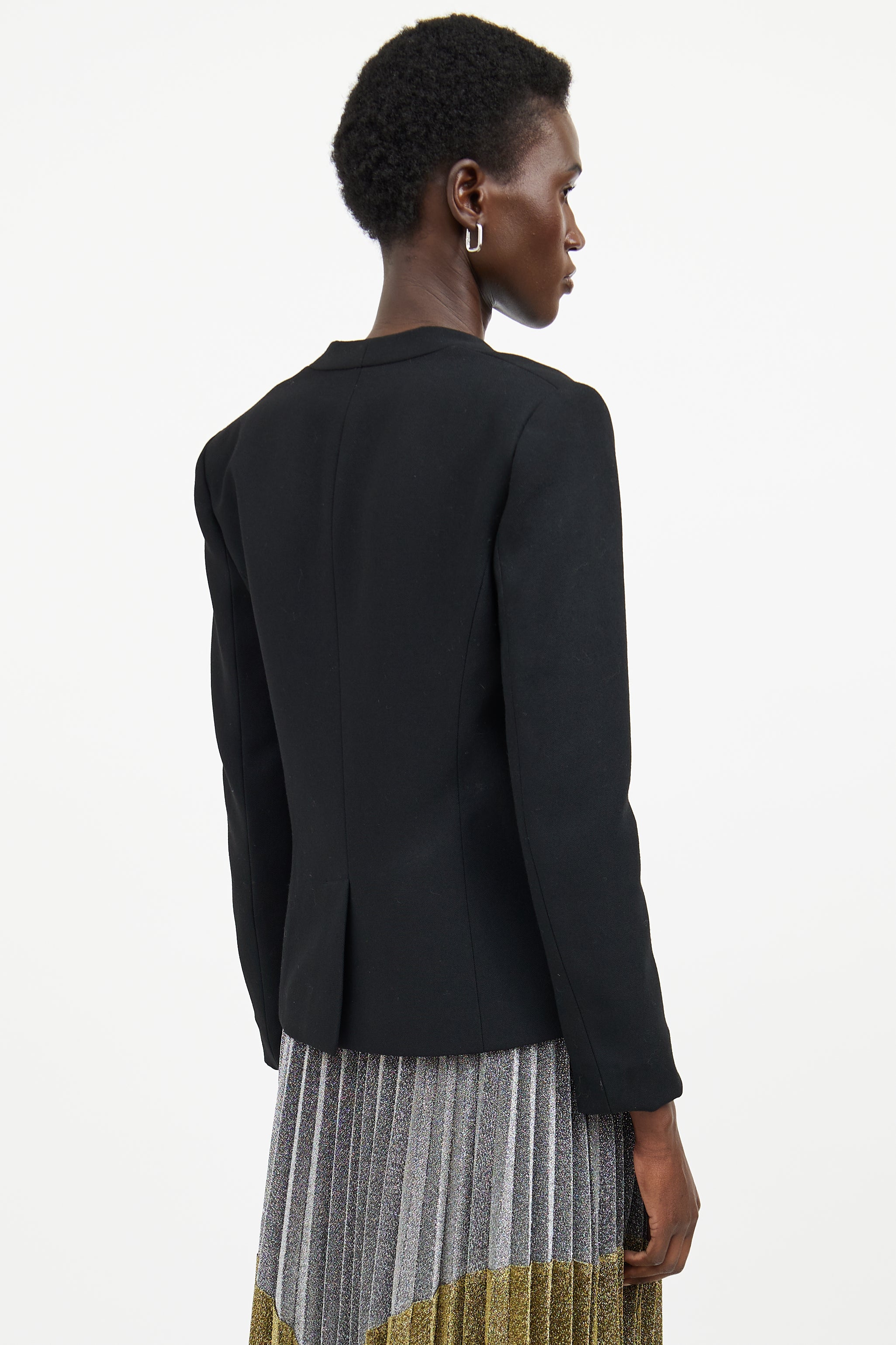 Pre-owned Balenciaga black long sleeve blazer featuring collar-less styling, padded shoulders, single button closure, dual slip pockets on waist and back vent.