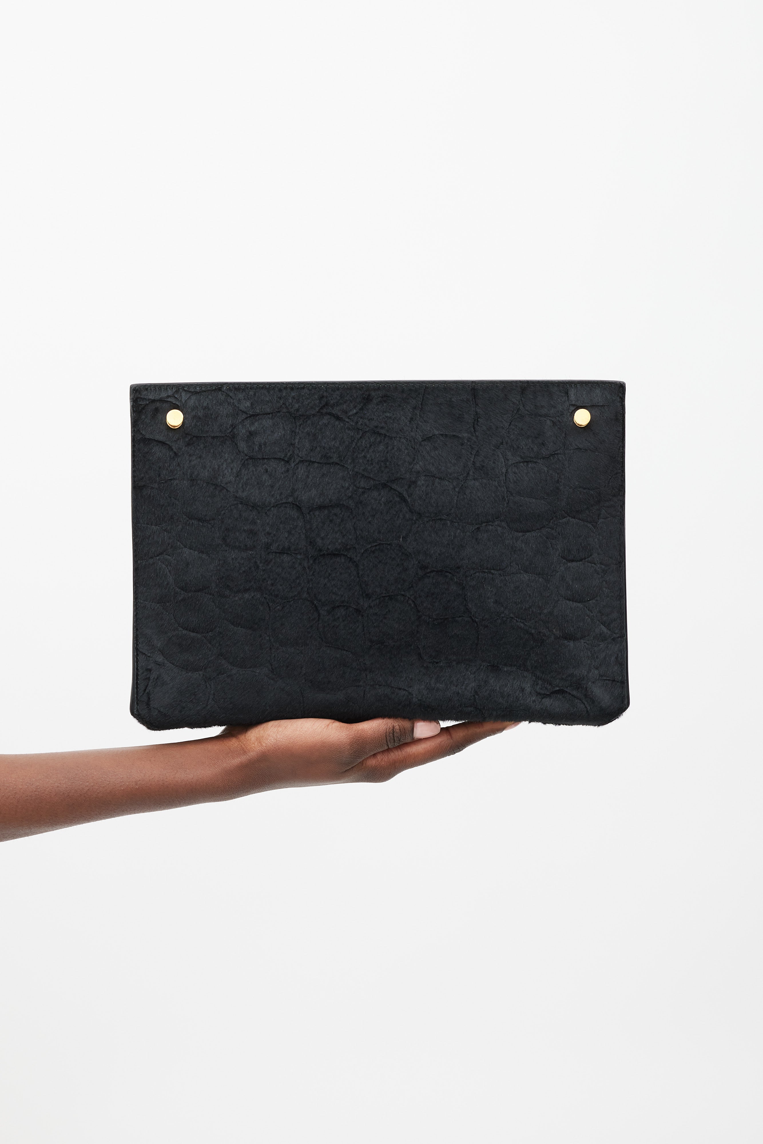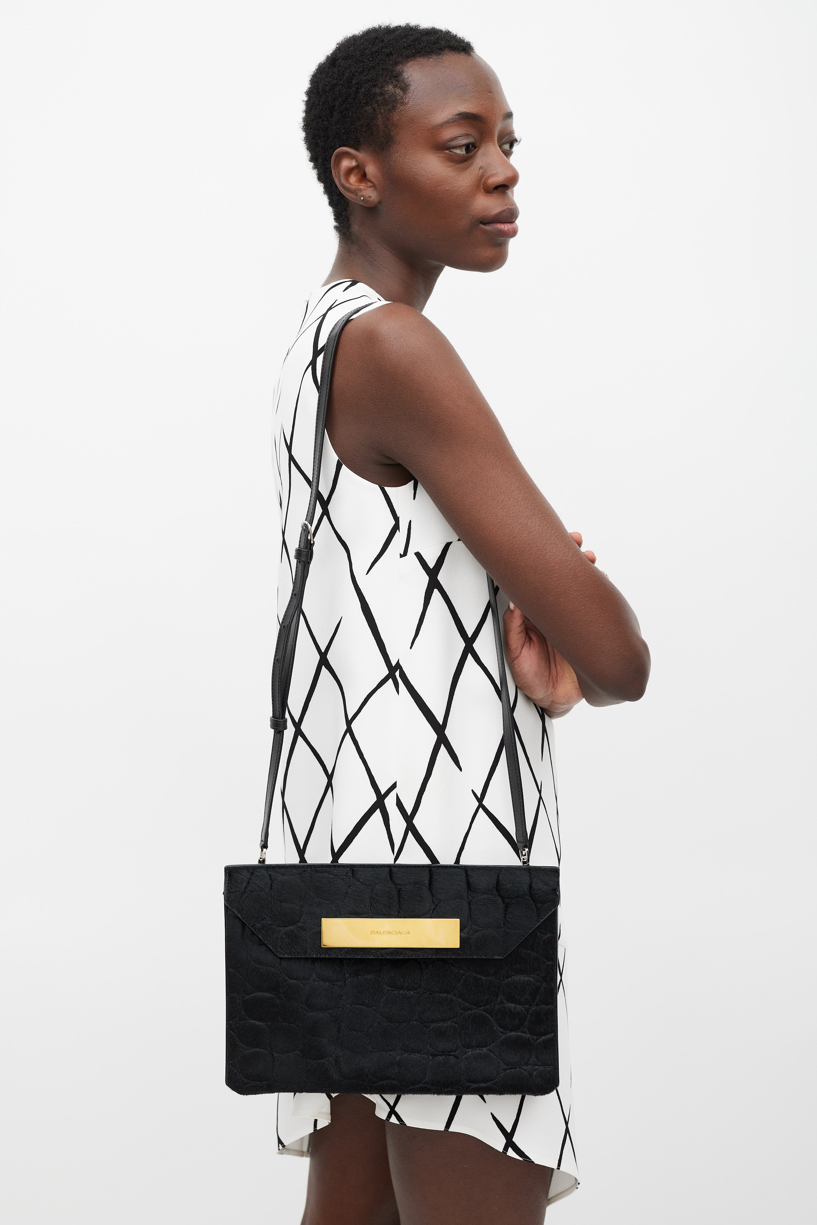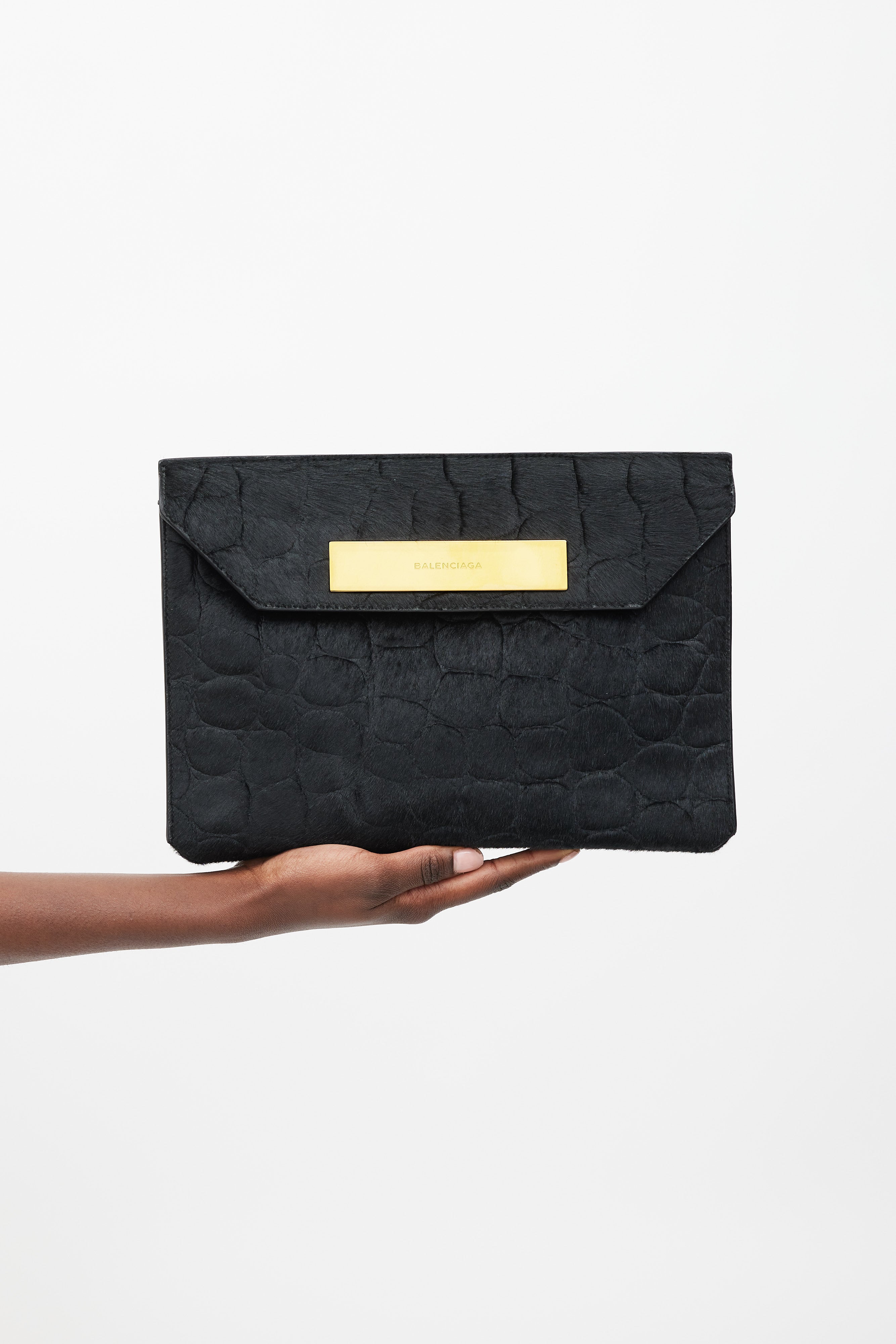 Pre-owned Balenciaga black embossed hair envelope clutch featuring front flap with debossed logo gold tone metal plate, push pin closure, one main compartment with single slip pocket and clochette, and adjustable and detachable shoulder strap.