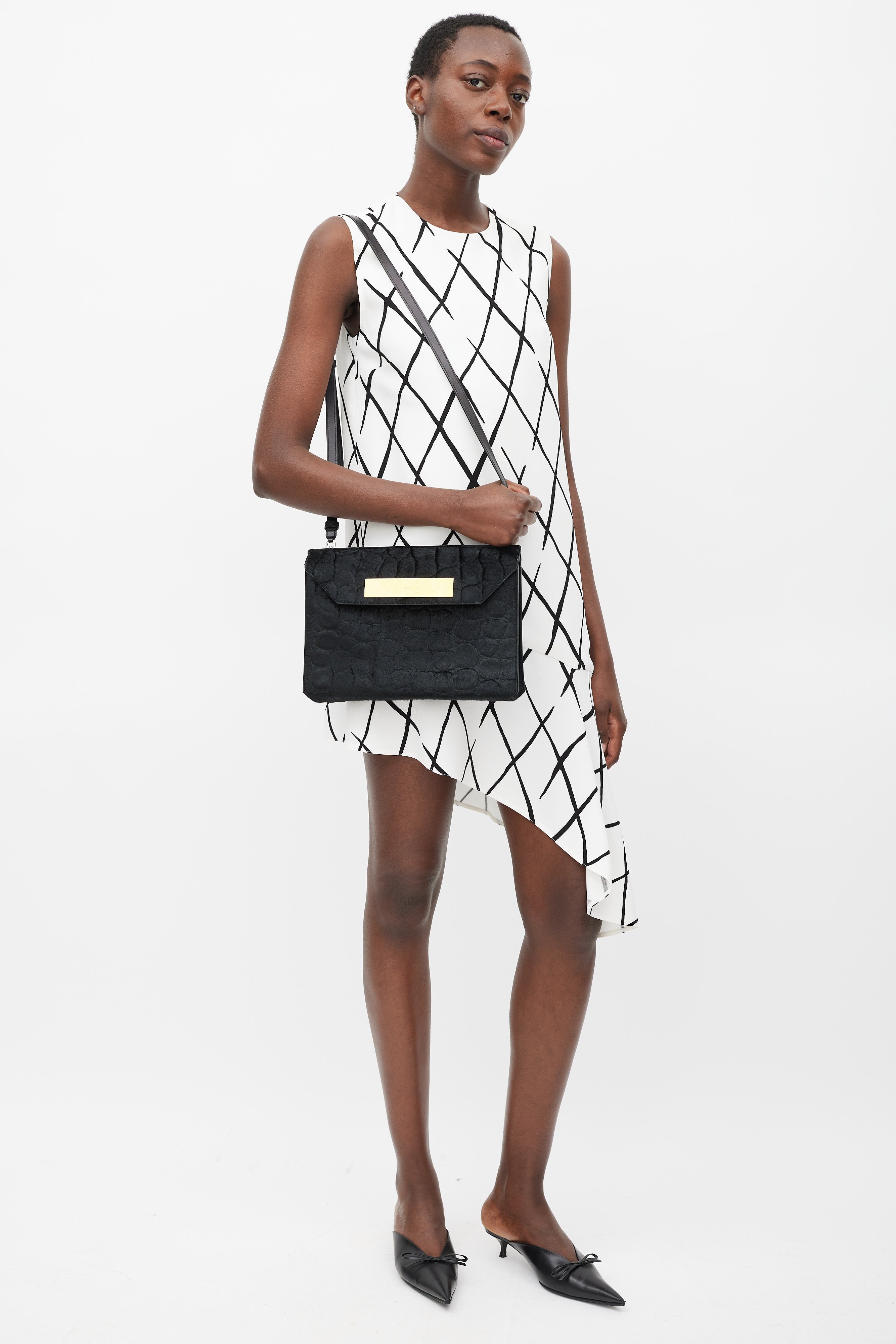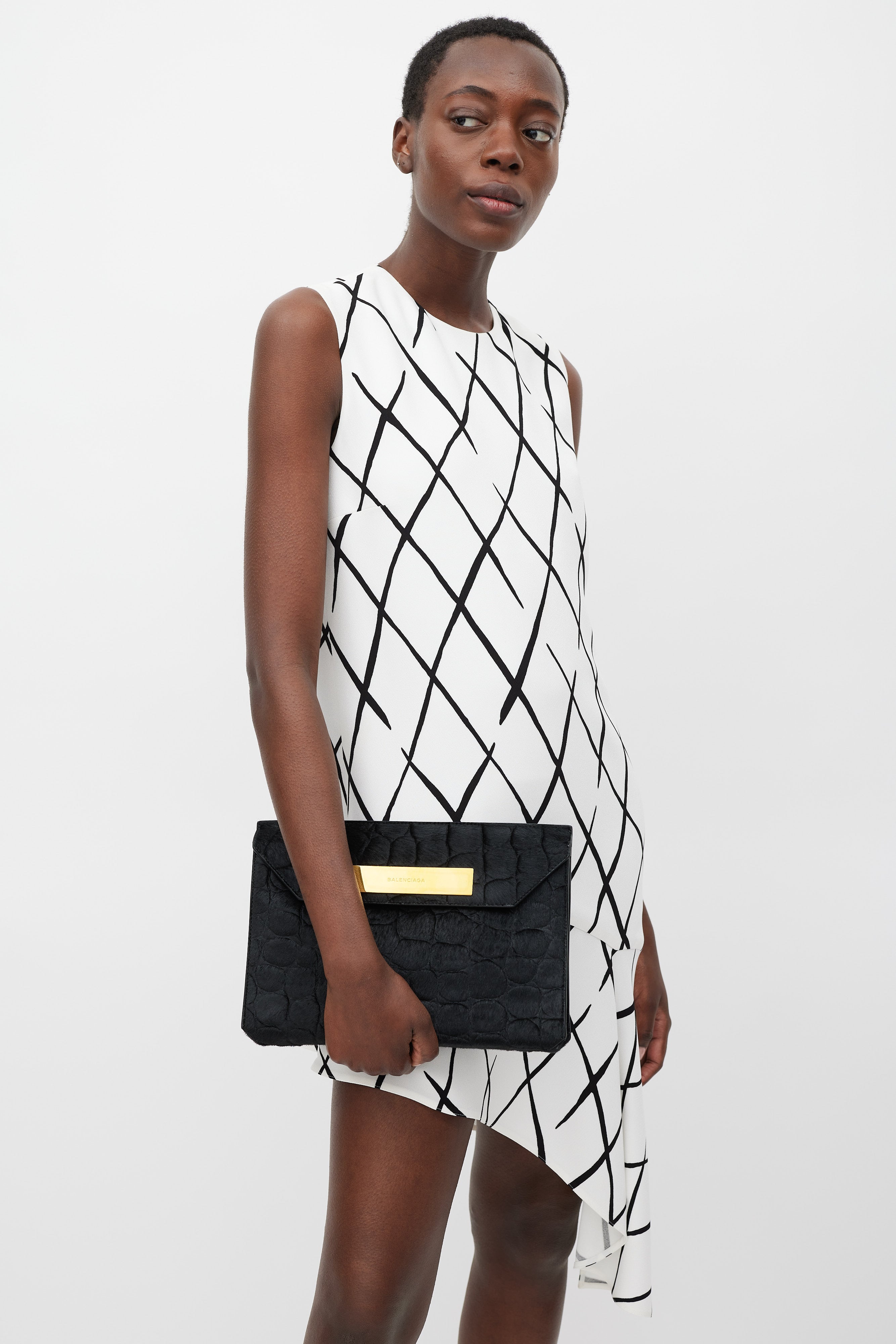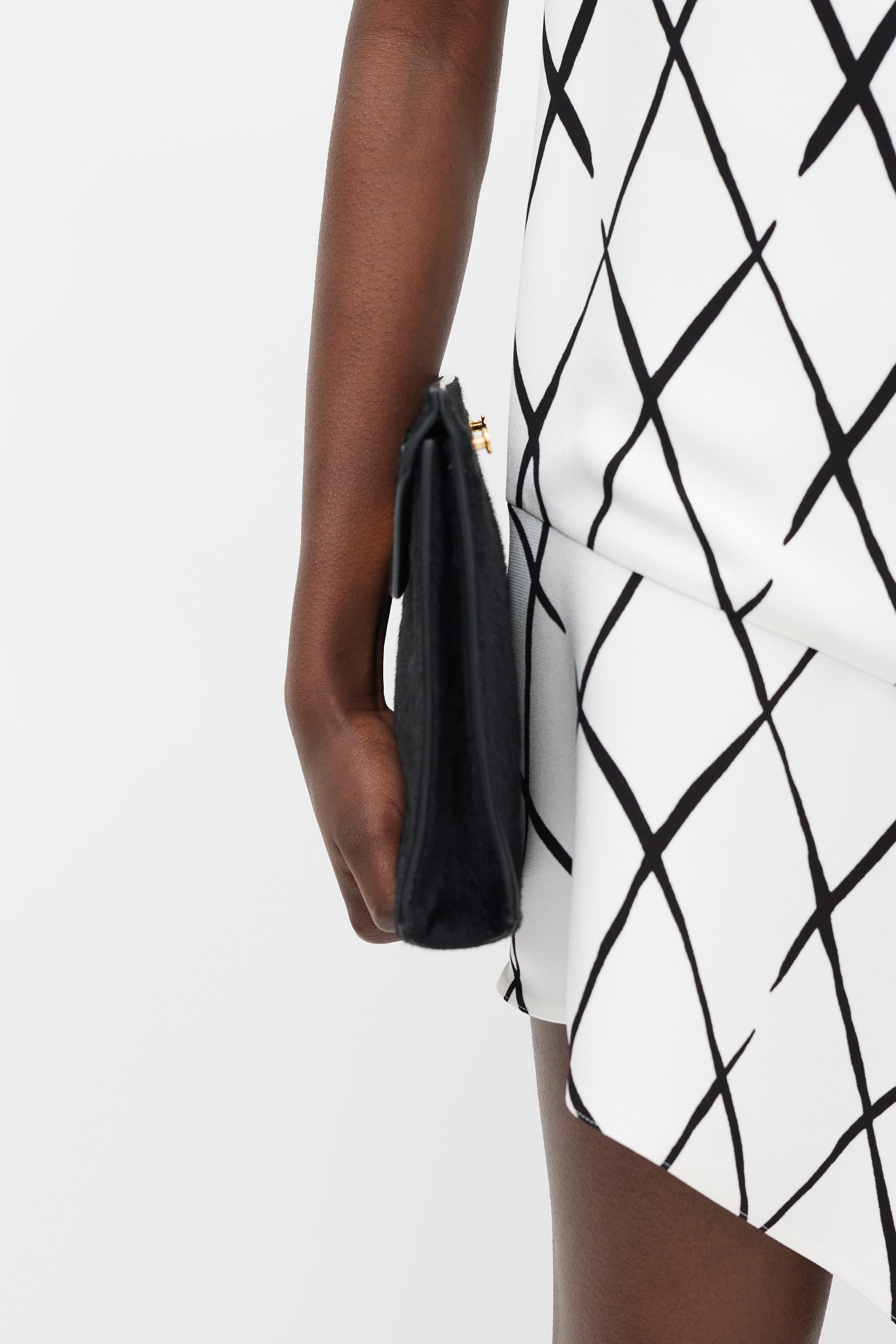 Pre-owned Balenciaga black embossed hair envelope clutch featuring front flap with debossed logo gold tone metal plate, push pin closure, one main compartment with single slip pocket and clochette, and adjustable and detachable shoulder strap.