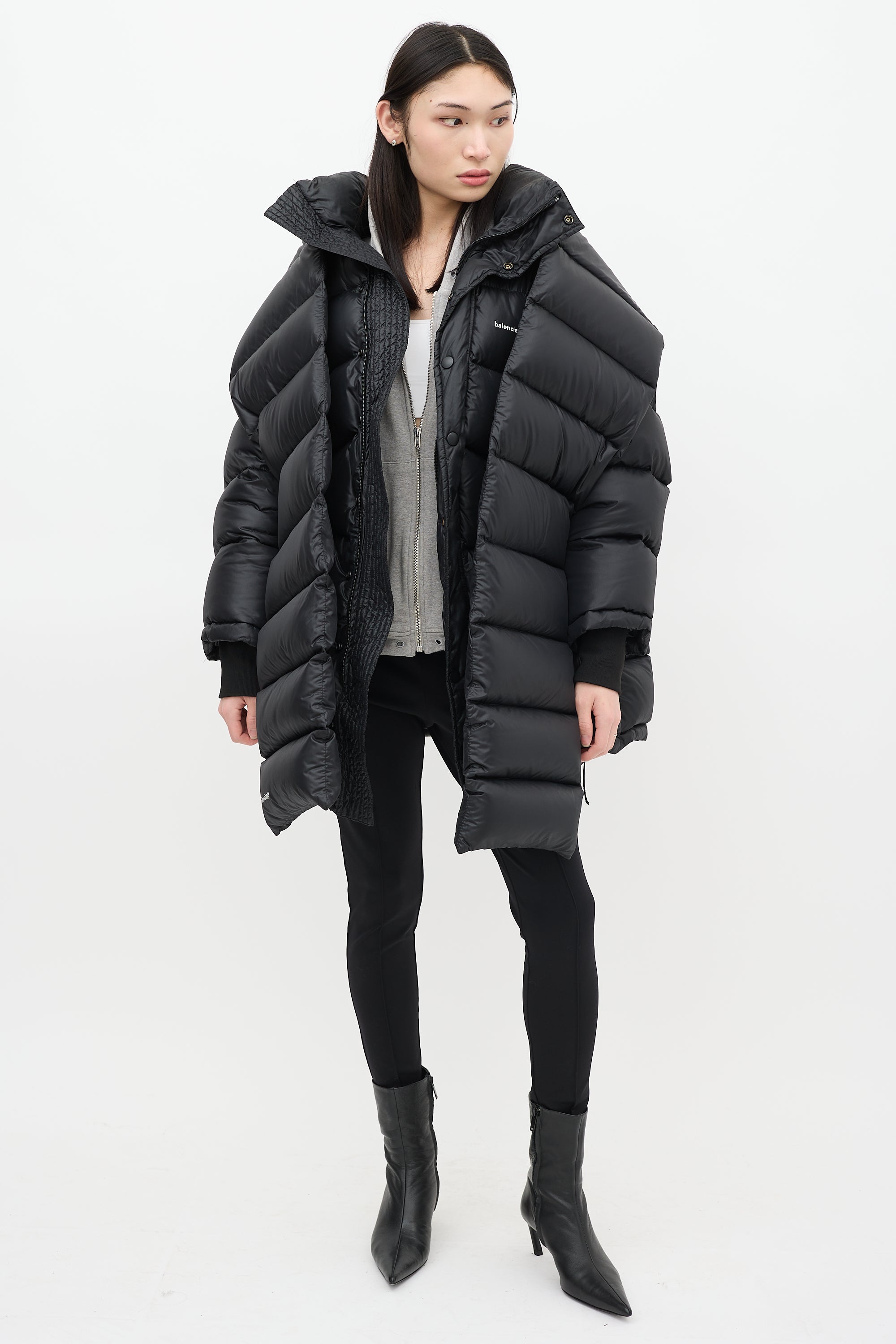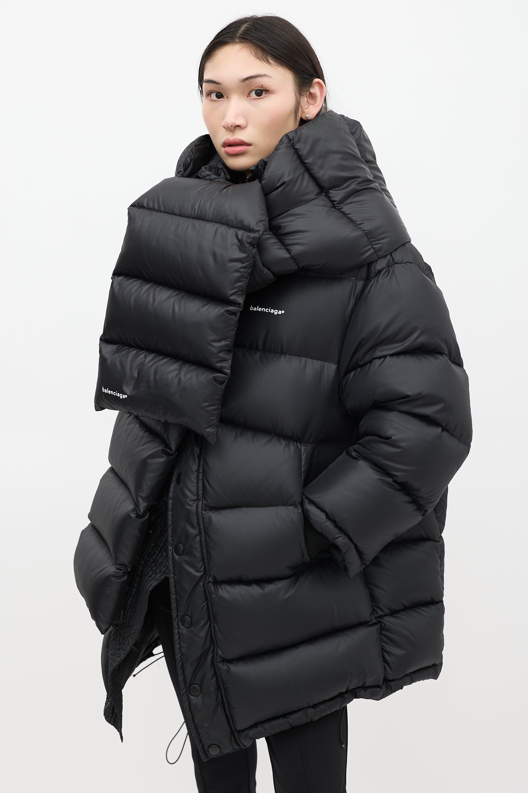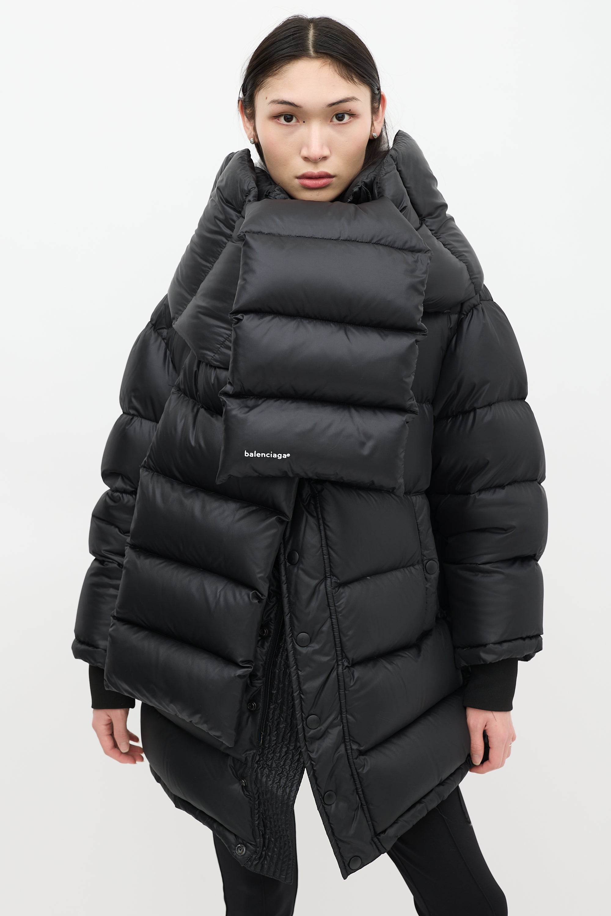 Pre-owned Balenciaga black quilted puffer coat featuring detachable padded scarf, funnel neck collar, stamped logo at left chest, long sleeves, ribbed knit cuffs, two slip pockets at waist, two interior pockets, drawstring hem, and zip up front. Lined.