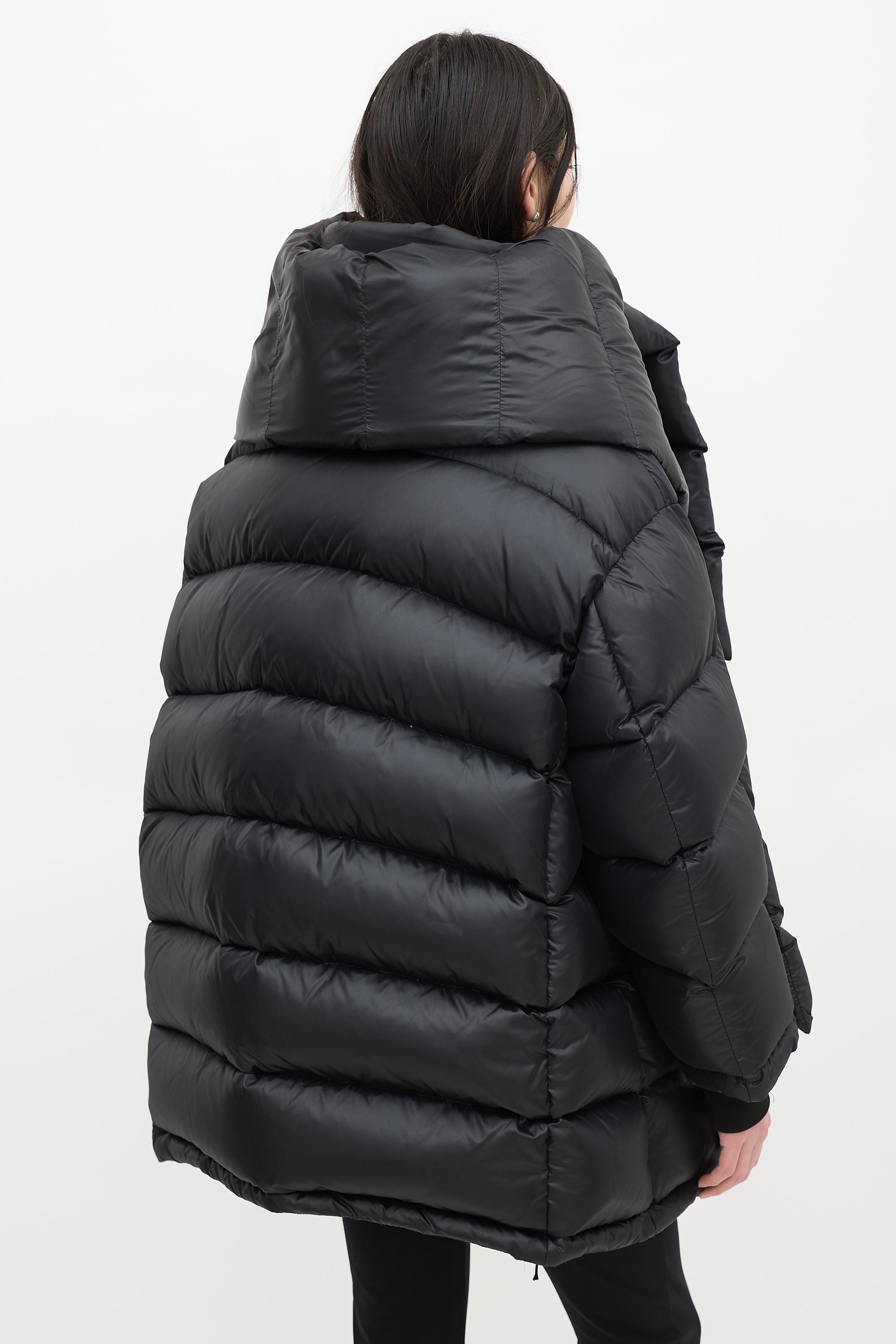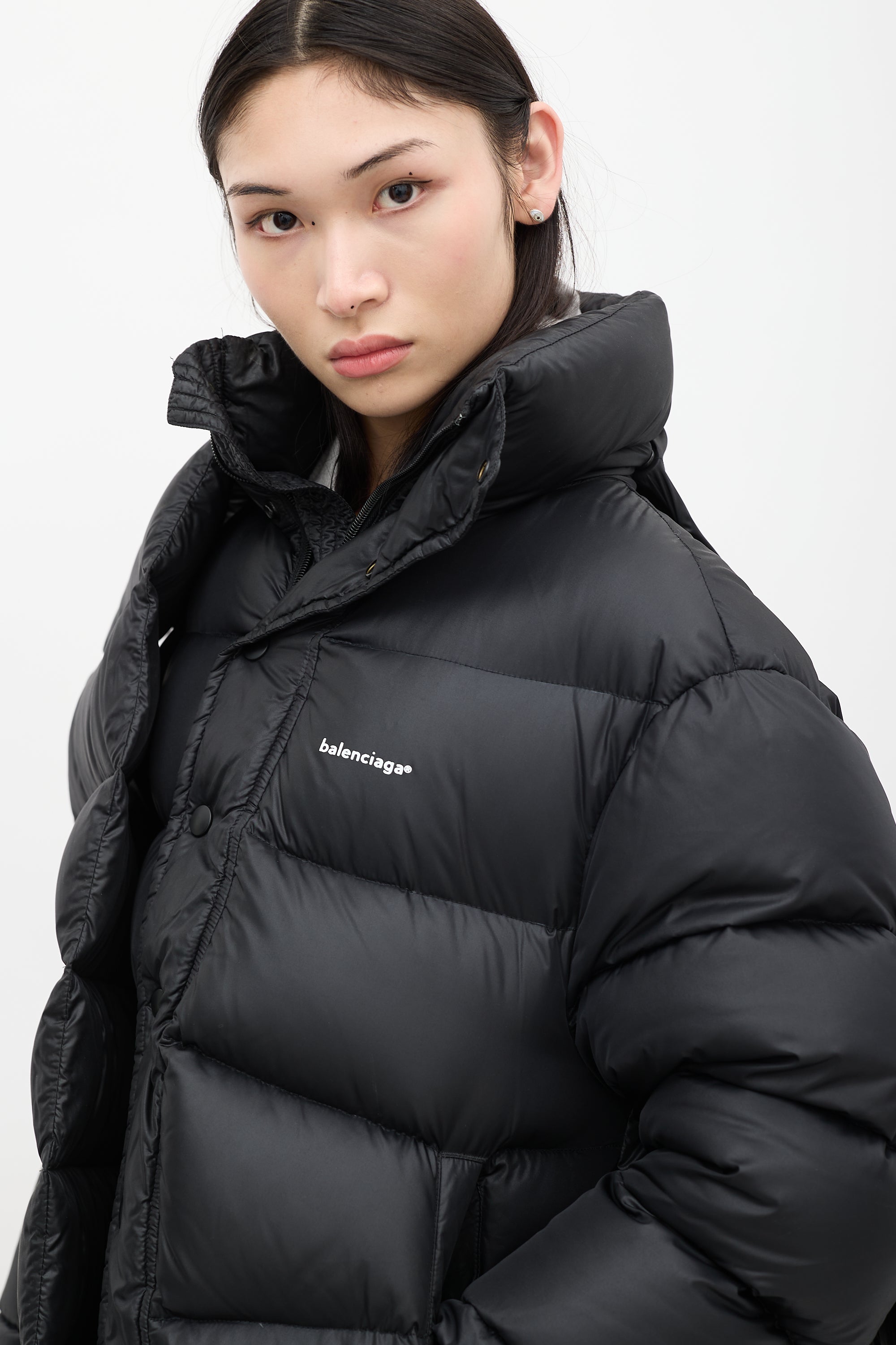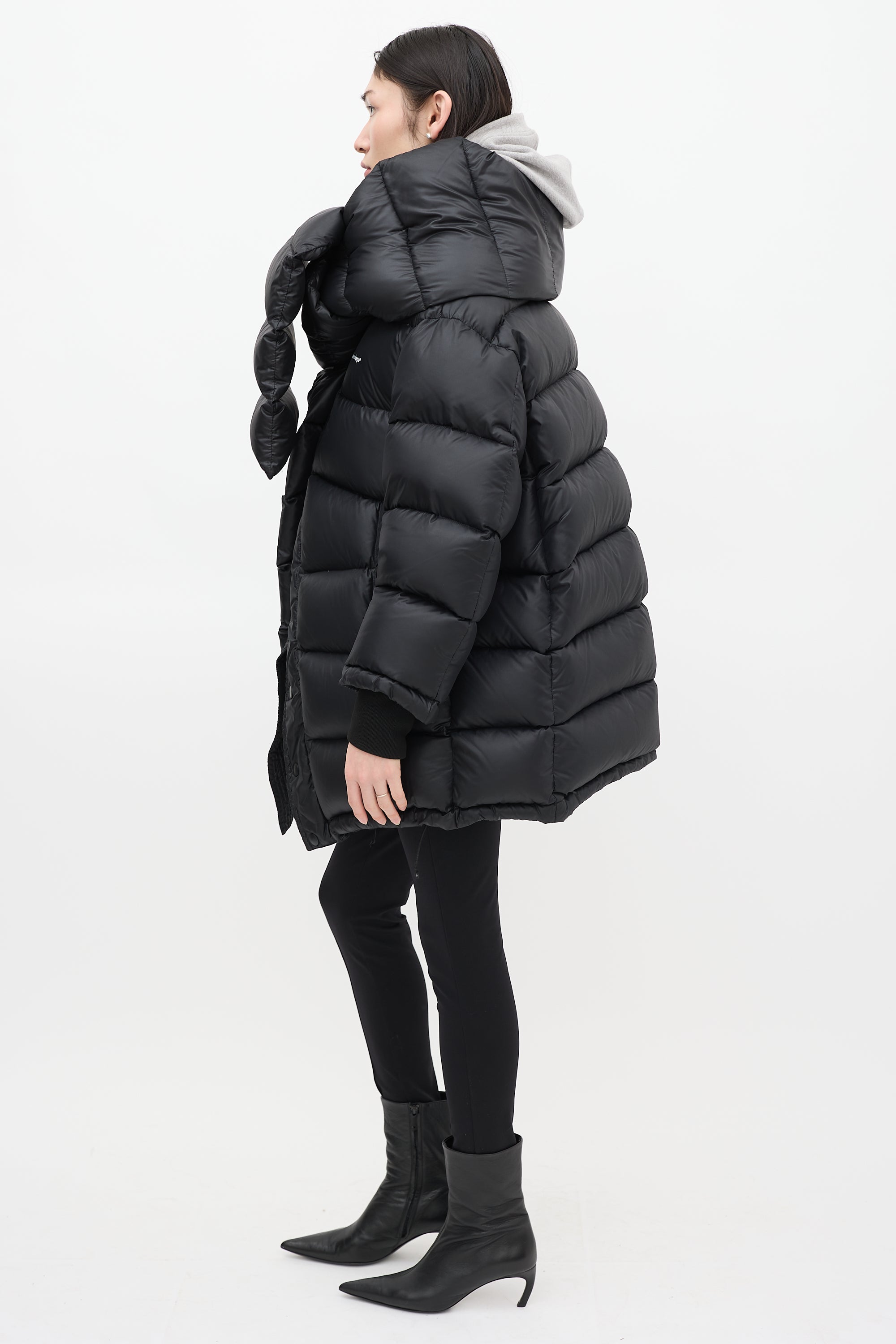 Pre-owned Balenciaga black quilted puffer coat featuring detachable padded scarf, funnel neck collar, stamped logo at left chest, long sleeves, ribbed knit cuffs, two slip pockets at waist, two interior pockets, drawstring hem, and zip up front. Lined.