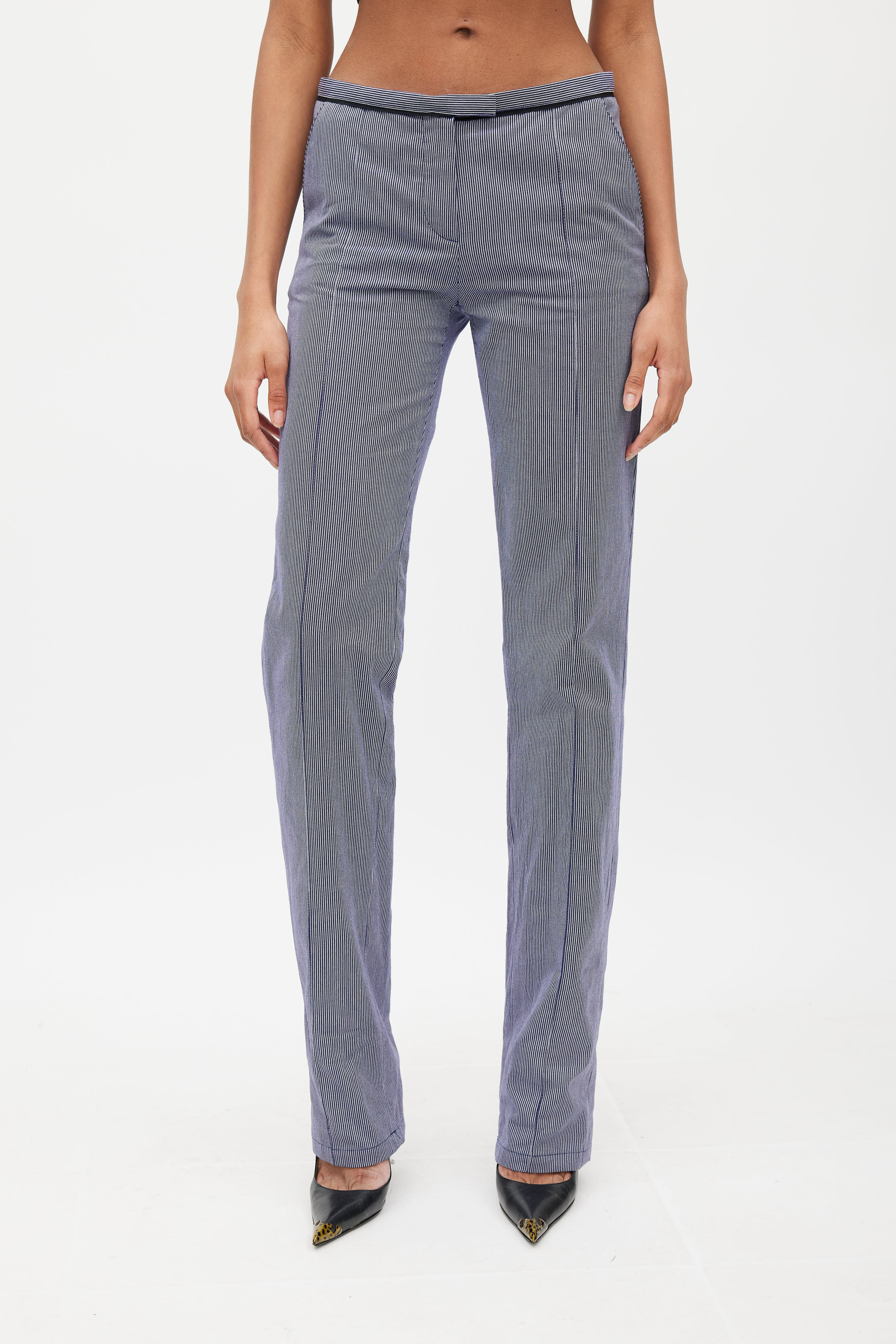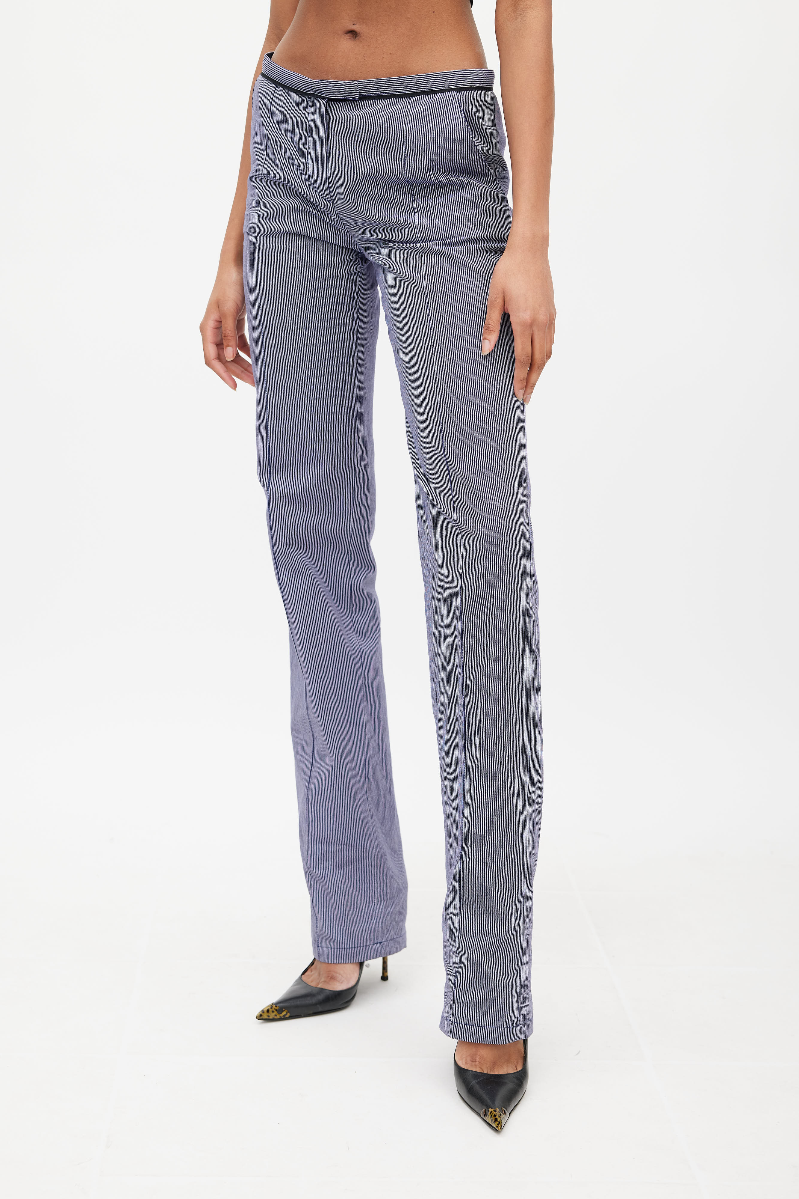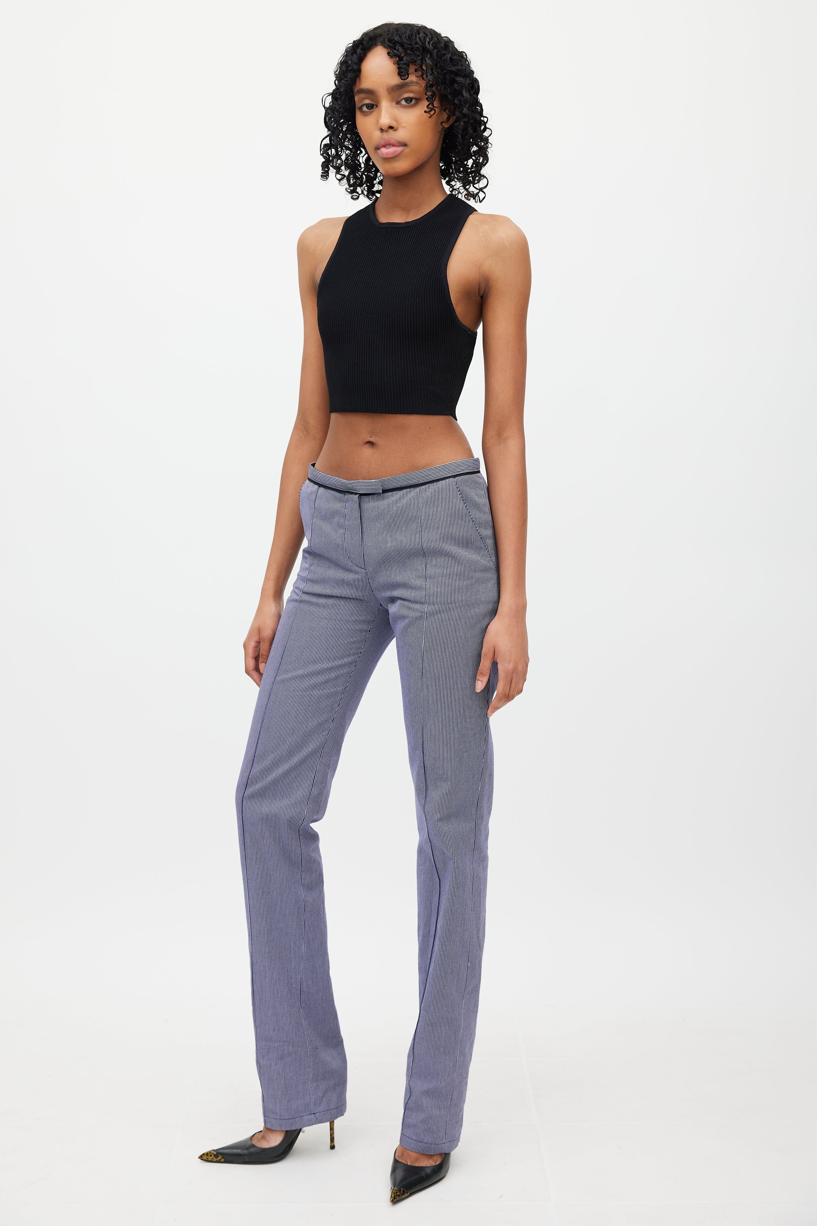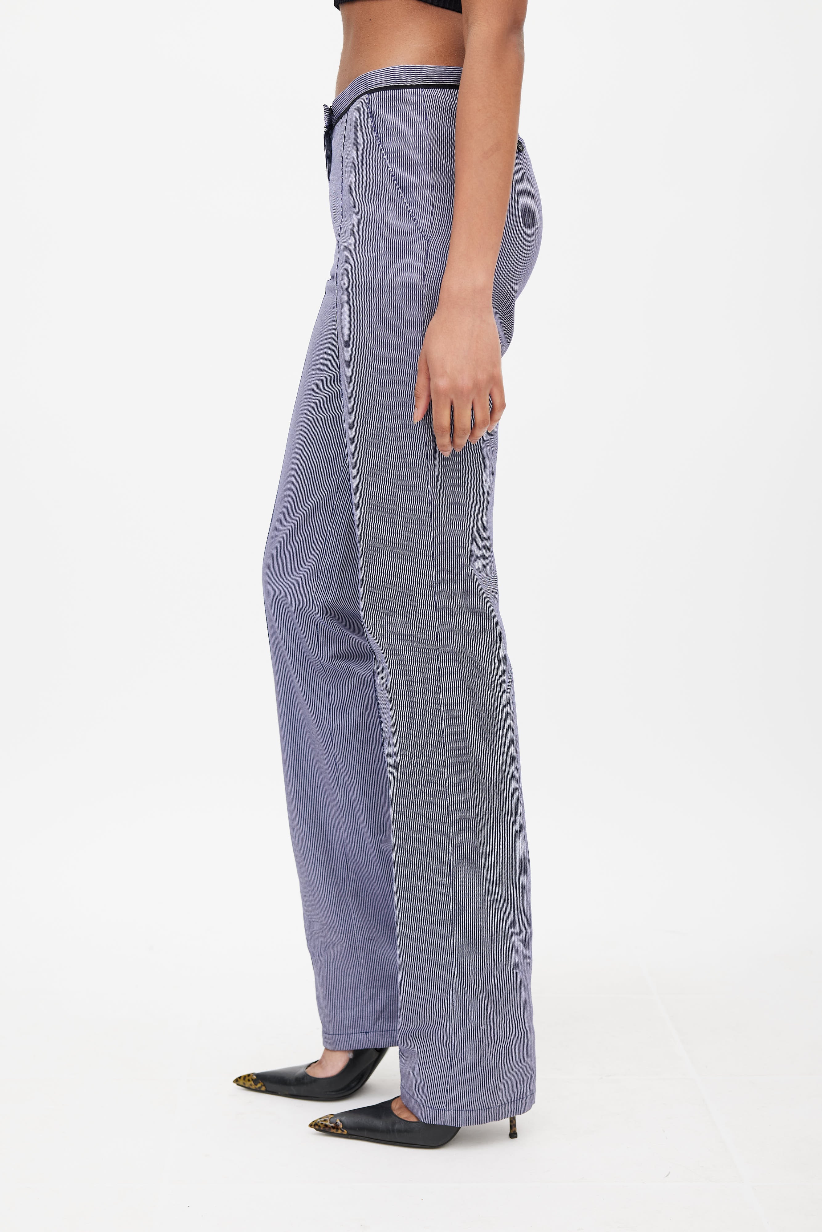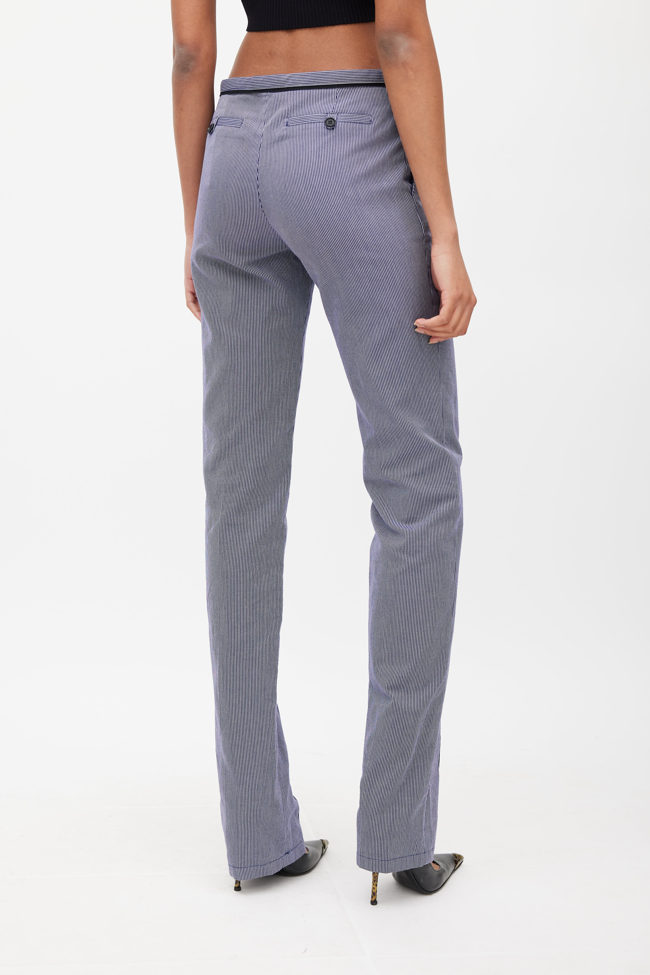 Pre-owned Balenciaga Pant blue and white trousers featuring low rise, zip fly, two slash pockets at hips, two buttoned pockets at back, and pinstripe. Nicolas Ghesquiere era design. Clipped to fit model.