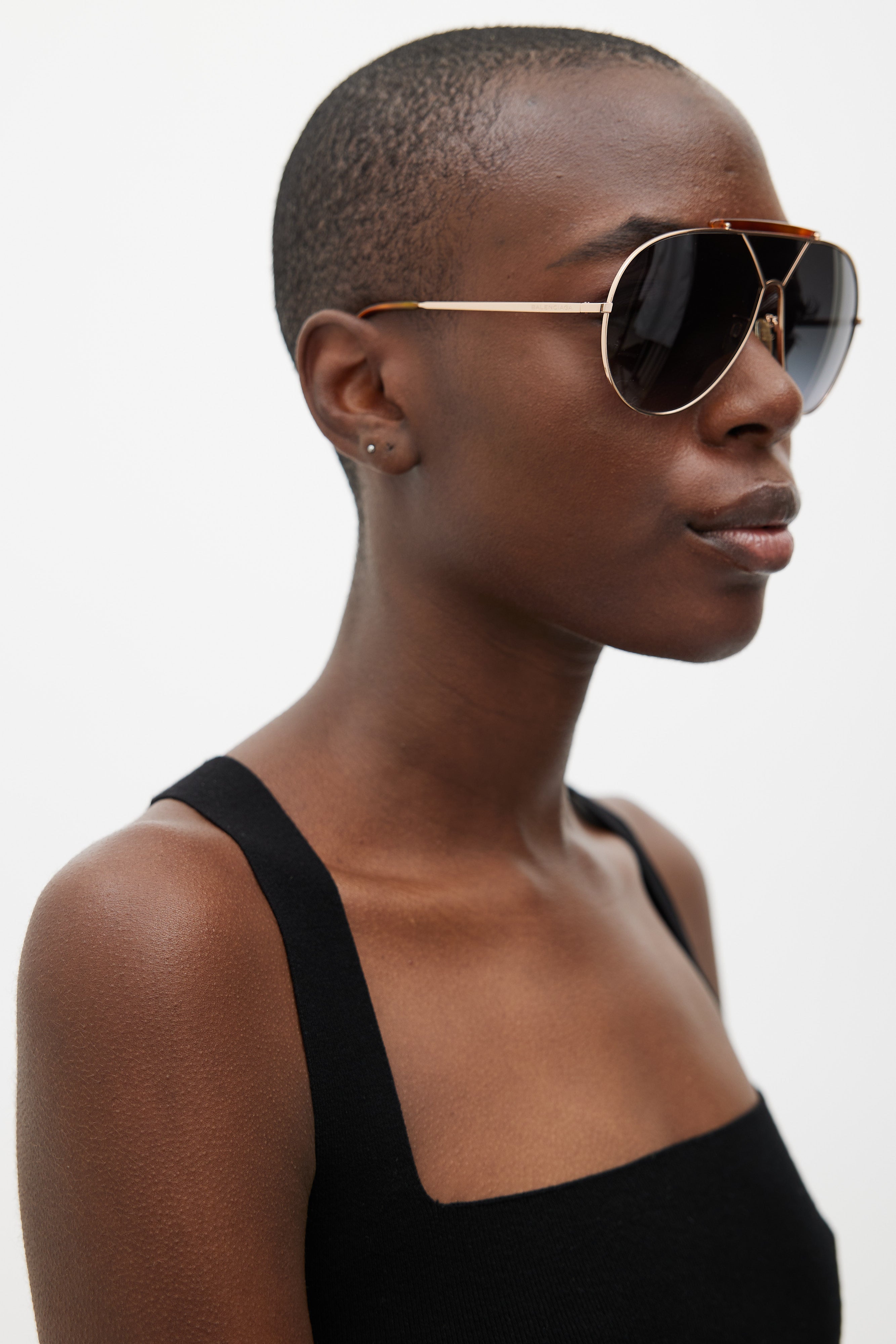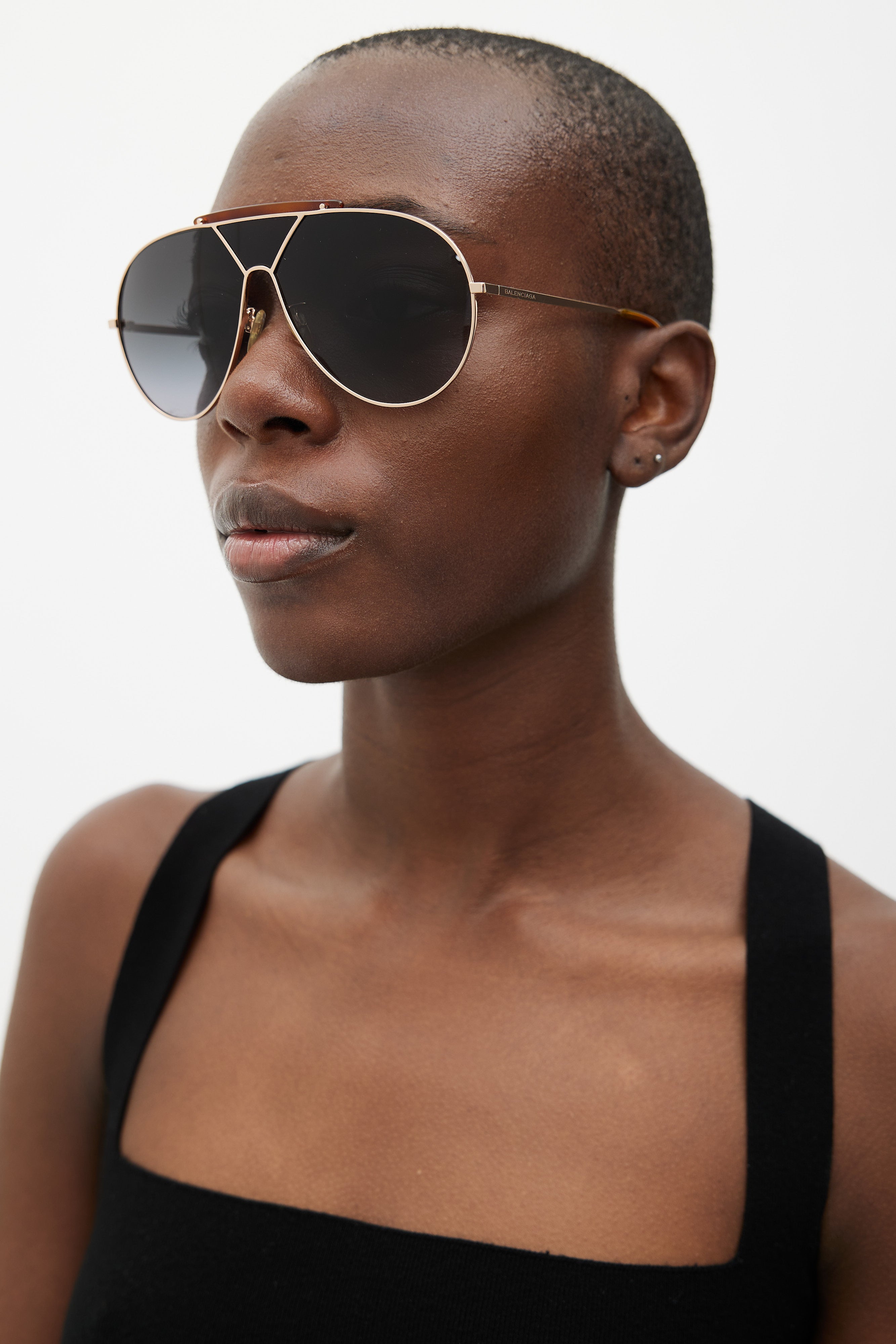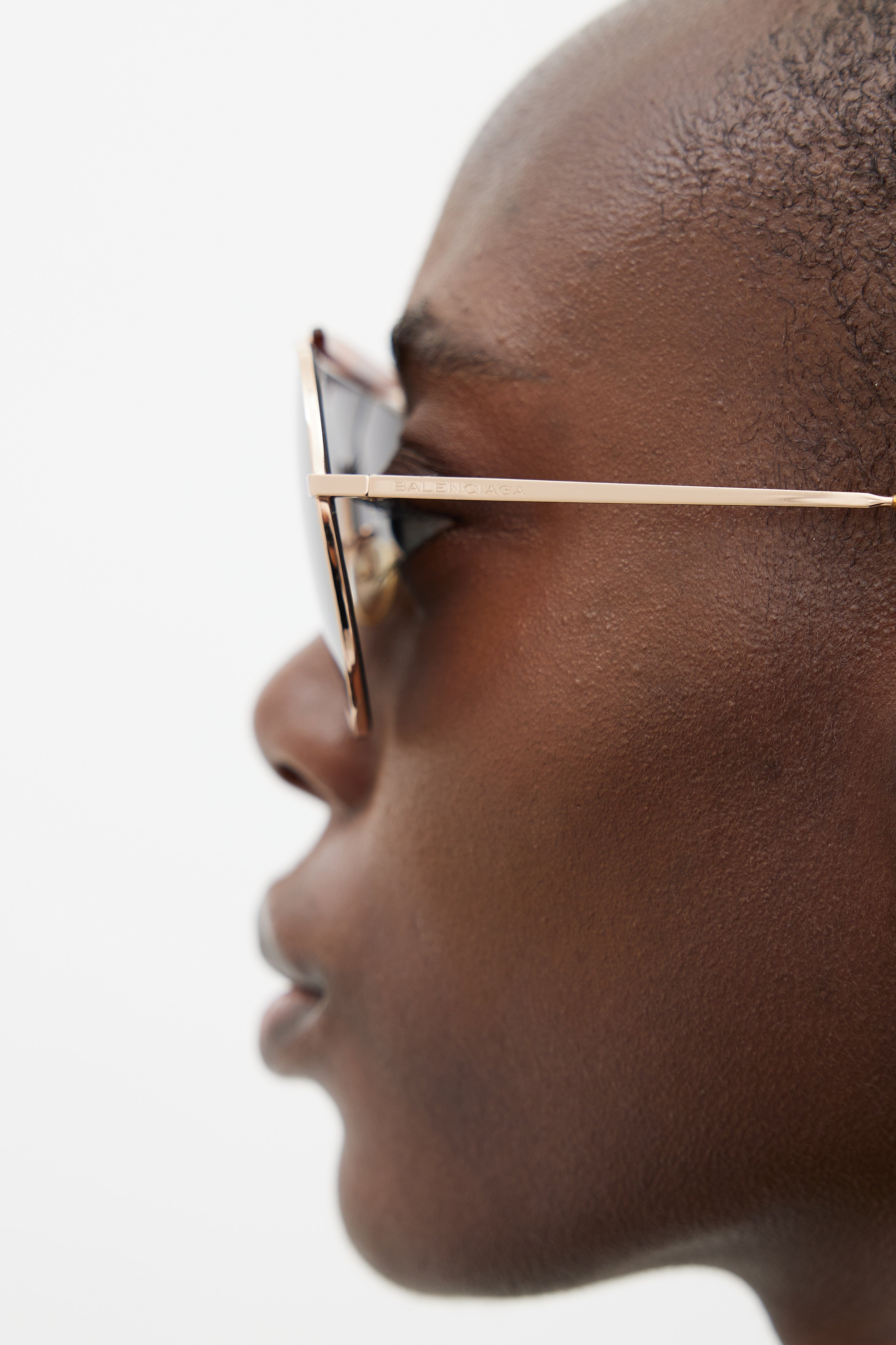 Pre-owned Balenciaga brown BA31 28B sunglasses featuring aviator frame, gold tone hardware, nose pads, lens detail at brow bar, and engraved logo at temple. Comes with original pouch.