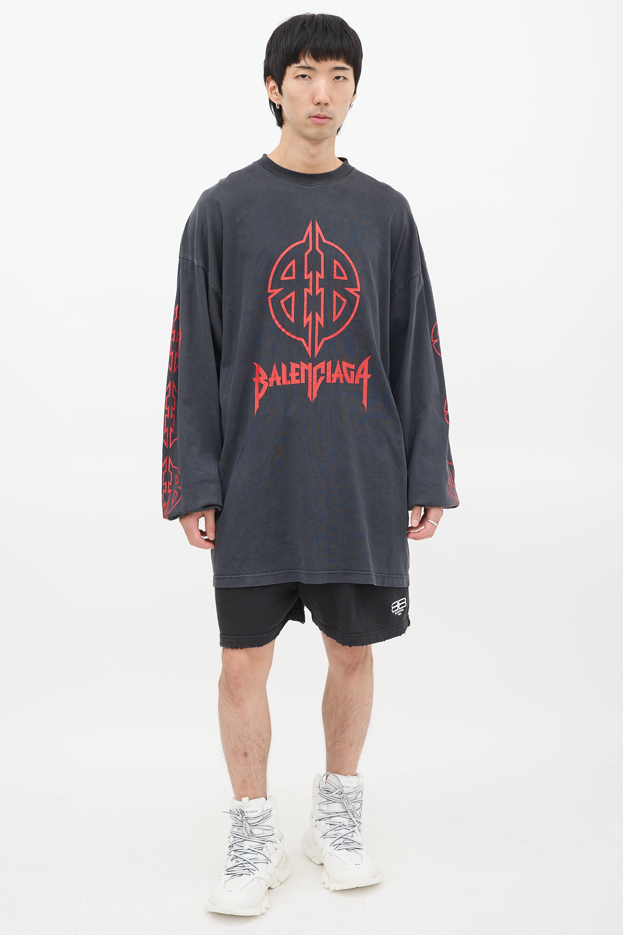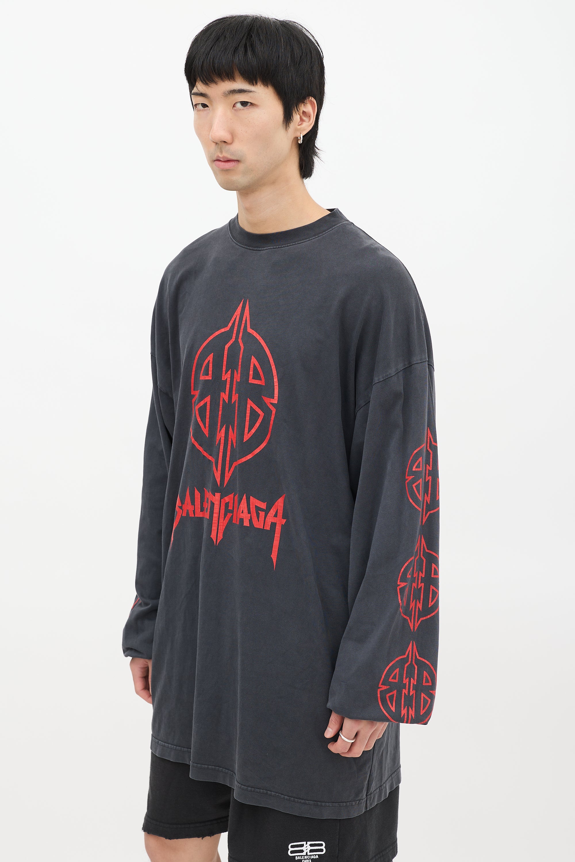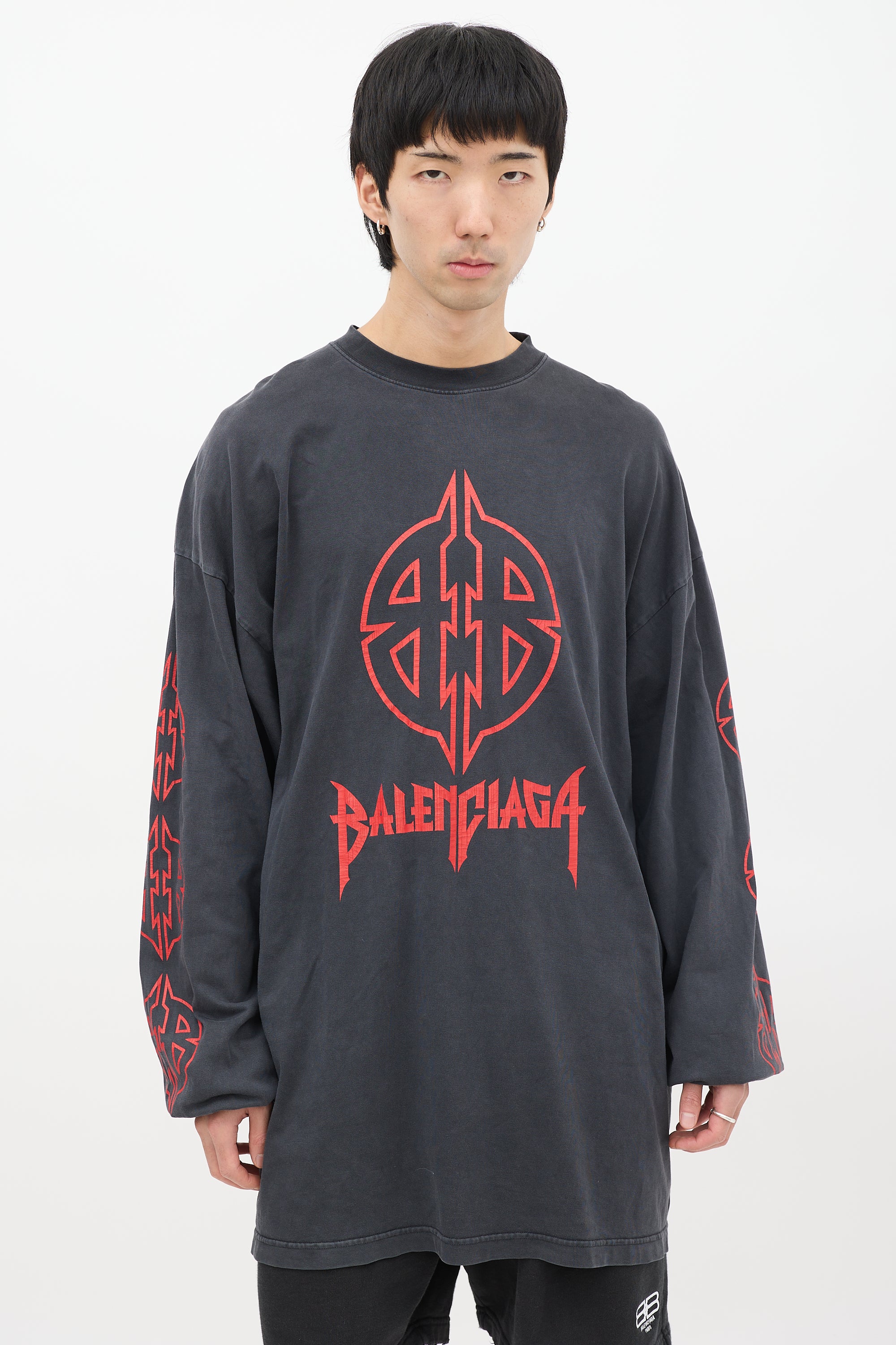 Pre-owned Balenciaga dark grey T-shirt featuring a round neckline, long cut, even hem, dropped shoulders, long sleeves with ribbed cuffs, and red BB Metal motif graphic printed at front, back, and sleeves.
