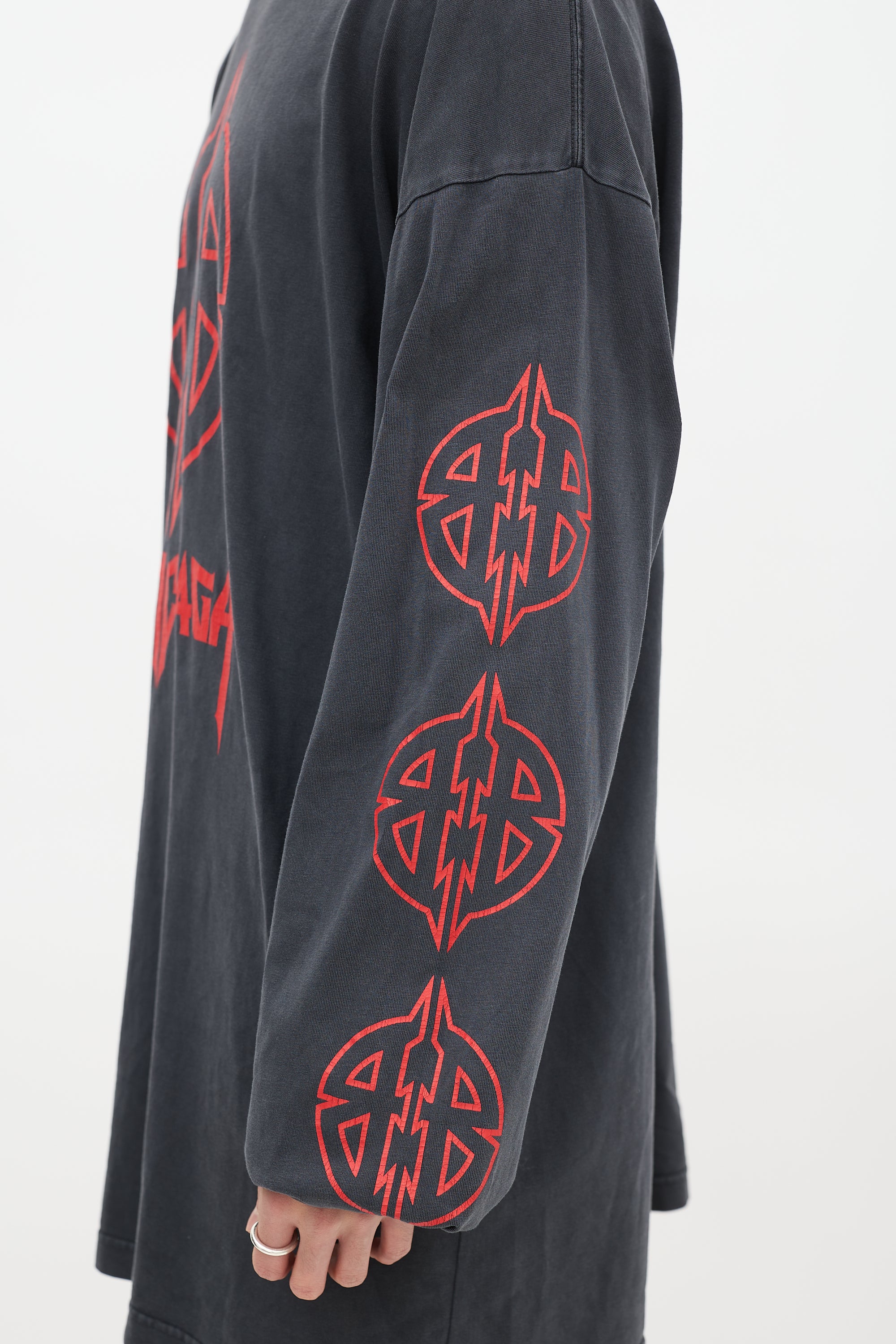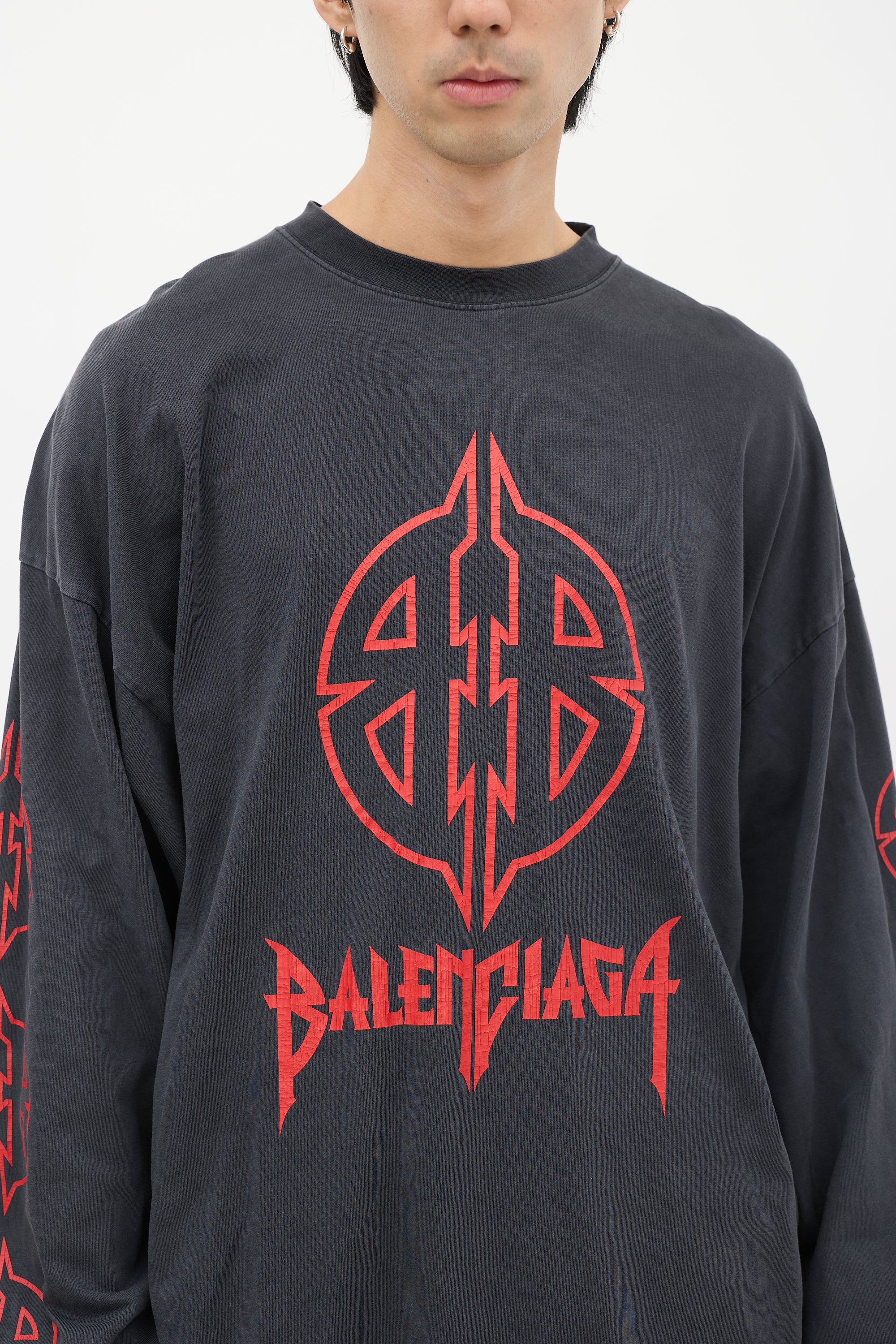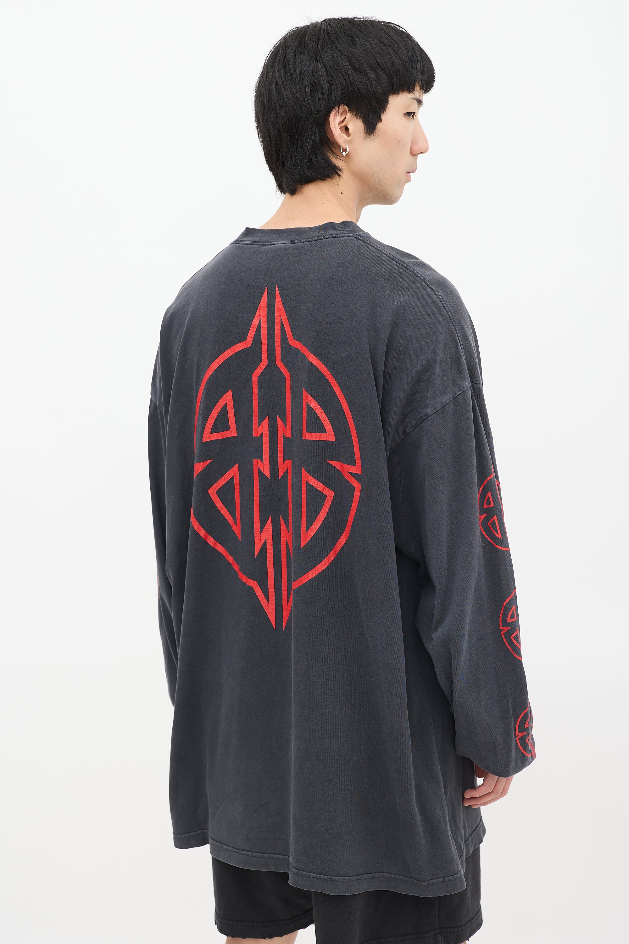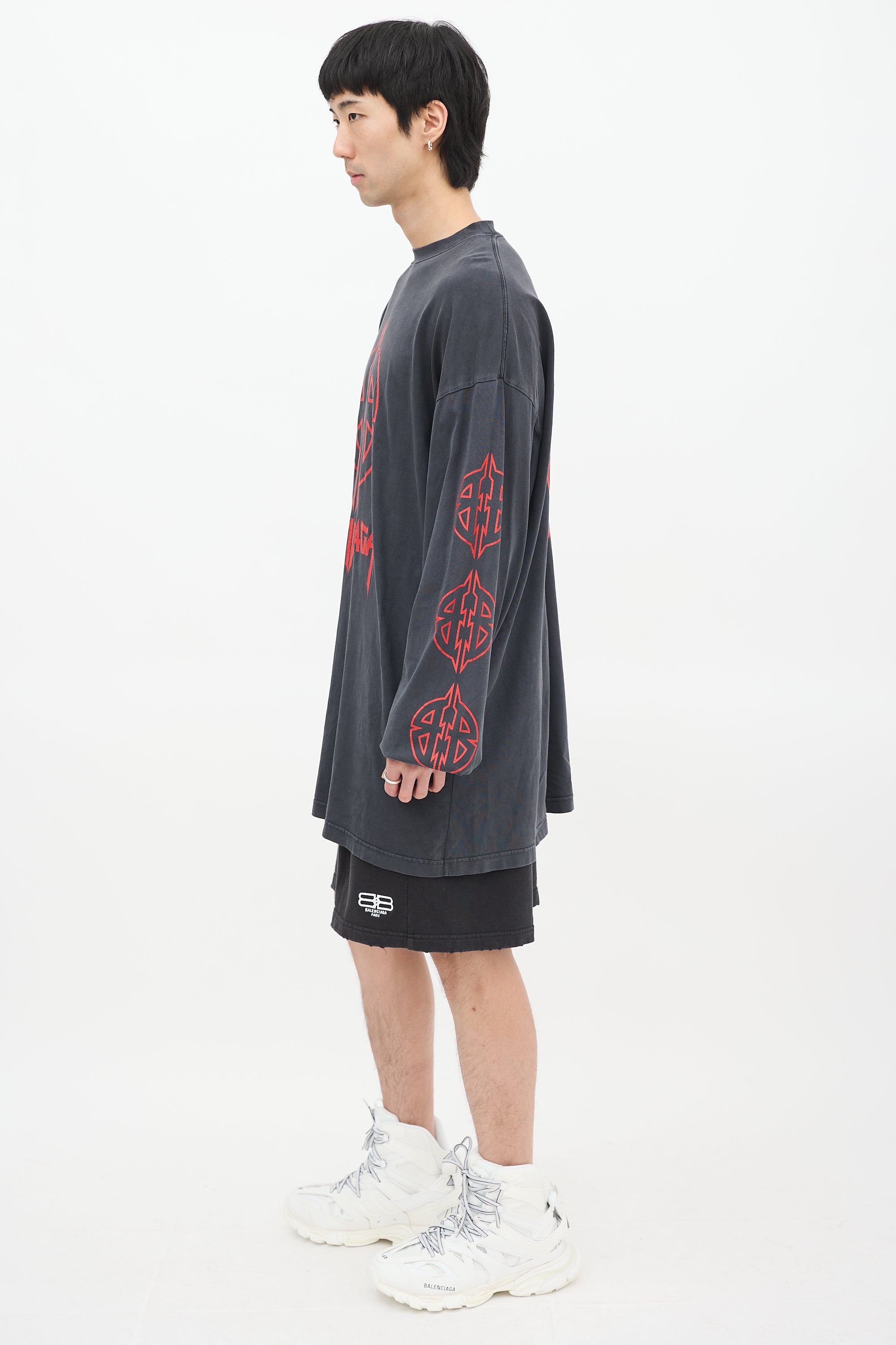 Pre-owned Balenciaga dark grey T-shirt featuring a round neckline, long cut, even hem, dropped shoulders, long sleeves with ribbed cuffs, and red BB Metal motif graphic printed at front, back, and sleeves.