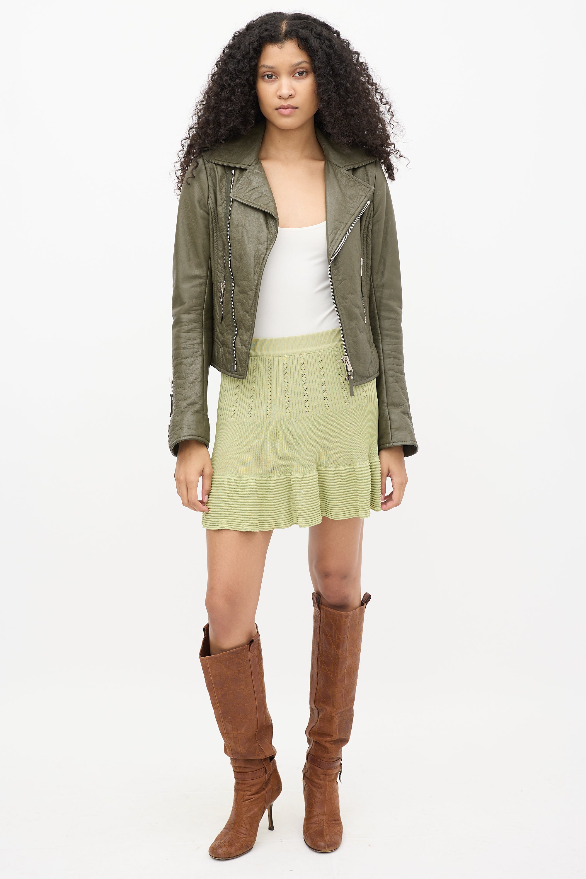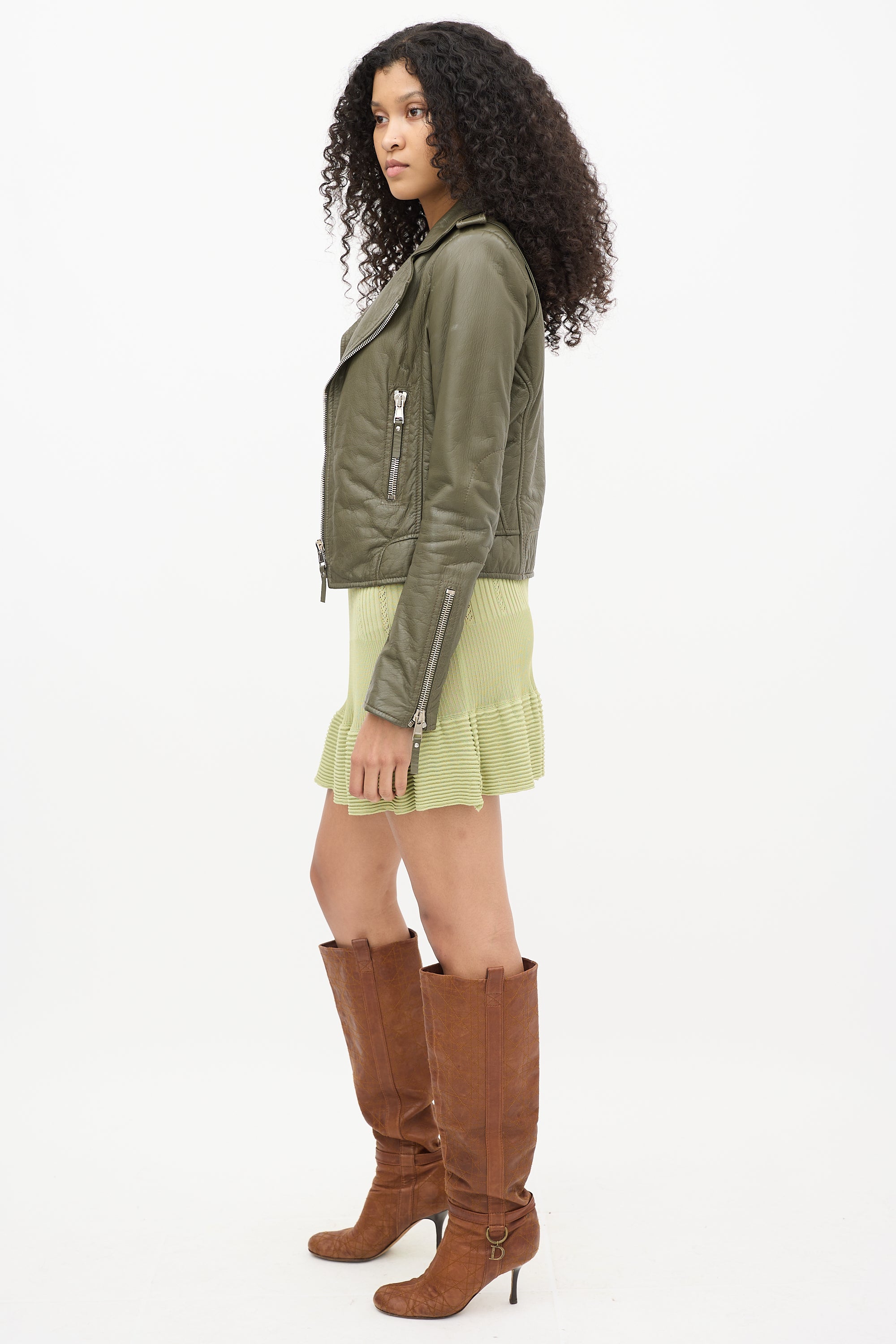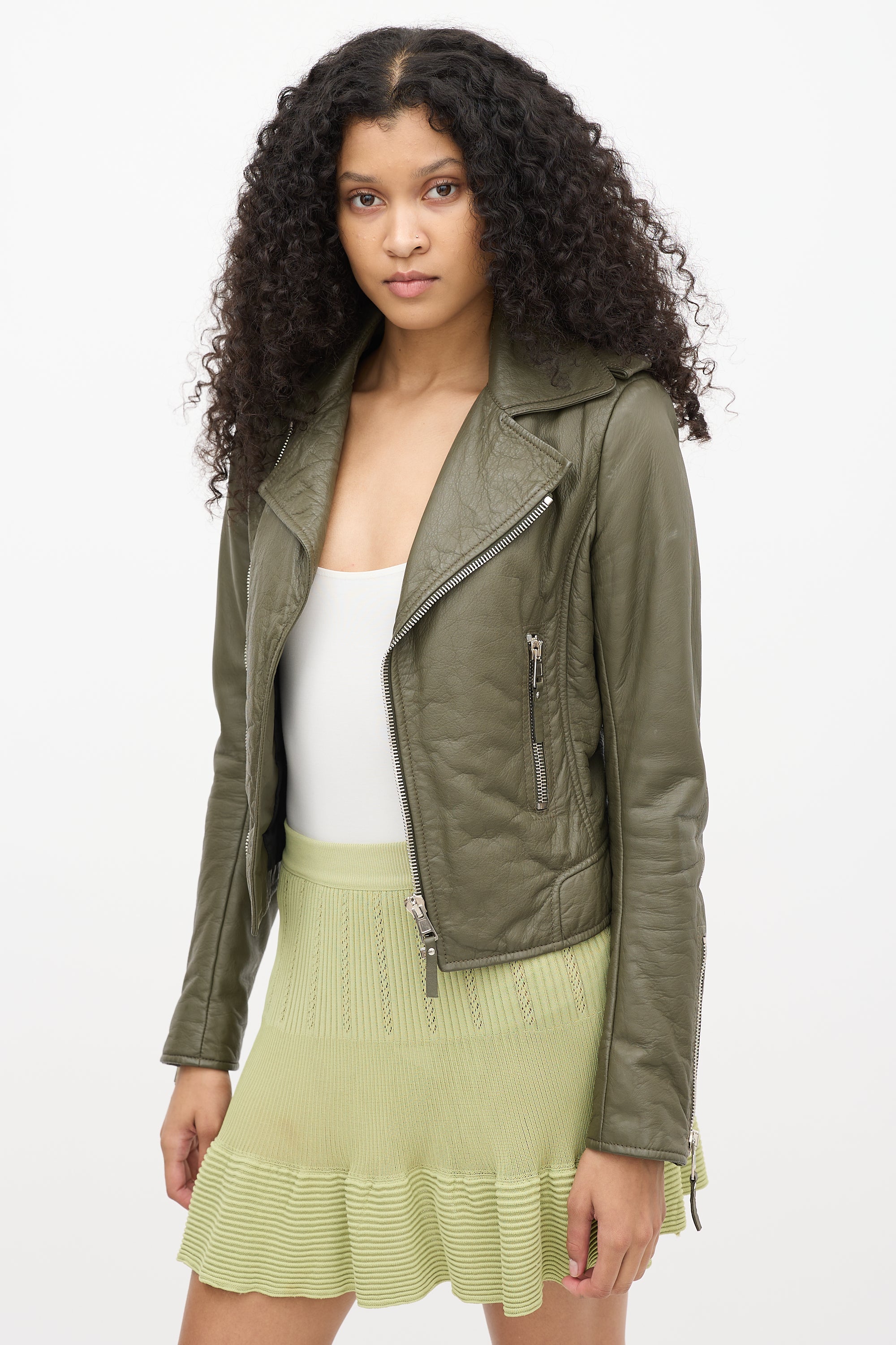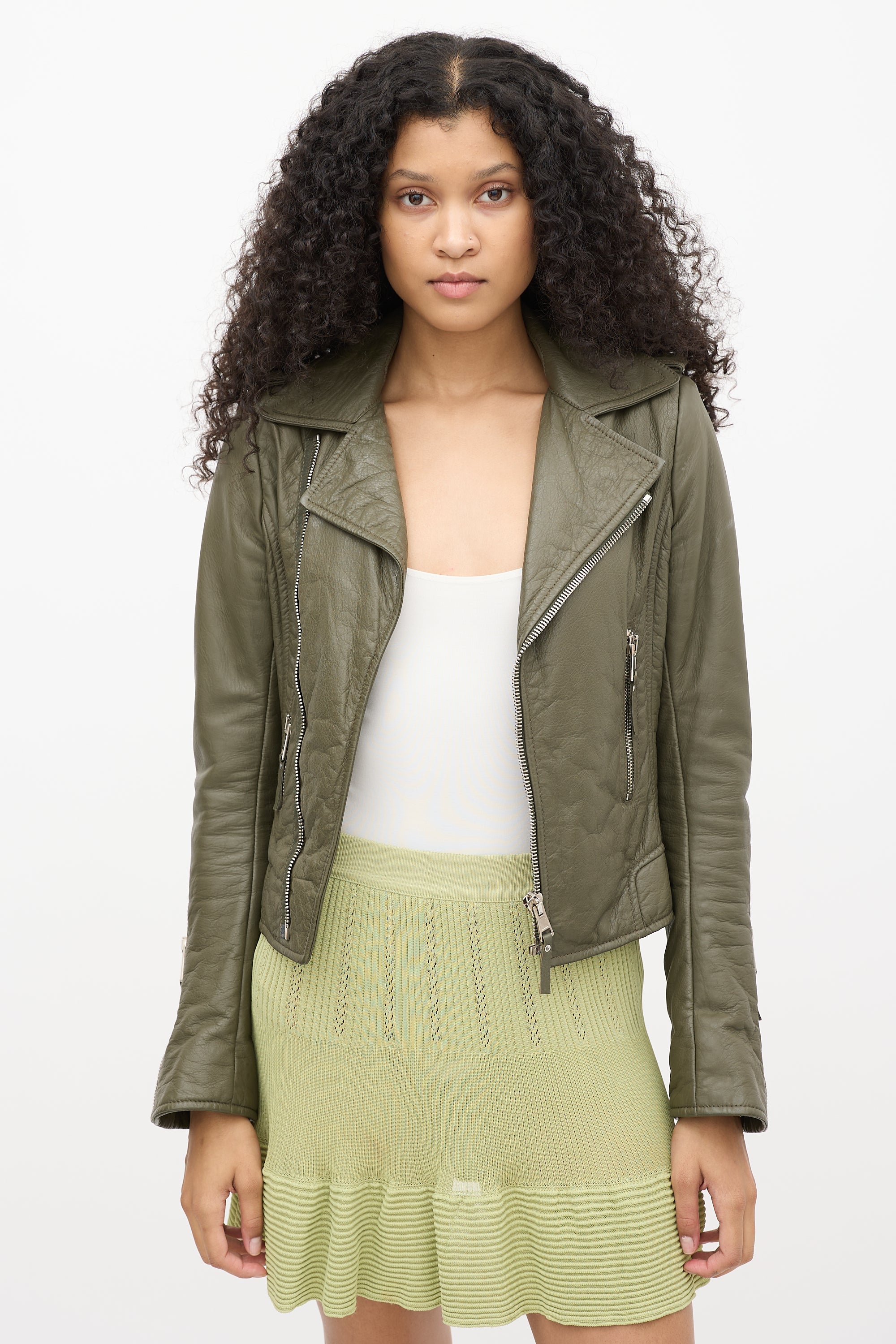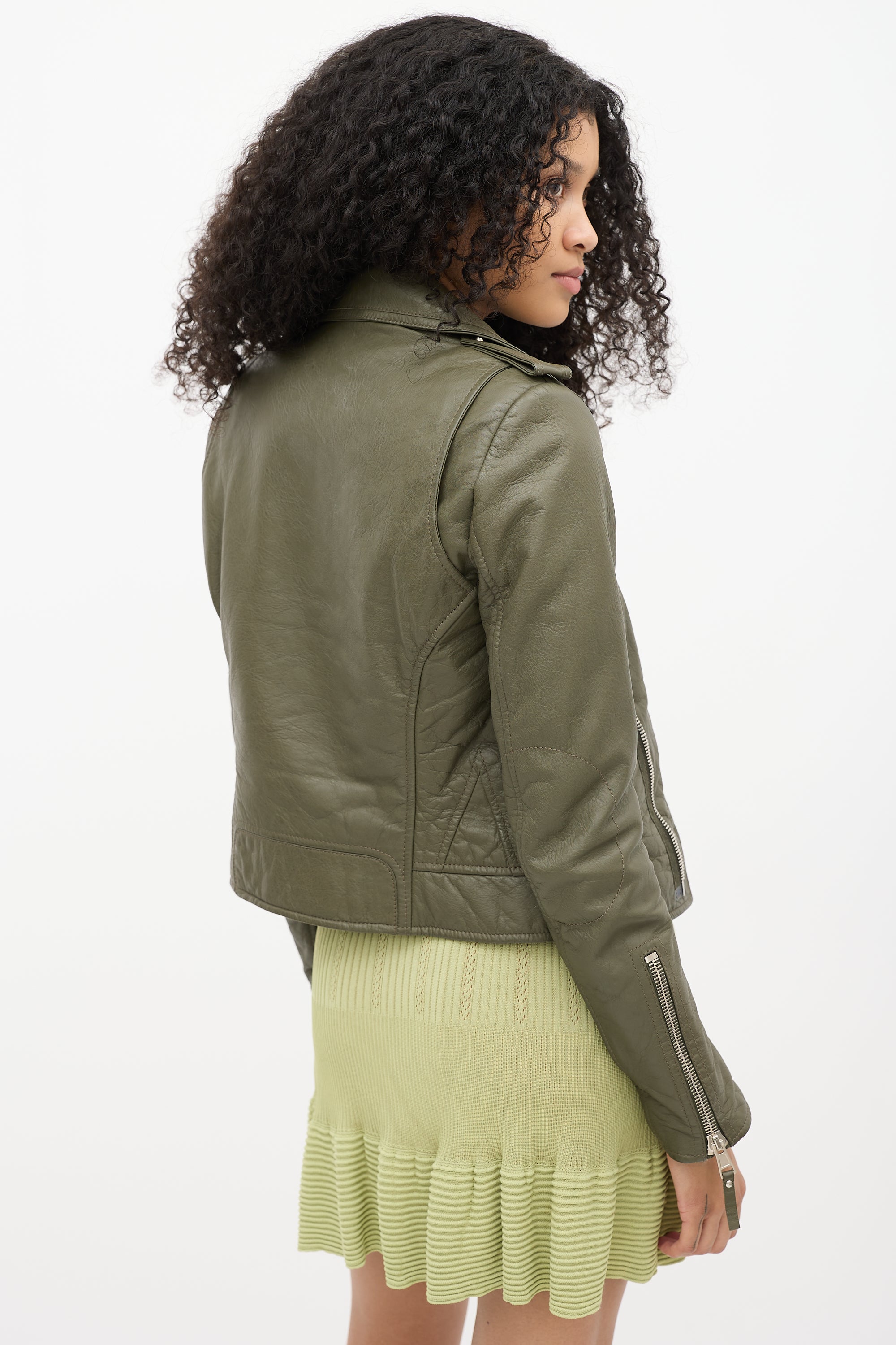 Pre-owned Balenciaga green leather moto jacket featuring wide notched lapel, asymmetric front zip closure, shoulder epaulets, two zip pockets at waist, and long sleeves with zipped cuffs. Lined.
