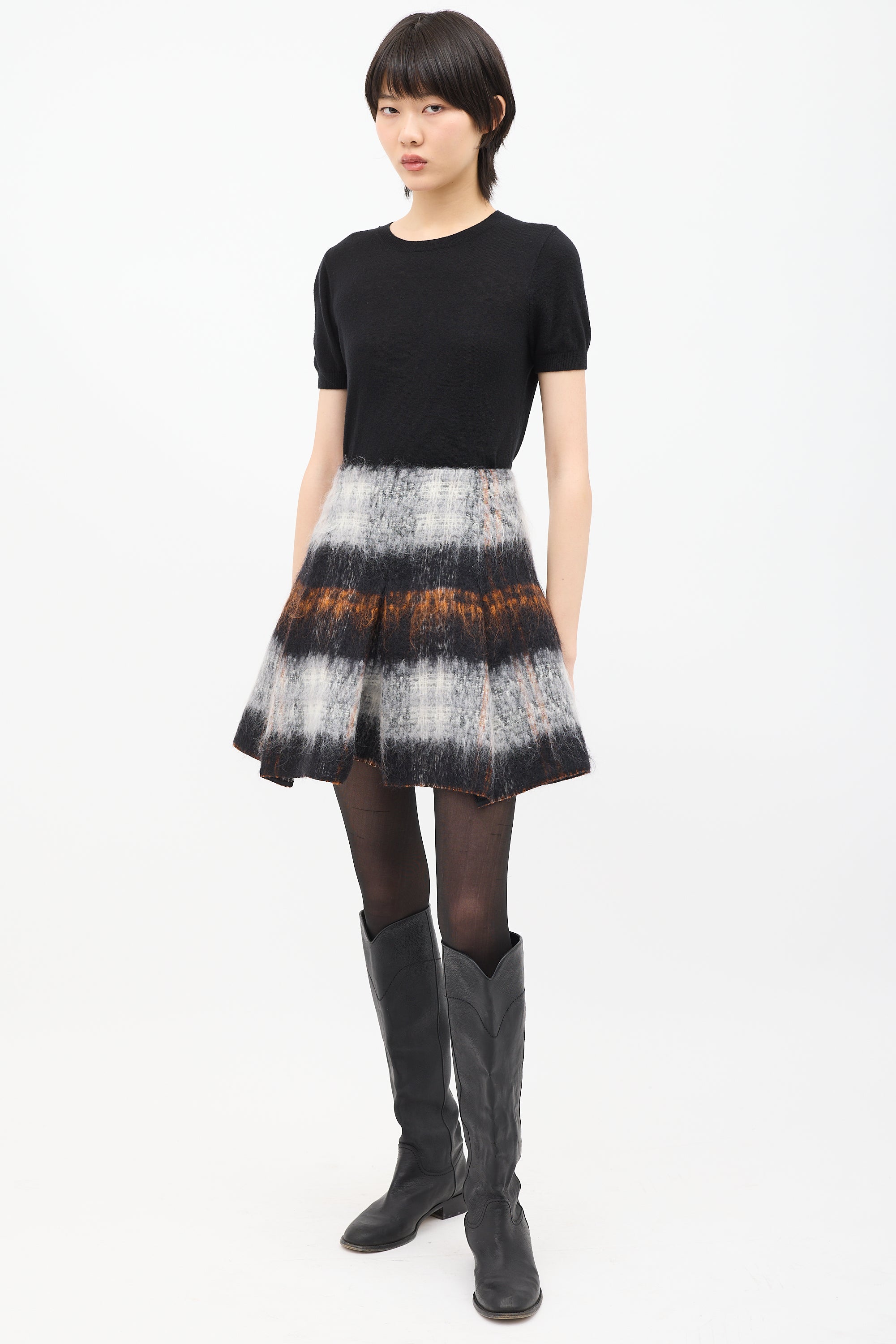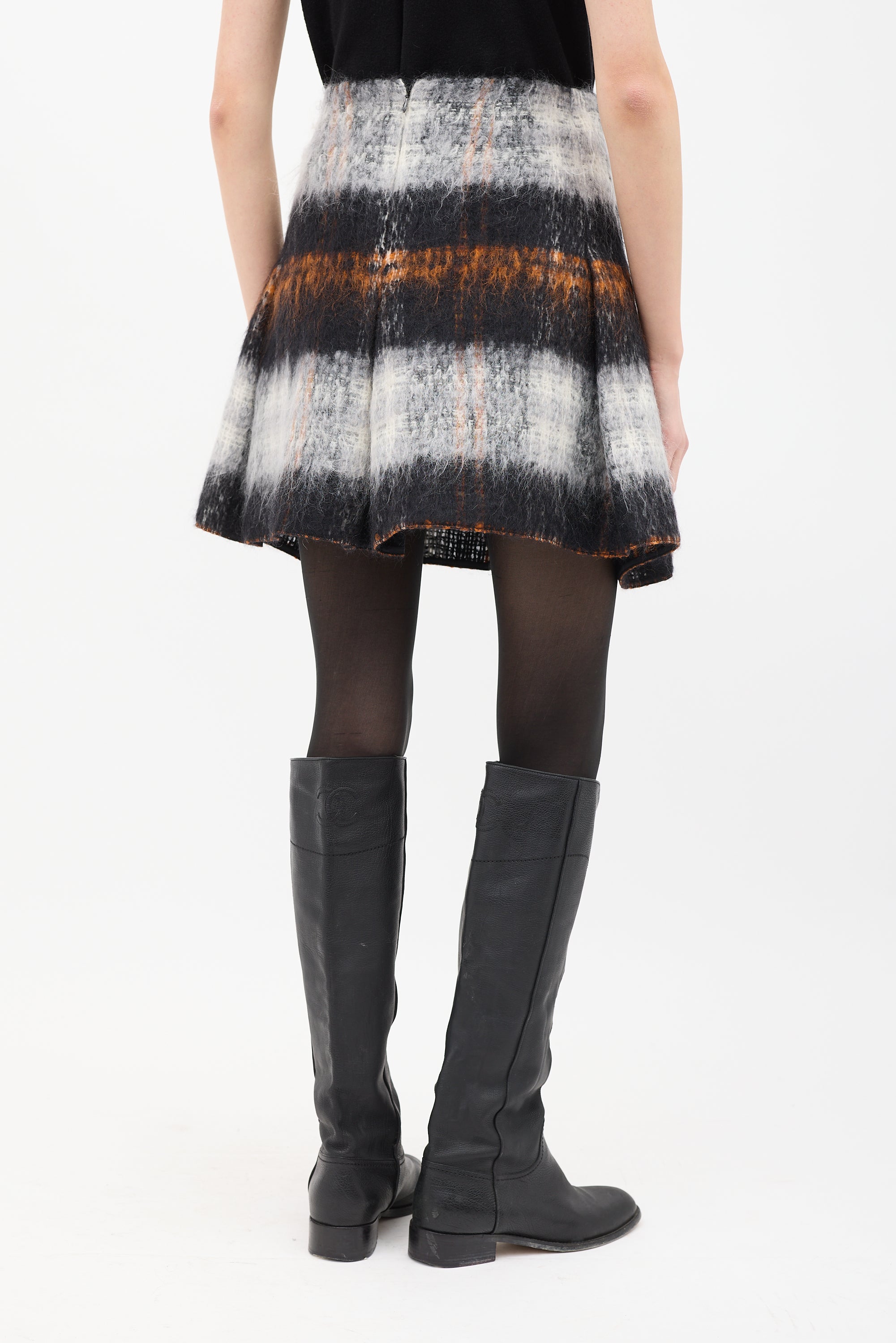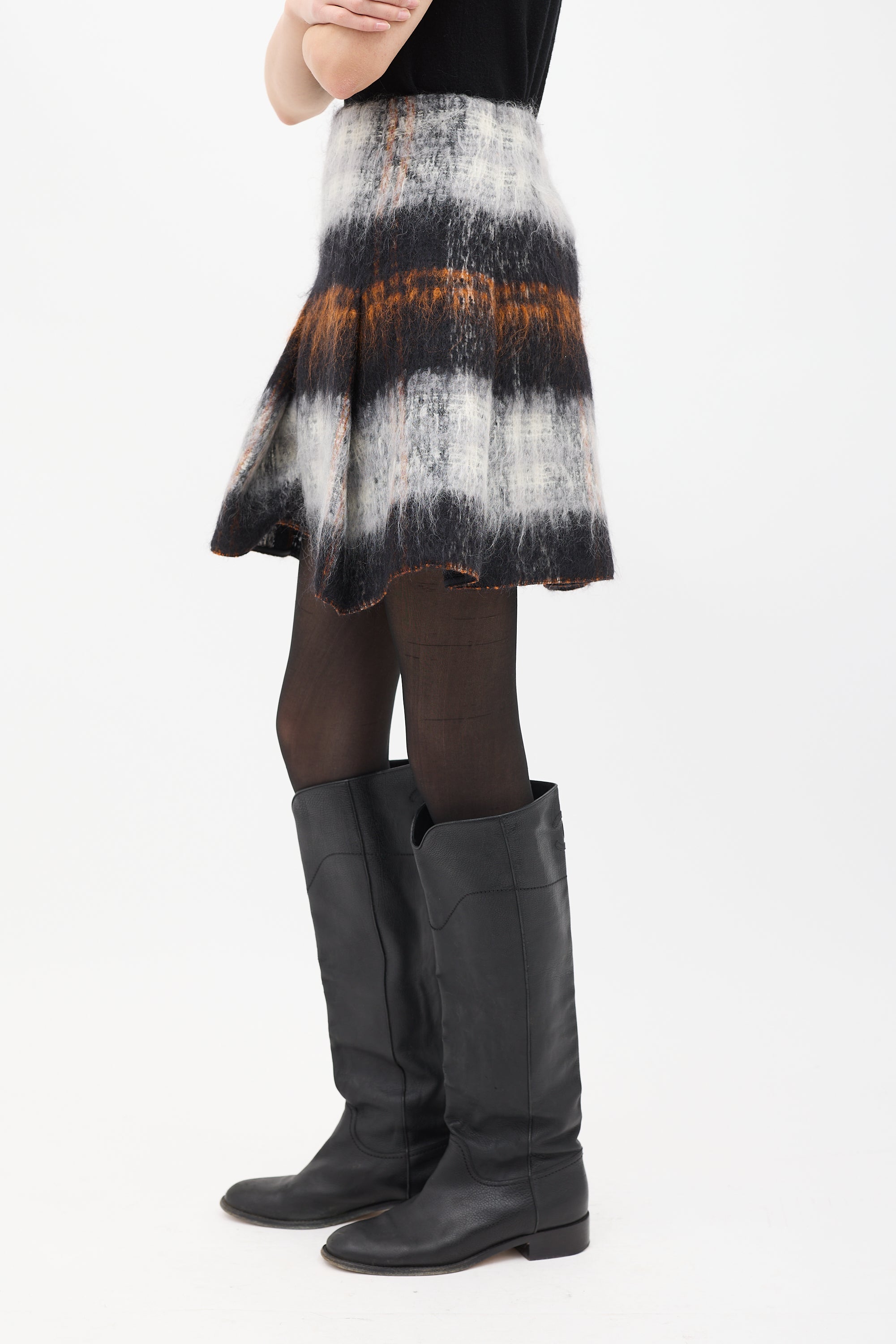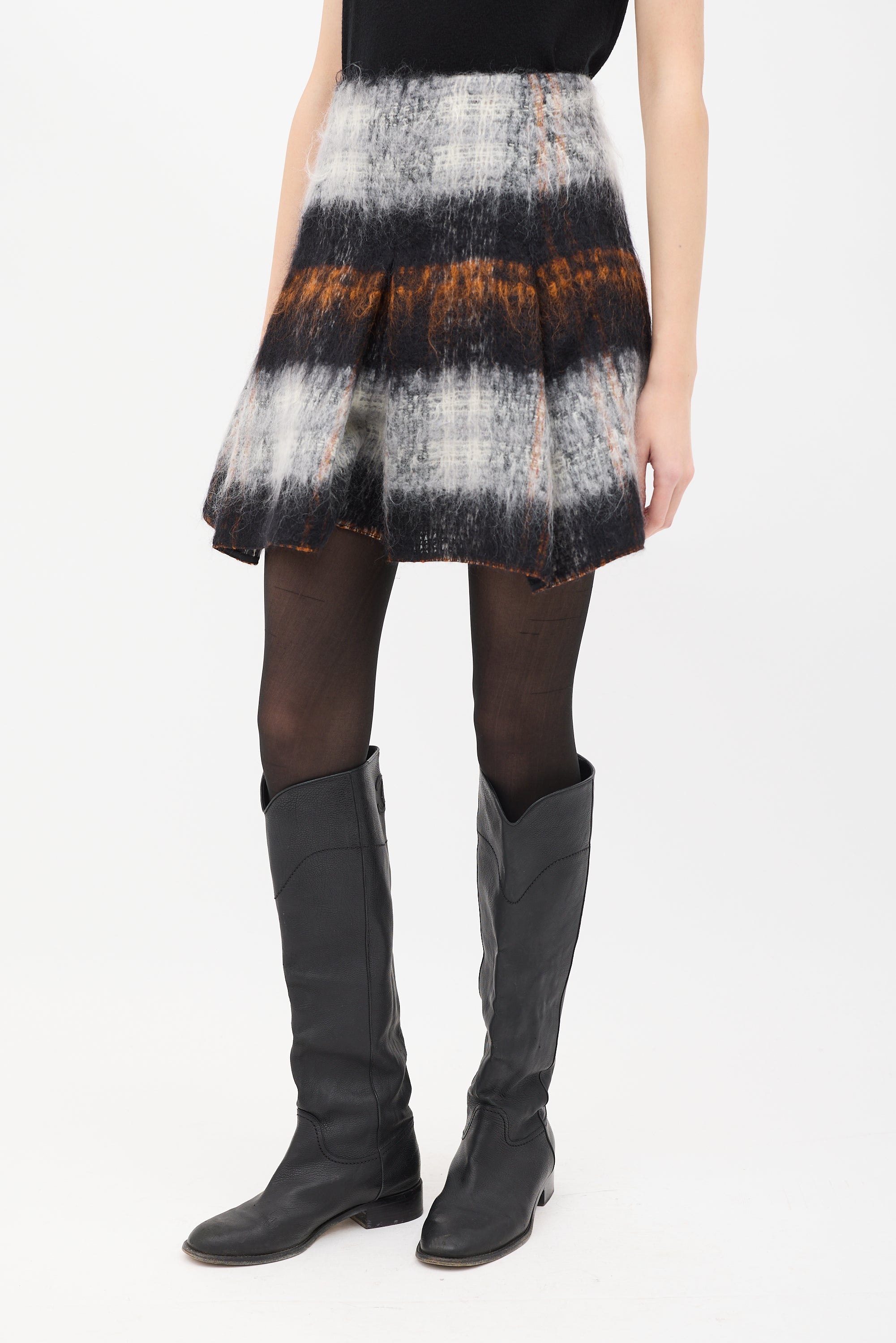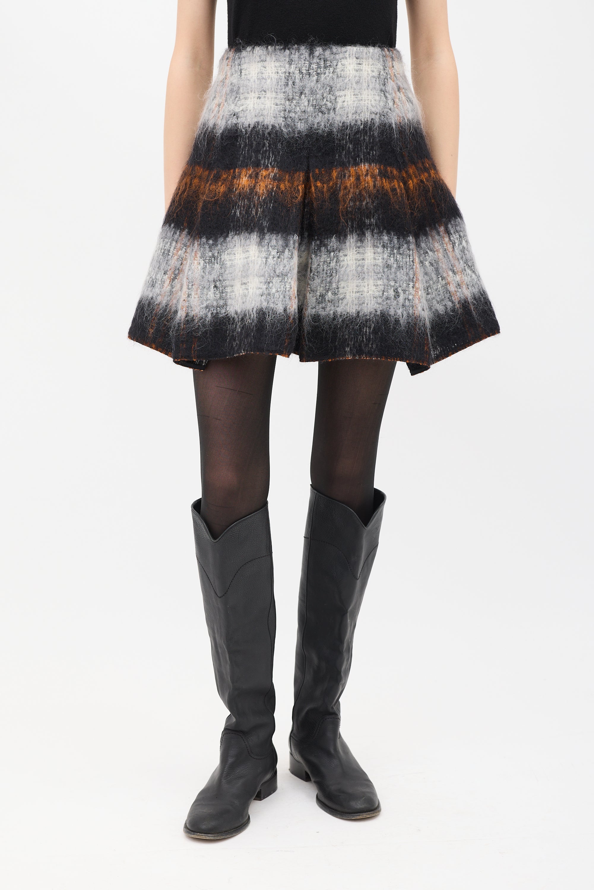Pre-owned Balenciaga grey and multicolour mohair blend skirt featuring horizontal stripe pattern, pleated design, and concealed back zip. Lined. Clipped to fit model.