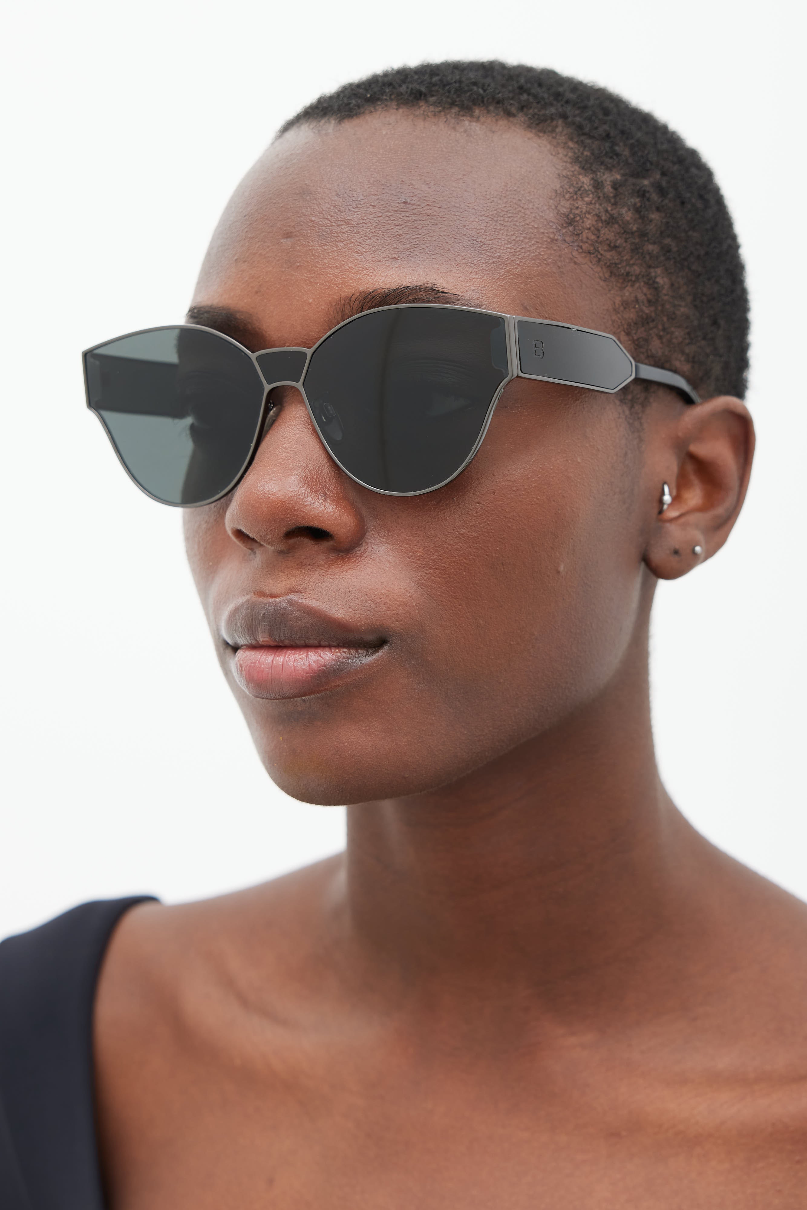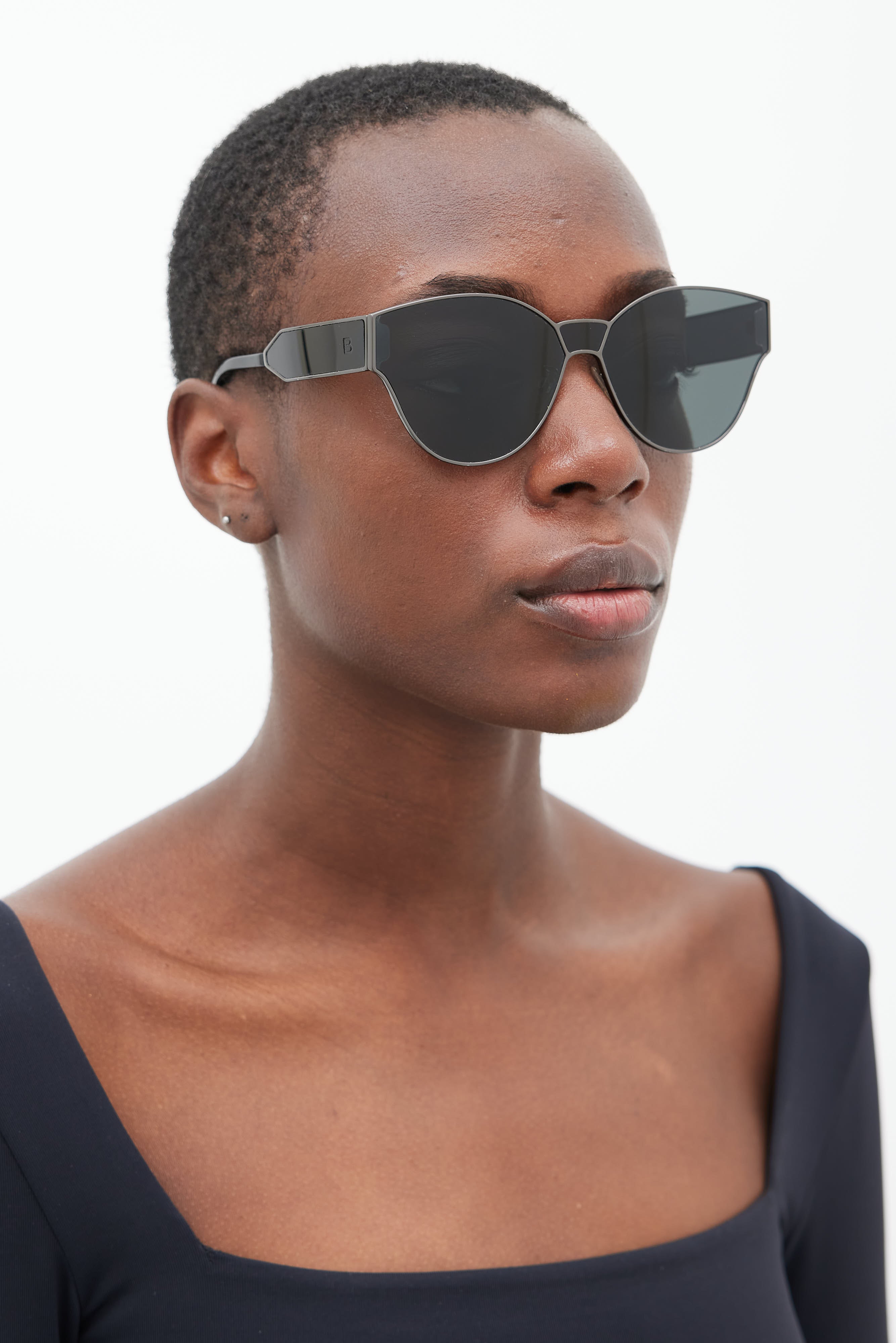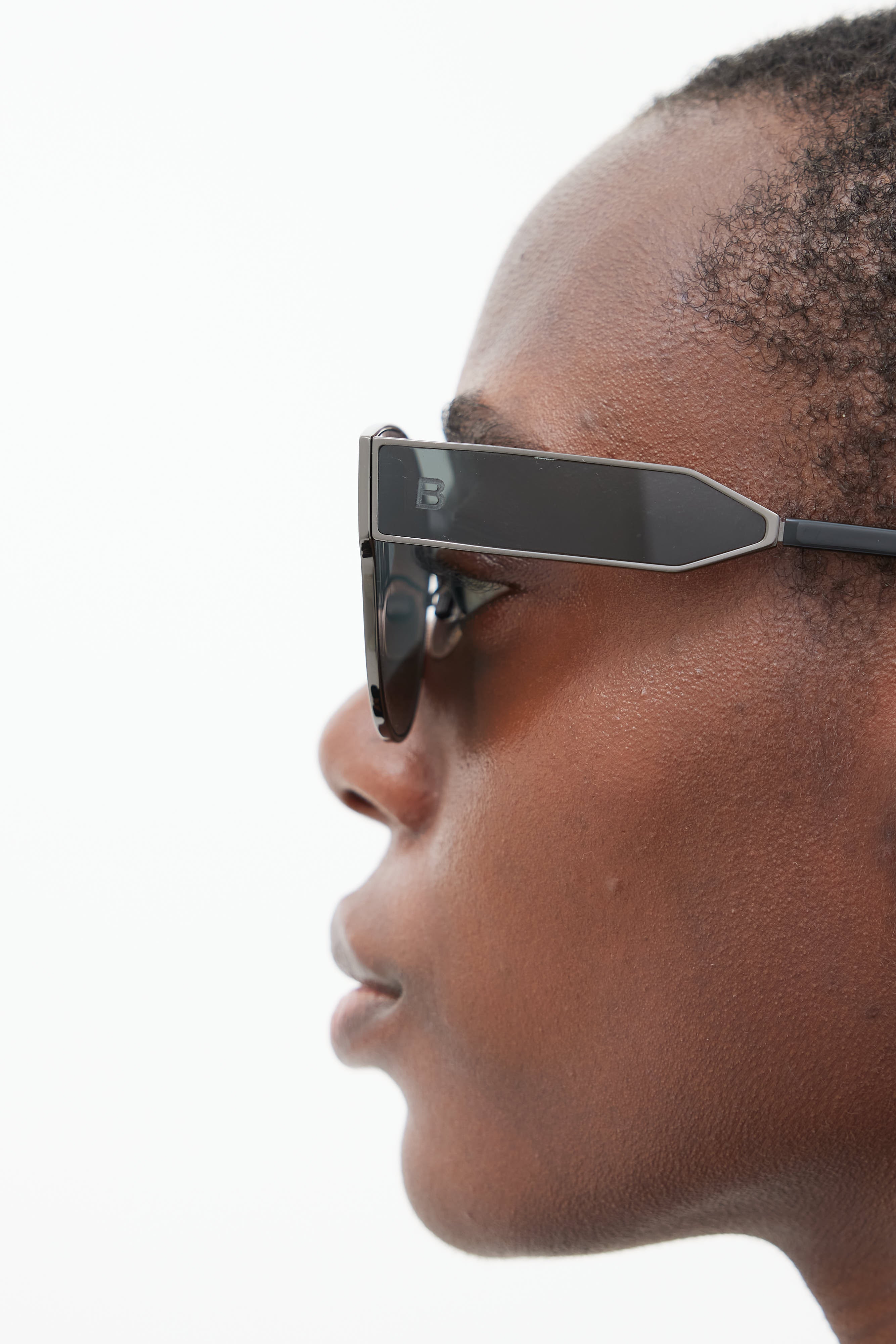 Pre-owned Balenciaga gunmetal BA96 sunglasses featuring round shape, gunmetal trim, and logo engraved at arm. Comes with case.
