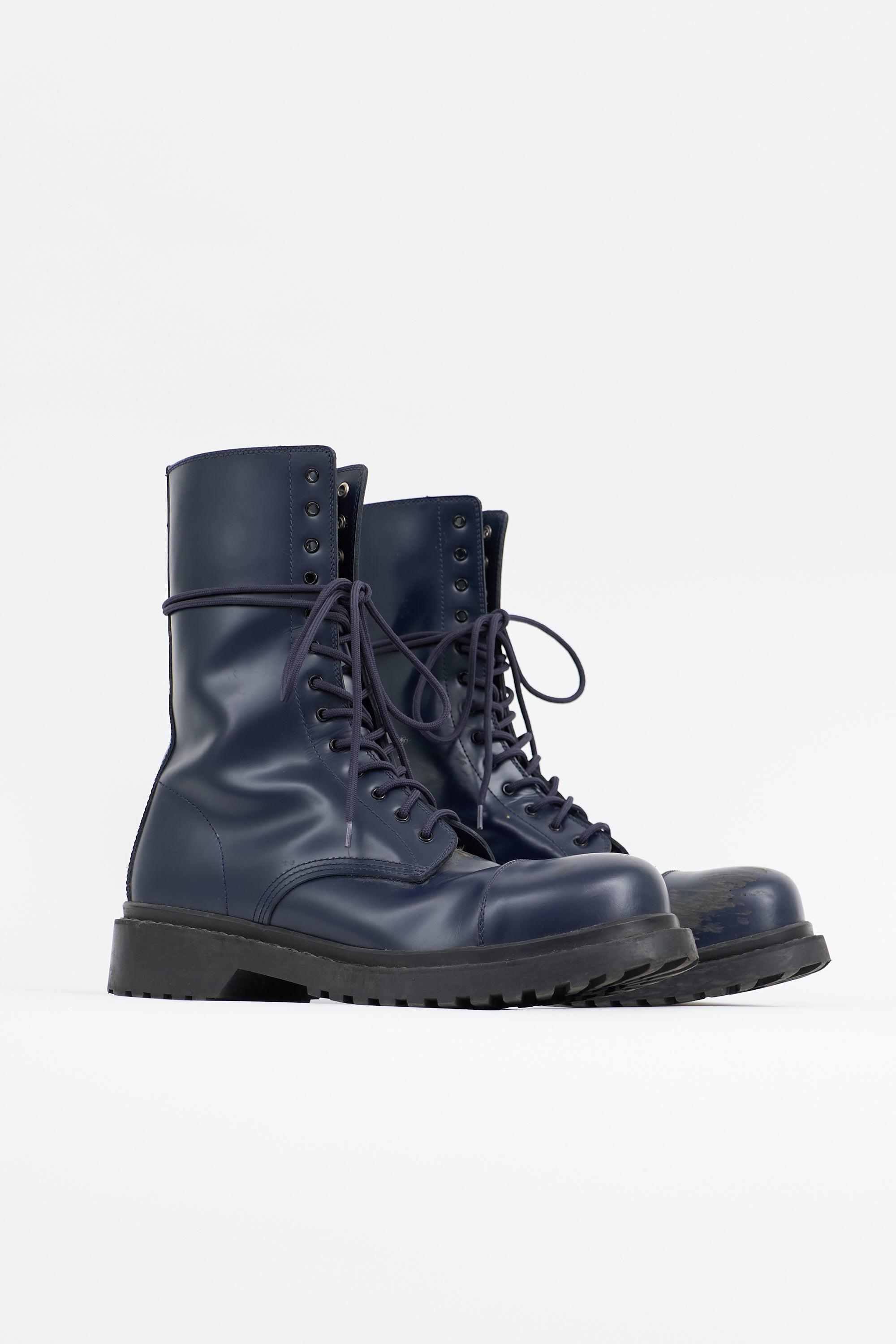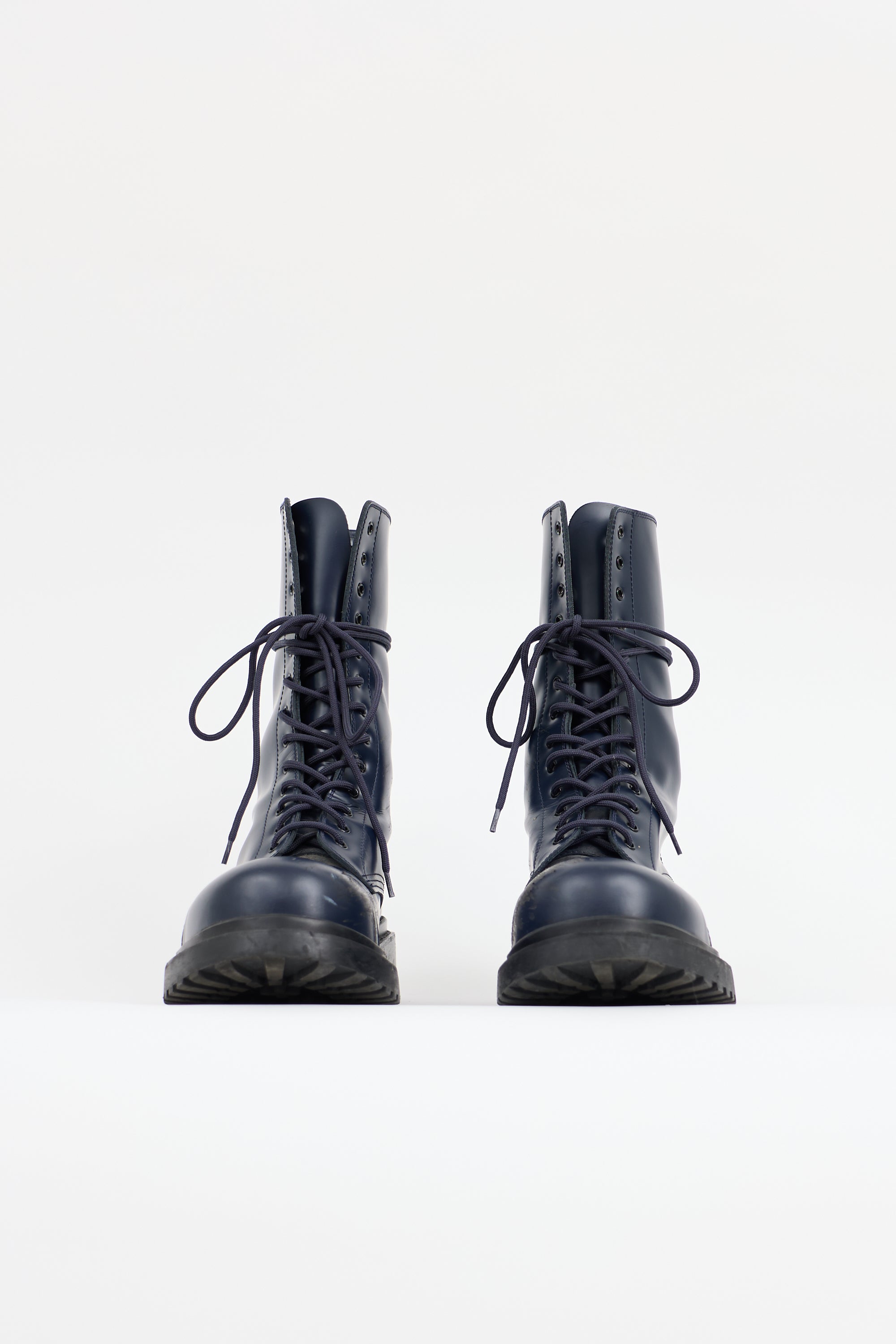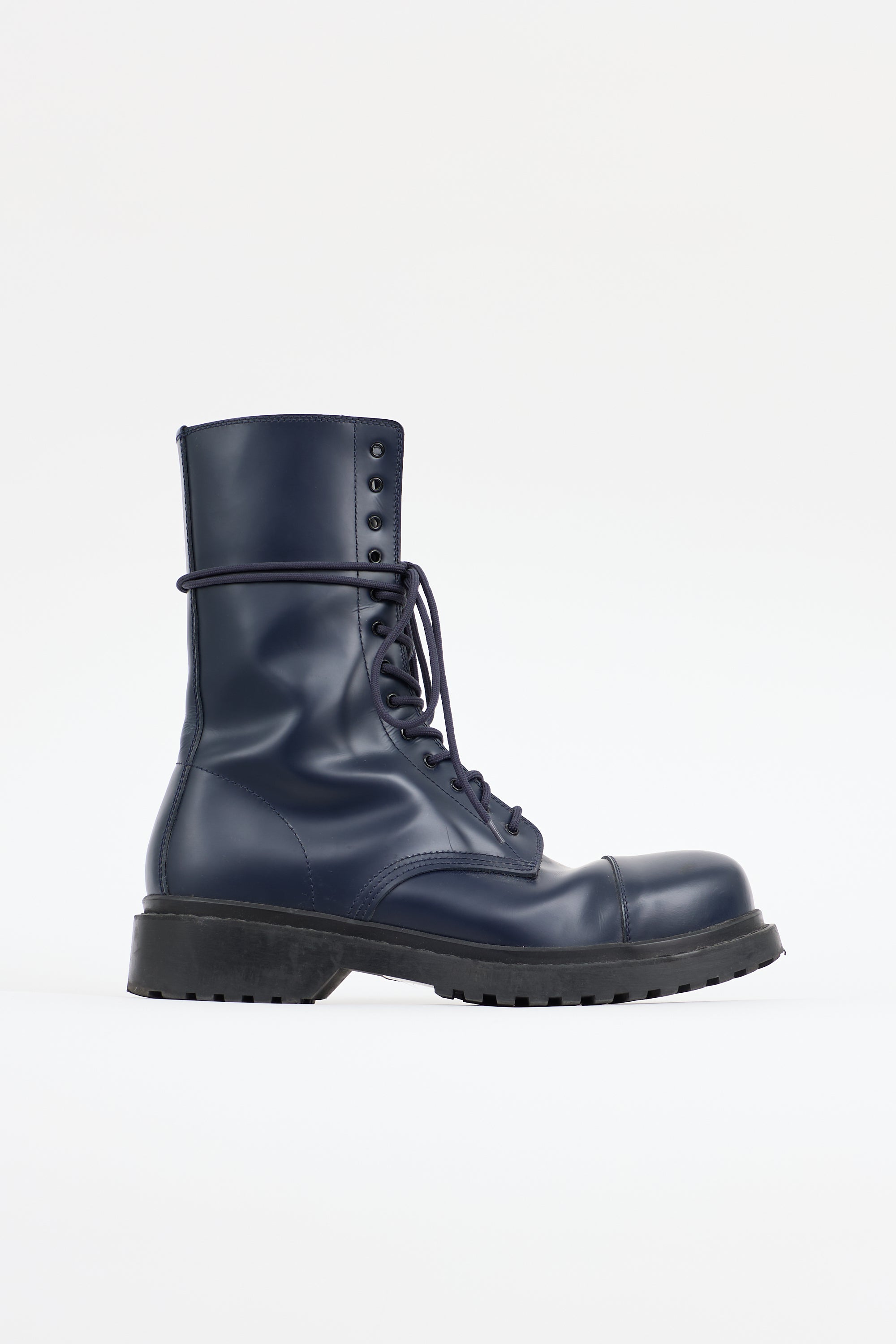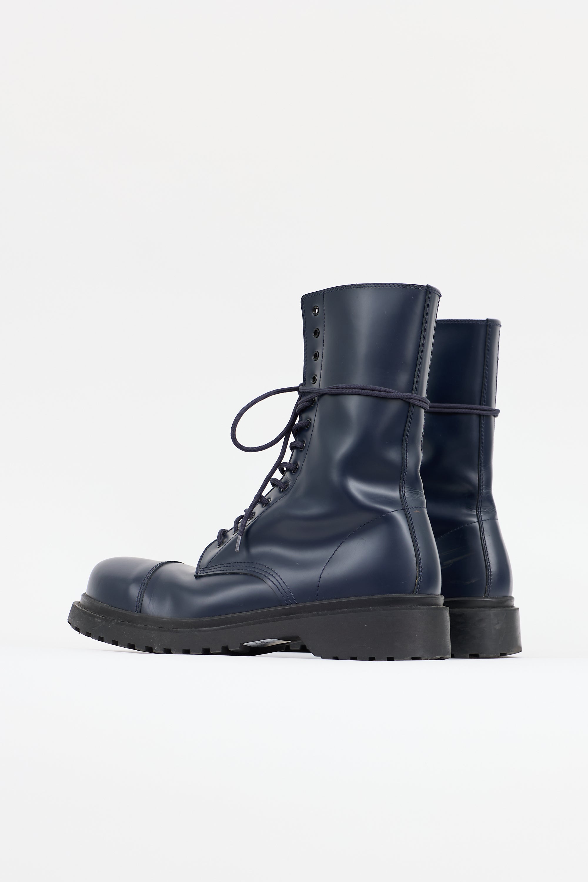 Pre-owned Balenciaga navy leather combat boots featuring a rounded cap toe, lace up front, and rubber lug sole.