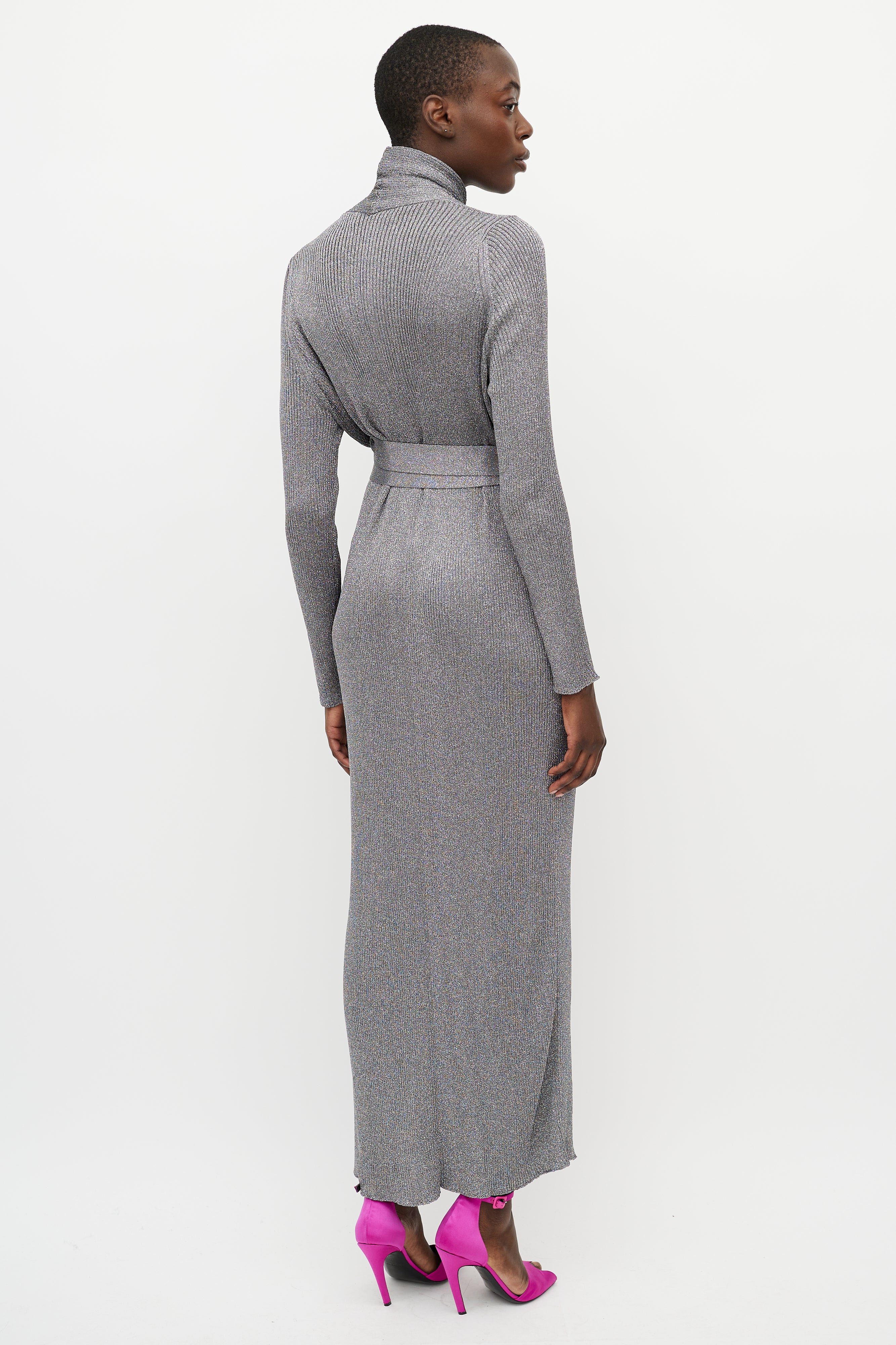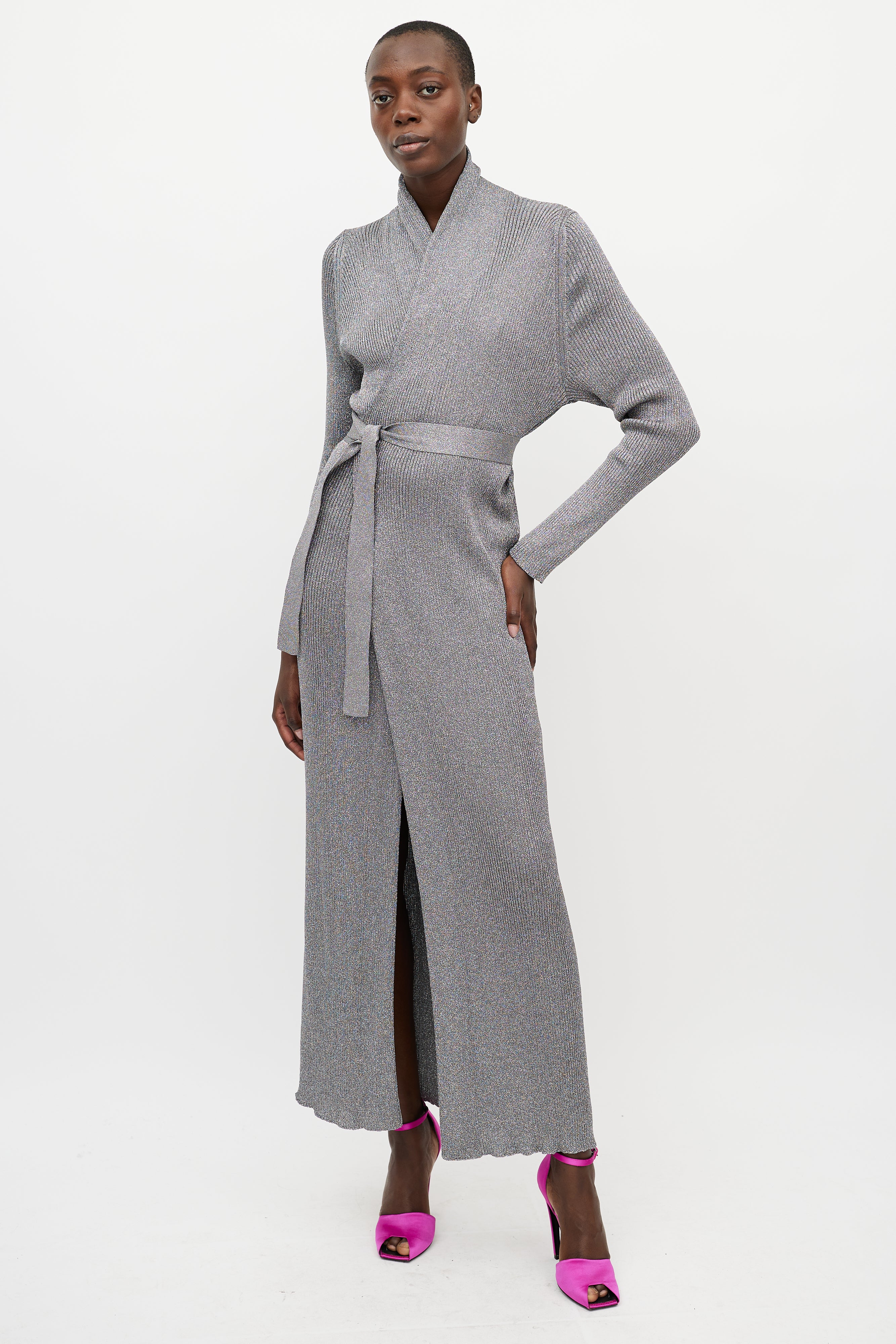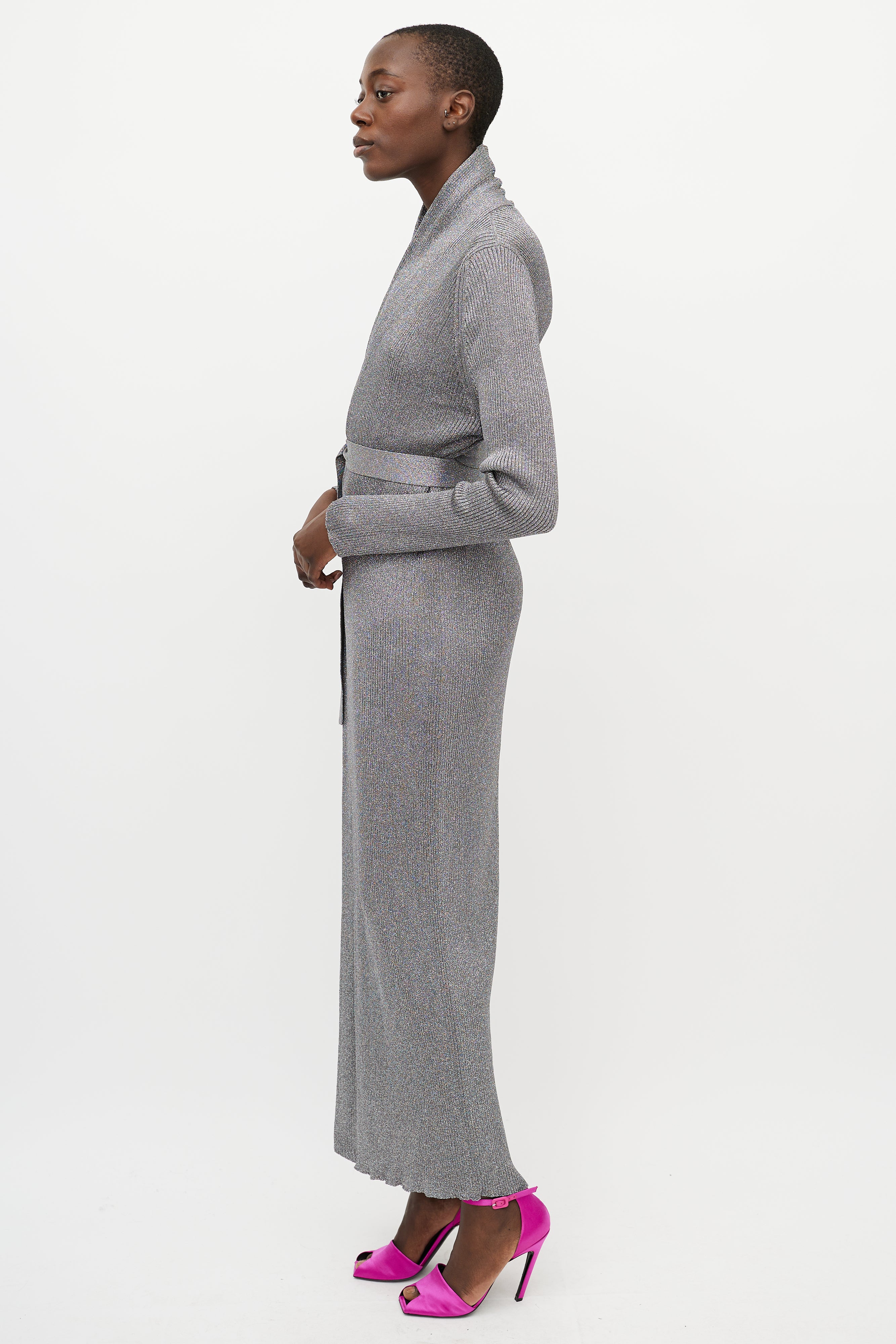 Pre-owned Balenciaga metallic silver ribbed knit long dress featuring long extended sleeves, adjustable belt at waist, and shawl collar.