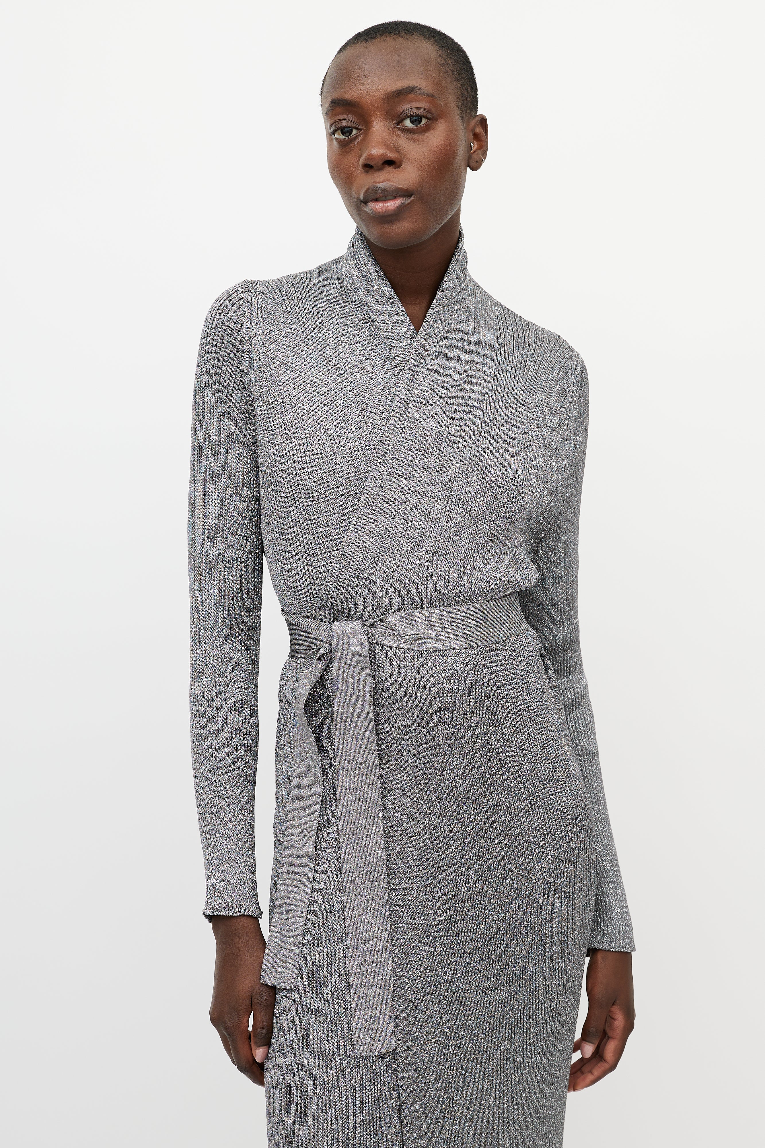 Metallic Silver Ribbed Knit Wrap Dress Small Size Guide