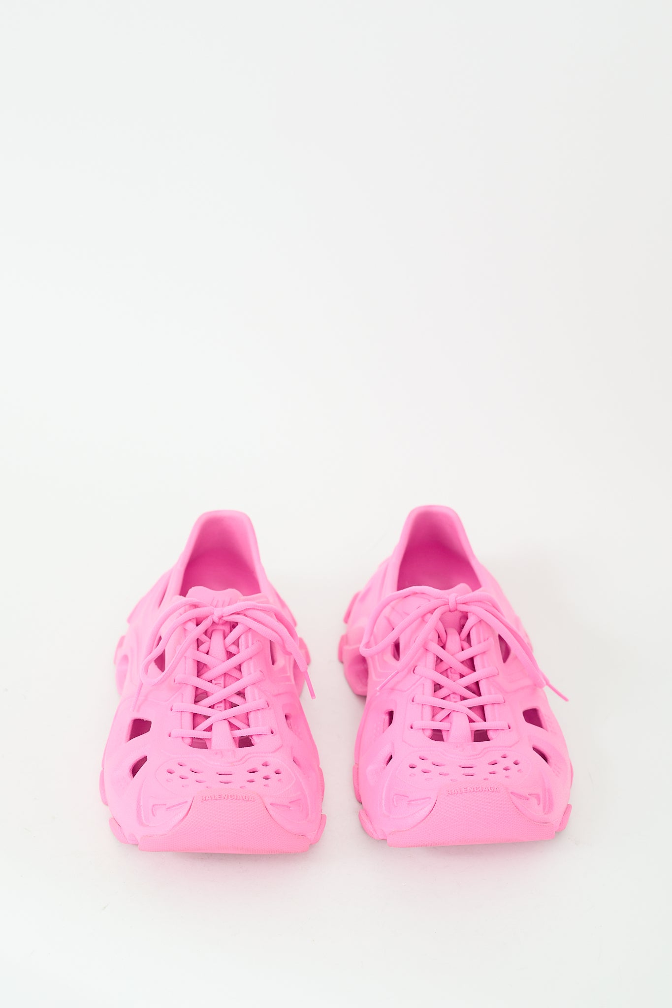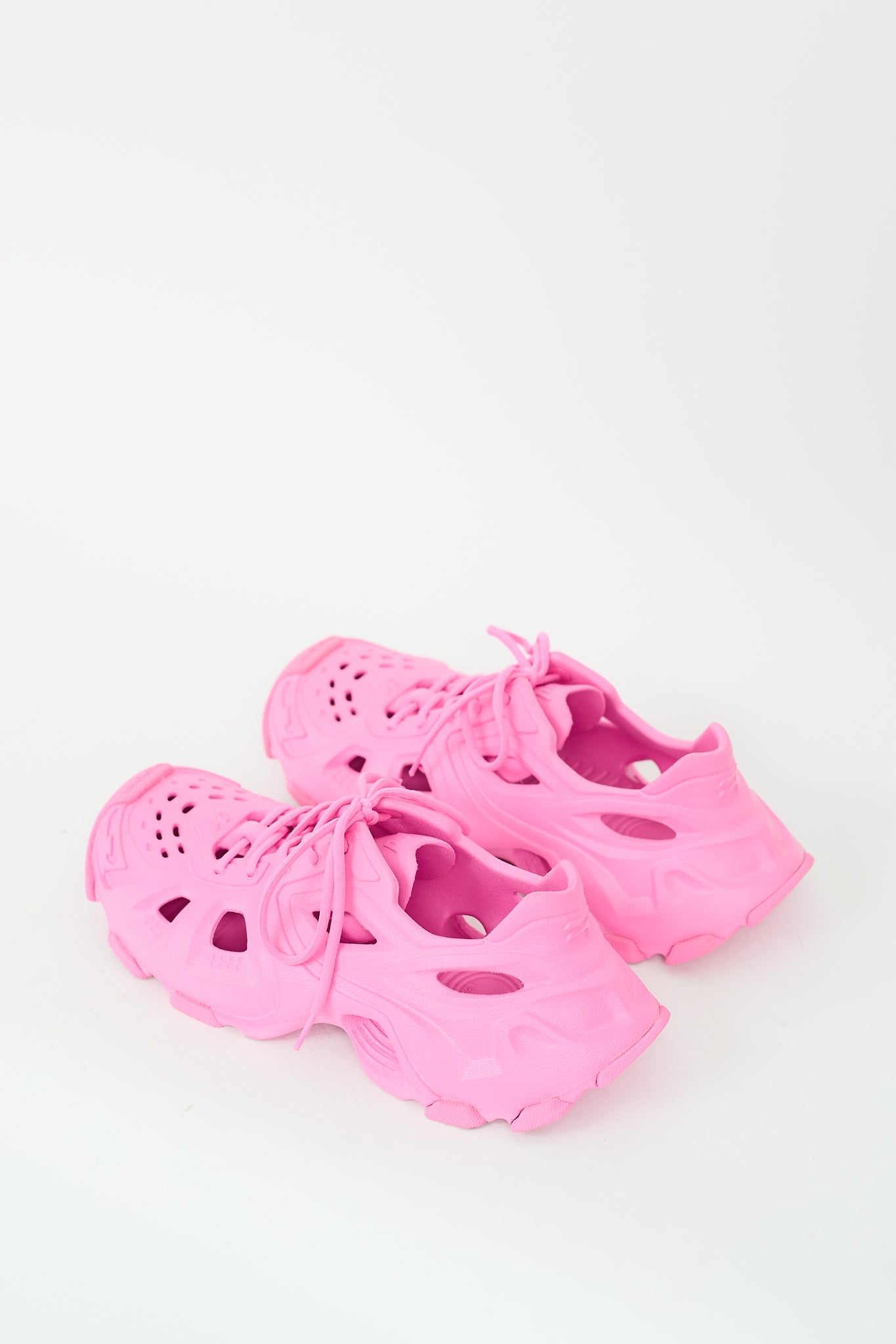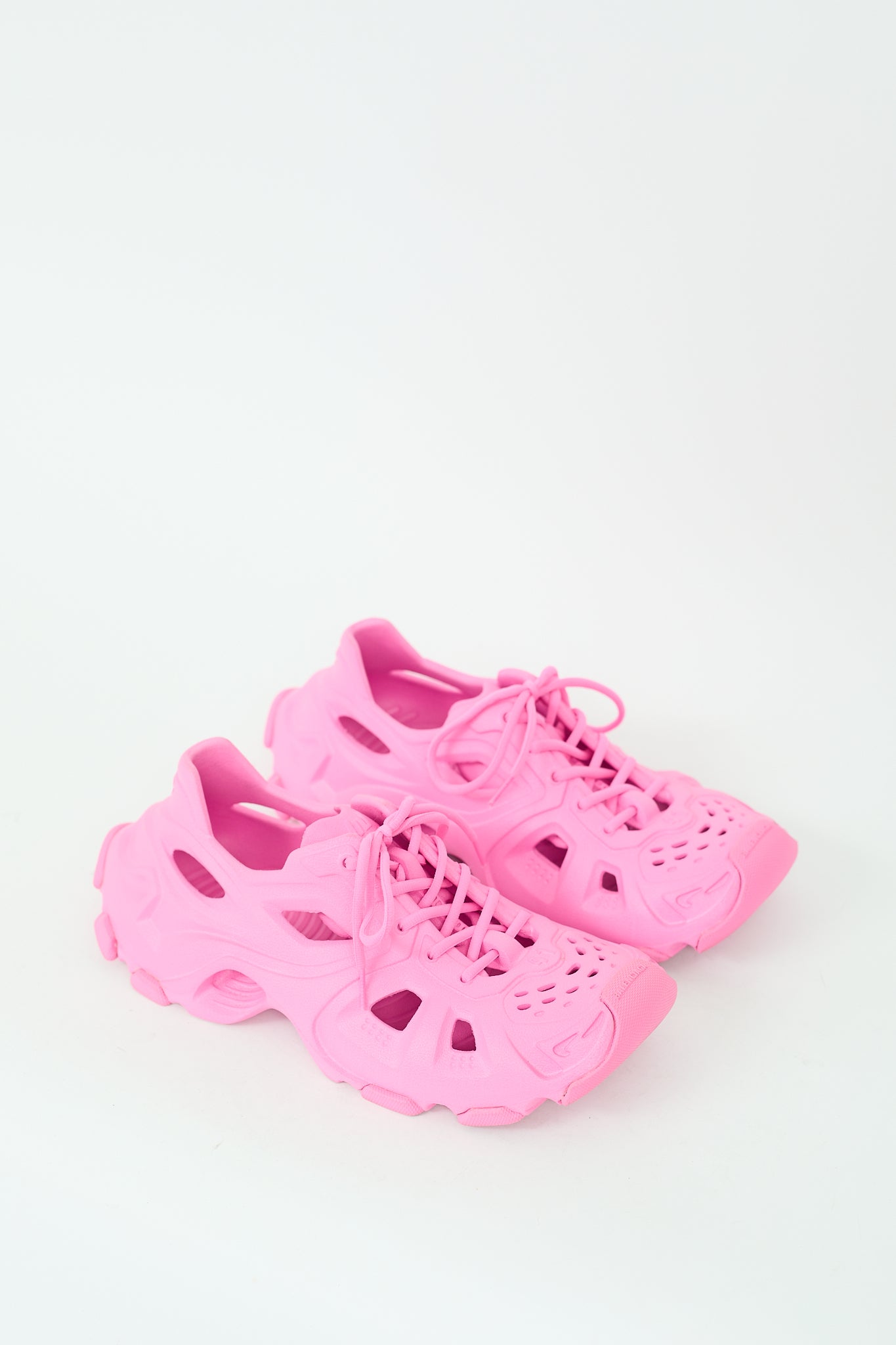 Pre-owned Balenciaga pink HD Caged Lace up sneakers featuring rounded toe, rubber cutout upper, embossed "41" at toe, tonal lace up front, and embossed logo at toe.