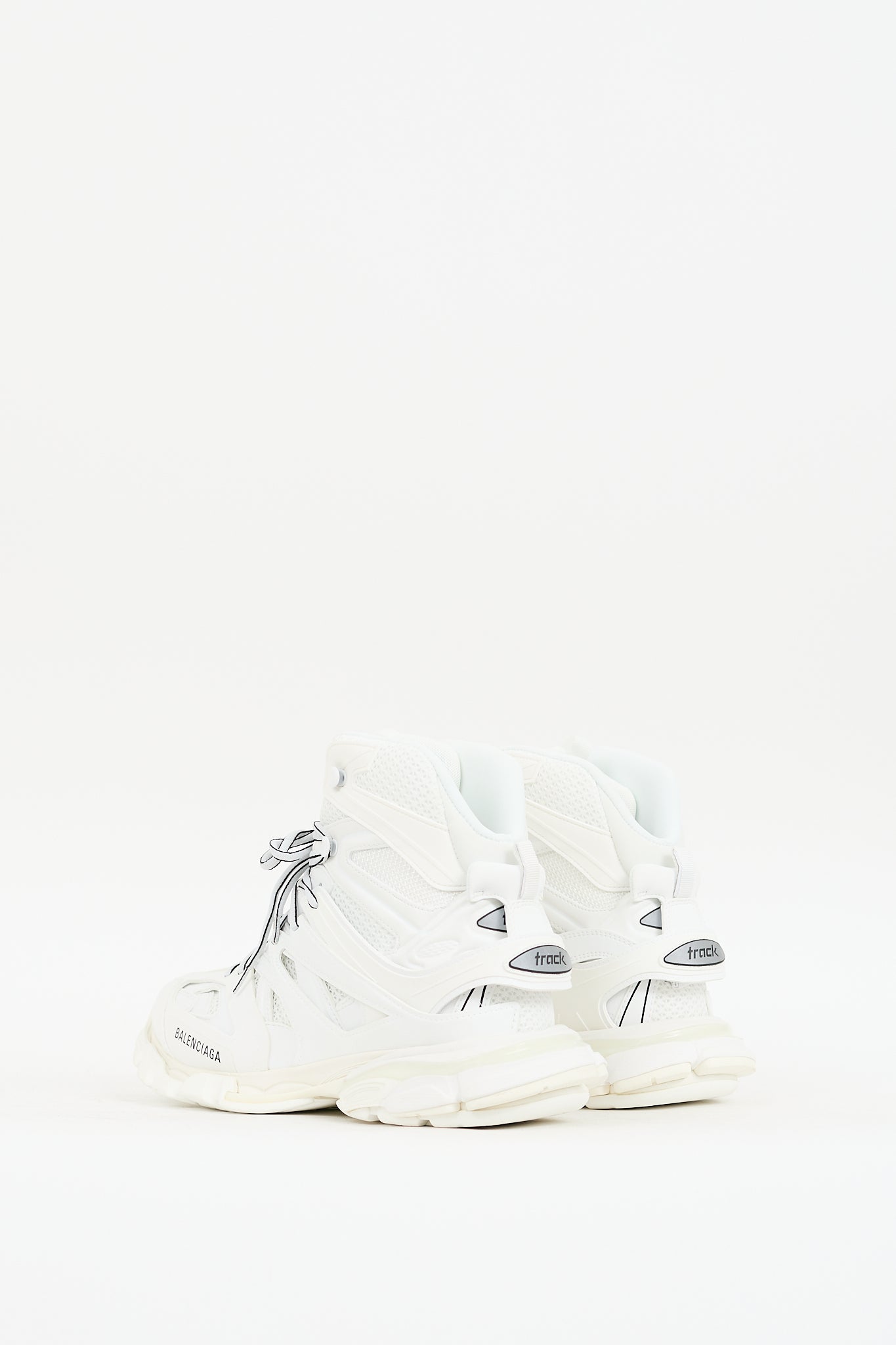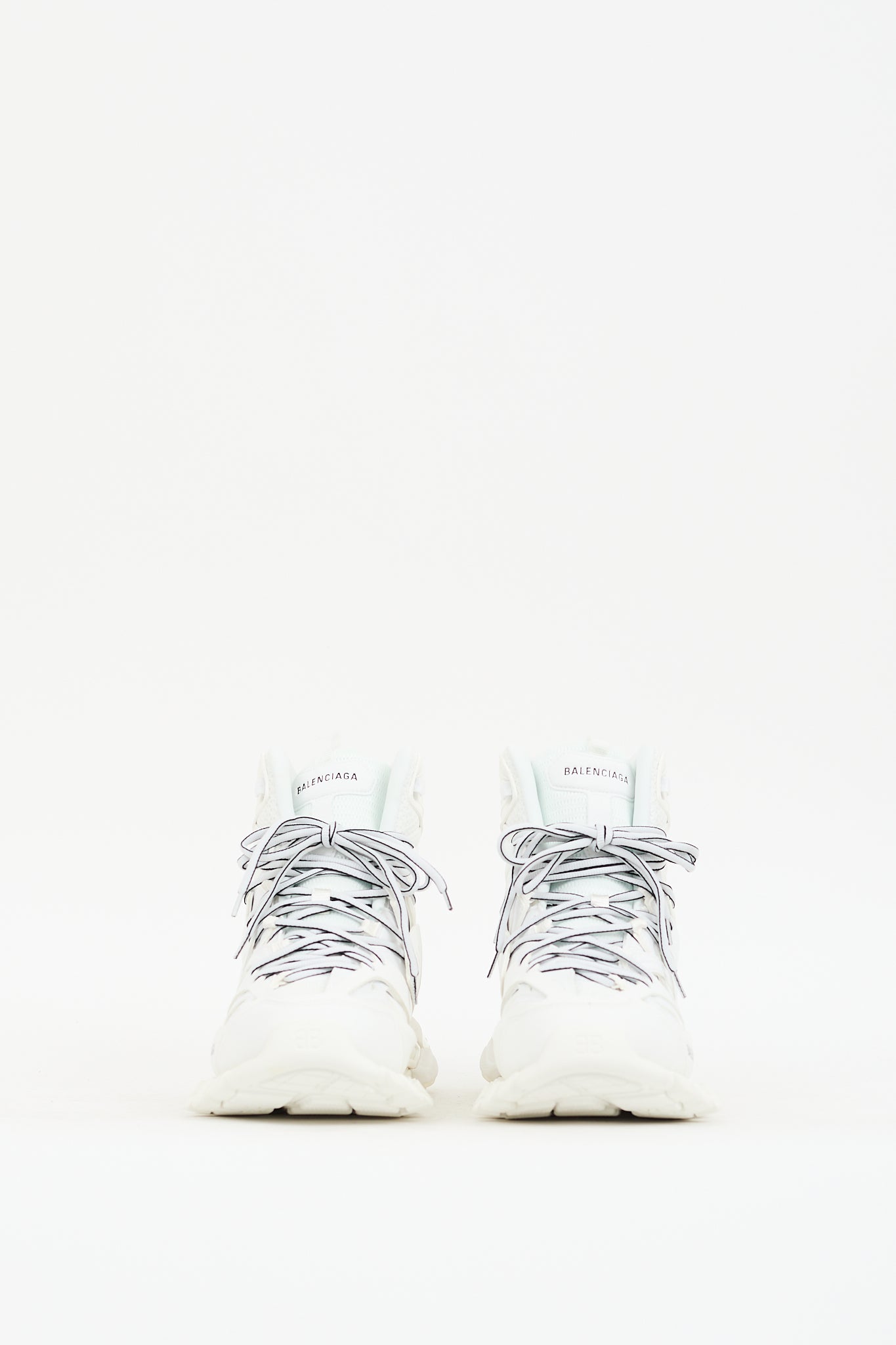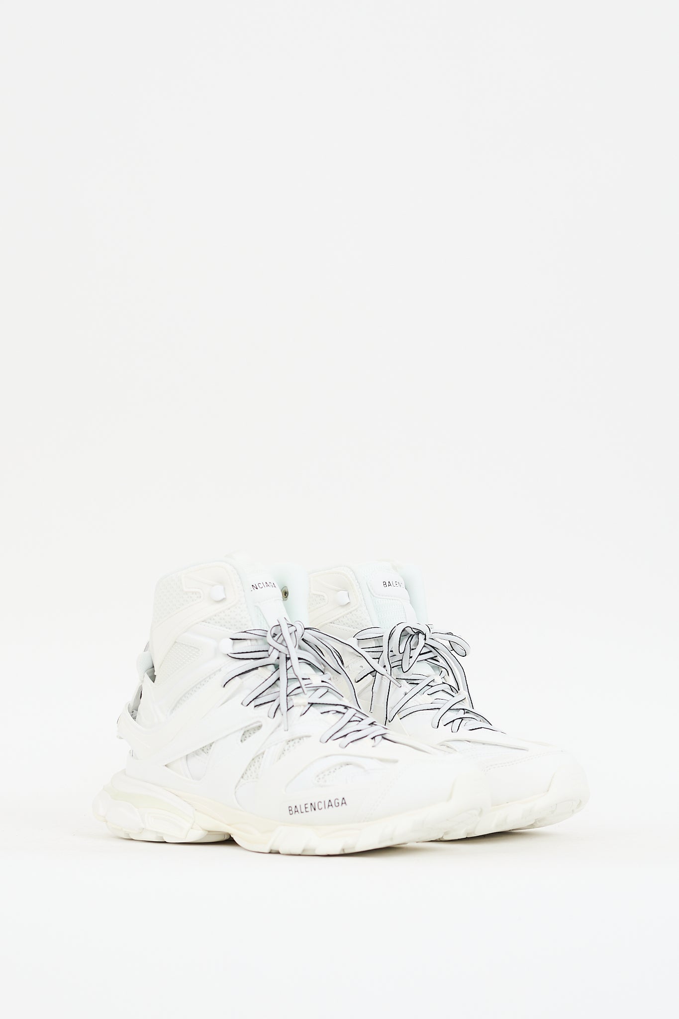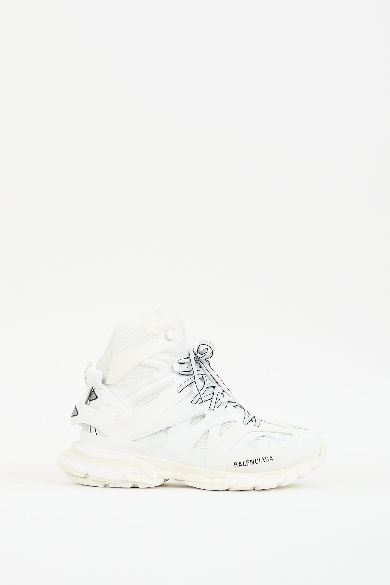 Pre-owned Balenciaga white Track Hike sneakers featuring rounded toe, double lace up front, mixed rubber and mesh upper, embroidered "43" at toe, stamped logo at outer toe, reflective "Track" patch at heel, and chunky outsole. Comes with original dust bag and box.