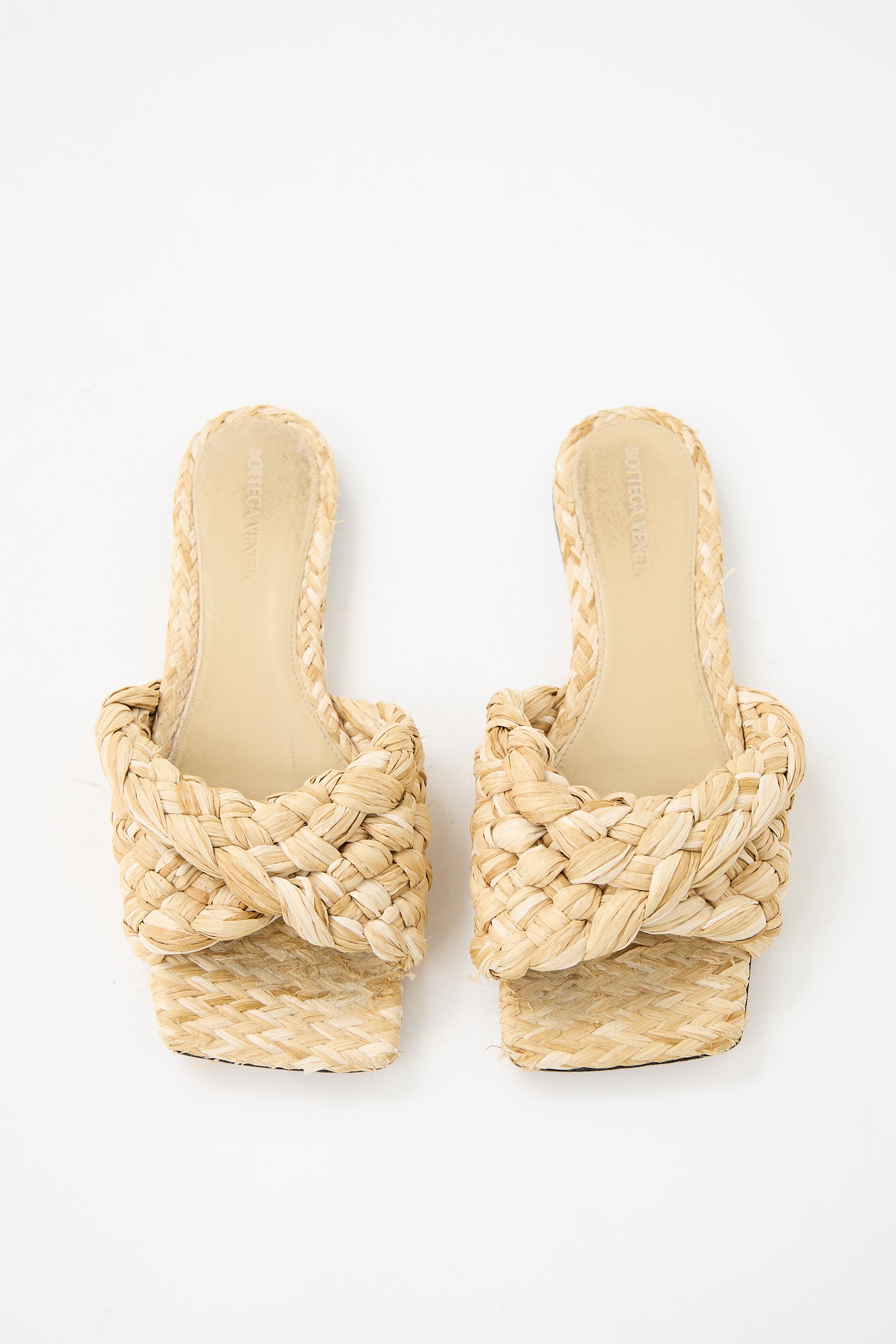 Pre-owned Bottega Veneta beige raffia Stretch slides featuring open square toe, woven strap at vamp, leather insole, and rubber treated outsole.