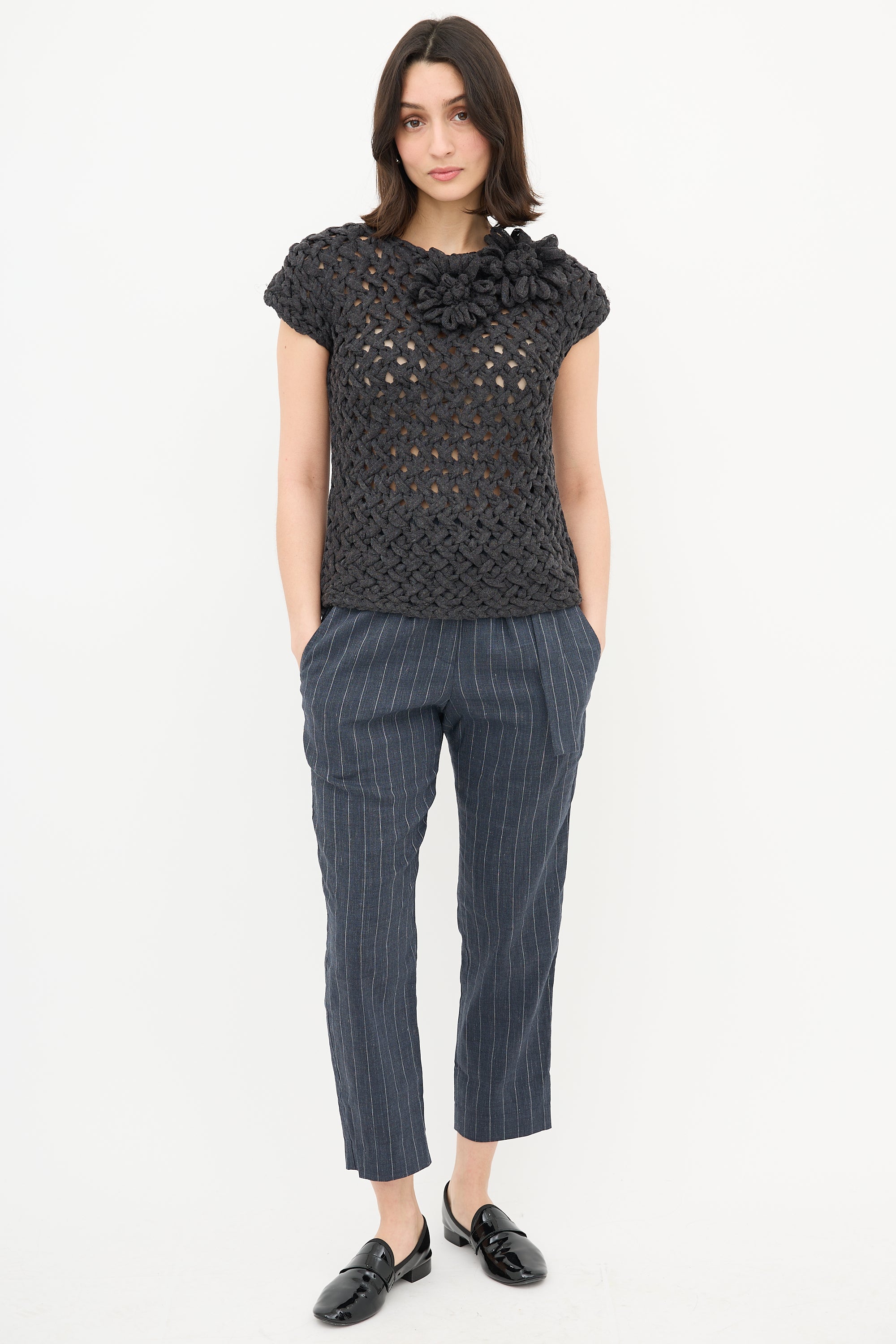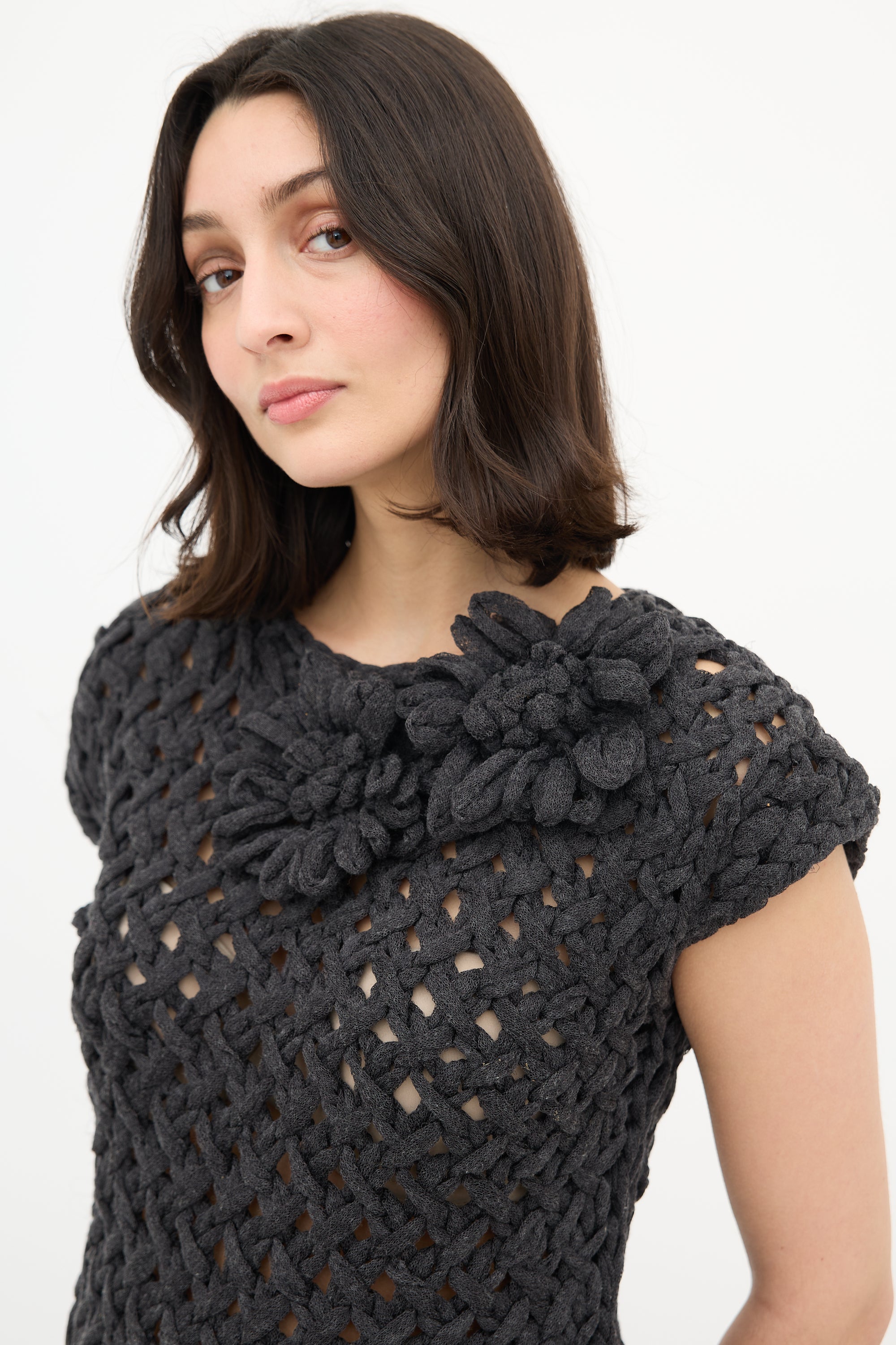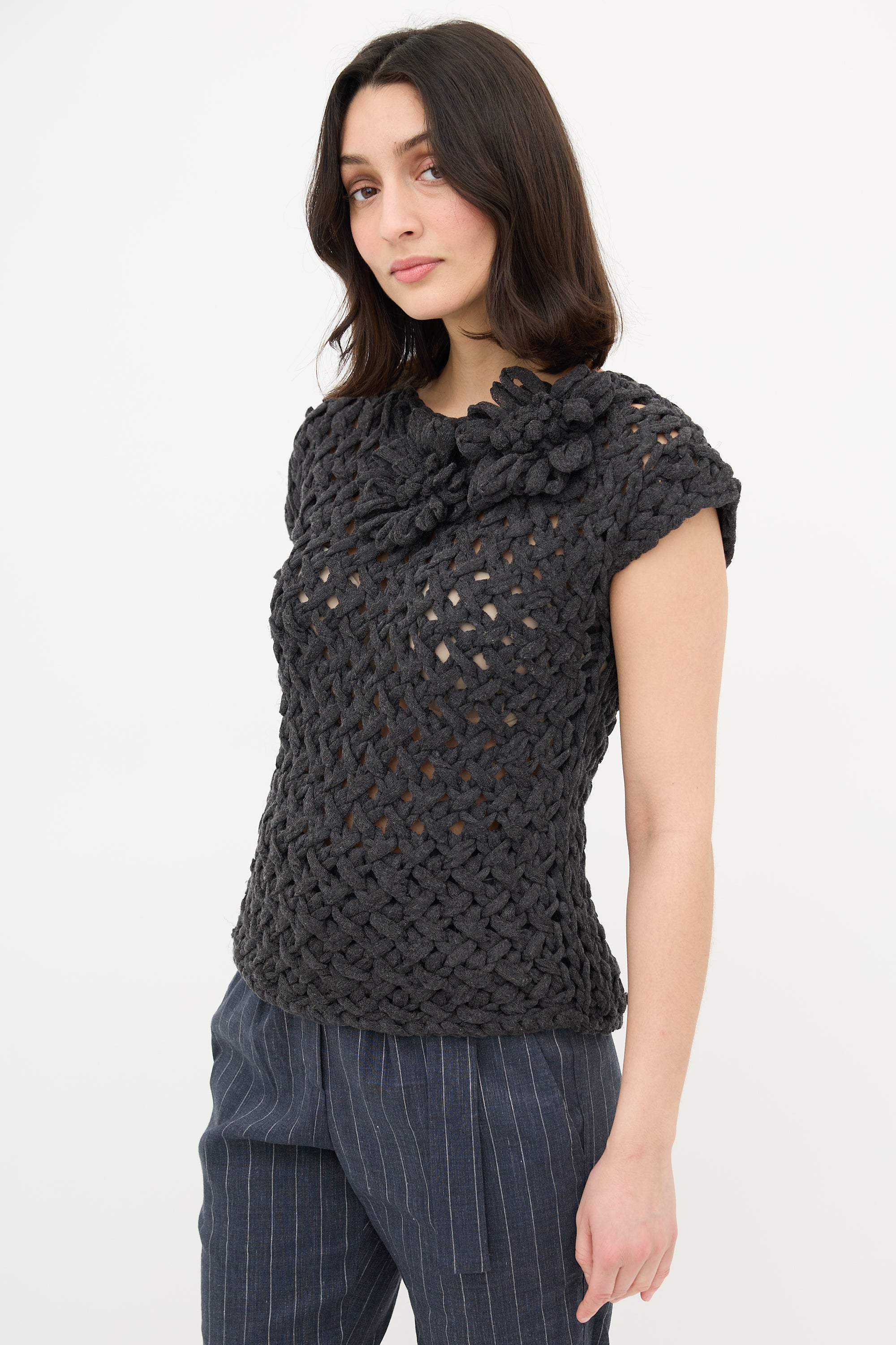 Pre-owned Brunello Cucinelli dark grey crochet top featuring a round neck with tonal flower applique and cap sleeves.